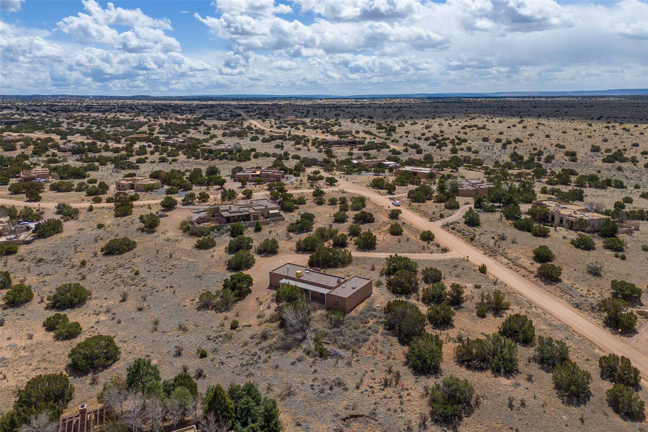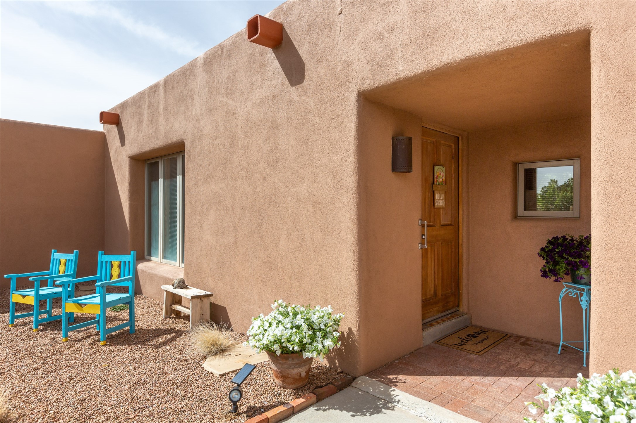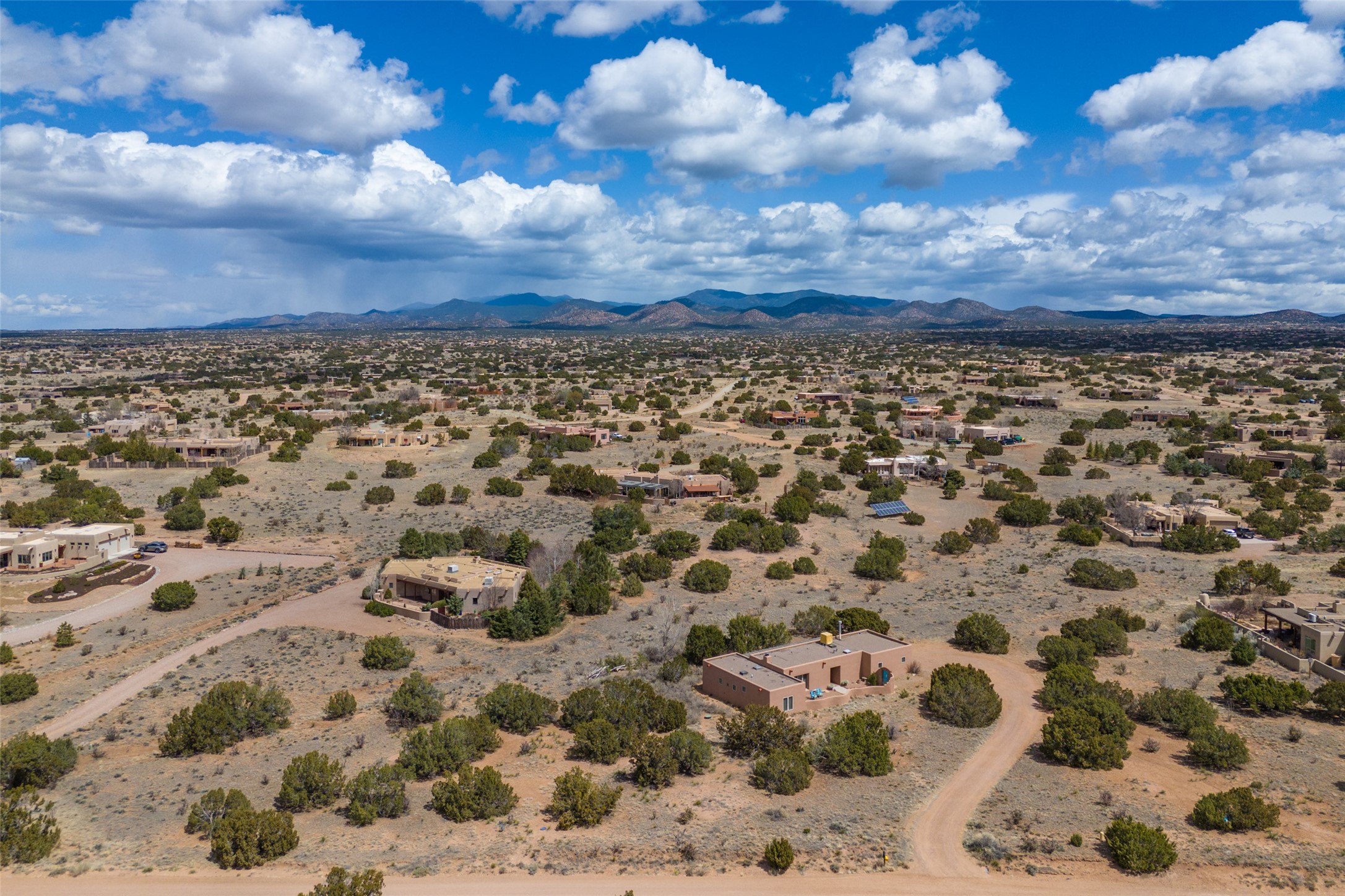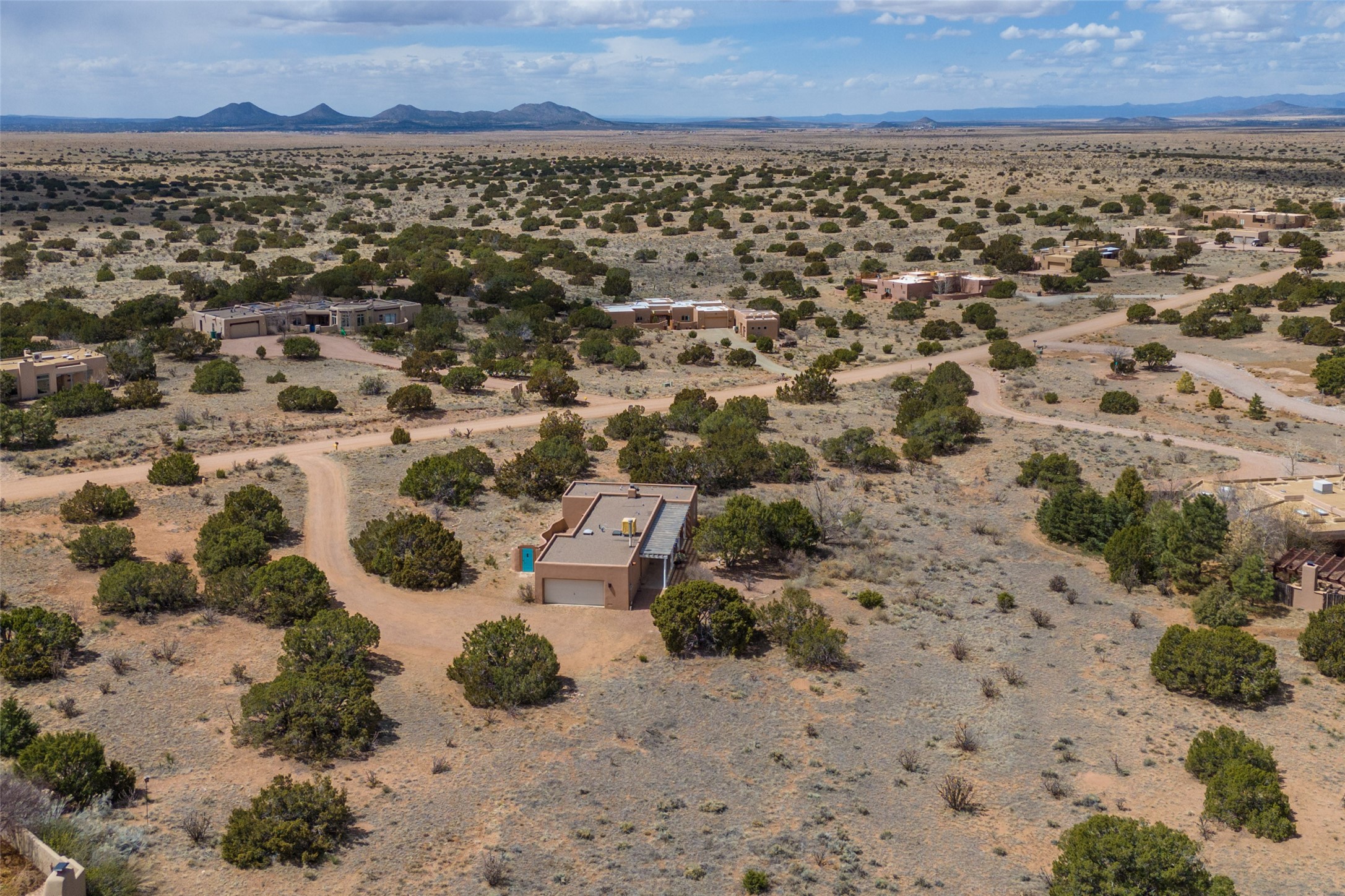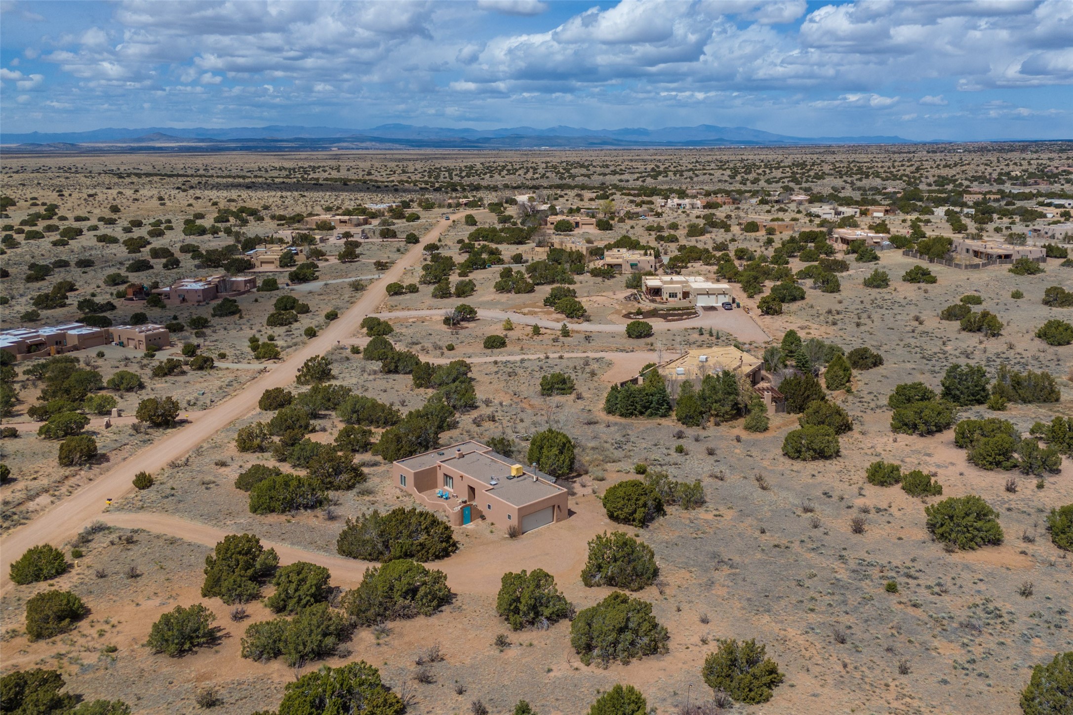 This one owner 2 bedroom, 2 bath open concept home in the peaceful Ladera section of Eldorado, designed by architect Bob Zachry, offers comfortable, contemporary living. The 1.77 acre lot is one of the larger lots in the area. The home has been freshly painted (03/25) and features a living room with wood burning fireplace, tongue and groove ceiling and beams, and a large picture window flanked by bookcases which go to the ceiling. A large informal dining area adjacent to the kitchen offers room to gather for meals. The kitchen has a newer GE electric range (06/23). Unique floor plan features a primary suite with ensuite bath and walk in closet, and a separate guest suite with a bedroom, bath and linen closet. French doors to the guest suite allow for maximum privacy. Four skylights and large windows provide lots of natural light. French doors in the kitchen lead to a large portal (painted 05/22) where you can relax and enjoy your morning coffee. The oversized, drywalled attached garage leads to a combination mudroom, laundry, and pantry. Radiant heating with three zones and a central evaporative cooler will keep you comfortable year round. The courtyard and area near the rear portal has been xeriscaped. Stucco repaired and painted with elastomeric paint 05/22. Gas hot water heater replaced 01/24. Eldorado has a community center, swimming pool, dog park, walking paths, nature preserve, pickleball and tennis courts.