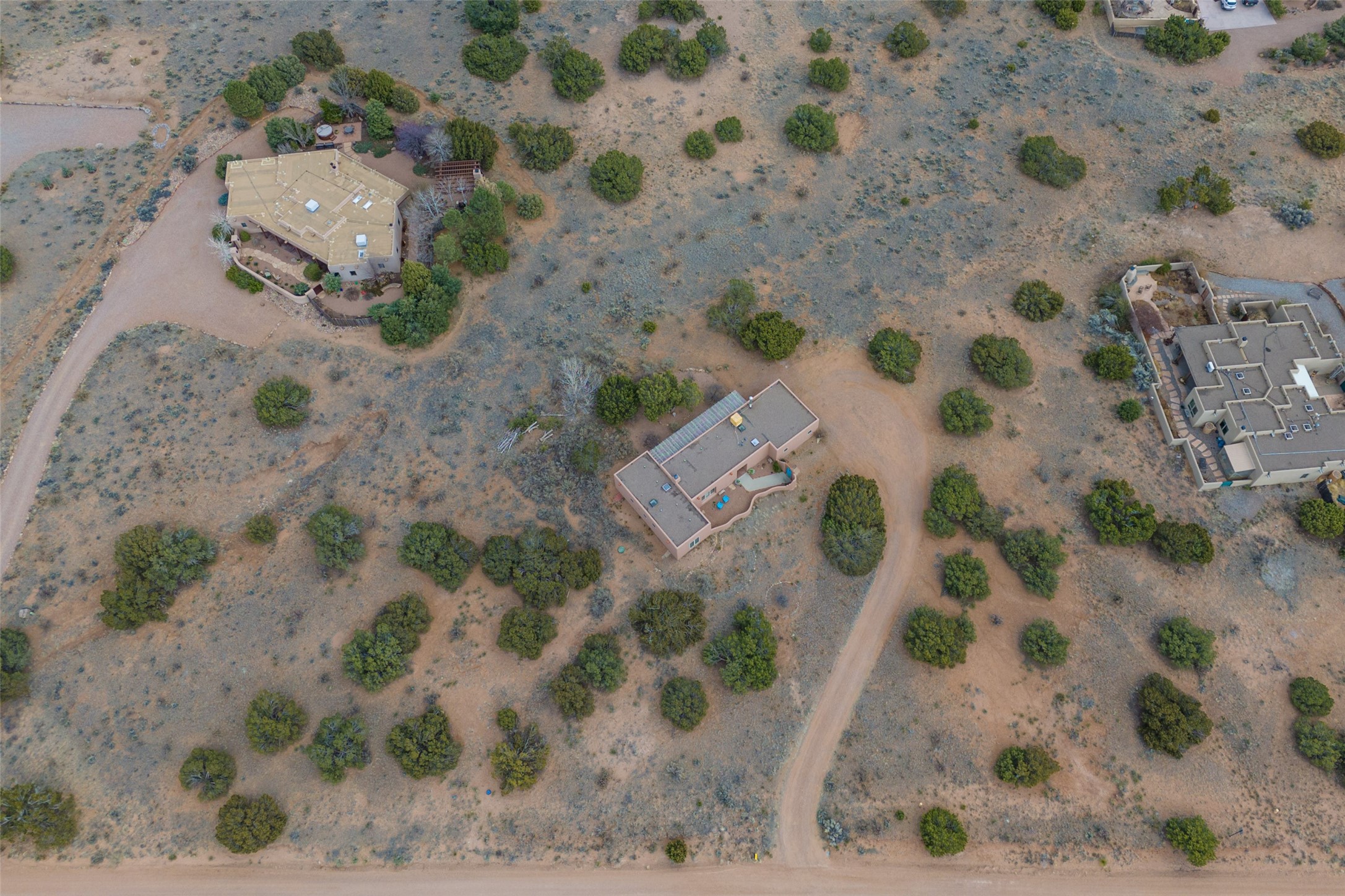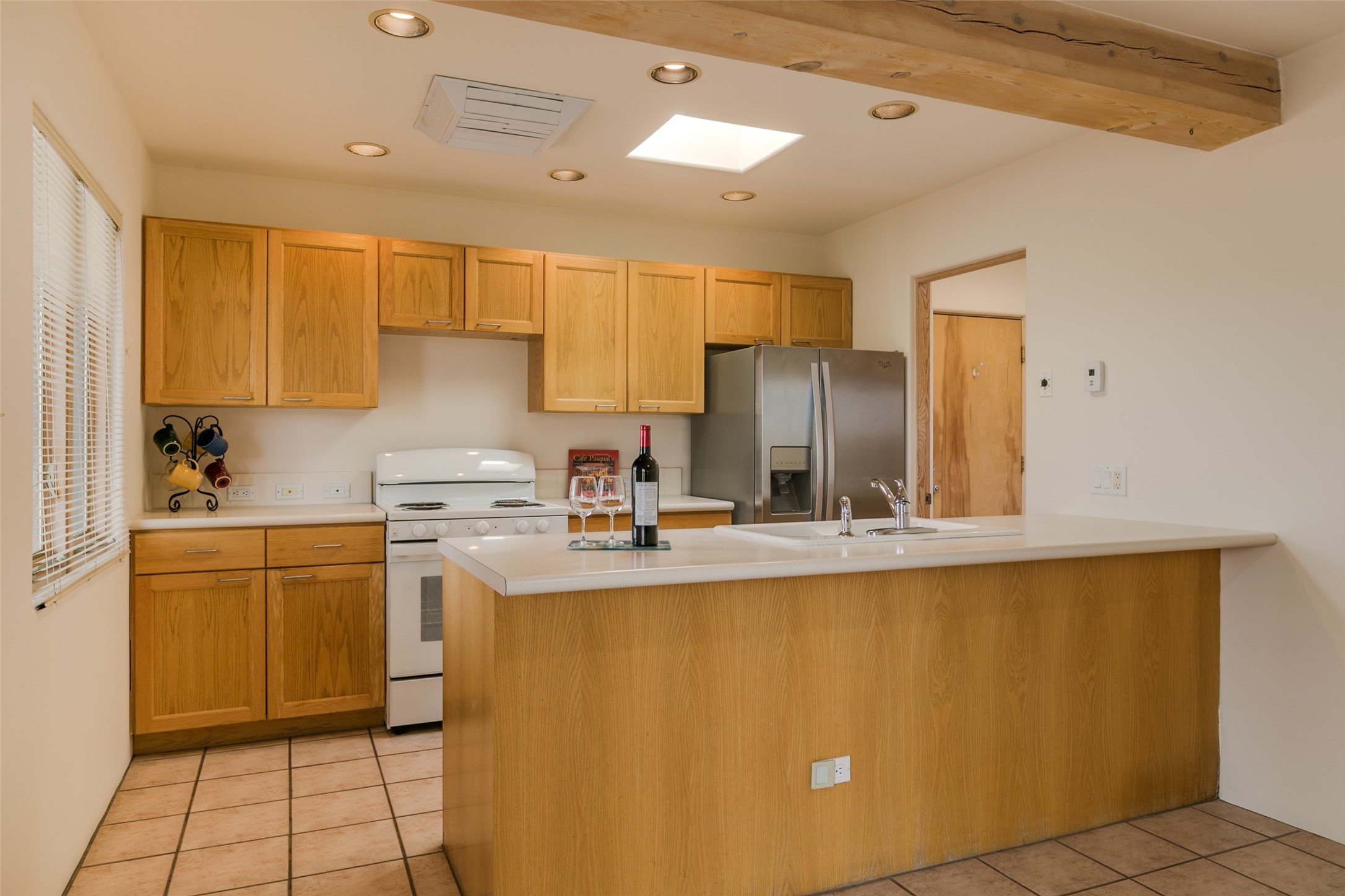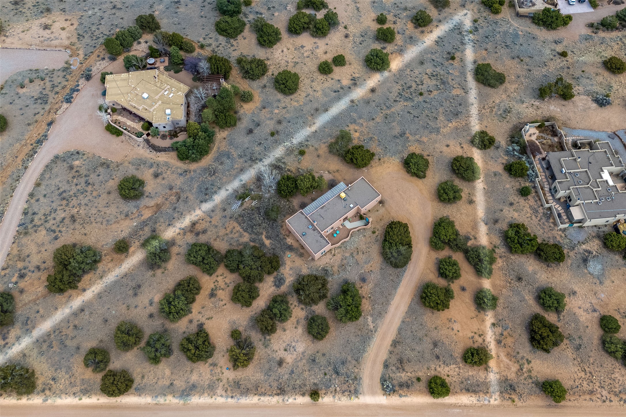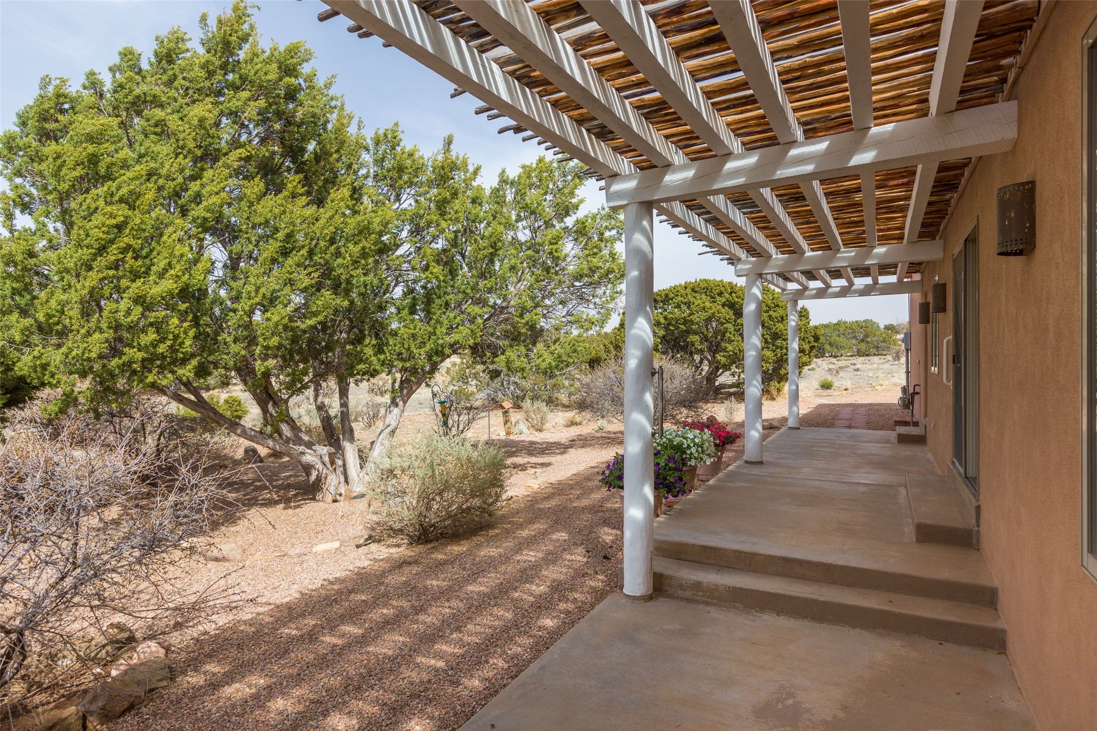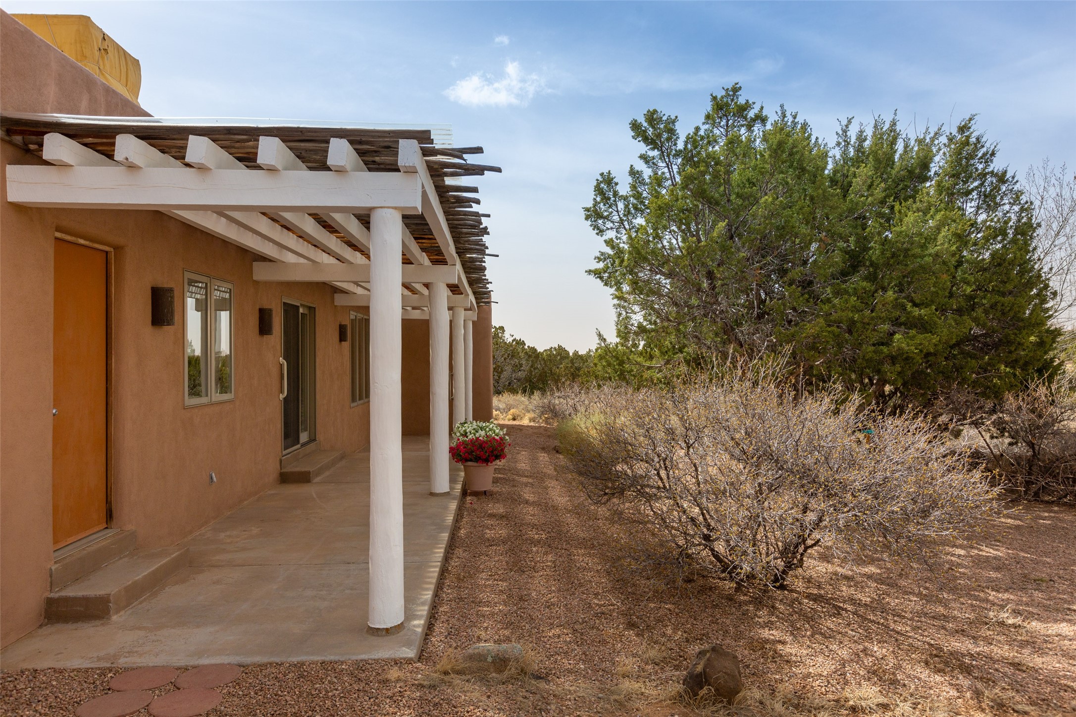This one owner 2 bedroom, 2 bath open concept home in the peaceful Ladera section of Eldorado, designed by architect Bob Zachry, offers comfortable, contemporary living. The 1.77 acre lot is one of the larger lots in the area. The home has been freshly painted (03/25) and features a living room with wood burning fireplace, tongue and groove ceiling and beams, and a large picture window flanked by bookcases which go to the ceiling. A large informal dining area adjacent to the kitchen offers room to gather for meals. The kitchen has a newer GE electric range (06/23). Unique floor plan features a primary suite with ensuite bath and walk in closet, and a separate guest suite with a bedroom, bath and linen closet. French doors to the guest suite allow for maximum privacy. Four skylights and large windows provide lots of natural light. French doors in the kitchen lead to a large portal (painted 05/22) where you can relax and enjoy your morning coffee. The oversized, drywalled attached garage leads to a combination mudroom, laundry, and pantry. Radiant heating with three zones and a central evaporative cooler will keep you comfortable year round. The courtyard and area near the rear portal has been xeriscaped. Stucco repaired and painted with elastomeric paint 05/22. Gas hot water heater replaced 01/24. Eldorado has a community center, swimming pool, dog park, walking paths, nature preserve, pickleball and tennis courts.
