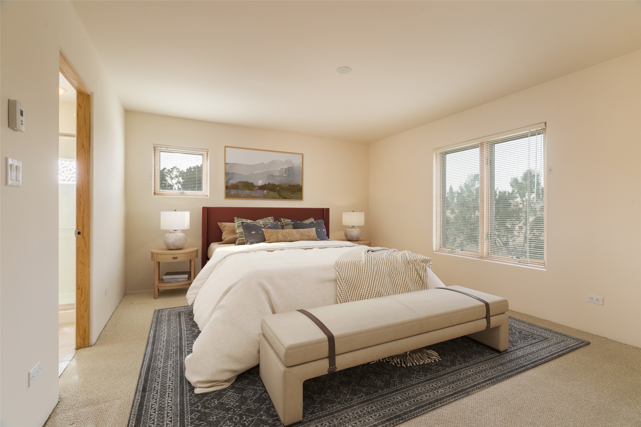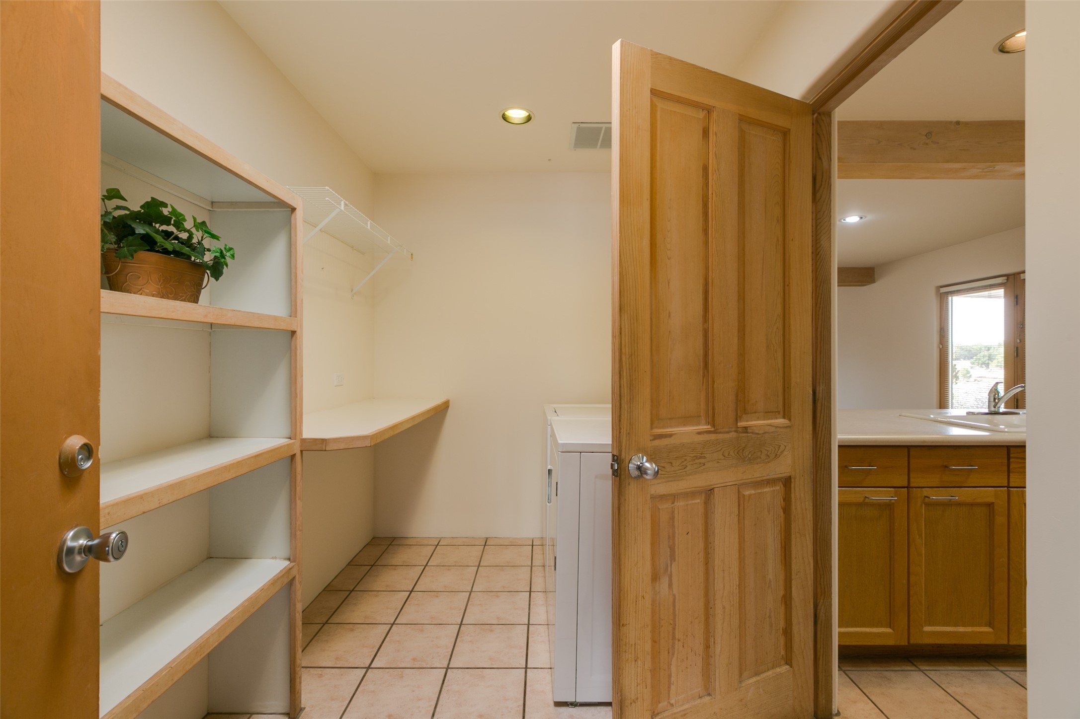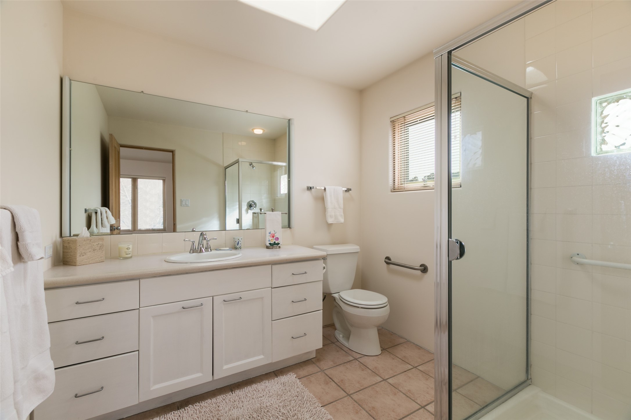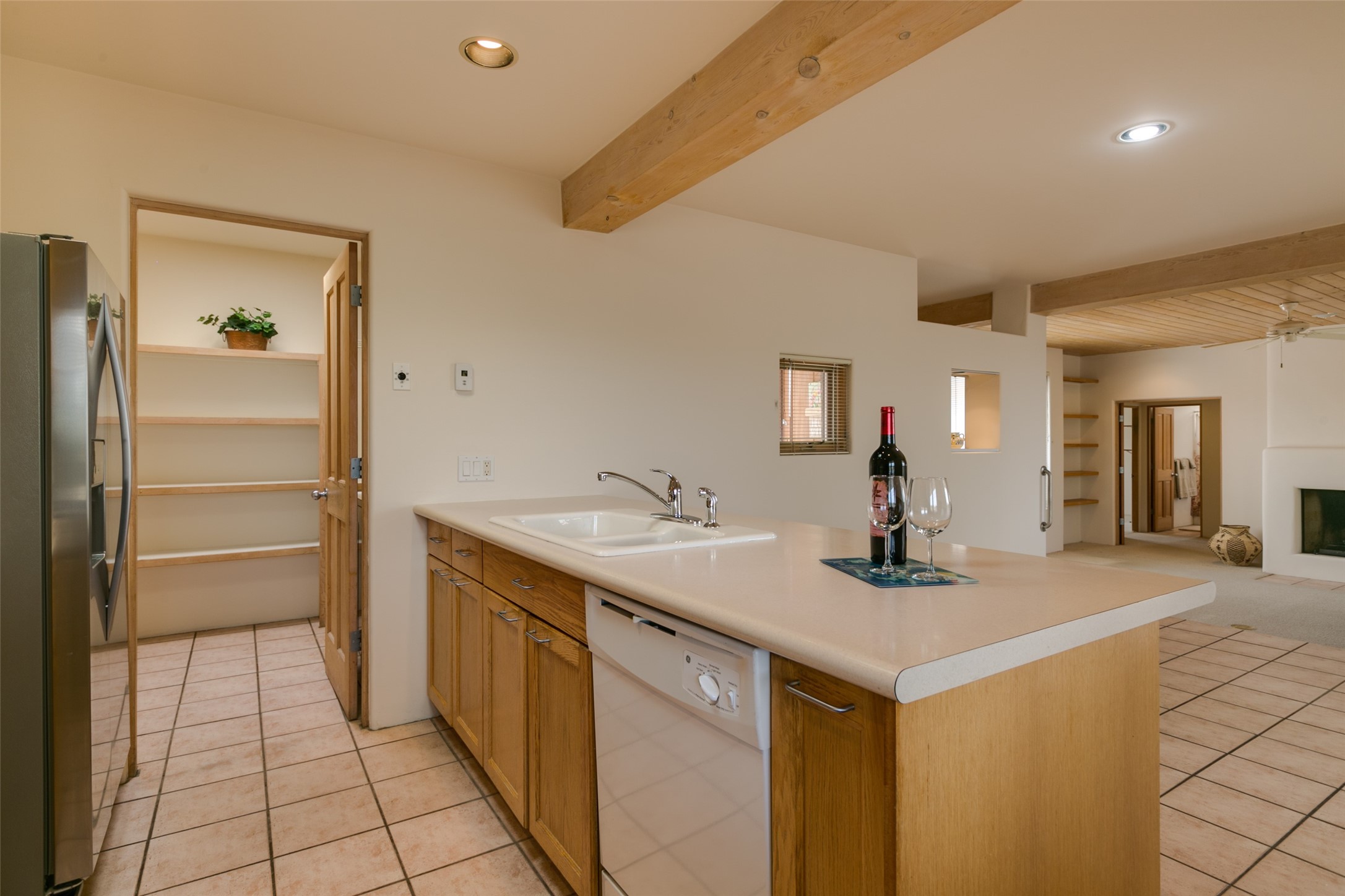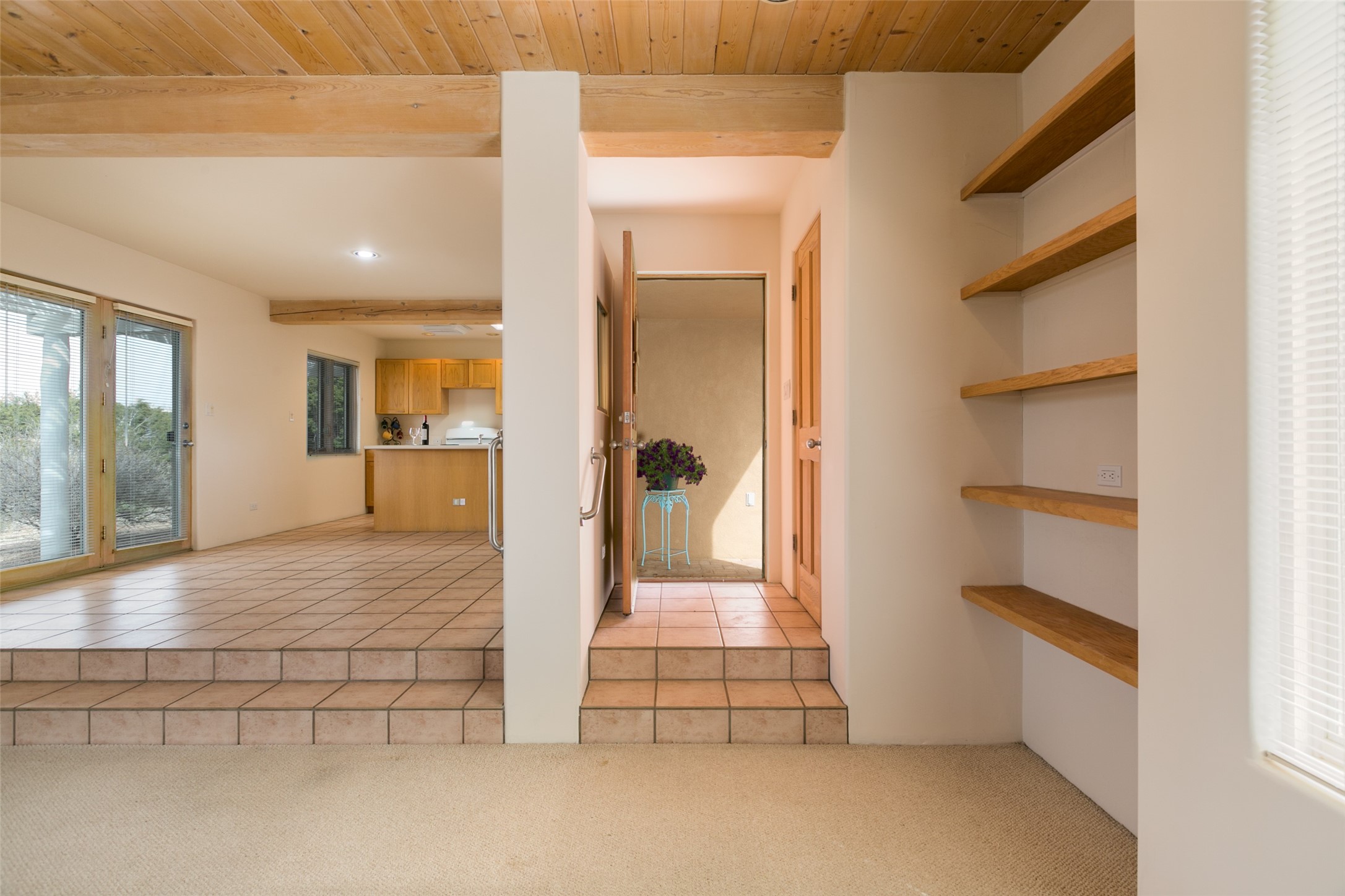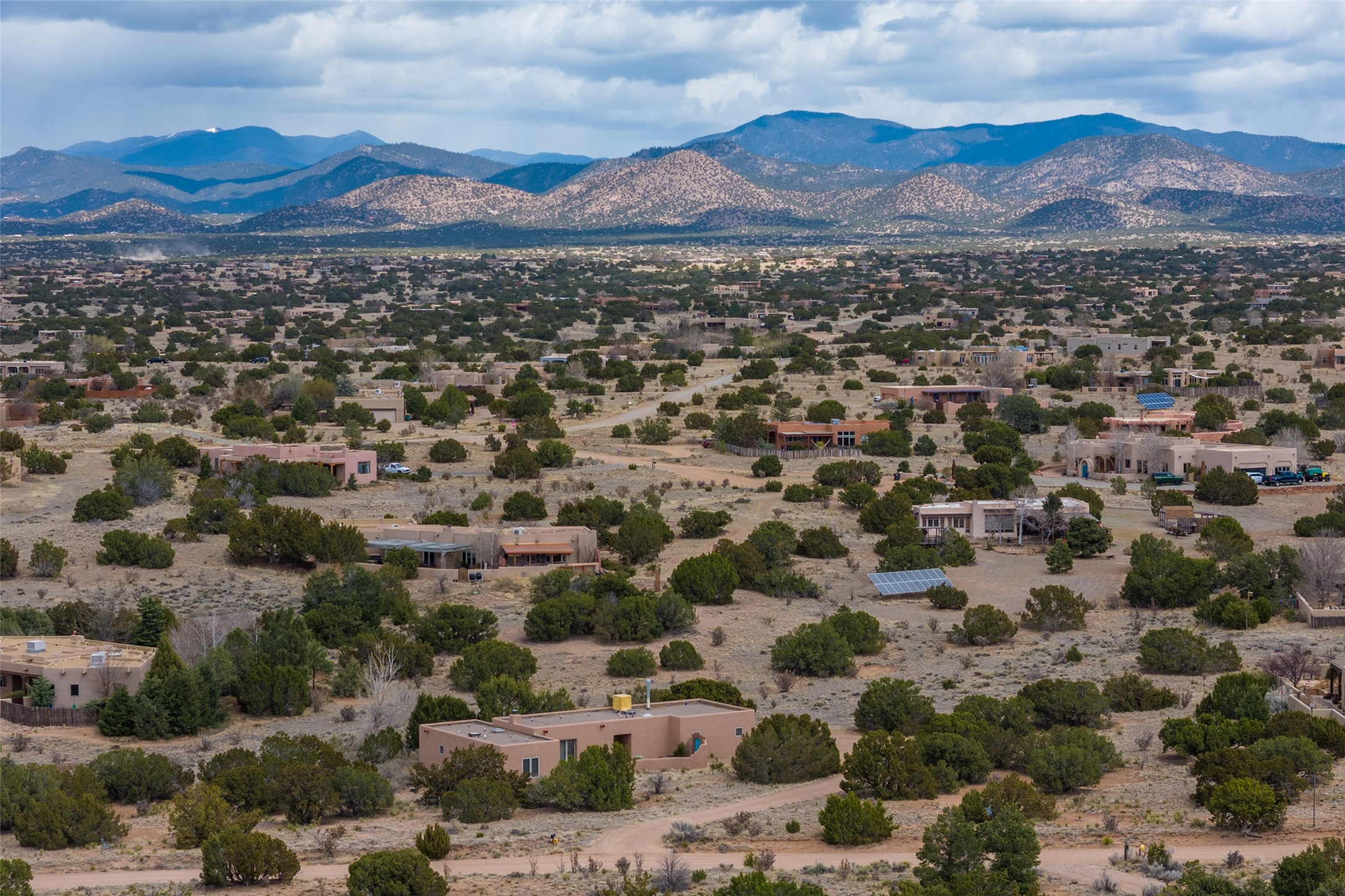 This one owner 2 bedroom, 2 bath open concept home in the peaceful Ladera section of Eldorado, designed by architect Bob Zachry, offers comfortable, contemporary living. The 1.77 acre lot is one of the larger lots in the area. The home has been freshly painted (03/25) and features a living room with wood burning fireplace, tongue and groove ceiling and beams, and a large picture window flanked by bookcases which go to the ceiling. A large informal dining area adjacent to the kitchen offers room to gather for meals. The kitchen has a newer GE electric range (06/23). Unique floor plan features a primary suite with ensuite bath and walk in closet, and a separate guest suite with a bedroom, bath and linen closet. French doors to the guest suite allow for maximum privacy. Four skylights and large windows provide lots of natural light. French doors in the kitchen lead to a large portal (painted 05/22) where you can relax and enjoy your morning coffee. The oversized, drywalled attached garage leads to a combination mudroom, laundry, and pantry. Radiant heating with three zones and a central evaporative cooler will keep you comfortable year round. The courtyard and area near the rear portal has been xeriscaped. Stucco repaired and painted with elastomeric paint 05/22. Gas hot water heater replaced 01/24. Eldorado has a community center, swimming pool, dog park, walking paths, nature preserve, pickleball and tennis courts.