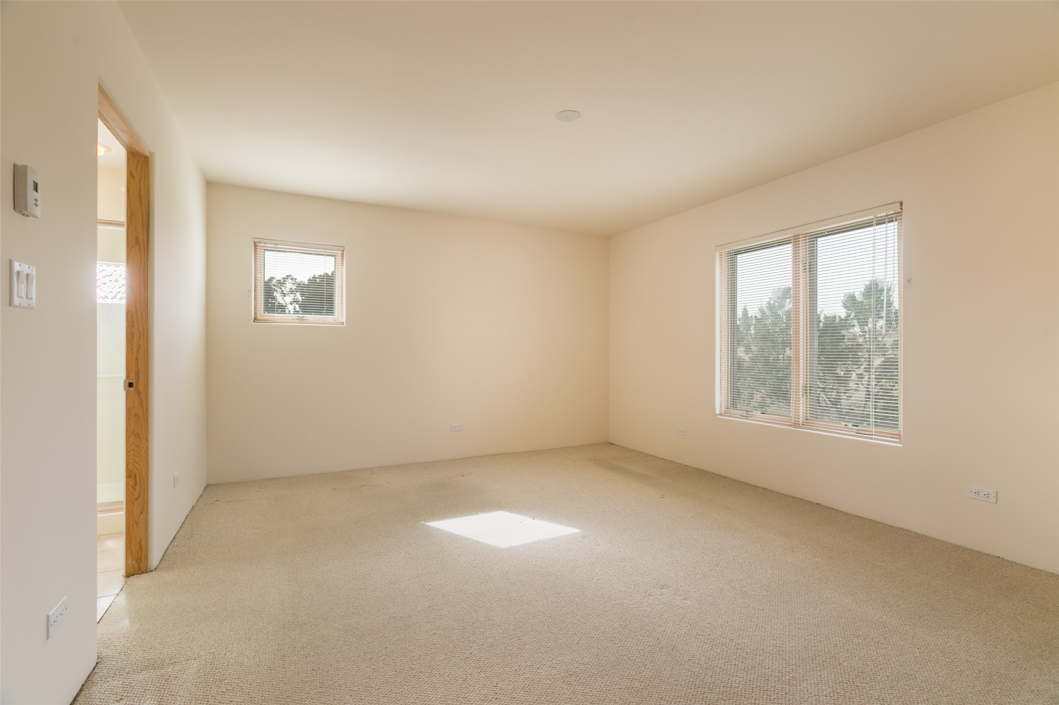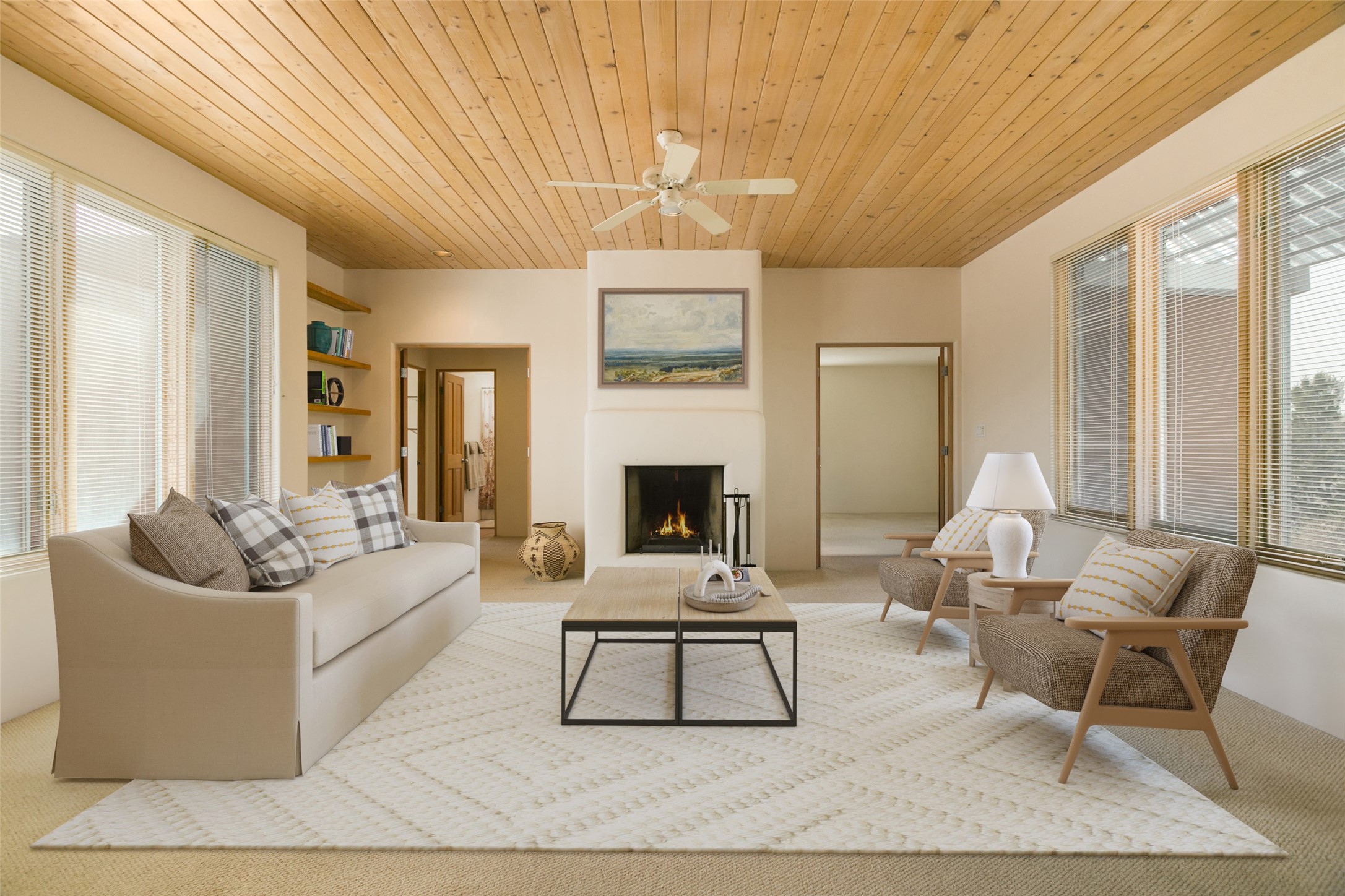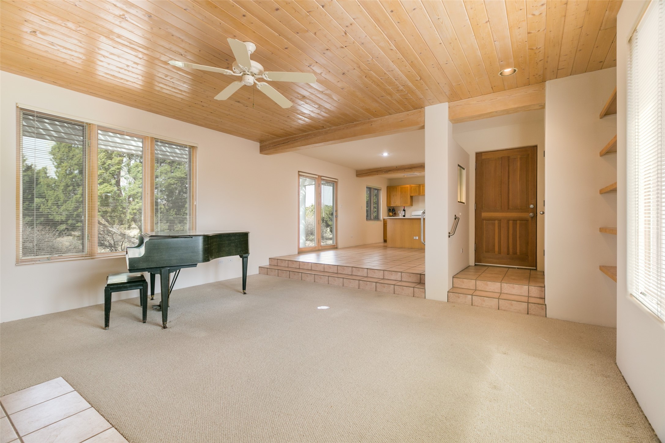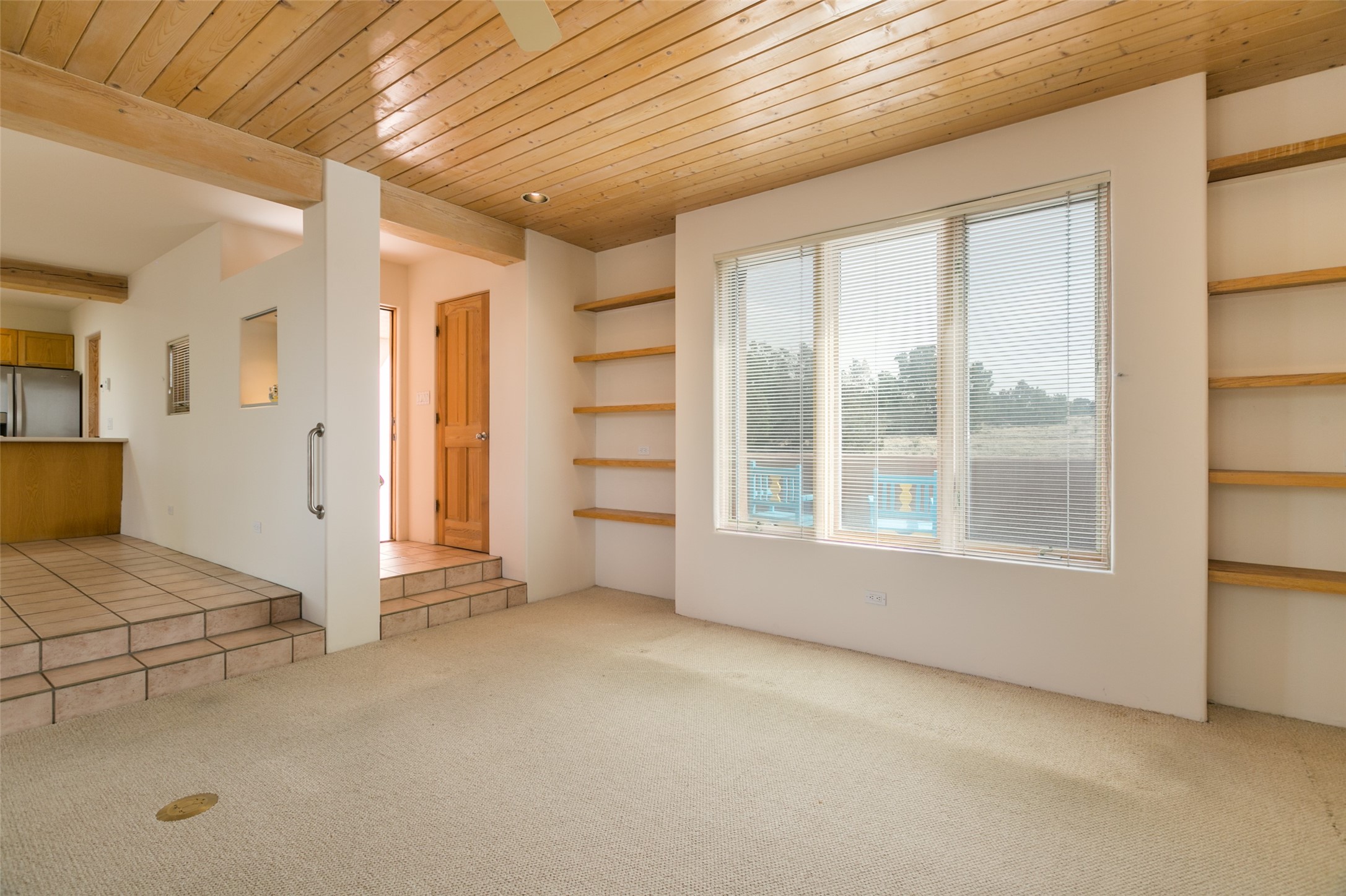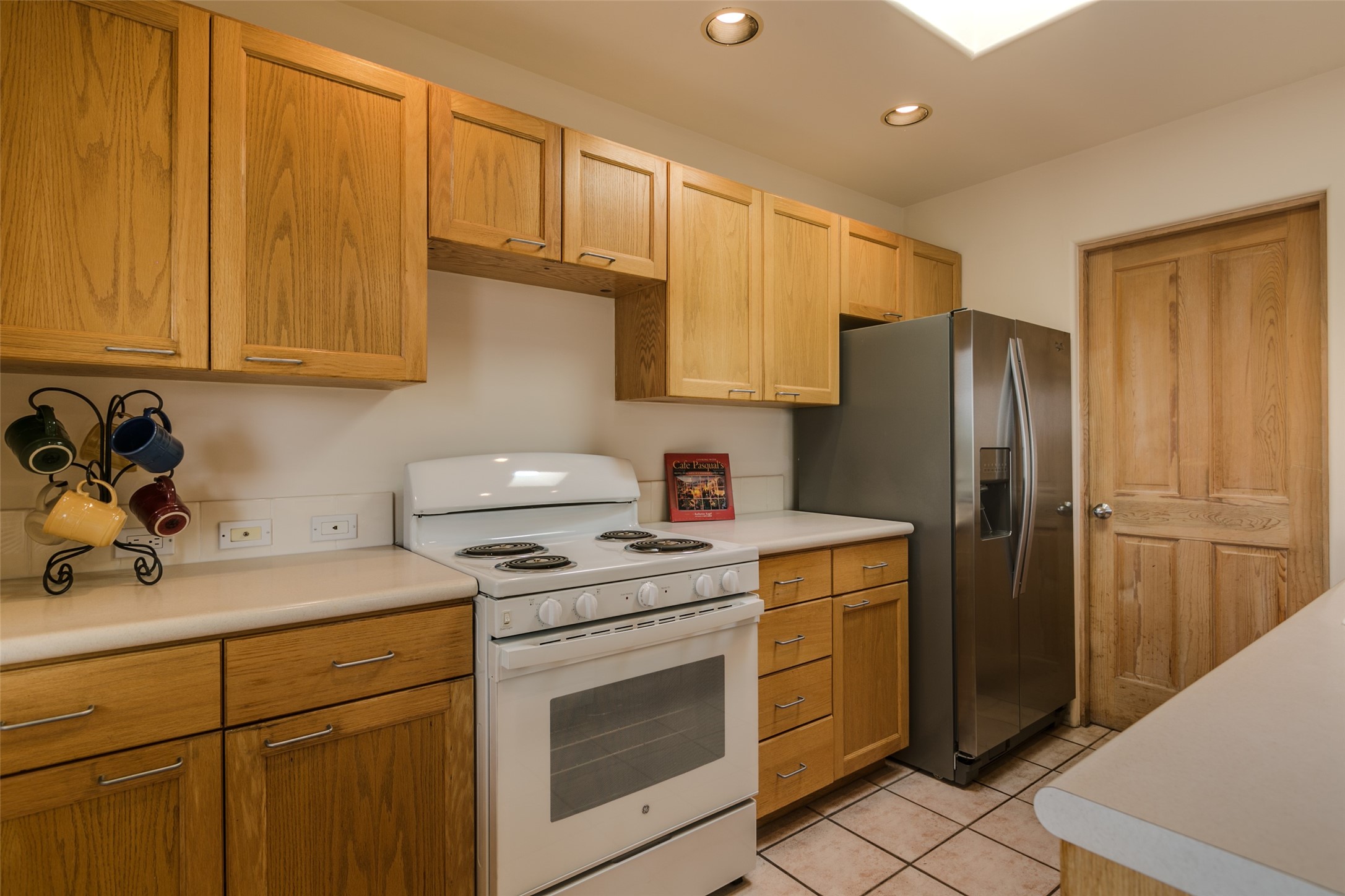 This one owner 2 bedroom, 2 bath open concept home in the peaceful Ladera section of Eldorado, designed by architect Bob Zachry, offers comfortable, contemporary living. The 1.77 acre lot is one of the larger lots in the area. The home has been freshly painted (03/25) and features a living room with wood burning fireplace, tongue and groove ceiling and beams, and a large picture window flanked by bookcases which go to the ceiling. A large informal dining area adjacent to the kitchen offers room to gather for meals. The kitchen has a newer GE electric range (06/23). Unique floor plan features a primary suite with ensuite bath and walk in closet, and a separate guest suite with a bedroom, bath and linen closet. French doors to the guest suite allow for maximum privacy. Four skylights and large windows provide lots of natural light. French doors in the kitchen lead to a large portal (painted 05/22) where you can relax and enjoy your morning coffee. The oversized, drywalled attached garage leads to a combination mudroom, laundry, and pantry. Radiant heating with three zones and a central evaporative cooler will keep you comfortable year round. The courtyard and area near the rear portal has been xeriscaped. Stucco repaired and painted with elastomeric paint 05/22. Gas hot water heater replaced 01/24. Eldorado has a community center, swimming pool, dog park, walking paths, nature preserve, pickleball and tennis courts.