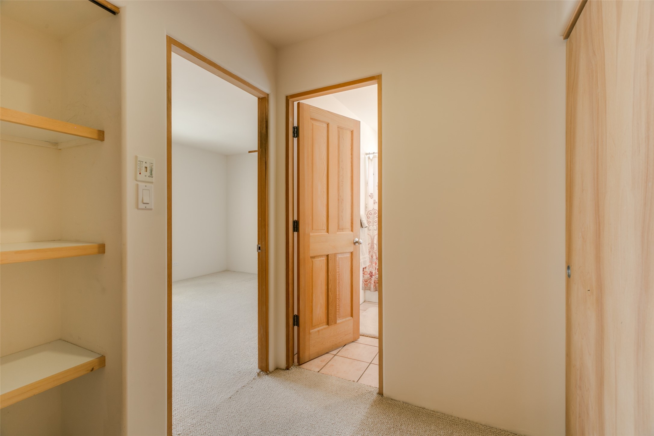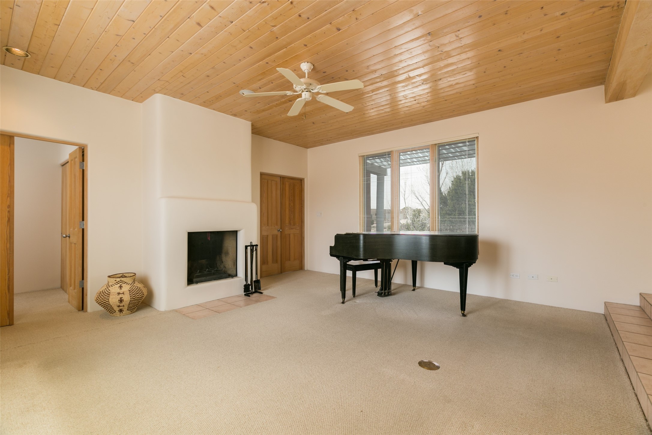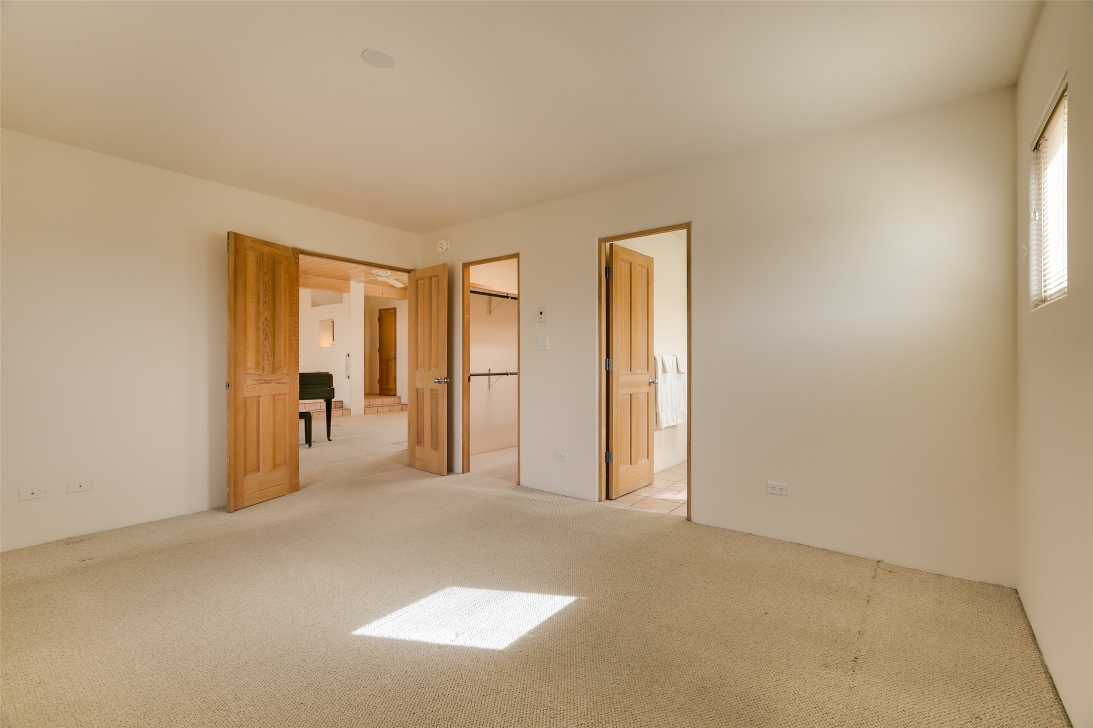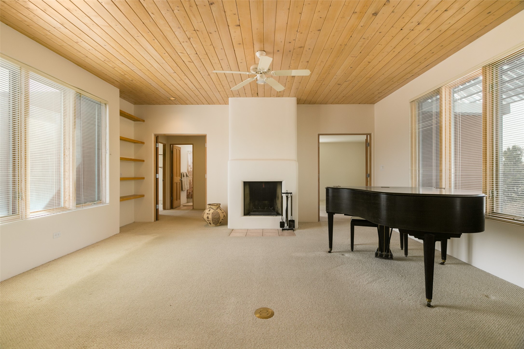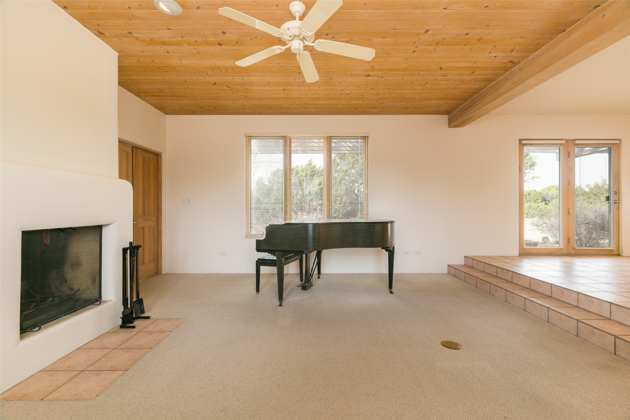 This one owner 2 bedroom, 2 bath open concept home in the peaceful Ladera section of Eldorado, designed by architect Bob Zachry, offers comfortable, contemporary living. The 1.77 acre lot is one of the larger lots in the area. The home has been freshly painted (03/25) and features a living room with wood burning fireplace, tongue and groove ceiling and beams, and a large picture window flanked by bookcases which go to the ceiling. A large informal dining area adjacent to the kitchen offers room to gather for meals. The kitchen has a newer GE electric range (06/23). Unique floor plan features a primary suite with ensuite bath and walk in closet, and a separate guest suite with a bedroom, bath and linen closet. French doors to the guest suite allow for maximum privacy. Four skylights and large windows provide lots of natural light. French doors in the kitchen lead to a large portal (painted 05/22) where you can relax and enjoy your morning coffee. The oversized, drywalled attached garage leads to a combination mudroom, laundry, and pantry. Radiant heating with three zones and a central evaporative cooler will keep you comfortable year round. The courtyard and area near the rear portal has been xeriscaped. Stucco repaired and painted with elastomeric paint 05/22. Gas hot water heater replaced 01/24. Eldorado has a community center, swimming pool, dog park, walking paths, nature preserve, pickleball and tennis courts.