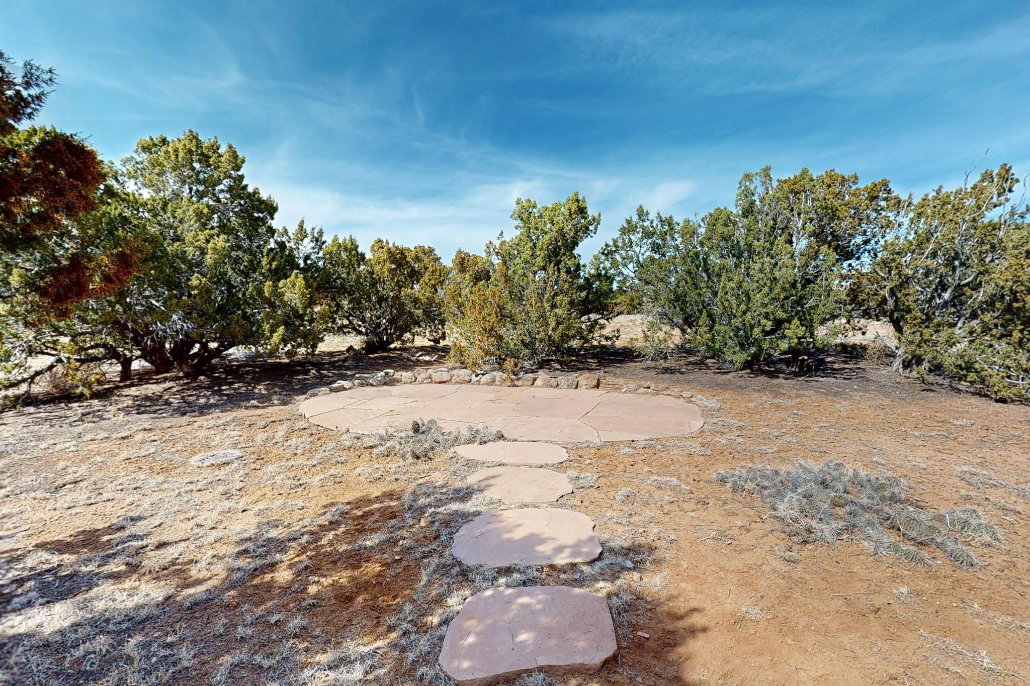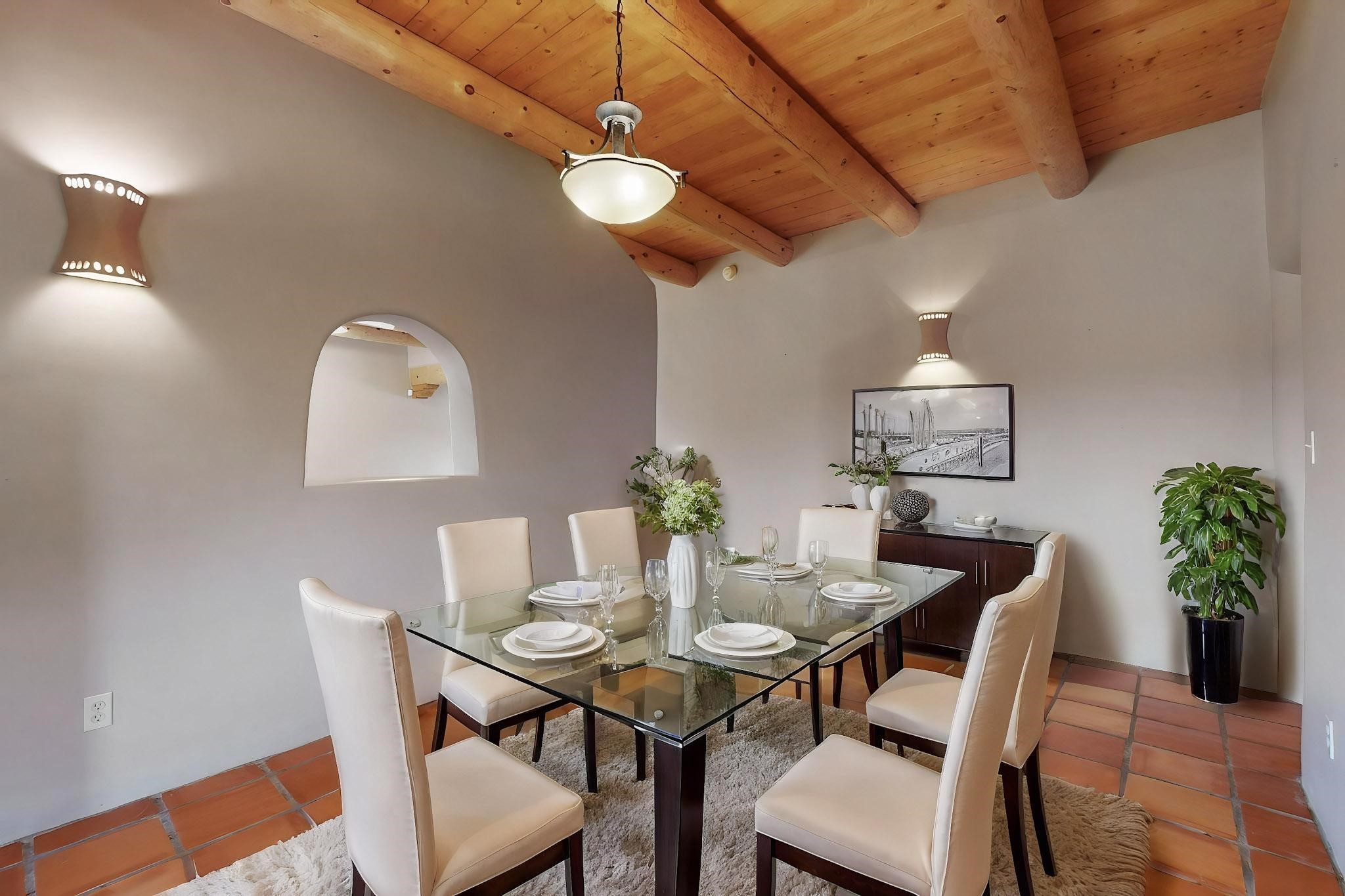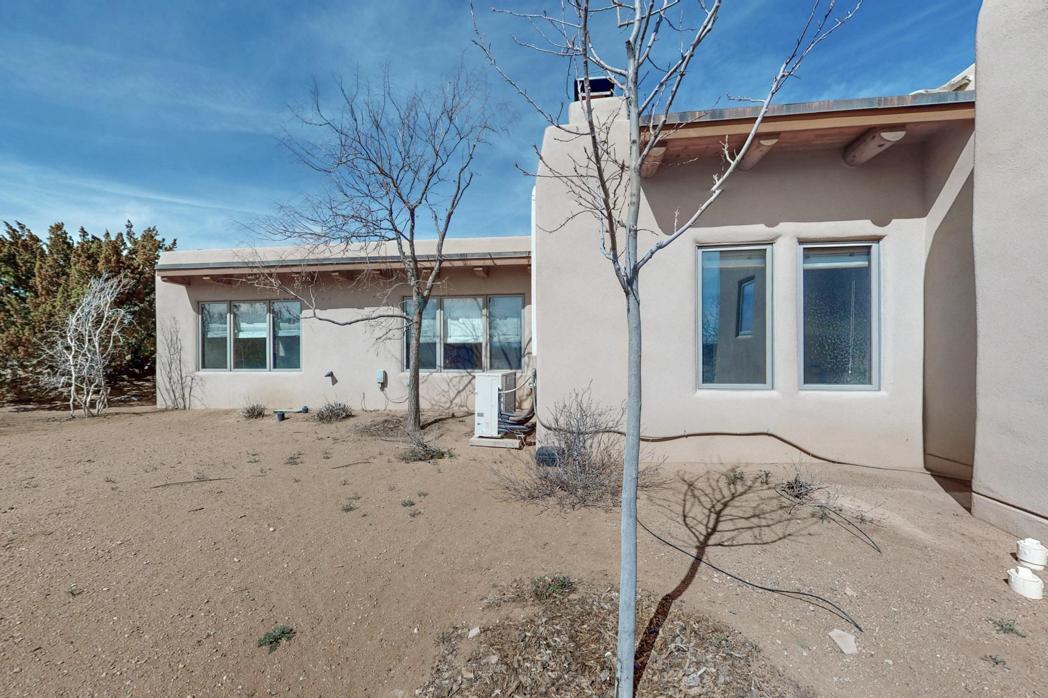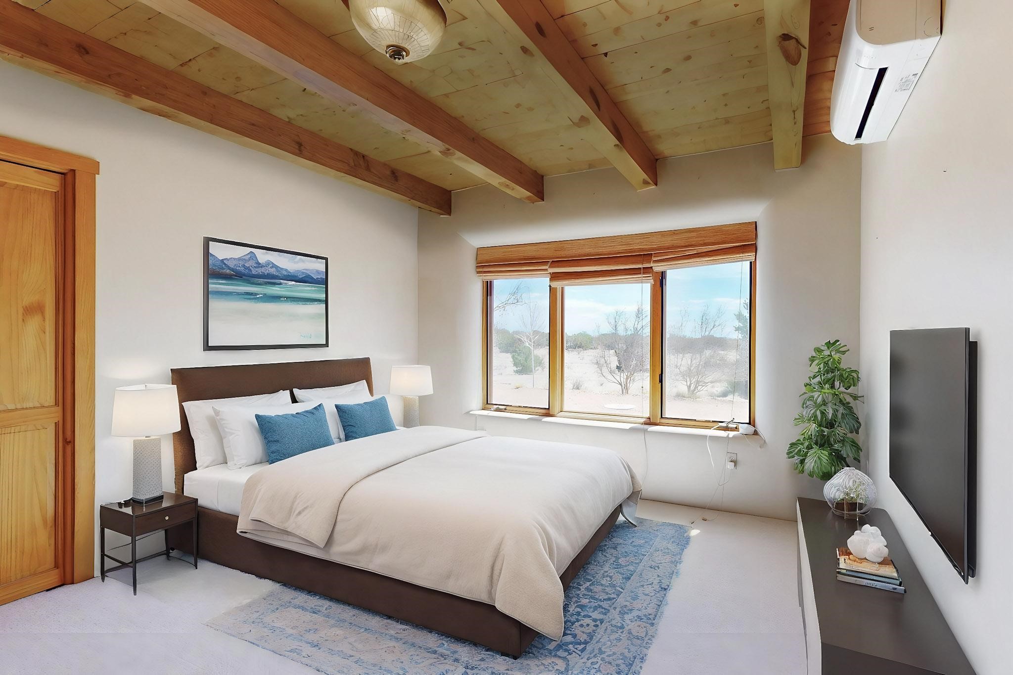 Set back from the road for privacy, this beautifully built adobe home by Shaylube Construction offers multiple access points and versatile outdoor spaces. Designed with thoughtful detail, it begins with a welcoming entrance room ideal for drinking morning coffee or greeting guests, flowing seamlessly into a charming living area with a traditional kiva fireplace. The dining room is conveniently located between the entrance and living room, creating an easy flow for entertaining. The kitchen boasts exceptional storage with multiple lazy-susan cupboards and a built-in China cabinet. The spacious primary bedroom features its own kiva fireplace, creating a warm, inviting retreat. Two additional bedrooms offer flexibility, along with a possible third bedroom or office with a secure, locking storage closet--perfect for valuables or private archives. At the rear of the home, accessed via an exterior walkway, a private office with custom built bookshelves and rich wood flooring provides a peaceful workspace. This well-maintained home comes with significant recent upgrades: Completely re-roofed in 2018 with warranty through 2028; New furnace and tankless water heater 2015; Updated mini-split systems 2024; New refrigerator 2023. Includes mountain views, multiple patios and garden spaces, and a flexible floor plan that allows for independence and coexistence under one roof.