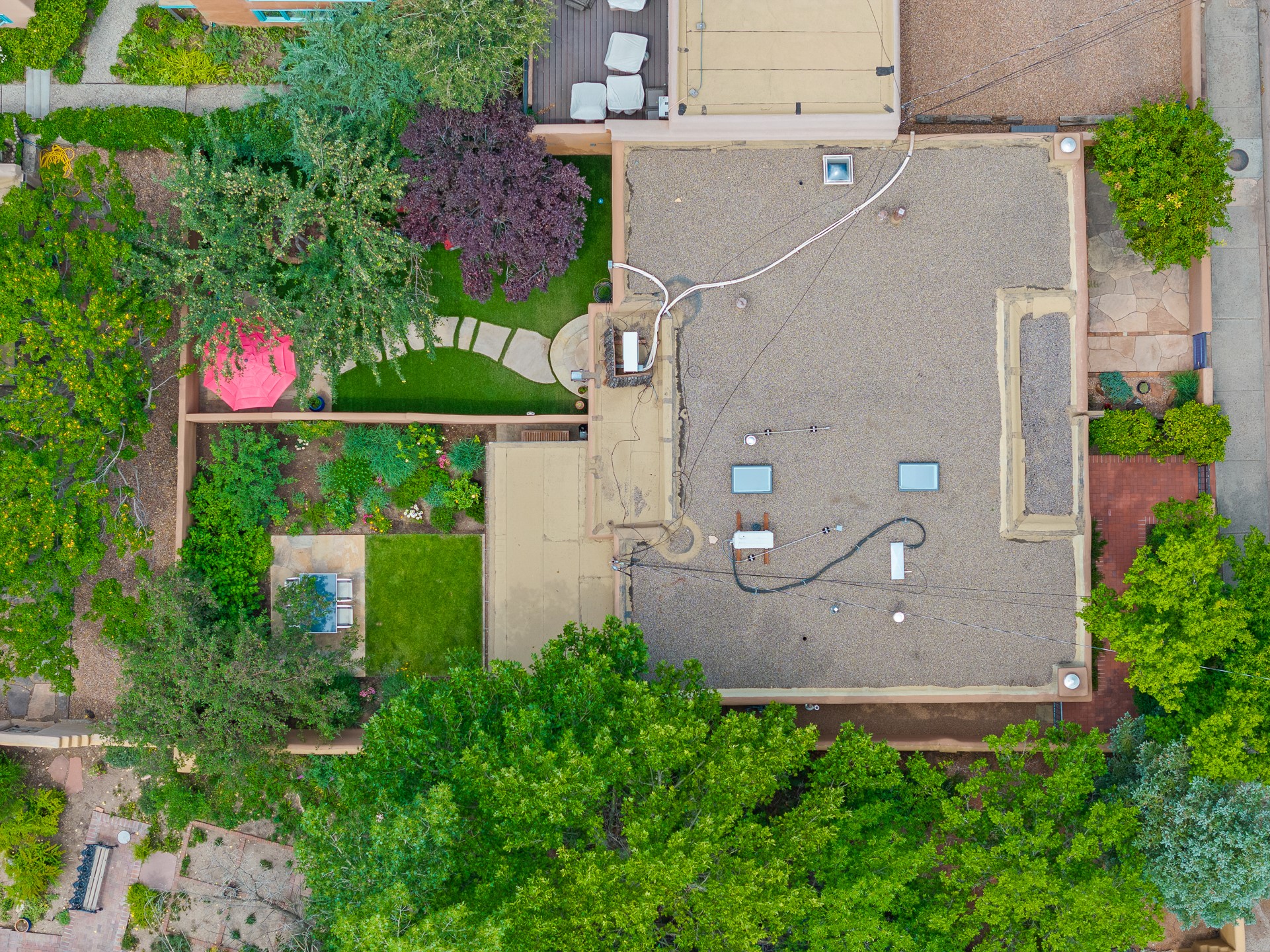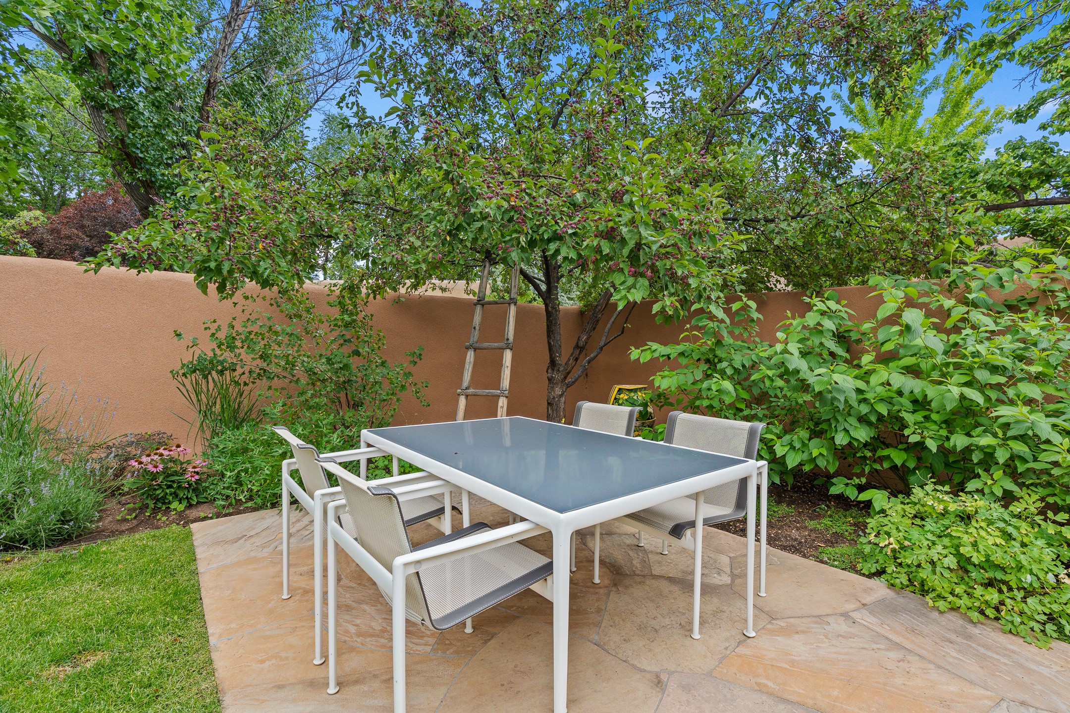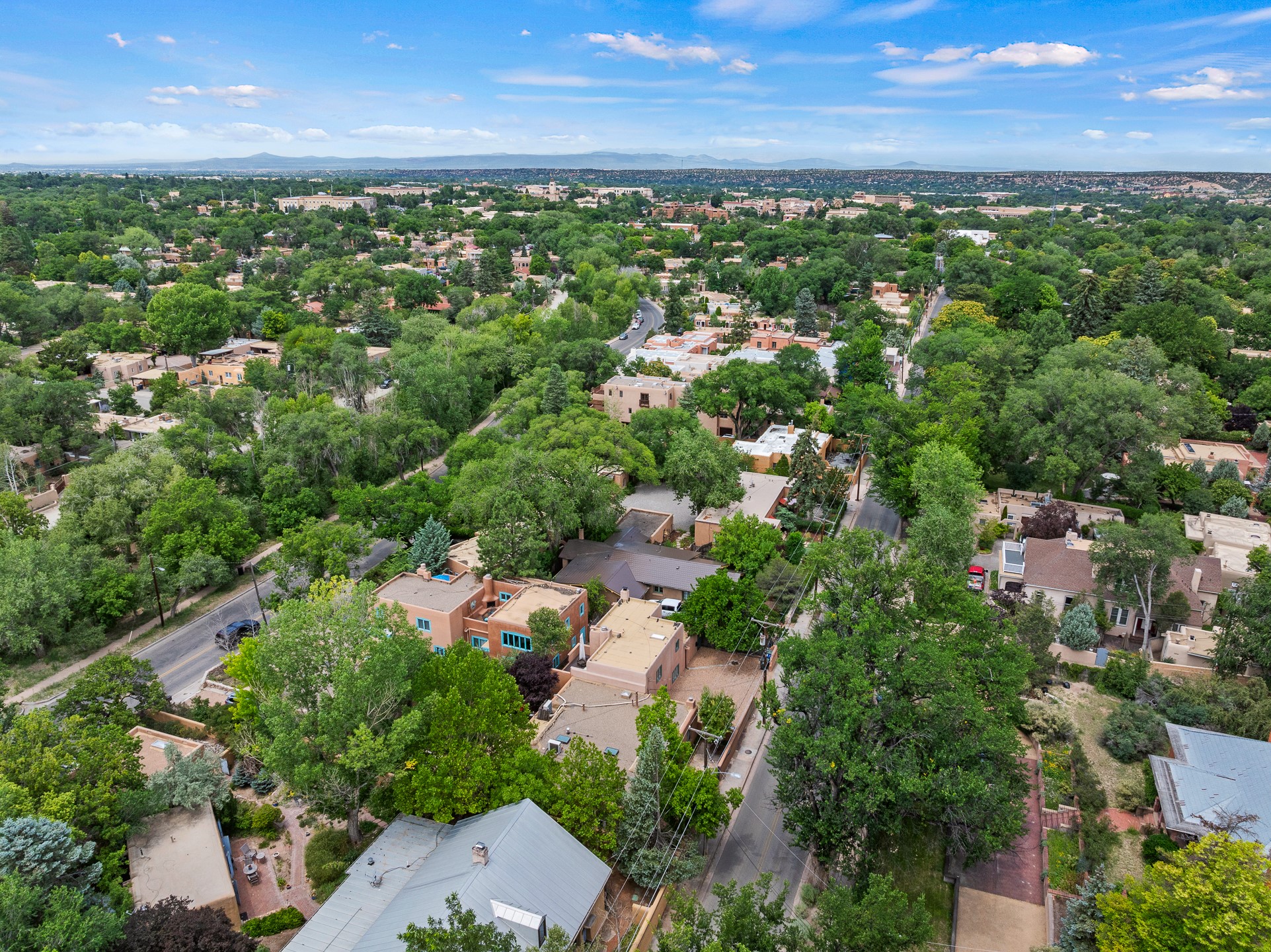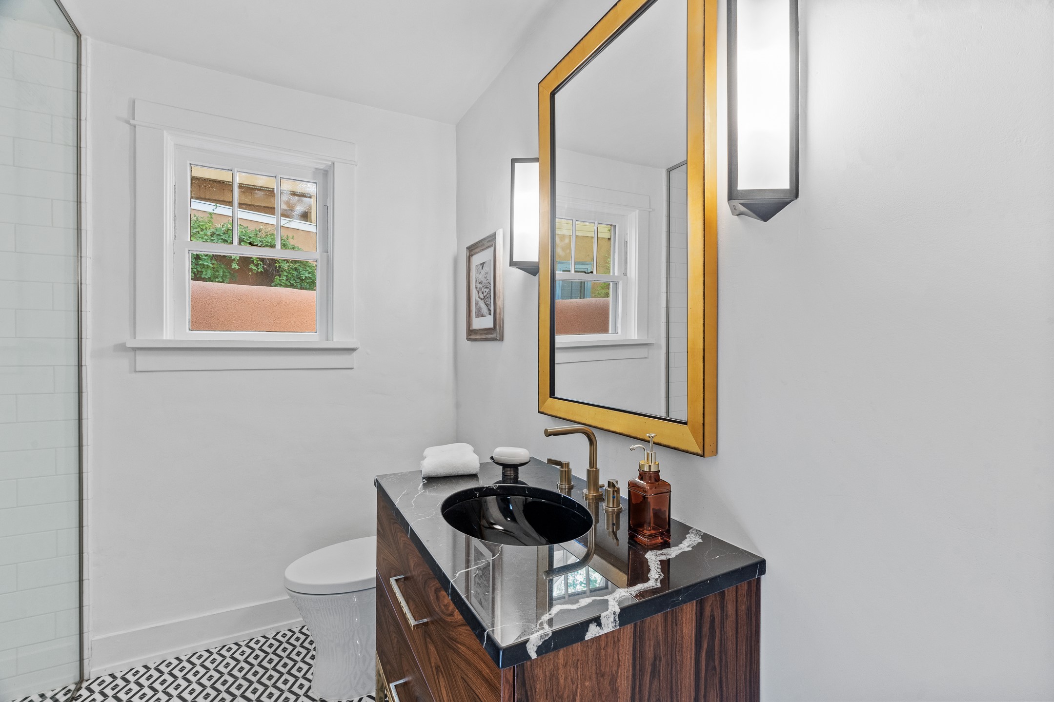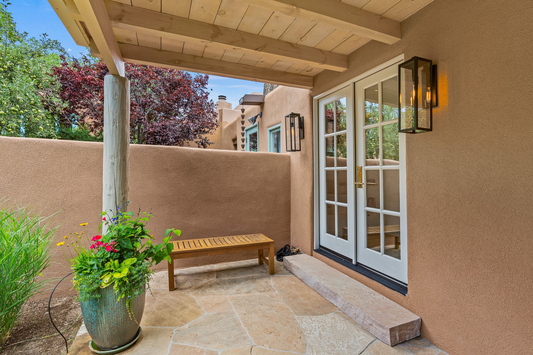 This impeccably designed 1920s adobe condo, nestled just three blocks from The Plaza and Canyon Road, is the crown jewel of coveted East Palace Avenue. Completely renovated in 2020, this exquisite 1-bedroom, 1-bathroom residence seamlessly blends Santa Fe charm with the sophistication of a Manhattan penthouse. The open floor plan is bathed in soft, natural light, featuring a refined living and dining area with a graceful kiva fireplace, beautifully refinished oak floors, and recessed art lighting. The kitchen is a true showpiece, boasting Ebony Macassar cabinetry, solid brass hardware by Water Street, and top-tier Asko, Sub-Zero, and Wolf appliances. Classico Quartz countertops and striking Black Marquina marble tile walls add a bold, modern aesthetic.The spacious bedroom offers custom closets and elegant French doors leading to a south-facing portal and a lush courtyard garden--an oasis of natural beauty with a classic flagstone patio, all masterfully designed by Linda Churchill of the Santa Fe Botanical Gardens. The bathroom is a masterpiece in itself, featuring a black-and-white marble mosaic walk-in shower, a custom rosewood vanity with bronze hardware, and a Nero Marquina marble countertop. A hidden surprise of this property is its rare, generous basement--an uncommon luxury in Santa Fe. Additional 2020 upgrades include new ductless heating and A/C, as well as upgraded electrical and plumbing. 638 East Palace is a rare fusion of sophistication and elegance--a radiant jewel in Santa Fe's architectural treasure chest.