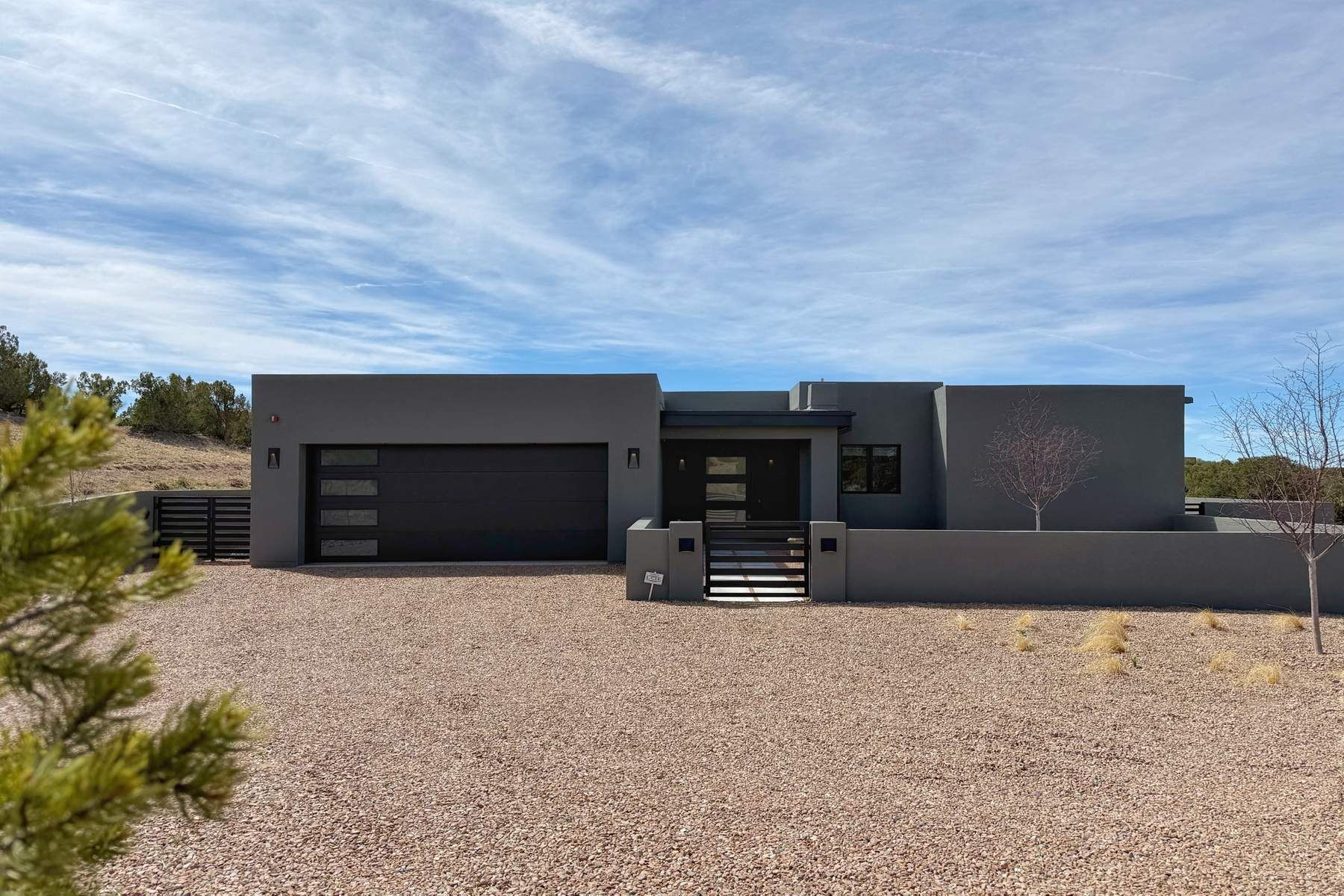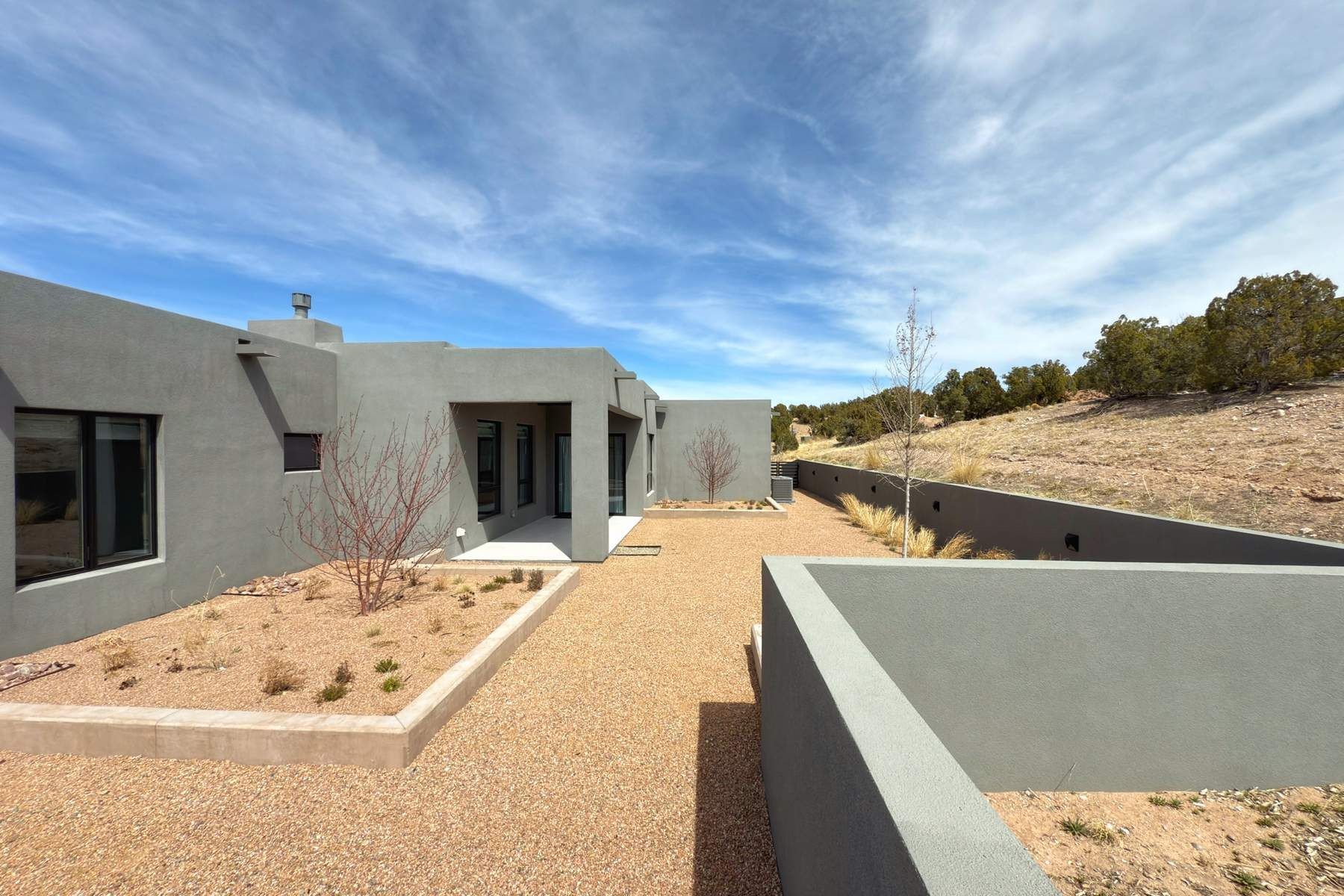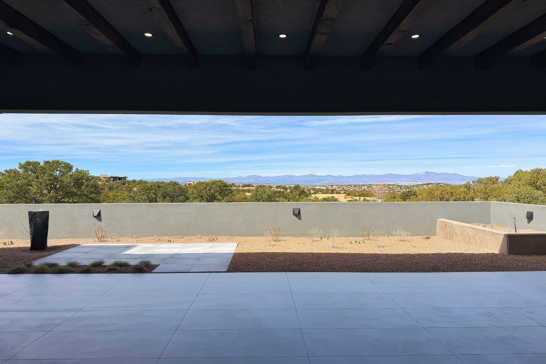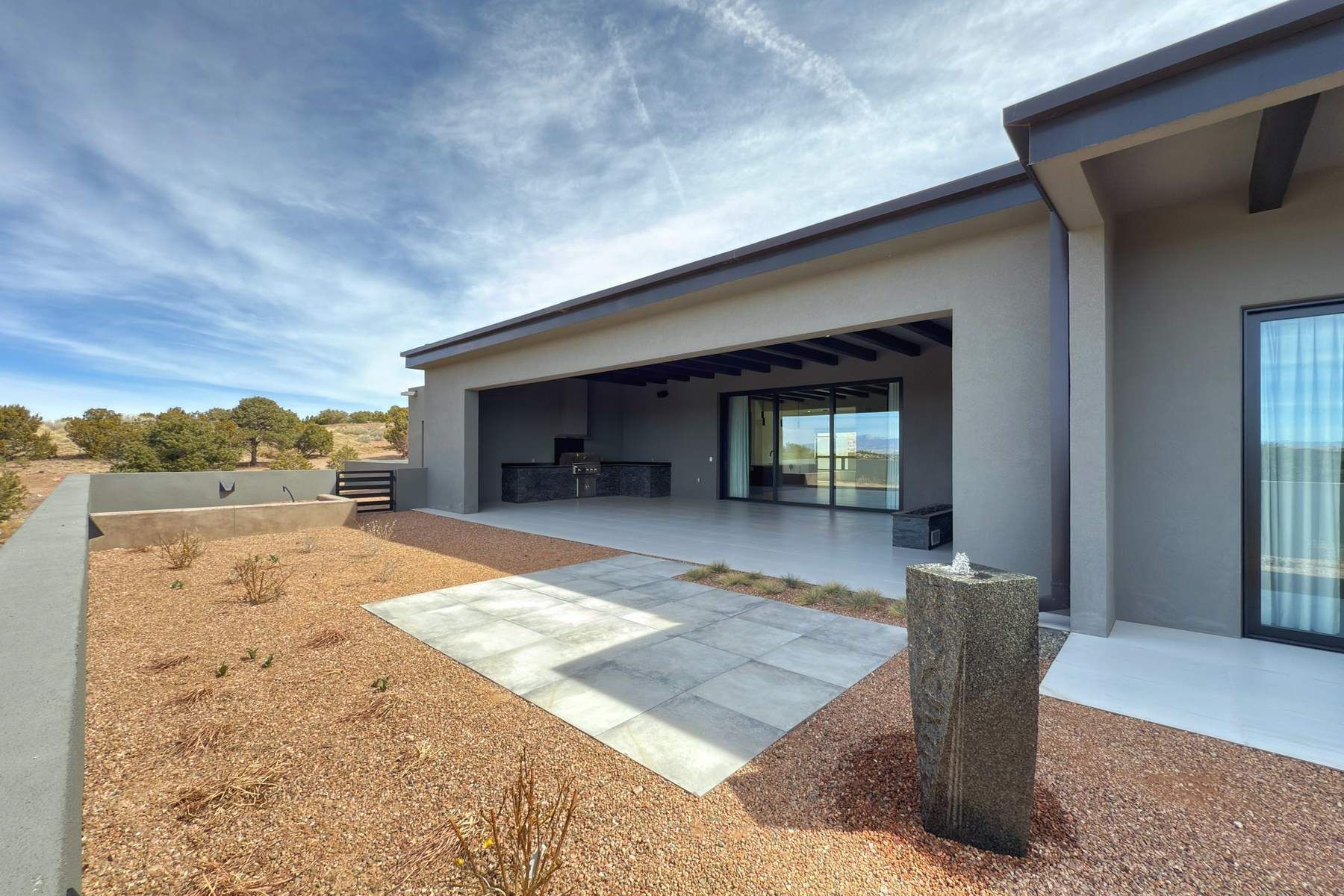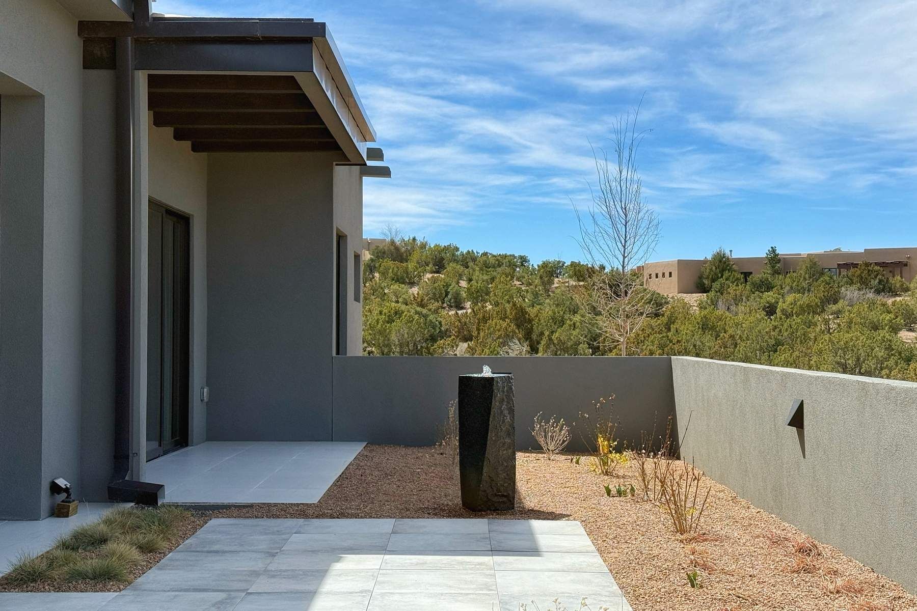 Experience contemporary living in this stunning 2023 home built by David Cordova. Nestled on 2.64 acres in Sundance Ridge. Spanning approximately 2,775 sq. ft., this 3-bedroom, 3-bathroom residence offers seclusion and privacy while being just a 17-minute drive to the Santa Fe Plaza. The living room boasts high ceilings, a beautiful accent wall with a gas fireplace, and built-in shelves, creating a refined yet cozy ambiance. Step outside to take in breathtaking sunset views over the Jemez Mountains from the covered portals and walled outdoor spaces. Entertain with ease in the outdoor kitchen, while the large walk-in butler's pantry with a second refrigerator makes hosting large gatherings a breeze. Or unwind amid the tranquil setting, surrounded by mature trees and nature. Designed for seamless indoor-outdoor living, the primary suite features large sliding doors that open to a private patio, perfect for enjoying the natural surroundings. A gas fireplace with a striking accent wall adds warmth and elegance to the space. A bonus feature is the radiant floor heated garage. More than $100K invested in upgrades--including landscaping, yard walls, garage floor finish, and a custom fountain--makes this better than new. The home has never been occupied and is truly a turn-key property. This exquisite home blends modern comfort with the serenity of Santa Fe's landscape--don't miss the chance to make it yours.
