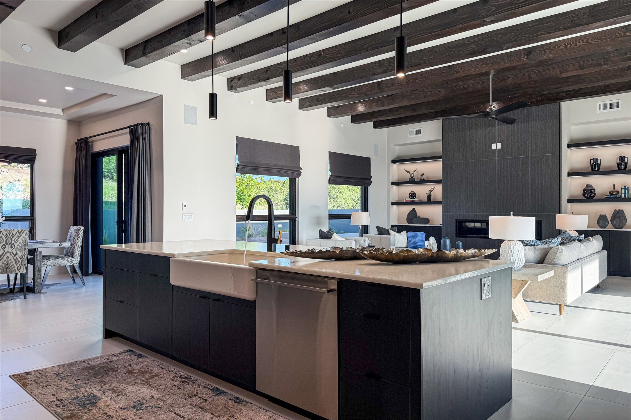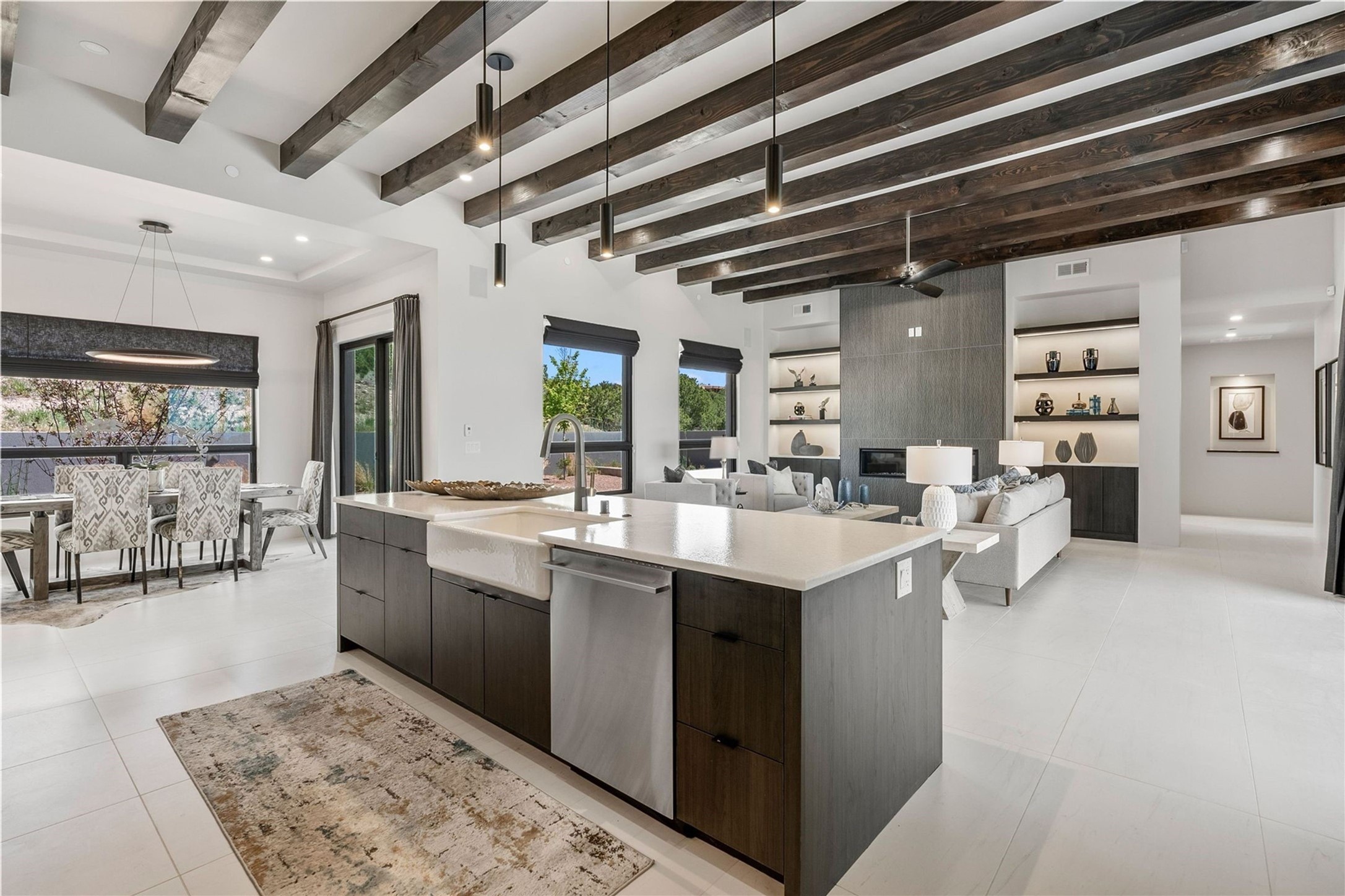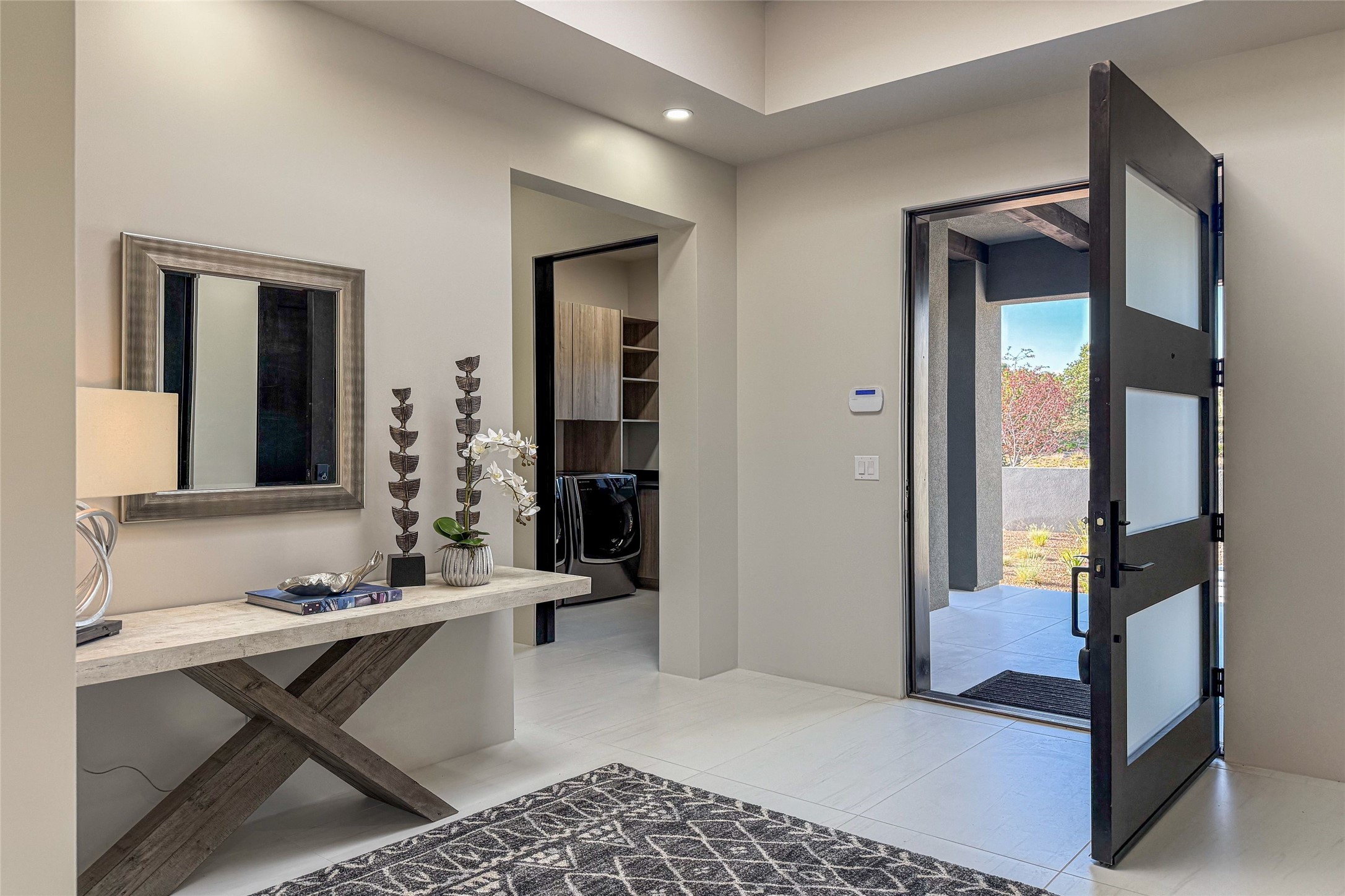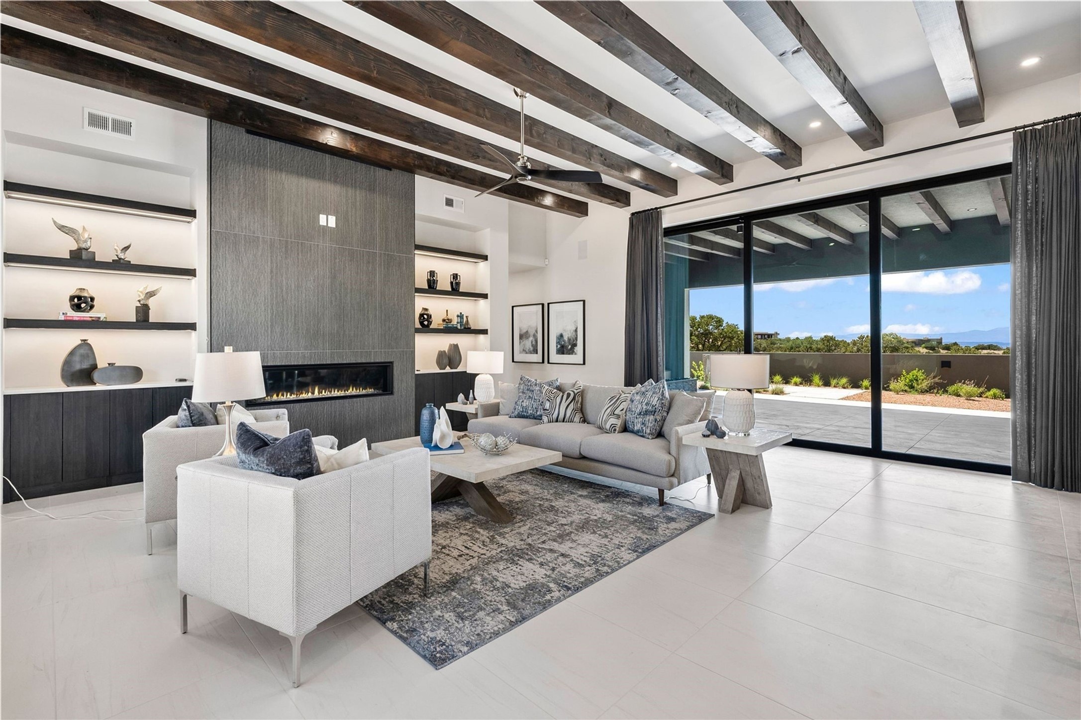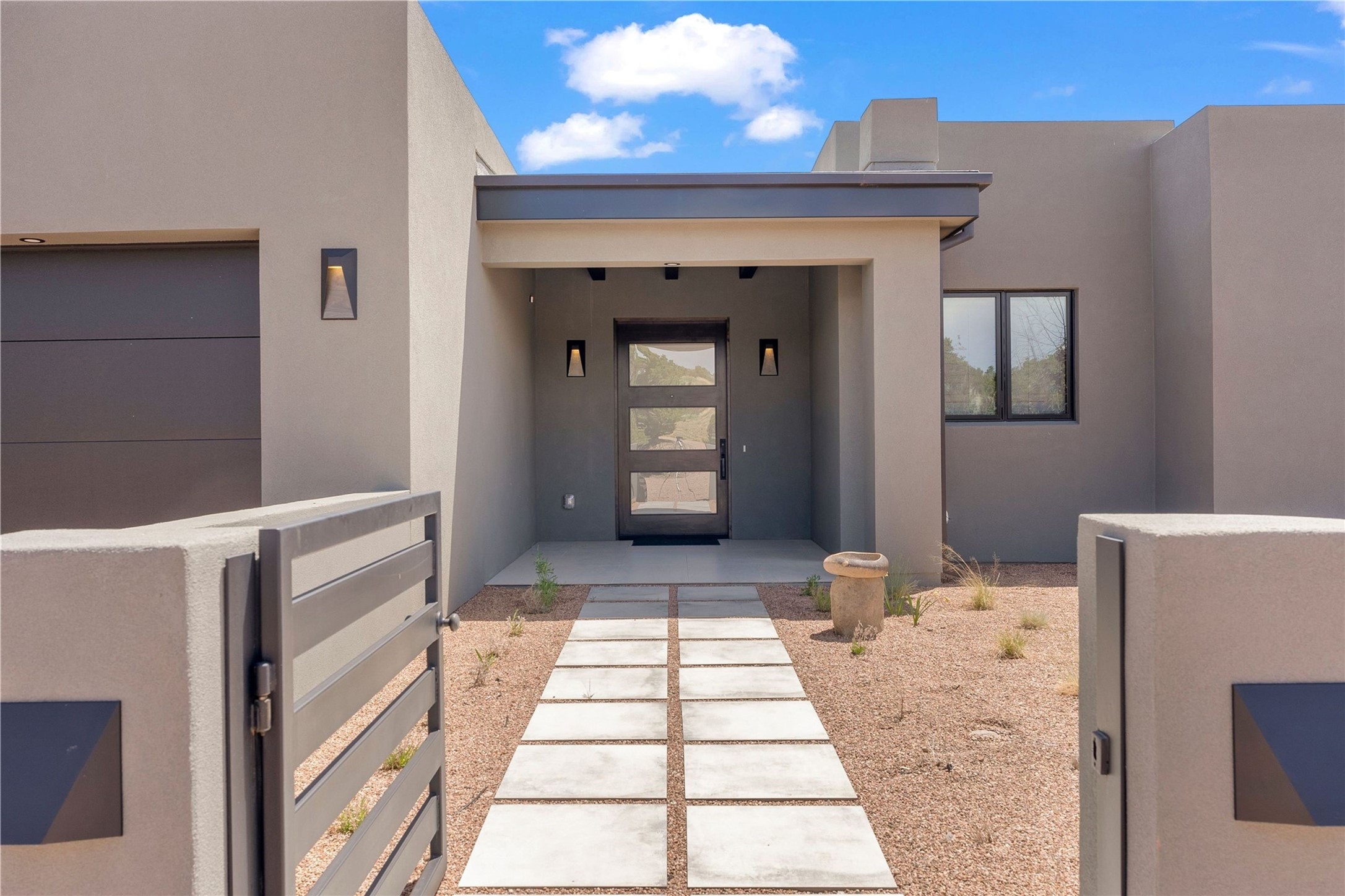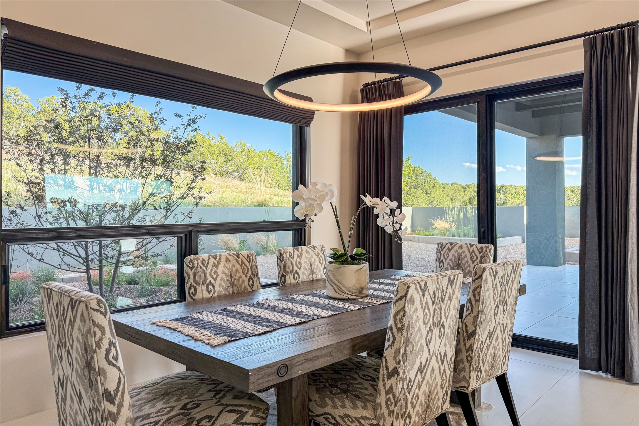 Experience contemporary living in this stunning 2023 home built by David Cordova. Nestled on 2.64 acres in Sundance Ridge. Spanning approximately 2,775 sq. ft., this 3-bedroom, 3-bathroom residence offers seclusion and privacy while being just a 17-minute drive to the Santa Fe Plaza. The living room boasts high ceilings, a beautiful accent wall with a gas fireplace, and built-in shelves, creating a refined yet cozy ambiance. Step outside to take in breathtaking sunset views over the Jemez Mountains from the covered portals and walled outdoor spaces. Entertain with ease in the outdoor kitchen, while the large walk-in butler's pantry with a second refrigerator makes hosting large gatherings a breeze. Or unwind amid the tranquil setting, surrounded by mature trees and nature. Designed for seamless indoor-outdoor living, the primary suite features large sliding doors that open to a private patio, perfect for enjoying the natural surroundings. A gas fireplace with a striking accent wall adds warmth and elegance to the space. A bonus feature is the radiant floor heated garage. More than $100K invested in upgrades--including landscaping, yard walls, garage floor finish, and a custom fountain--makes this better than new. The home has never been occupied and is truly a turn-key property. This exquisite home blends modern comfort with the serenity of Santa Fe's landscape--don't miss the chance to make it yours.