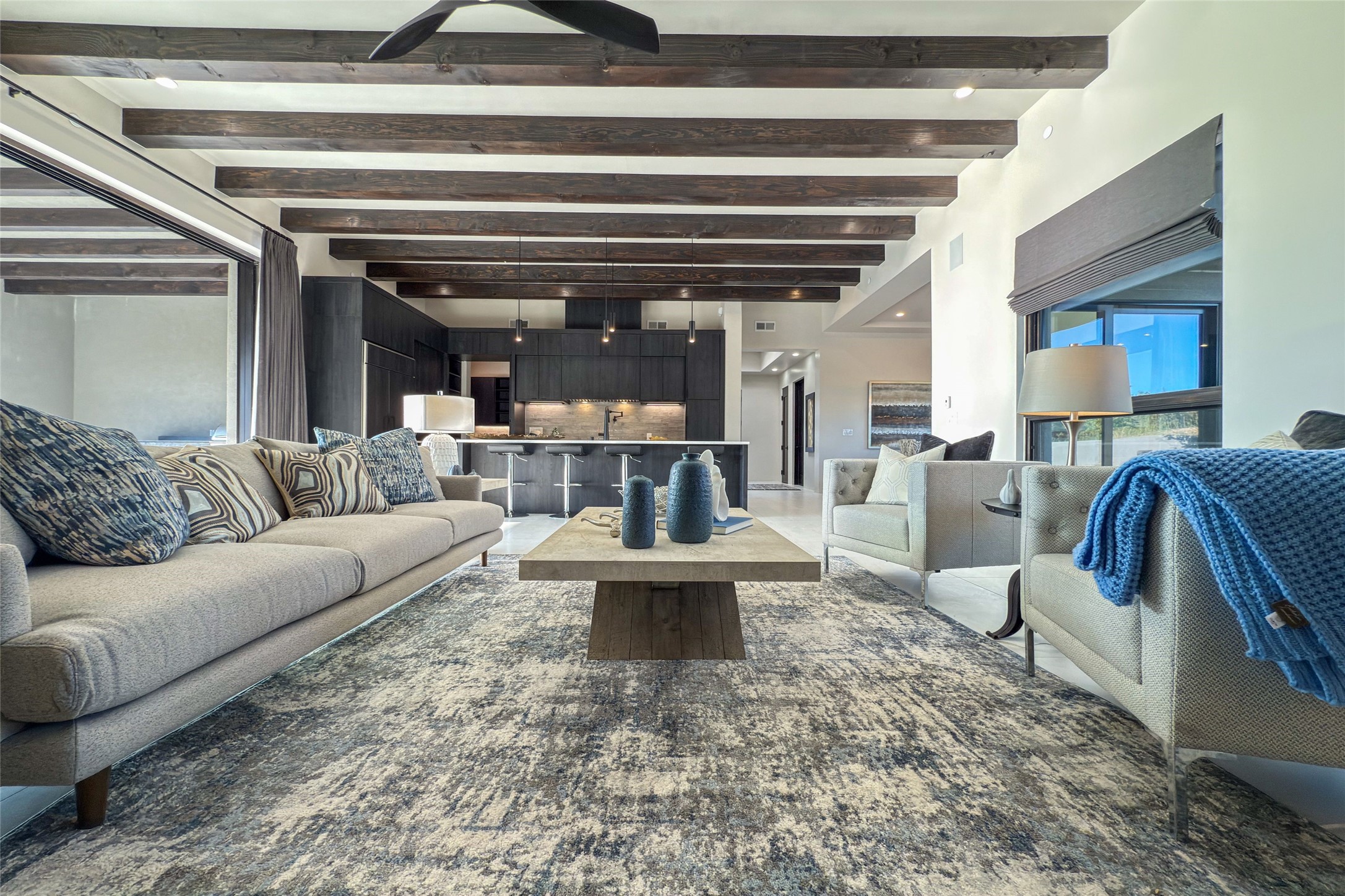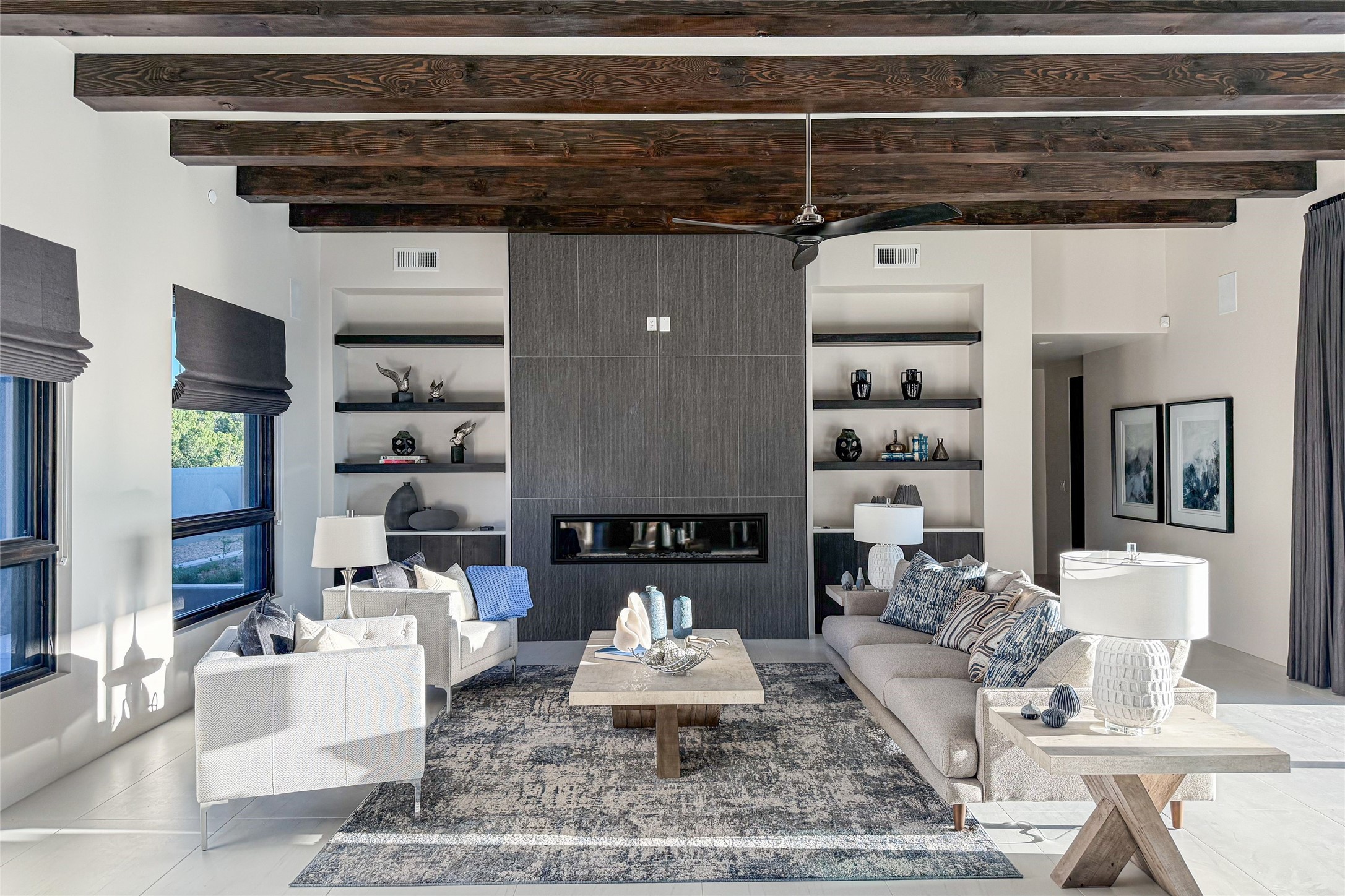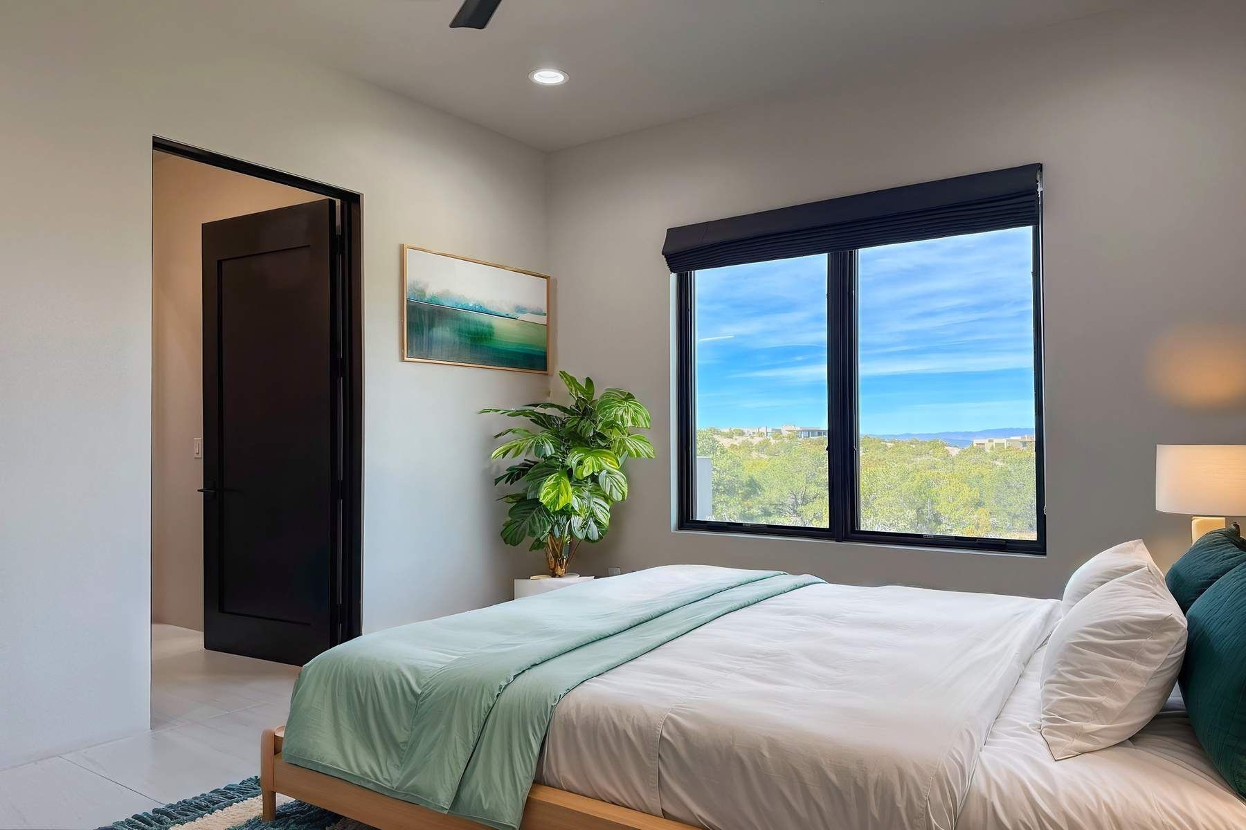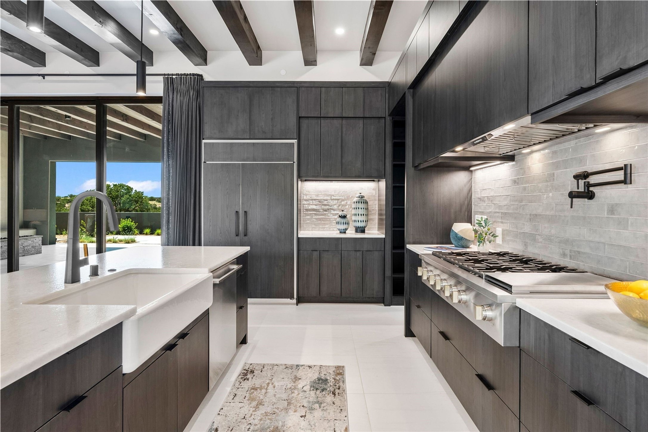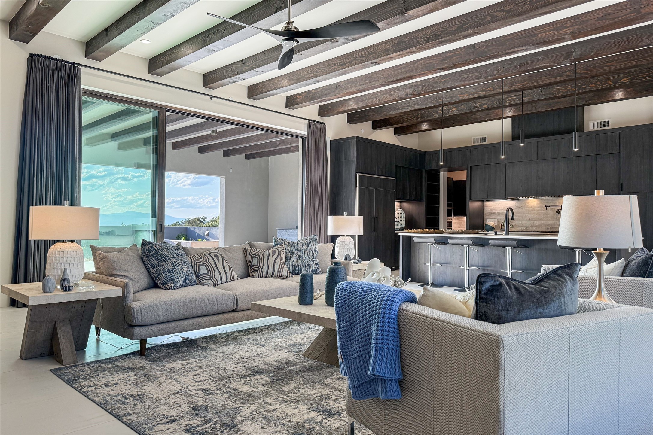 Experience contemporary living in this stunning 2023 home built by David Cordova. Nestled on 2.64 acres in Sundance Ridge. Spanning approximately 2,775 sq. ft., this 3-bedroom, 3-bathroom residence offers seclusion and privacy while being just a 17-minute drive to the Santa Fe Plaza. The living room boasts high ceilings, a beautiful accent wall with a gas fireplace, and built-in shelves, creating a refined yet cozy ambiance. Step outside to take in breathtaking sunset views over the Jemez Mountains from the covered portals and walled outdoor spaces. Entertain with ease in the outdoor kitchen, while the large walk-in butler's pantry with a second refrigerator makes hosting large gatherings a breeze. Or unwind amid the tranquil setting, surrounded by mature trees and nature. Designed for seamless indoor-outdoor living, the primary suite features large sliding doors that open to a private patio, perfect for enjoying the natural surroundings. A gas fireplace with a striking accent wall adds warmth and elegance to the space. A bonus feature is the radiant floor heated garage. More than $100K invested in upgrades--including landscaping, yard walls, garage floor finish, and a custom fountain--makes this better than new. The home has never been occupied and is truly a turn-key property. This exquisite home blends modern comfort with the serenity of Santa Fe's landscape--don't miss the chance to make it yours.
