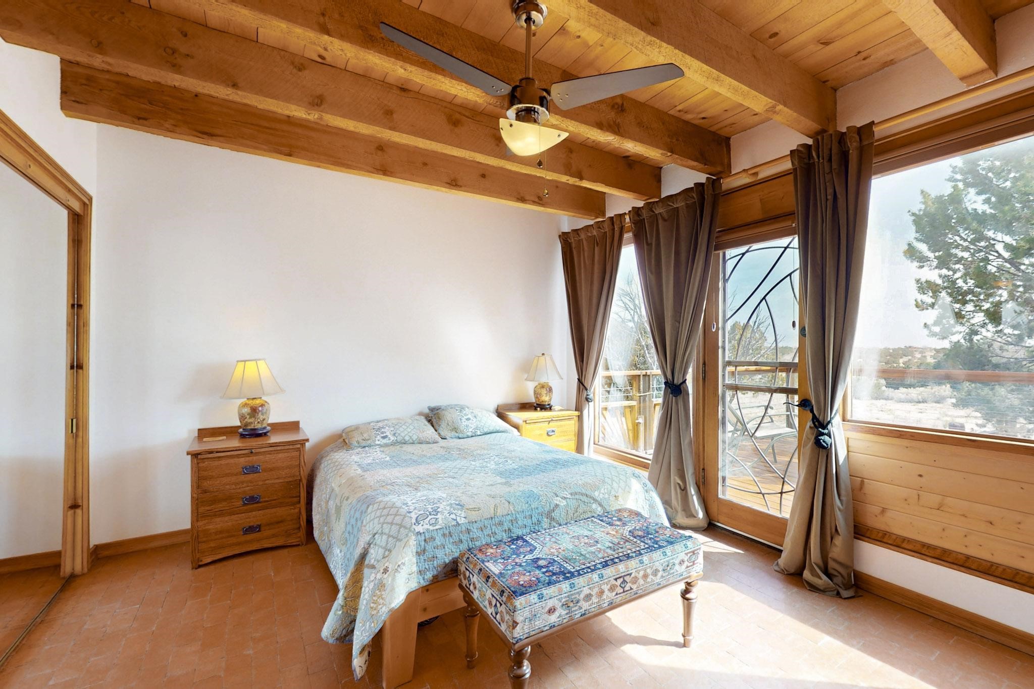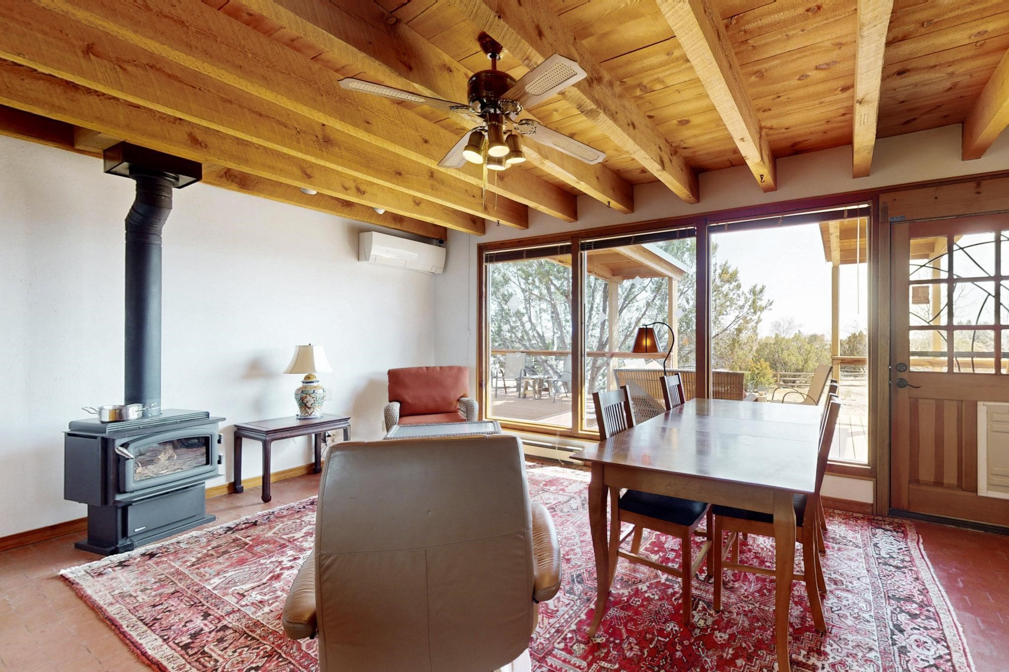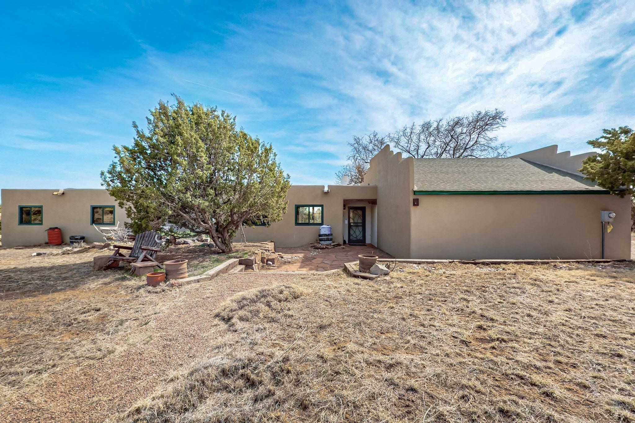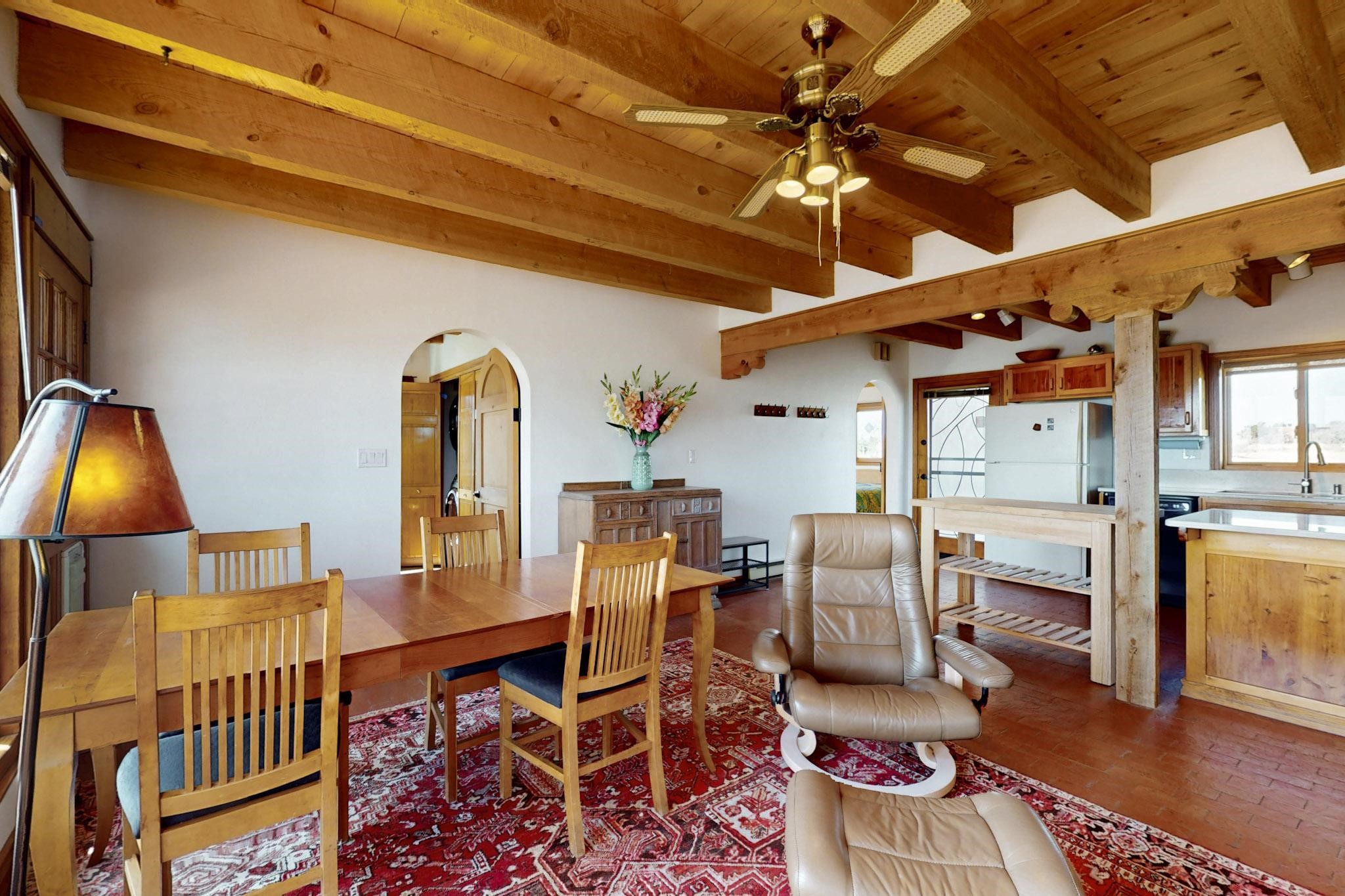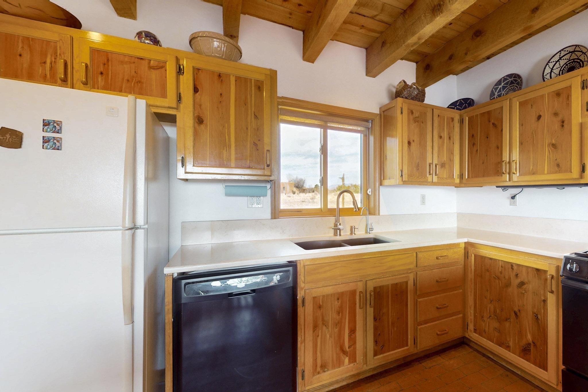 Newly priced lovely remodeled pueblo farmhouse with gleaming Saltillo tile and brick floors, beam ceilings throughout and long south facing windows for passive solar winter gain. The kitchen was remodeled, also both bathrooms were remodeled in 2021. The main bedroom bathroom has a spa like finish and includes a remodeled laundry area with a new Navien hot water heater in 2021, washer and dryer installed in 2022. Extremely flexible floor plan with two master suites, plus another guest bedroom center by the main living open plan areas. There are two mini splits to cool in the summer and 2 gas Regency stoves installed in 2015 add a cosy winter heat, serviced in 2024. A large deck was installed in 2020 for outside enjoyment, and the 2 car garage which was once used as a workshop has an old woodstove. The roof has been maintained, the private well pump was replaced in 2010, and a Nuvo water filter installed in 2021. There is a large fenced private back yard and plenty of parking space for guests. This home accesses all of Eldorado amenities, close to local shopping, the pub, schools, parks, trails, library and senior center and is only minutes into Santa Fe.