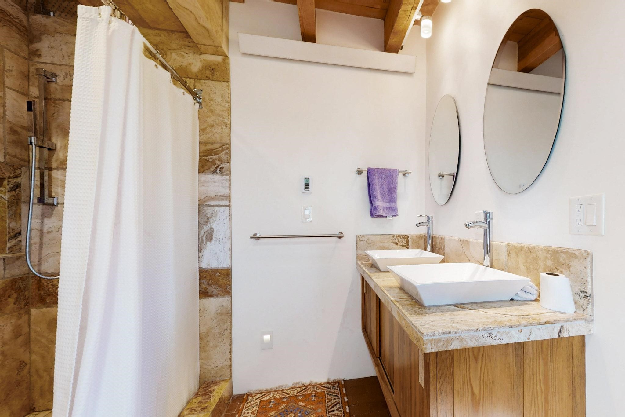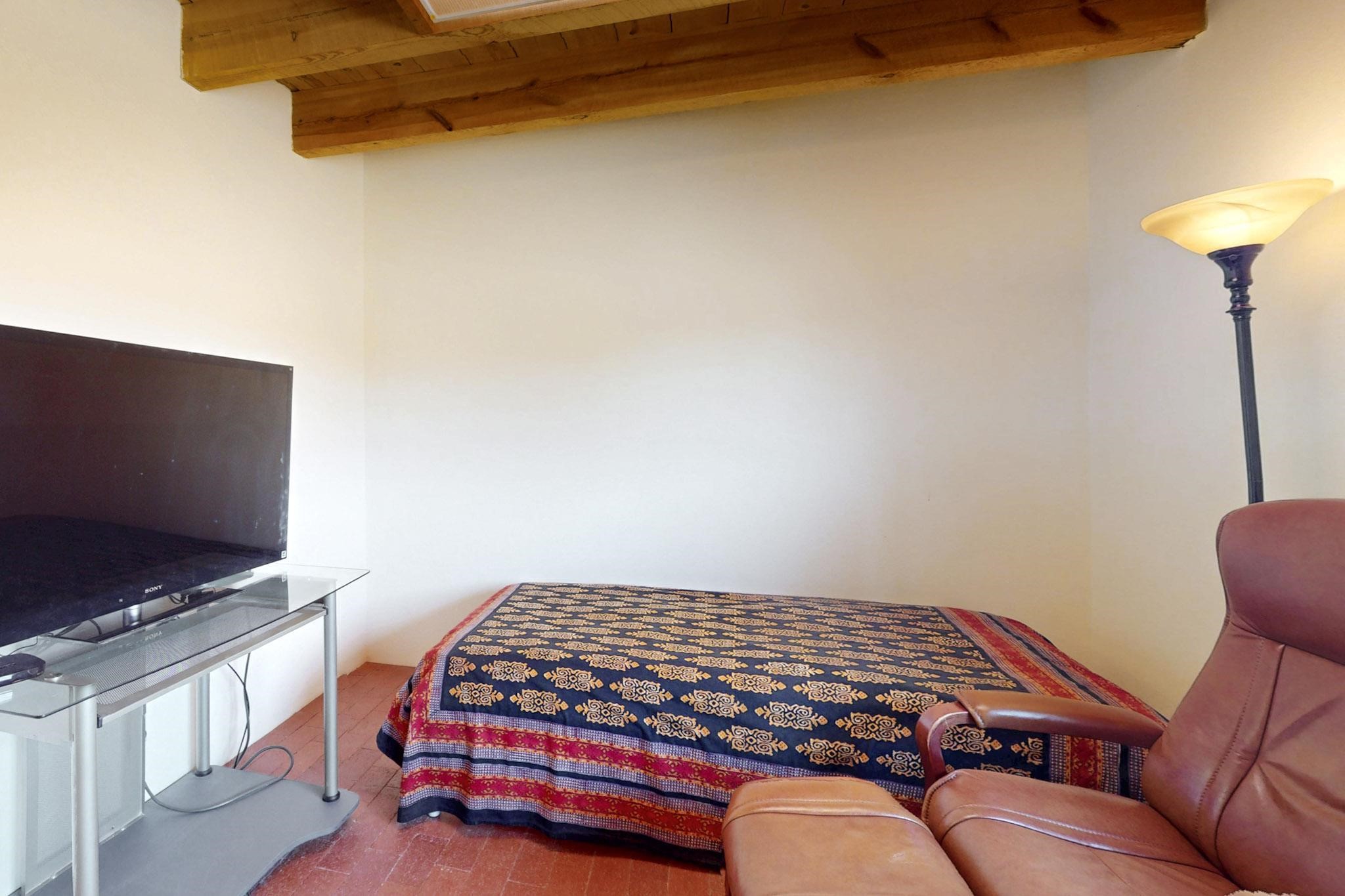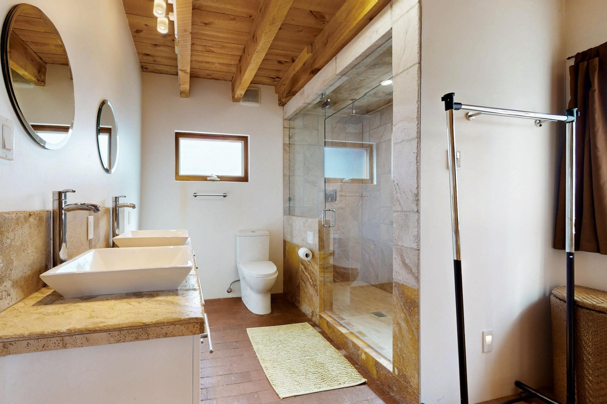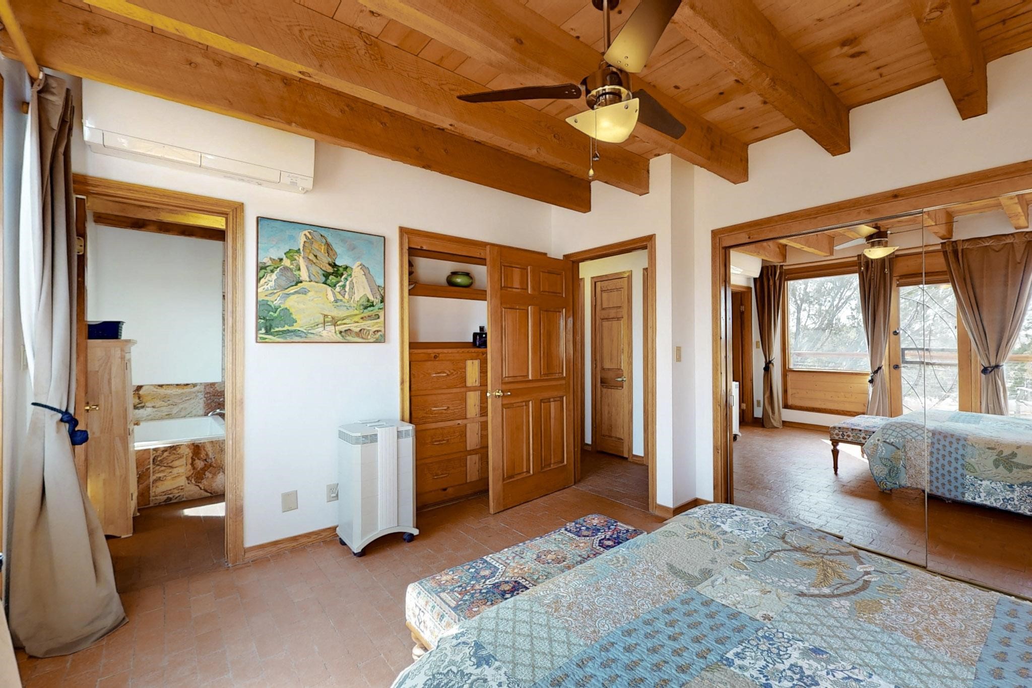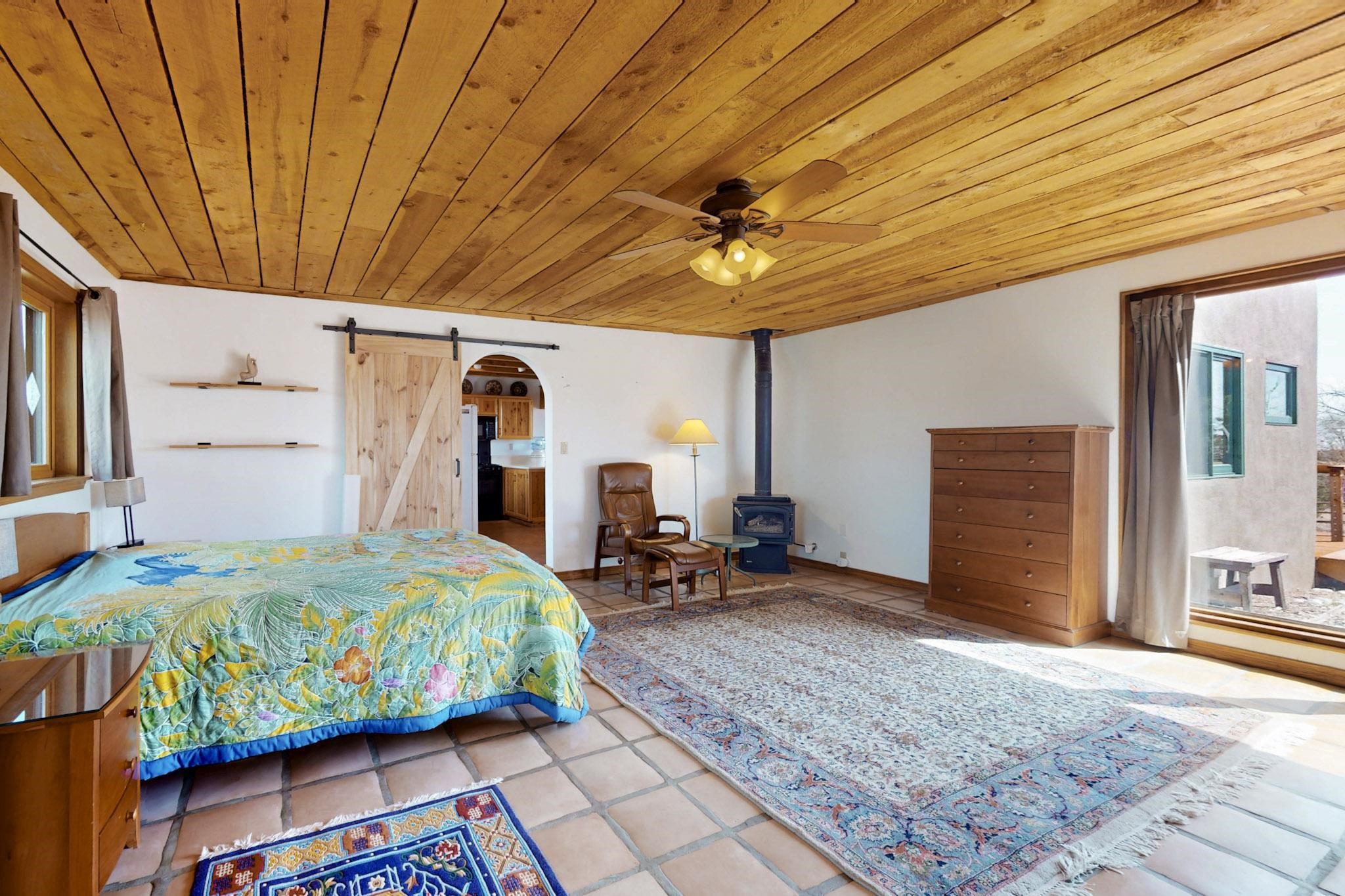 Newly priced lovely remodeled pueblo farmhouse with gleaming Saltillo tile and brick floors, beam ceilings throughout and long south facing windows for passive solar winter gain. The kitchen was remodeled, also both bathrooms were remodeled in 2021. The main bedroom bathroom has a spa like finish and includes a remodeled laundry area with a new Navien hot water heater in 2021, washer and dryer installed in 2022. Extremely flexible floor plan with two master suites, plus another guest bedroom center by the main living open plan areas. There are two mini splits to cool in the summer and 2 gas Regency stoves installed in 2015 add a cosy winter heat, serviced in 2024. A large deck was installed in 2020 for outside enjoyment, and the 2 car garage which was once used as a workshop has an old woodstove. The roof has been maintained, the private well pump was replaced in 2010, and a Nuvo water filter installed in 2021. There is a large fenced private back yard and plenty of parking space for guests. This home accesses all of Eldorado amenities, close to local shopping, the pub, schools, parks, trails, library and senior center and is only minutes into Santa Fe.