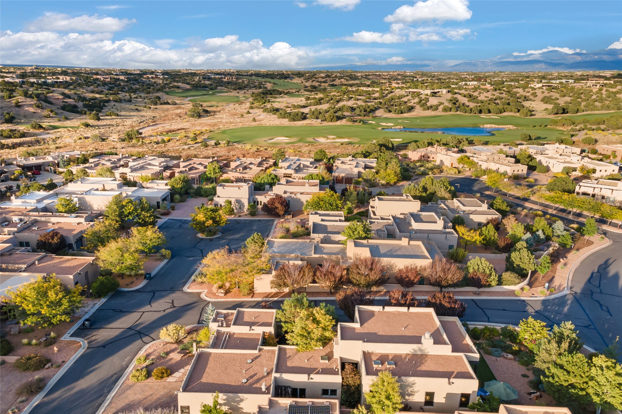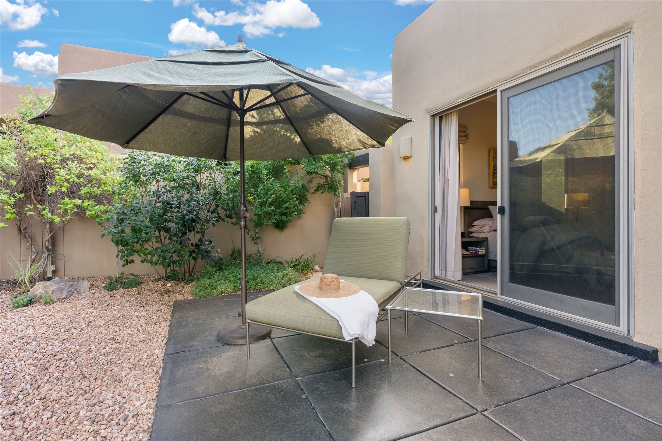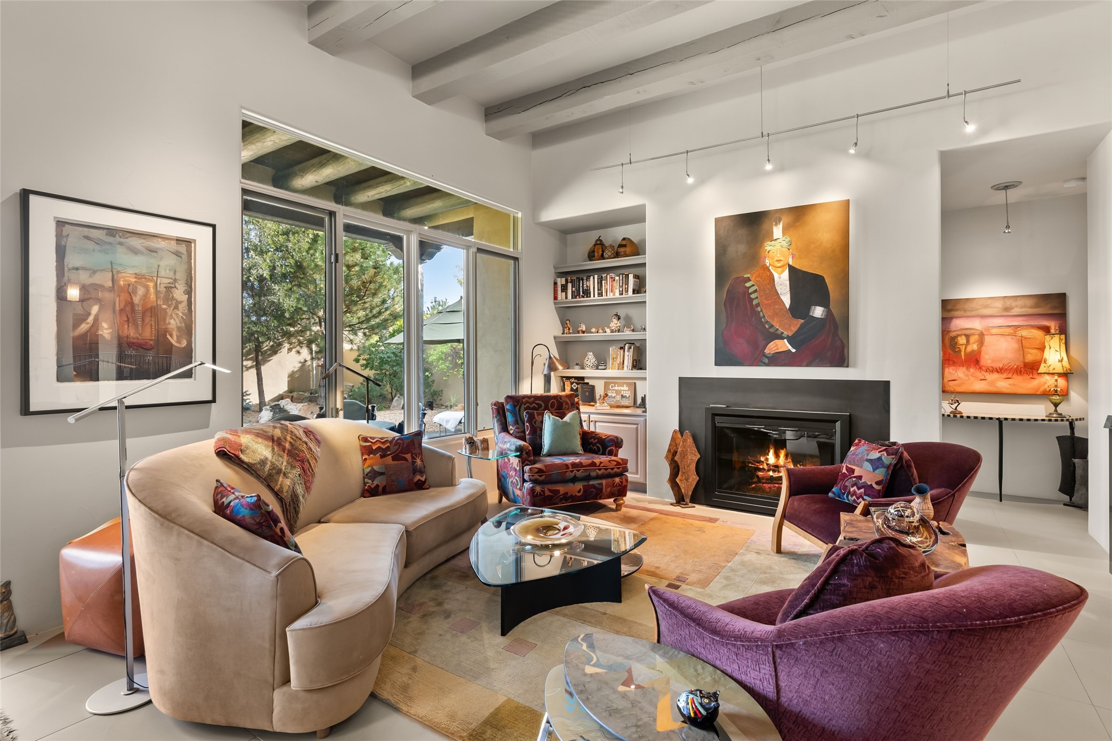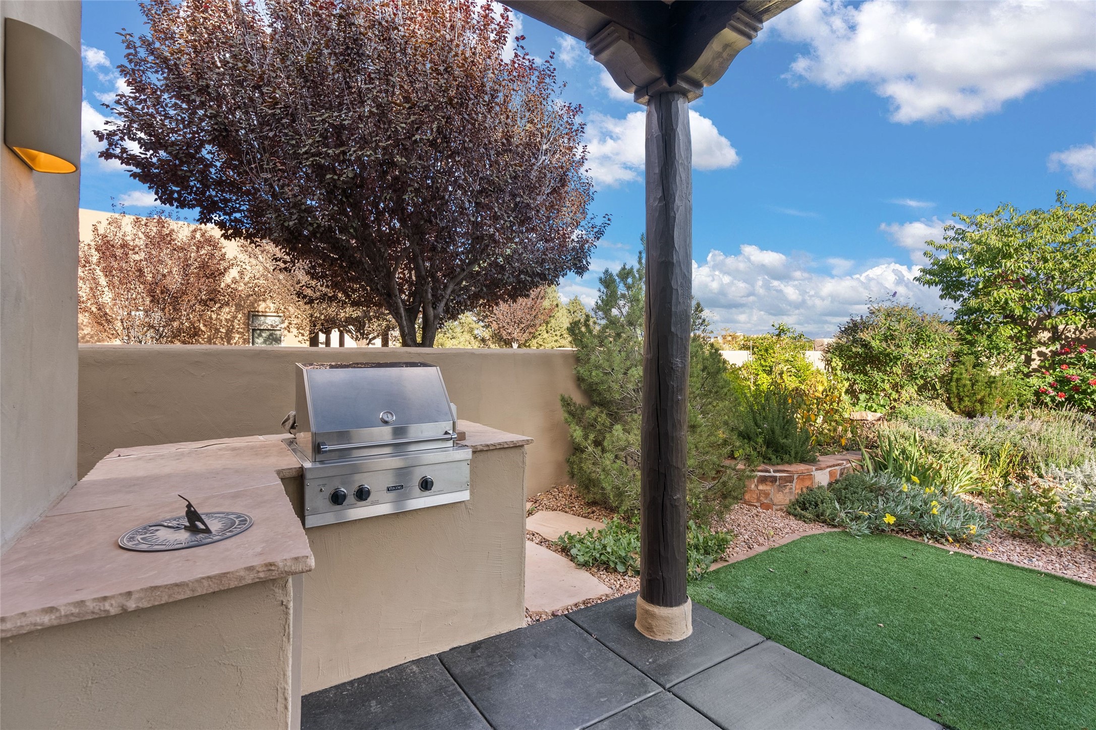 This inviting, Soft Contemporary 2-Bed + Den / 3-Bath home in Gated Las Campanas provides easy, "Lock & Leave" convenience with a gorgeous view of the Sangre de Cristo Mountains. Two rustic wood entry gates lead to the private, intimate entry courtyard, which is beautifully landscaped with a water feature & cozy wood-burning fireplace for entertaining guests. The Main house is an open floor plan with an easy flow from the Living & Dining areas to the Gourmet Kitchen with Taj Majal Quartzite countertop and stainless appliances - Sub Zero refrigerator, a 36-inch Frigidaire gas range/oven (installed in January 2025 & never used), Dacor hood, Bosch dishwasher, Sharp microwave drawer and wine cooler. The Elegant Master Bedroom & Bath offers two separate vanities, oval soaking tub, separate shower and a fabulous California Closet. The Media Room could easily be converted to a Bedroom and has an adjacent Bath. The Private, Detached 1-Bed / 1-Bath Guest Casita offers great privacy for visiting friends & family, with enough room for a King-size bed. The back yard is fully landscaped and walled-in for pets, with a water feature, built-in Viking grill and Sangre de Cristo Mountain view. This home has it all - Contemporary style, Detached Casita and a View of the Sangre de Cristo Mountains.