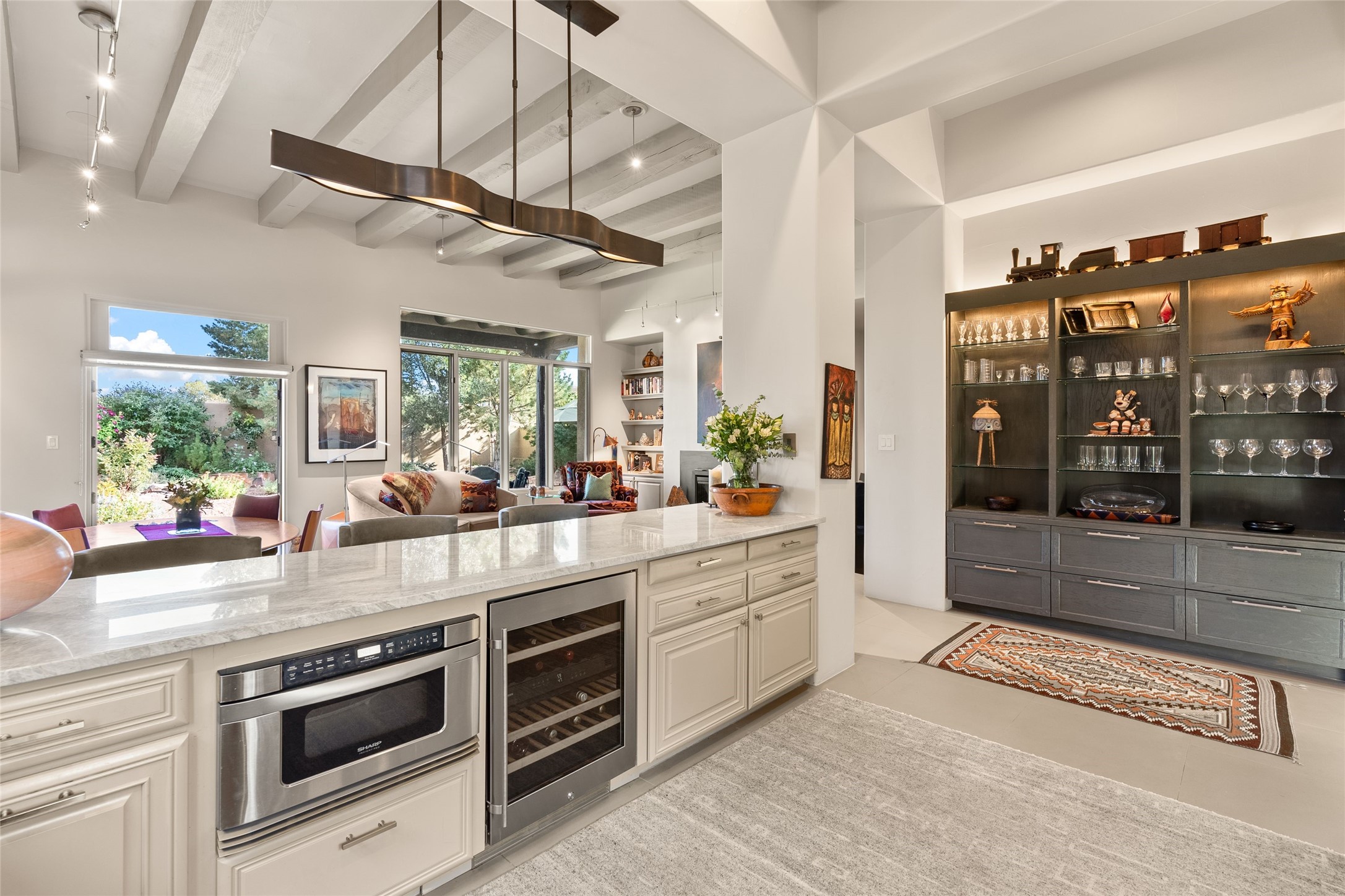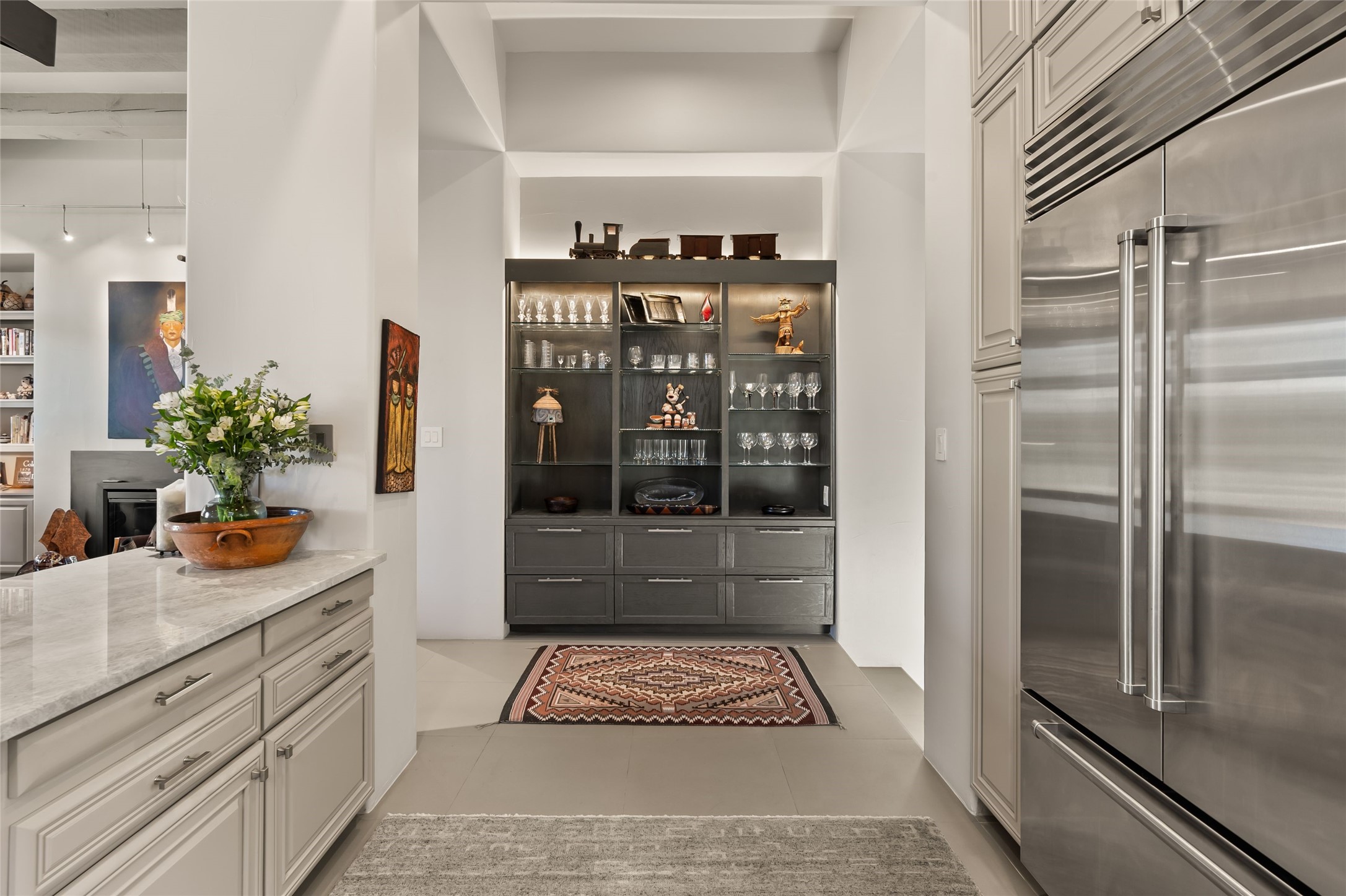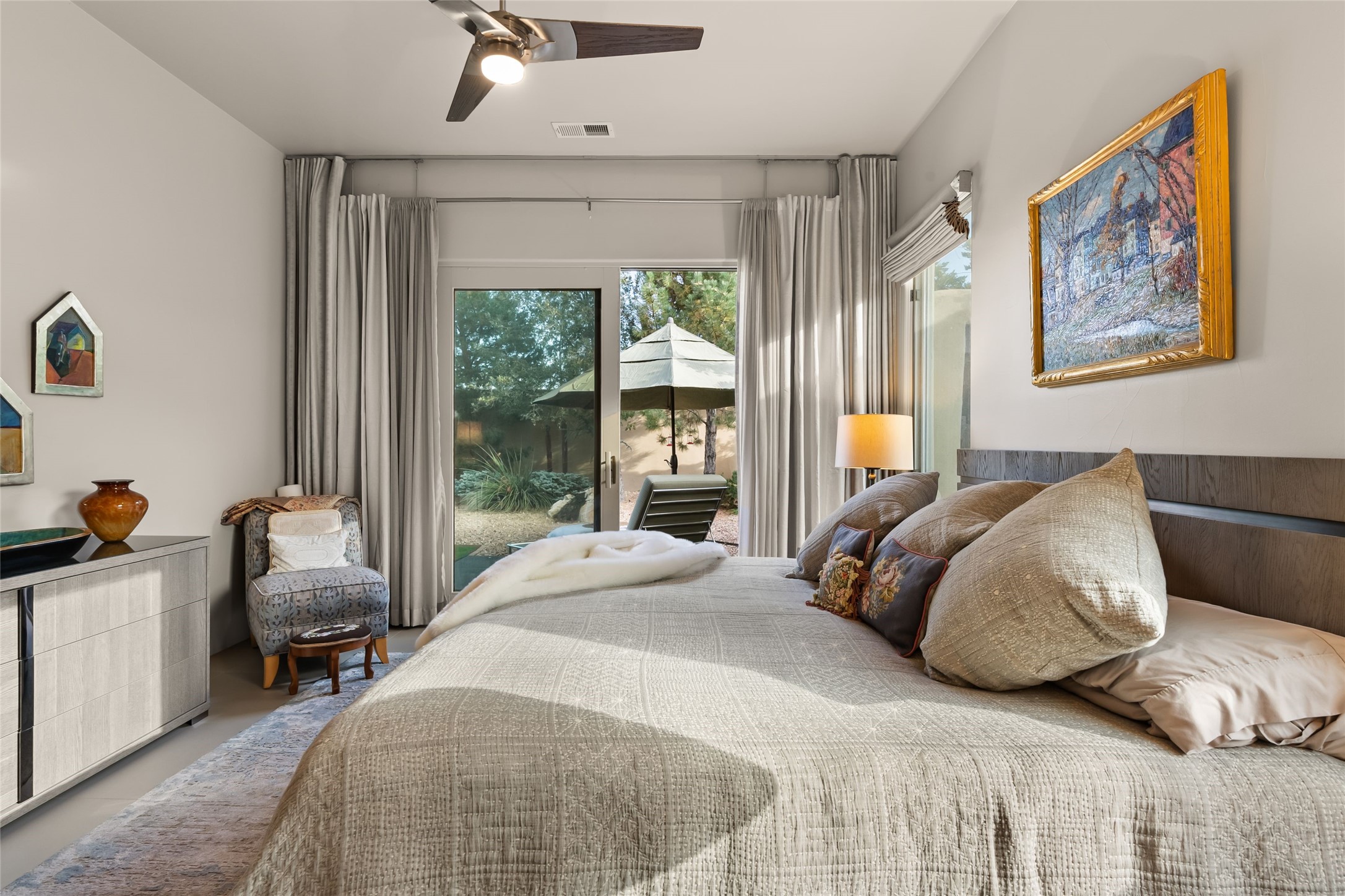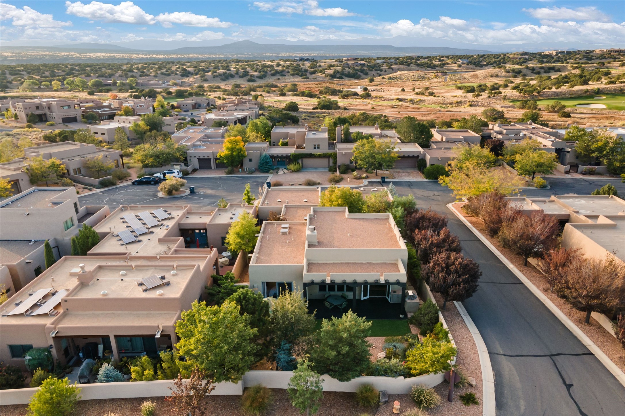 This inviting, Soft Contemporary 2-Bed + Den / 3-Bath home in Gated Las Campanas provides easy, "Lock & Leave" convenience with a gorgeous view of the Sangre de Cristo Mountains. Two rustic wood entry gates lead to the private, intimate entry courtyard, which is beautifully landscaped with a water feature & cozy wood-burning fireplace for entertaining guests. The Main house is an open floor plan with an easy flow from the Living & Dining areas to the Gourmet Kitchen with Taj Majal Quartzite countertop and stainless appliances - Sub Zero refrigerator, a 36-inch Frigidaire gas range/oven (installed in January 2025 & never used), Dacor hood, Bosch dishwasher, Sharp microwave drawer and wine cooler. The Elegant Master Bedroom & Bath offers two separate vanities, oval soaking tub, separate shower and a fabulous California Closet. The Media Room could easily be converted to a Bedroom and has an adjacent Bath. The Private, Detached 1-Bed / 1-Bath Guest Casita offers great privacy for visiting friends & family, with enough room for a King-size bed. The back yard is fully landscaped and walled-in for pets, with a water feature, built-in Viking grill and Sangre de Cristo Mountain view. This home has it all - Contemporary style, Detached Casita and a View of the Sangre de Cristo Mountains.