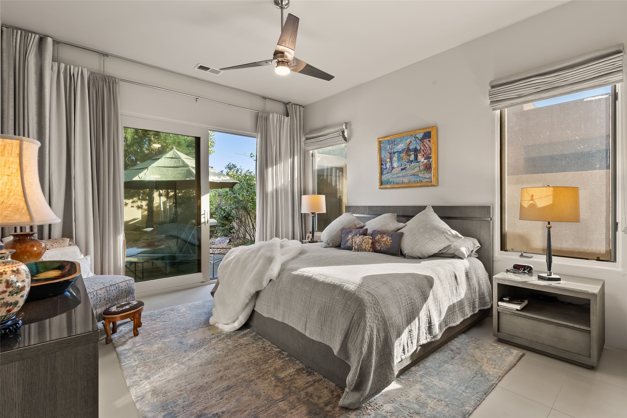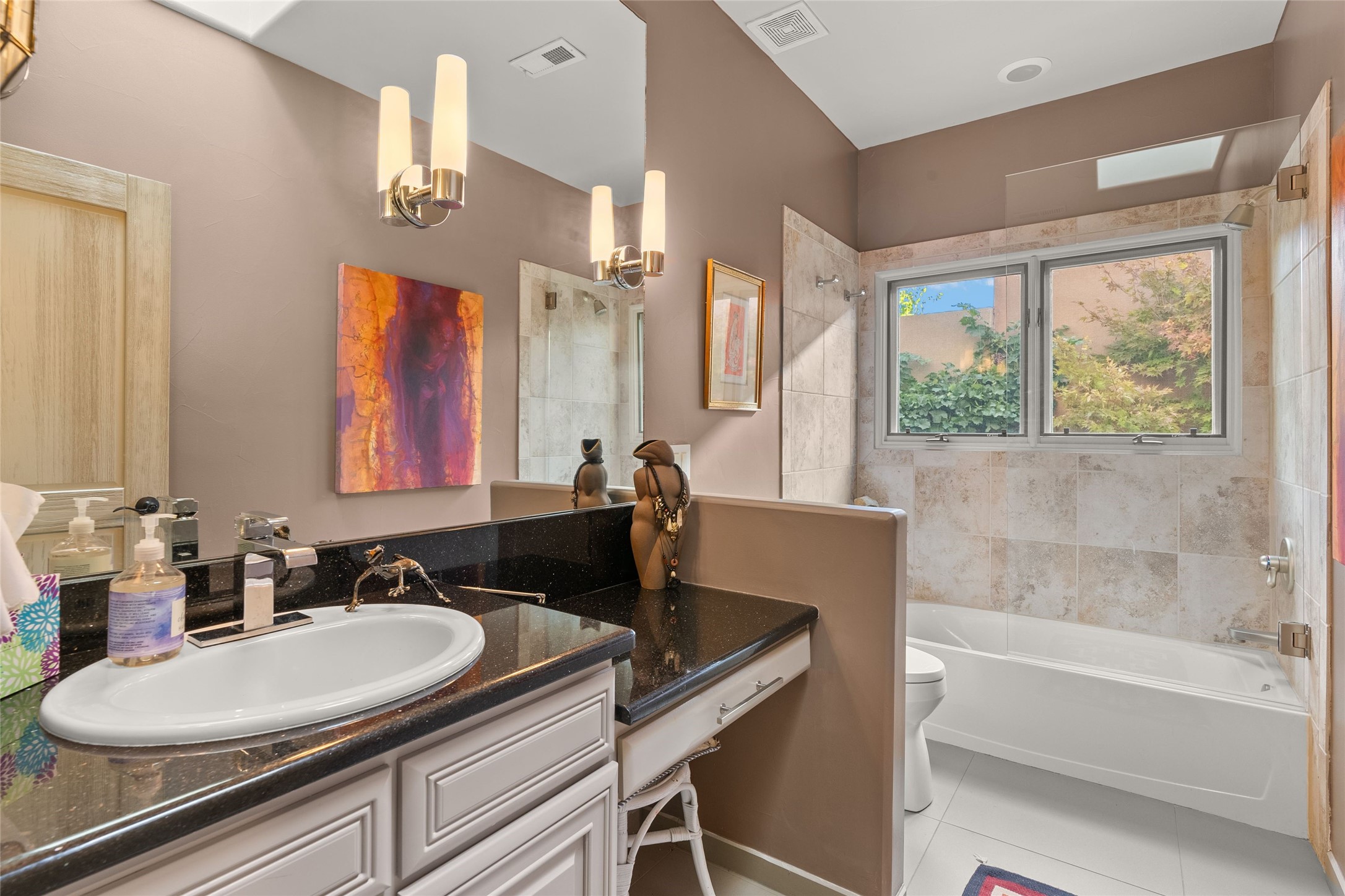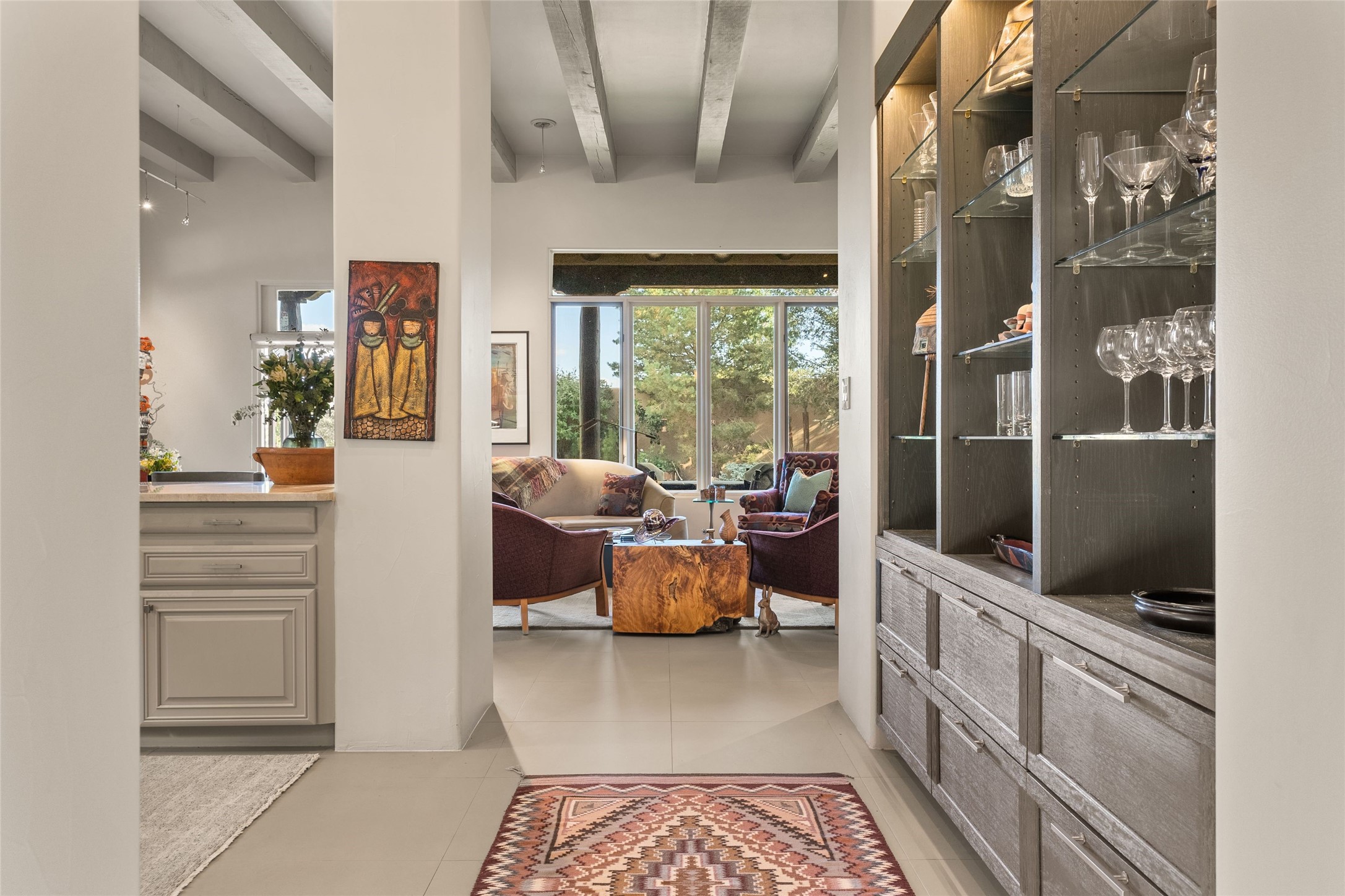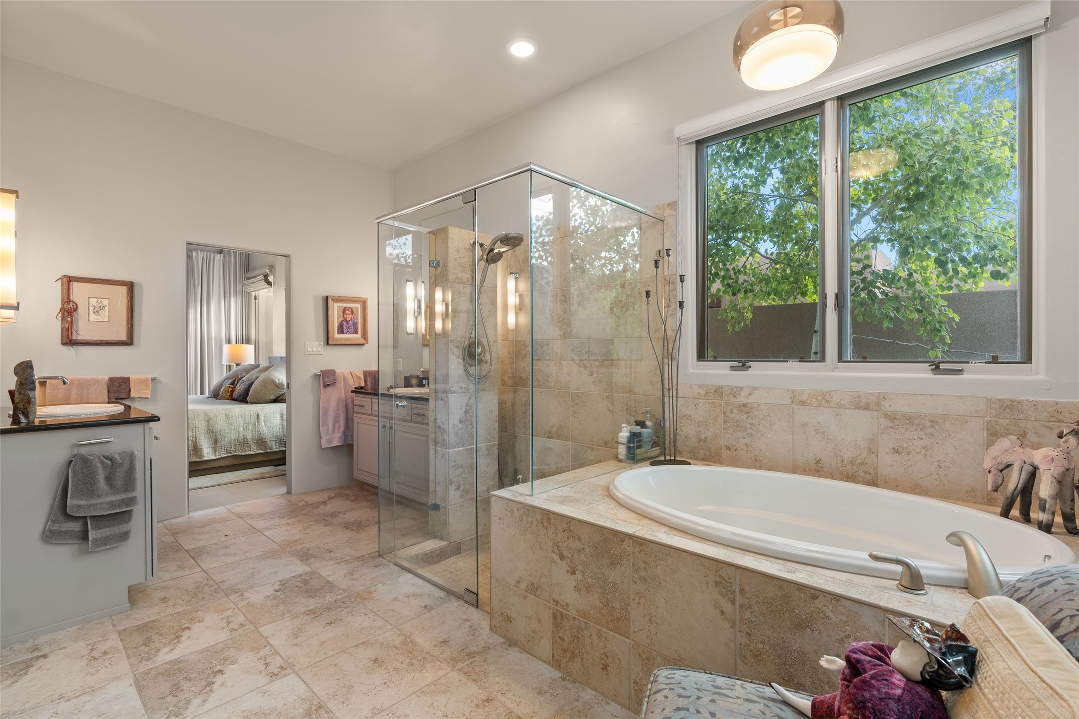 This inviting, Soft Contemporary 2-Bed + Den / 3-Bath home in Gated Las Campanas provides easy, "Lock & Leave" convenience with a gorgeous view of the Sangre de Cristo Mountains. Two rustic wood entry gates lead to the private, intimate entry courtyard, which is beautifully landscaped with a water feature & cozy wood-burning fireplace for entertaining guests. The Main house is an open floor plan with an easy flow from the Living & Dining areas to the Gourmet Kitchen with Taj Majal Quartzite countertop and stainless appliances - Sub Zero refrigerator, a 36-inch Frigidaire gas range/oven (installed in January 2025 & never used), Dacor hood, Bosch dishwasher, Sharp microwave drawer and wine cooler. The Elegant Master Bedroom & Bath offers two separate vanities, oval soaking tub, separate shower and a fabulous California Closet. The Media Room could easily be converted to a Bedroom and has an adjacent Bath. The Private, Detached 1-Bed / 1-Bath Guest Casita offers great privacy for visiting friends & family, with enough room for a King-size bed. The back yard is fully landscaped and walled-in for pets, with a water feature, built-in Viking grill and Sangre de Cristo Mountain view. This home has it all - Contemporary style, Detached Casita and a View of the Sangre de Cristo Mountains.