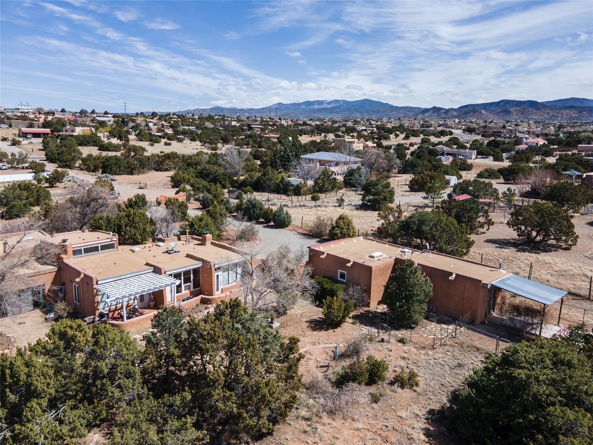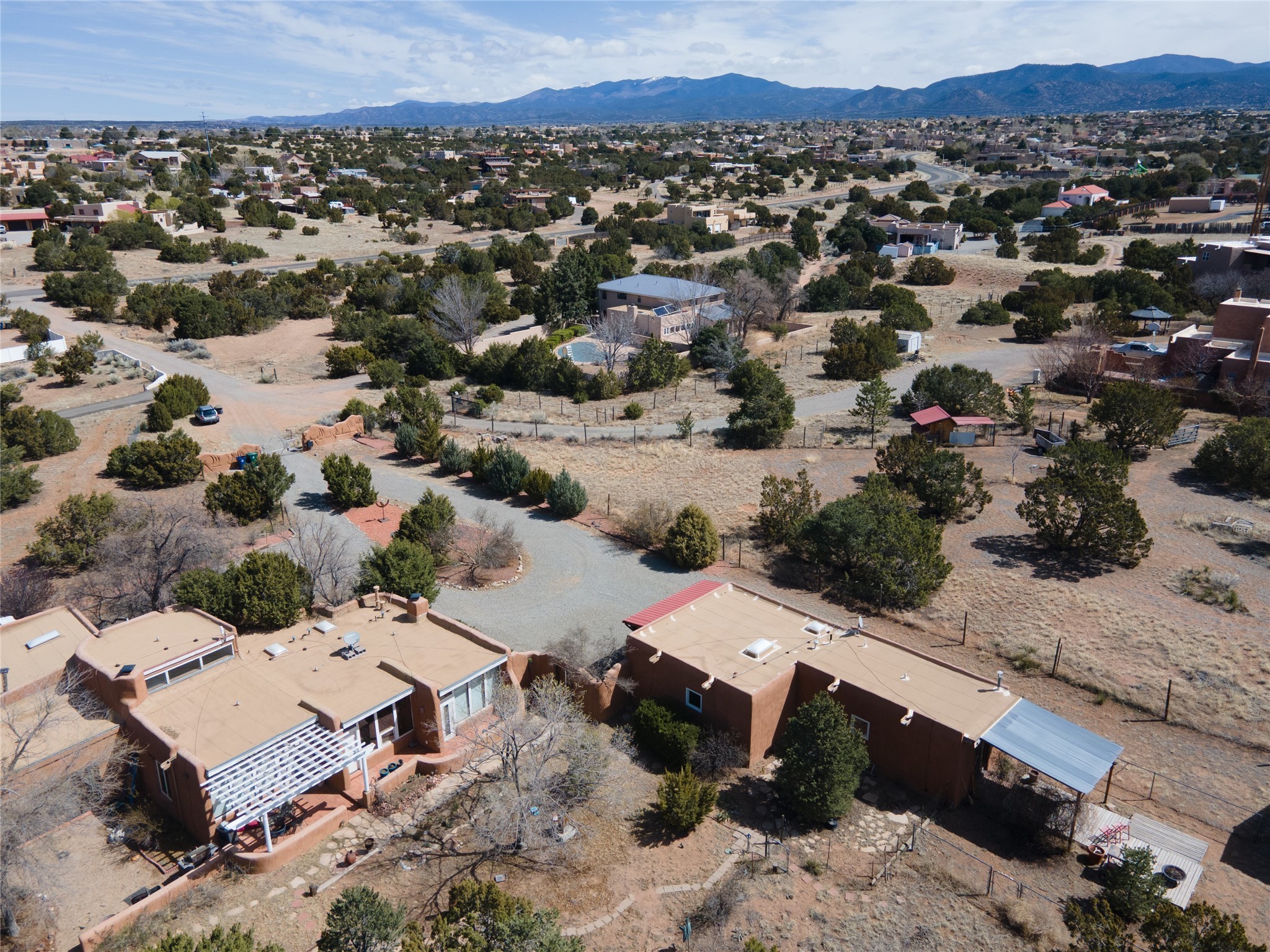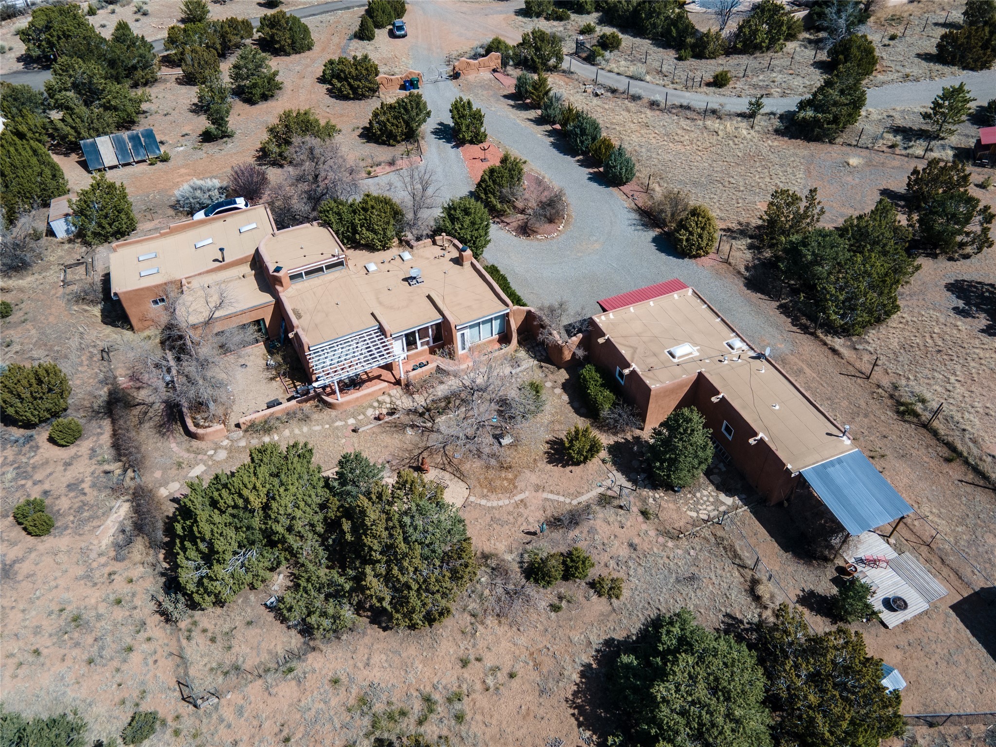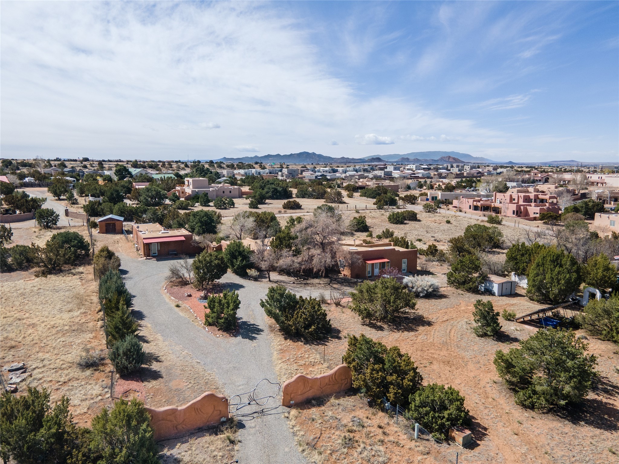 A very cool opportunity is knocking! Convenient in-town location for an adobemain home, plus a detached, spacious Guest House, plus an attached set of(unheated) studio spaces, currently used for music production, plus a detachedoutbuilding, all sited on a 1.8 acre lot! The magic begins as you enter the propertythrough a set of stylized stucco buffalo gates, built by local sculptor, Don Redman; the buffalo theme is repeated in theGuest House's entry. The main home, which has passive solar design, exudes warmth & quintessential Southwestcharm, with brick flooring, a beautifully designed kiva fireplace, high woodaccented ceilings and a Sunroom built by Tent Rock Construction.. An open floor plan and large dining room suggest wonderful times with friends and/or family!! Its two nicely sized bedrooms each featuredoors leading out to the inviting front patio; the primary bedroom also features akiva fireplace. Settings for outdoor gatherings at the home's entry abound. GuestHouse is currently leased. Property to be sold in as is condition.