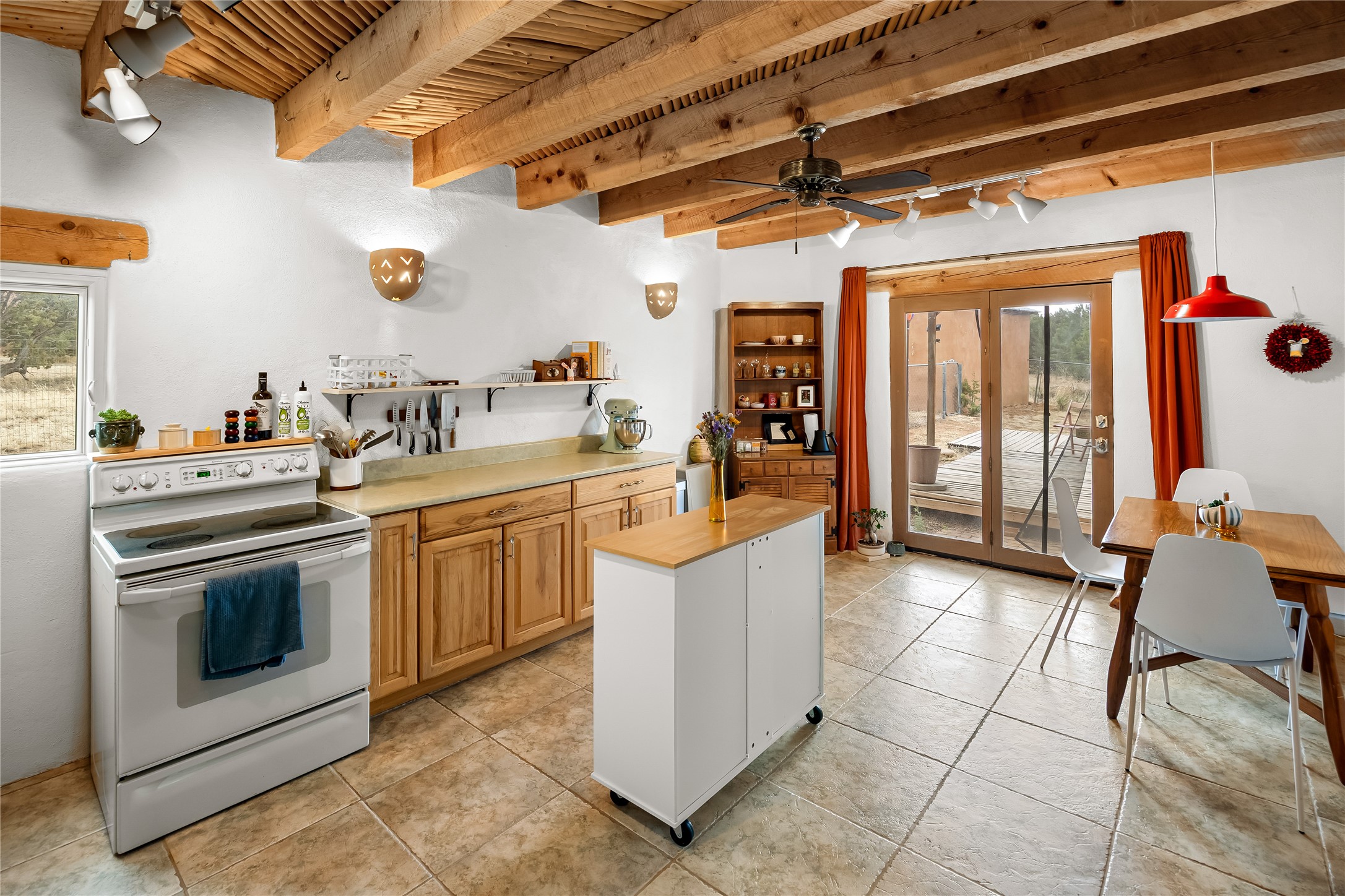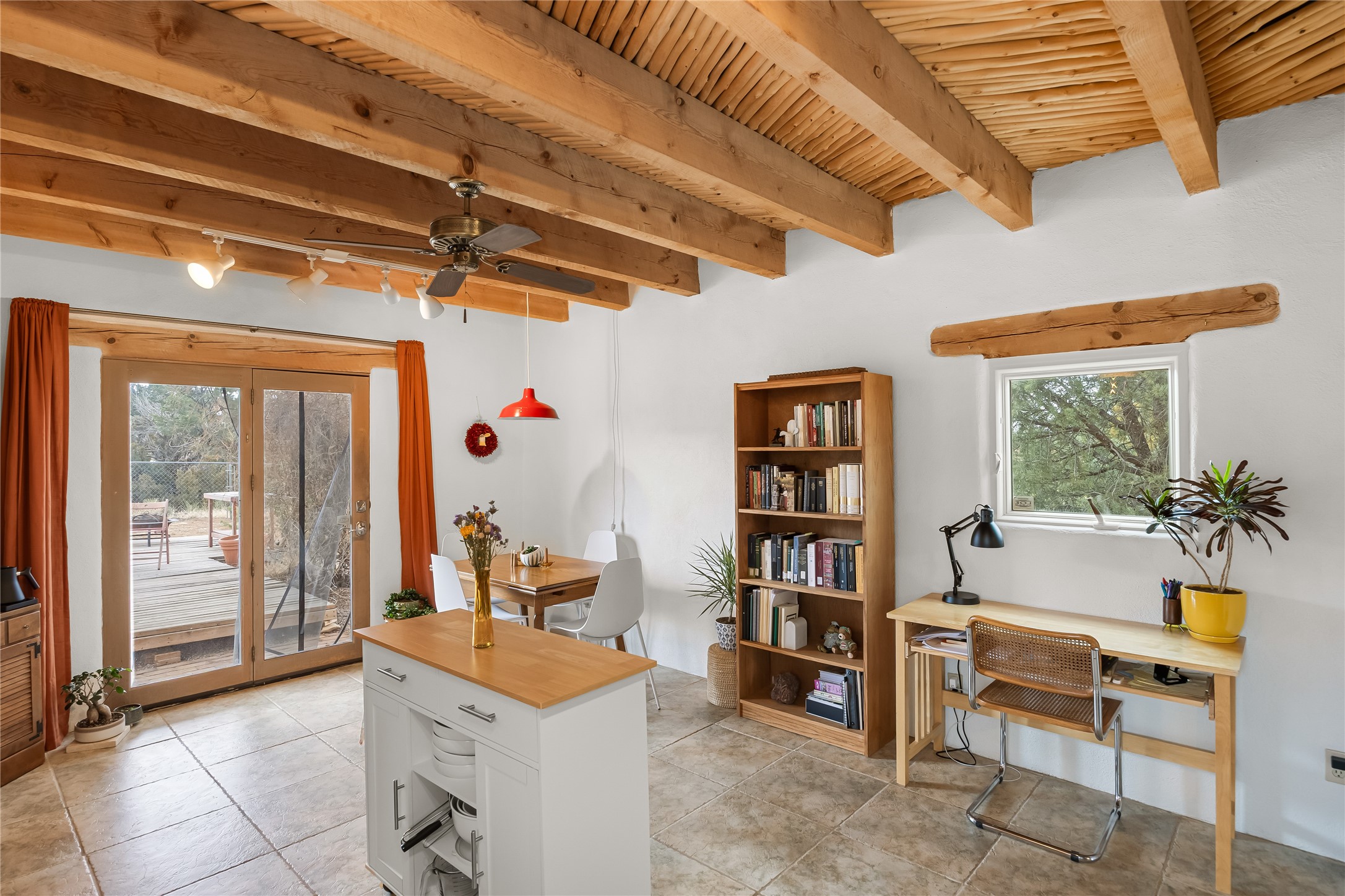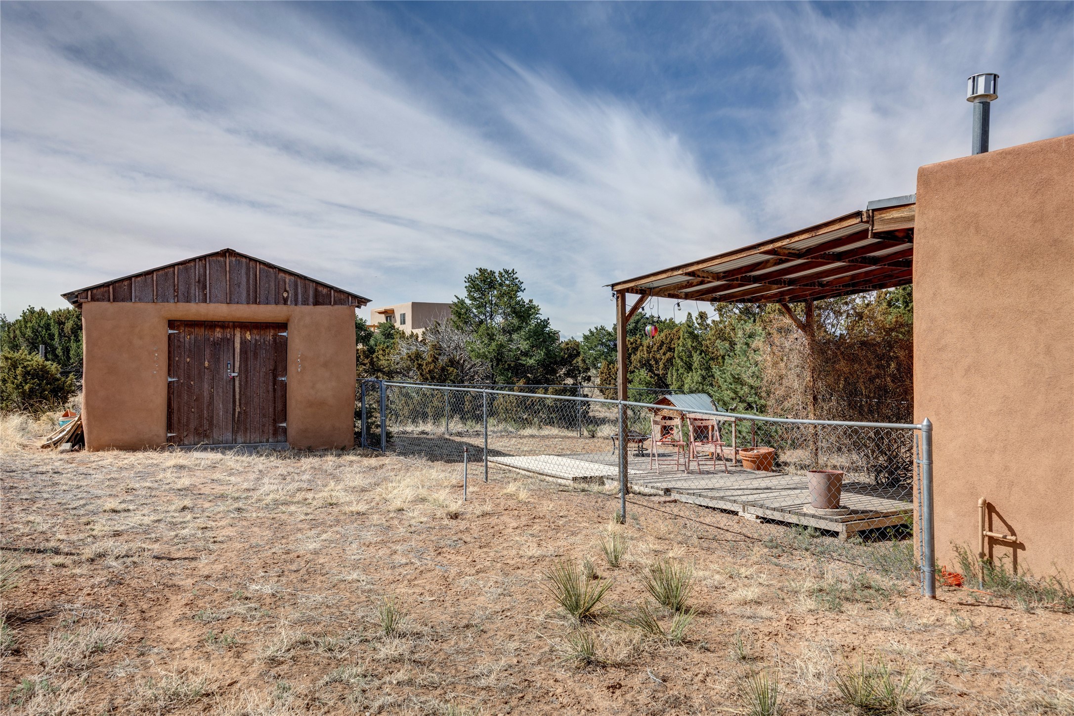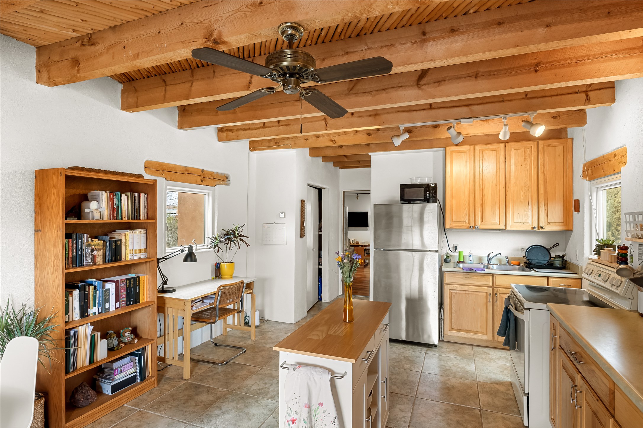 A very cool opportunity is knocking! Convenient in-town location for an adobemain home, plus a detached, spacious Guest House, plus an attached set of(unheated) studio spaces, currently used for music production, plus a detachedoutbuilding, all sited on a 1.8 acre lot! The magic begins as you enter the propertythrough a set of stylized stucco buffalo gates, built by local sculptor, Don Redman; the buffalo theme is repeated in theGuest House's entry. The main home, which has passive solar design, exudes warmth & quintessential Southwestcharm, with brick flooring, a beautifully designed kiva fireplace, high woodaccented ceilings and a Sunroom built by Tent Rock Construction.. An open floor plan and large dining room suggest wonderful times with friends and/or family!! Its two nicely sized bedrooms each featuredoors leading out to the inviting front patio; the primary bedroom also features akiva fireplace. Settings for outdoor gatherings at the home's entry abound. GuestHouse is currently leased. Property to be sold in as is condition.