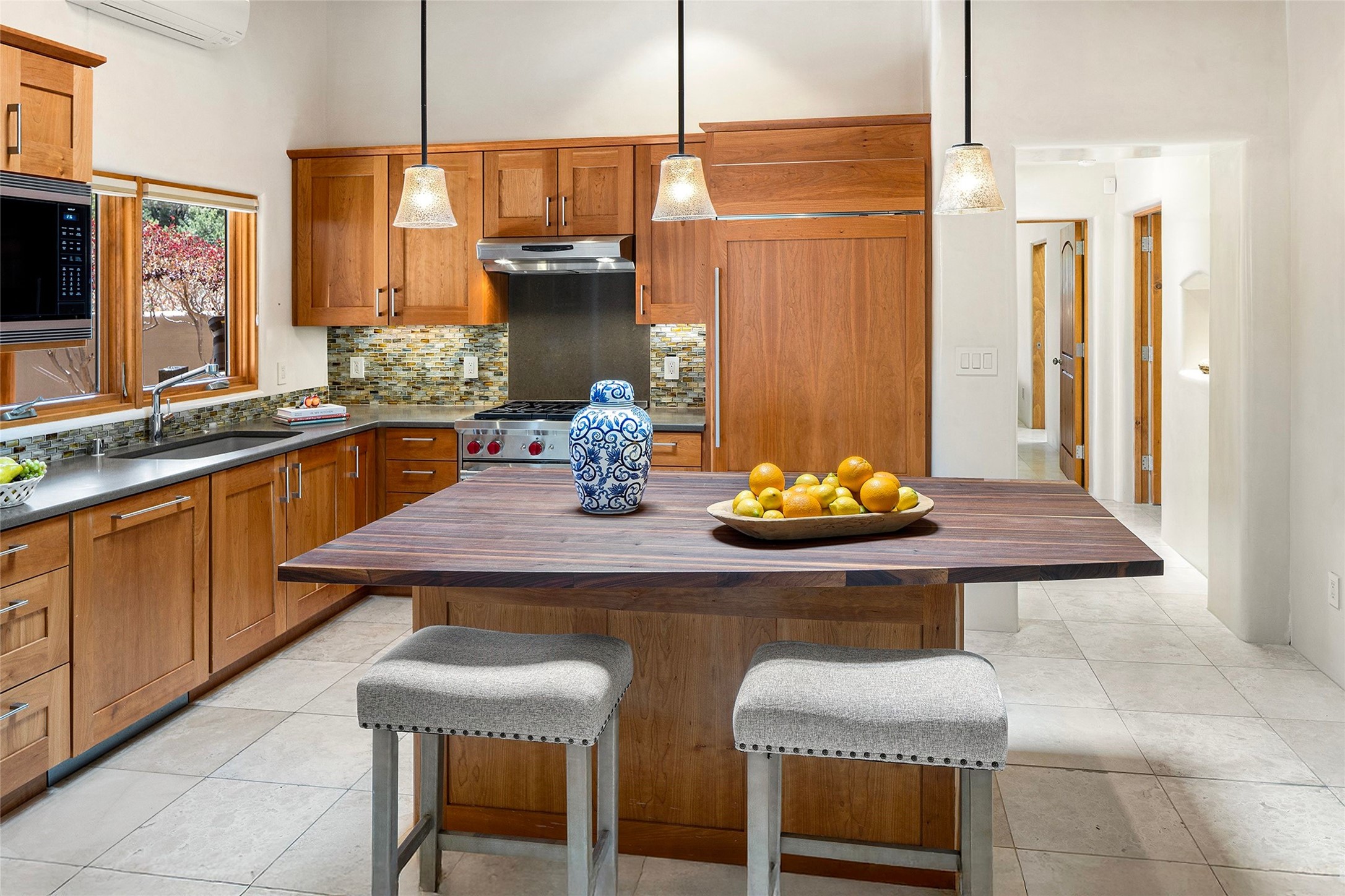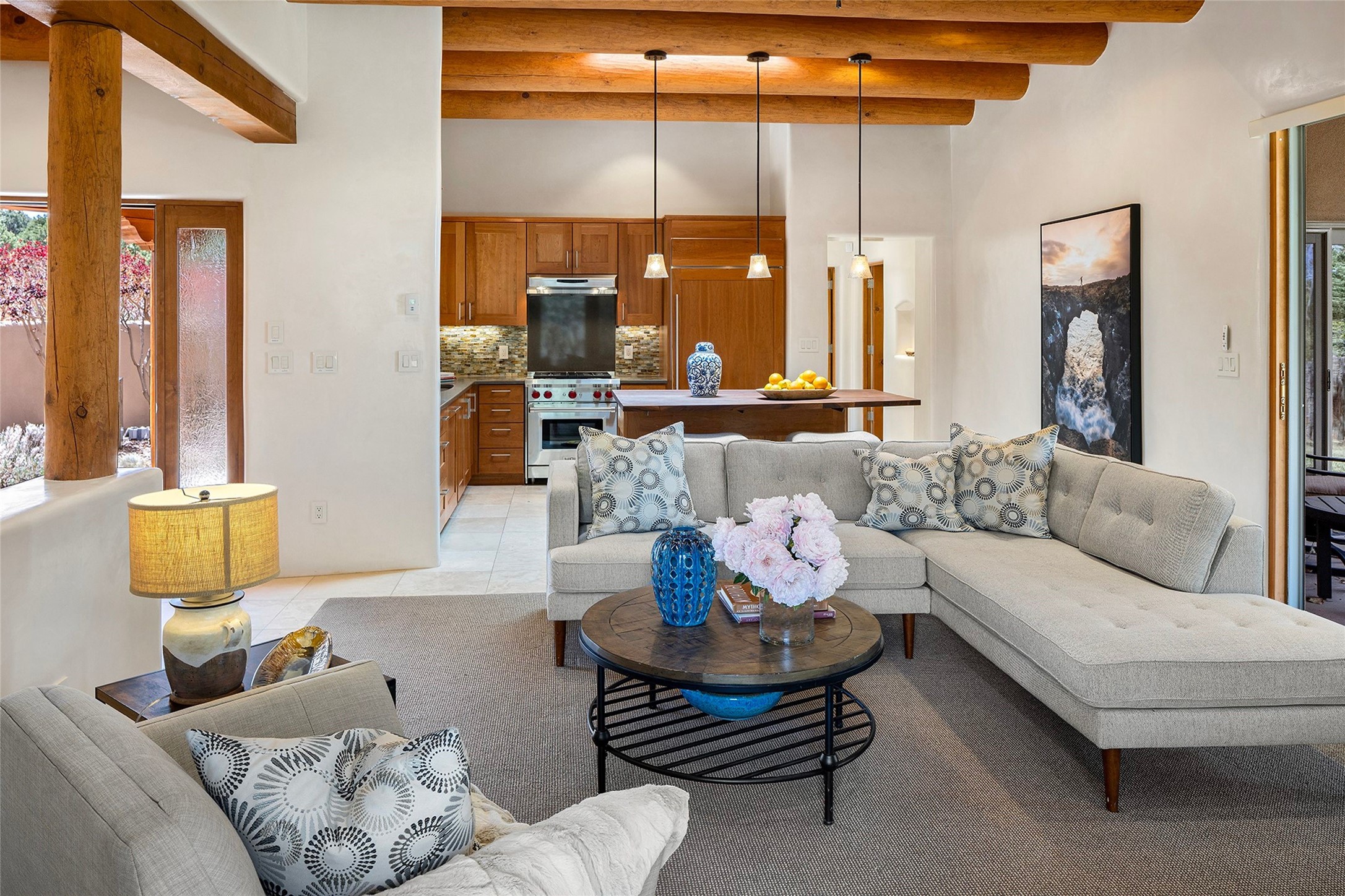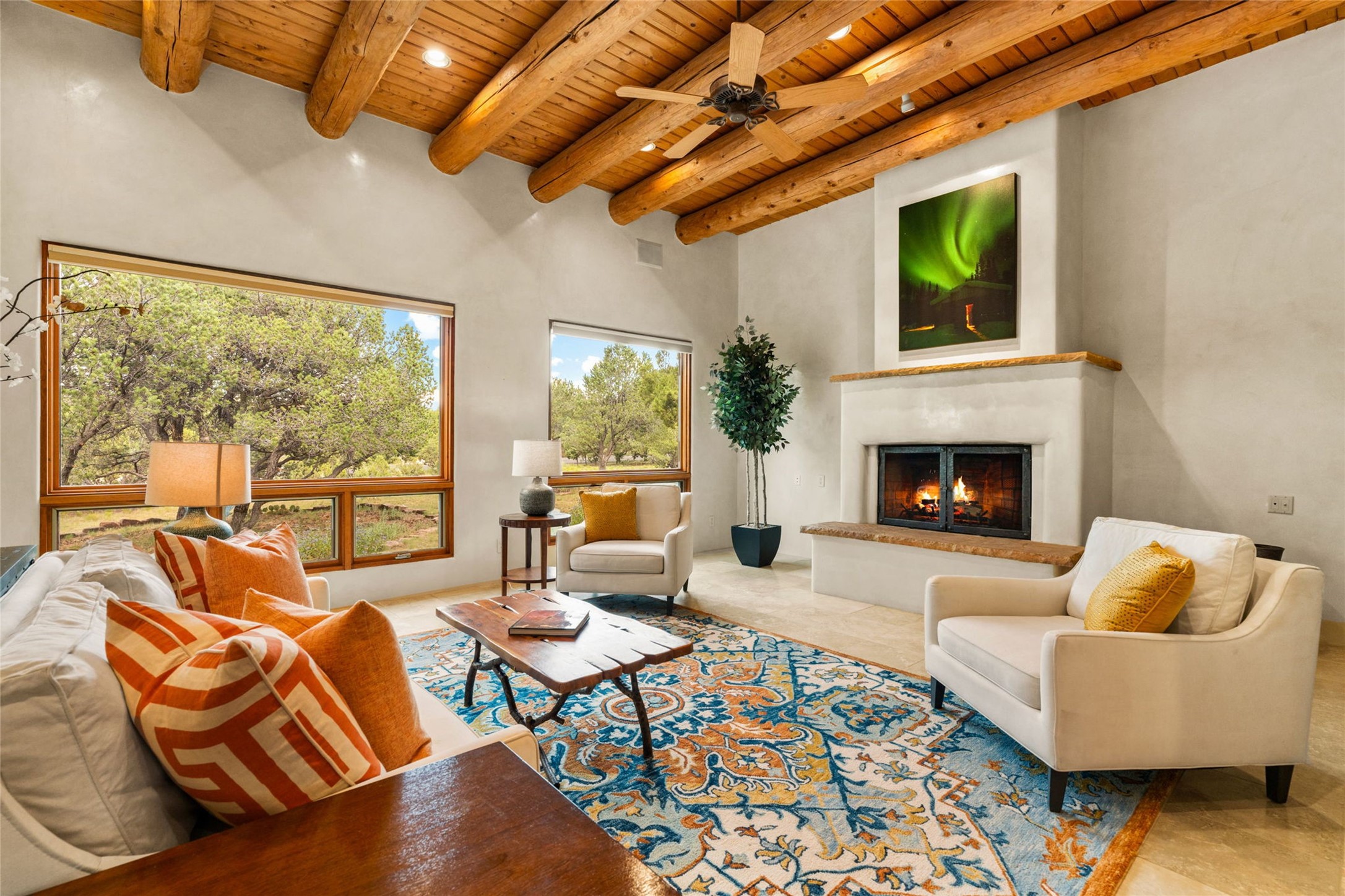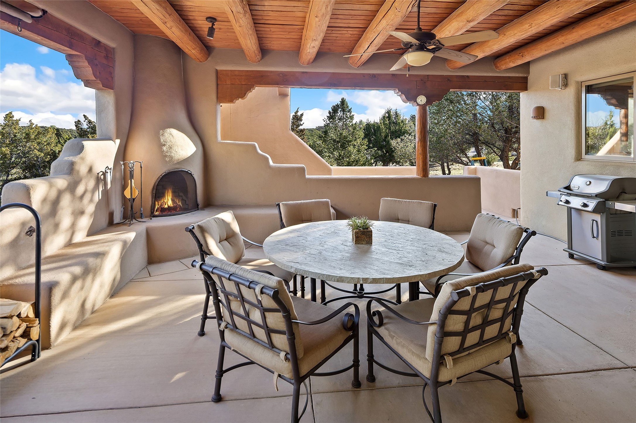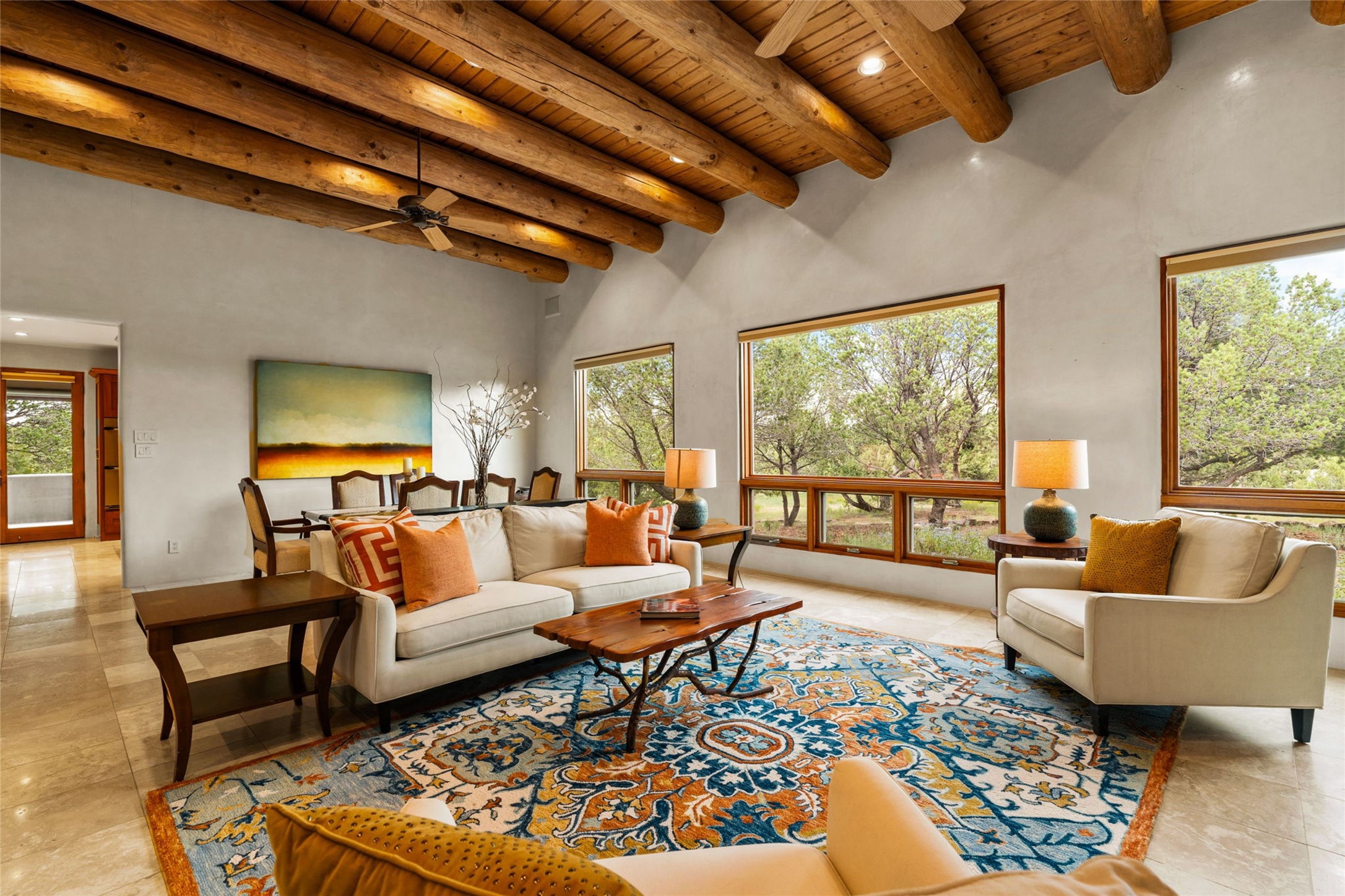 Spacious Luxury, Breathtaking Views & Multigenerational Comfort. Experience Santa Fe living at its finest in this elegant single-level home with an attached two-bedroom guest casita--ideal for extended family, guests, or a private retreat. Set on 1.5 acres in the gated community of Salva Tierra, this property offers stunning views, ultimate privacy, and convenient access to downtown, The Club at Las Campanas, and nearby hiking and biking trails. The main house features three ensuite bedrooms, a den, and an office, while the casita mirrors the main home's high-end finishes, including travertine floors, viga ceilings, and custom cabinetry. Both chef's kitchens are outfitted with Wolf, Sub-Zero, and Dacor appliances, large islands, and easy access to outdoor dining patios--perfect for entertaining under Santa Fe's starry skies. Enjoy peaceful courtyards, multiple portals, and a rooftop hot tub for sunset or stargazing. The primary suite includes a fireplace, spa-like bath, walk-in shower, soaking tub, and mountain views. Quality details throughout: radiant floor heat, mini splits, whole-house generator, new stucco, new TPO roof with warranty, electric shades, and a three-car garage with ample parking. Community amenities include tennis and pickleball courts, private roads, and a welcoming neighborhood atmosphere. Move-in ready and meticulously maintained--this home combines timeless Santa Fe style with modern comfort and flexibility for today's lifestyles. Watch the video and take the virtual tour to see why 118 E. Sunrise Drive is the perfect Santa Fe getaway or multigenerational retreat.