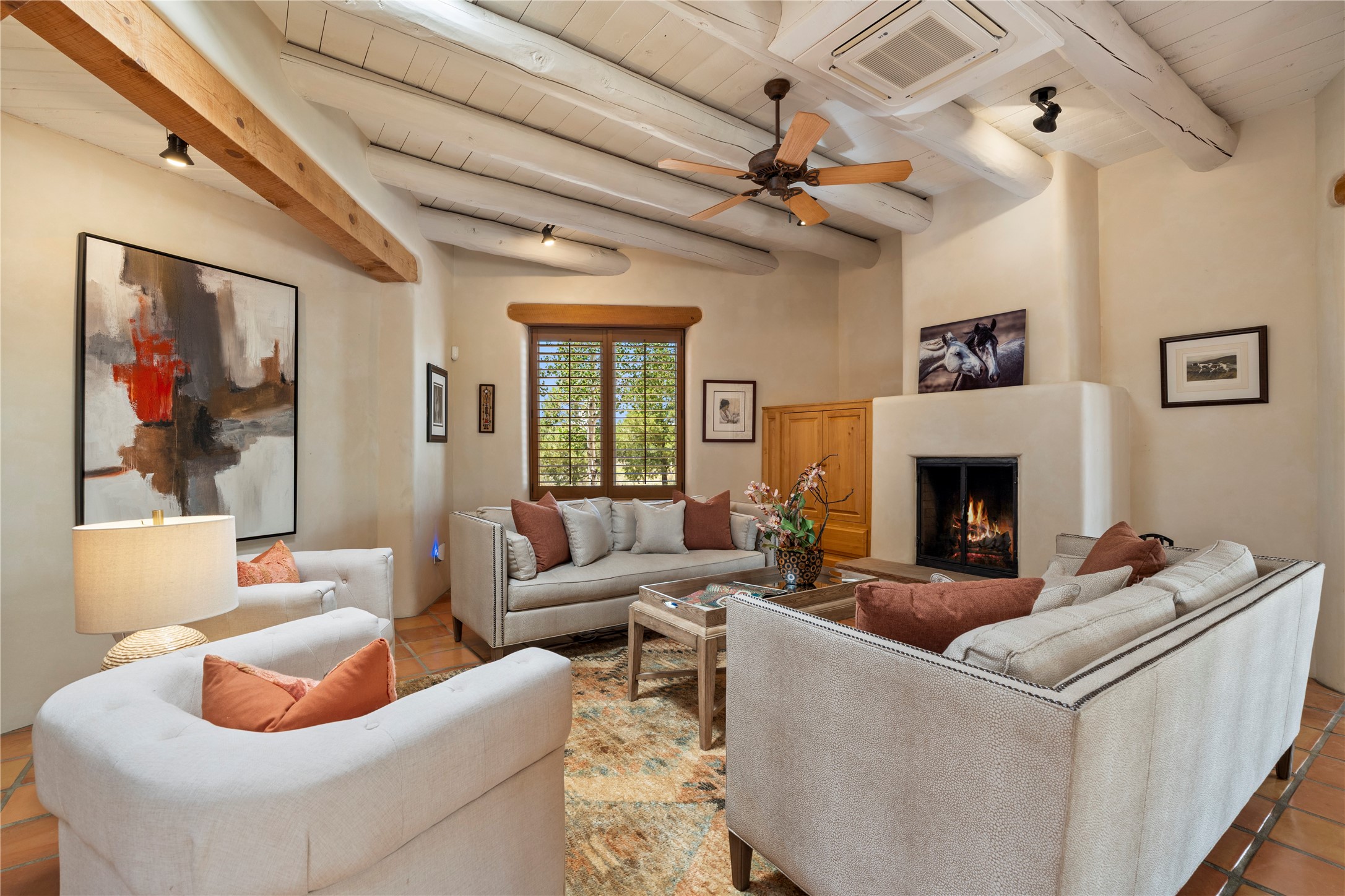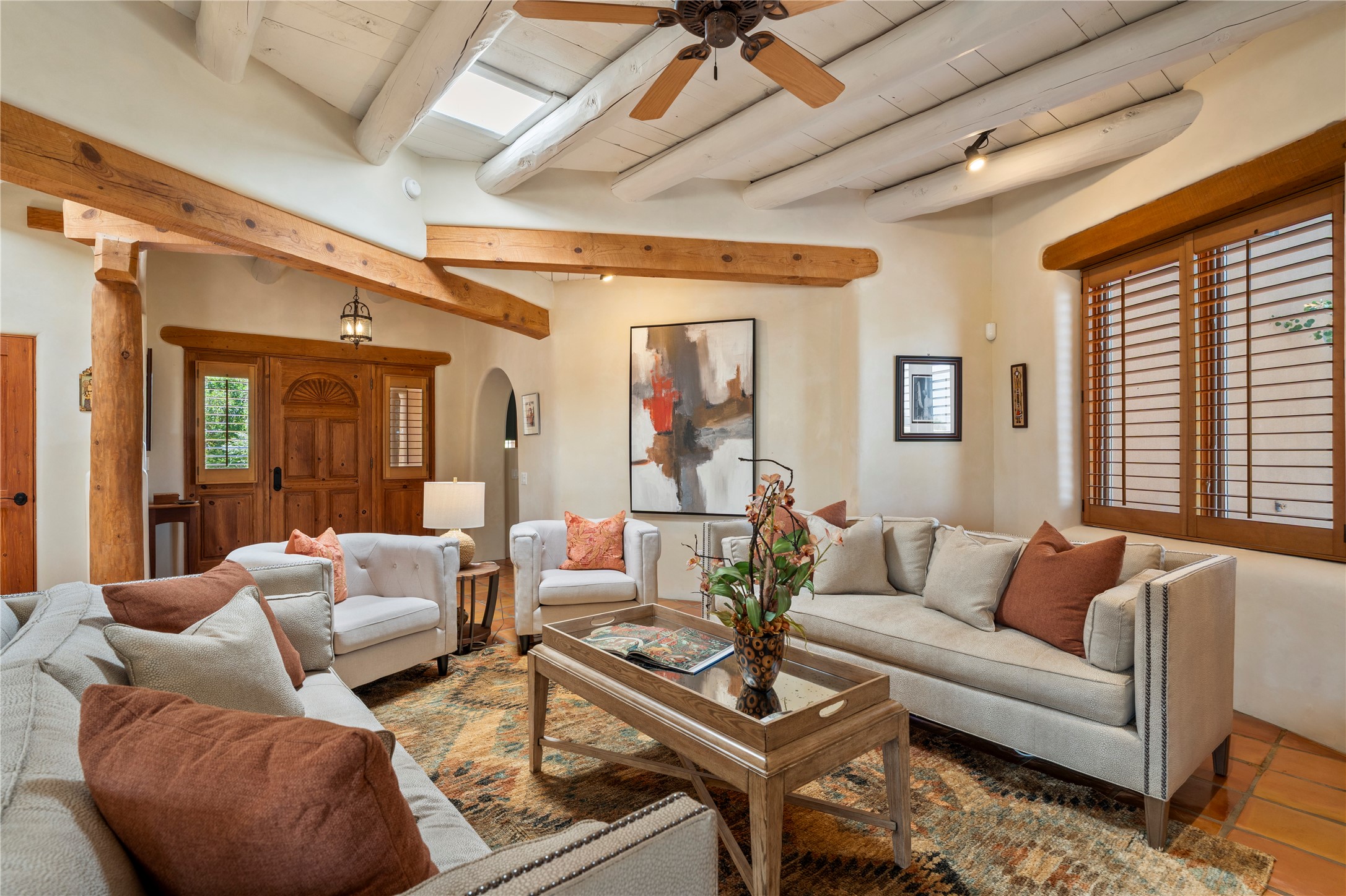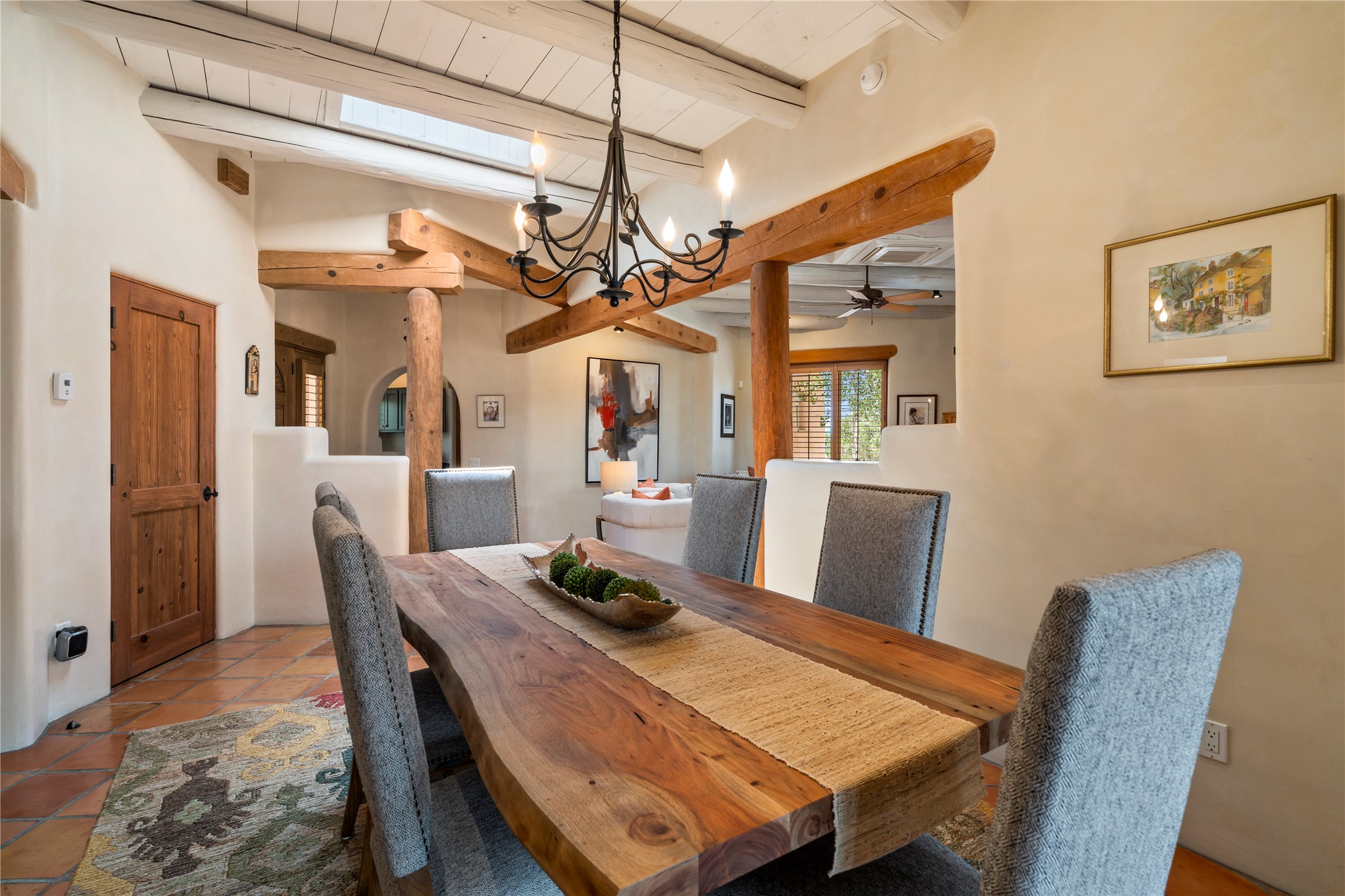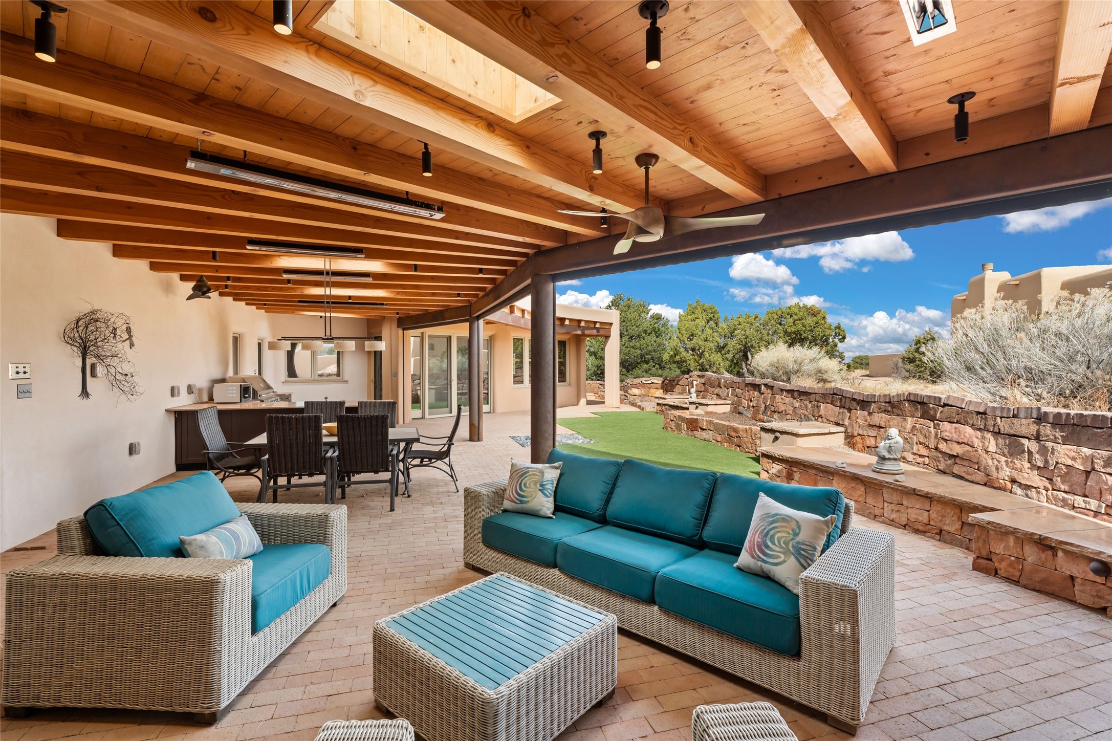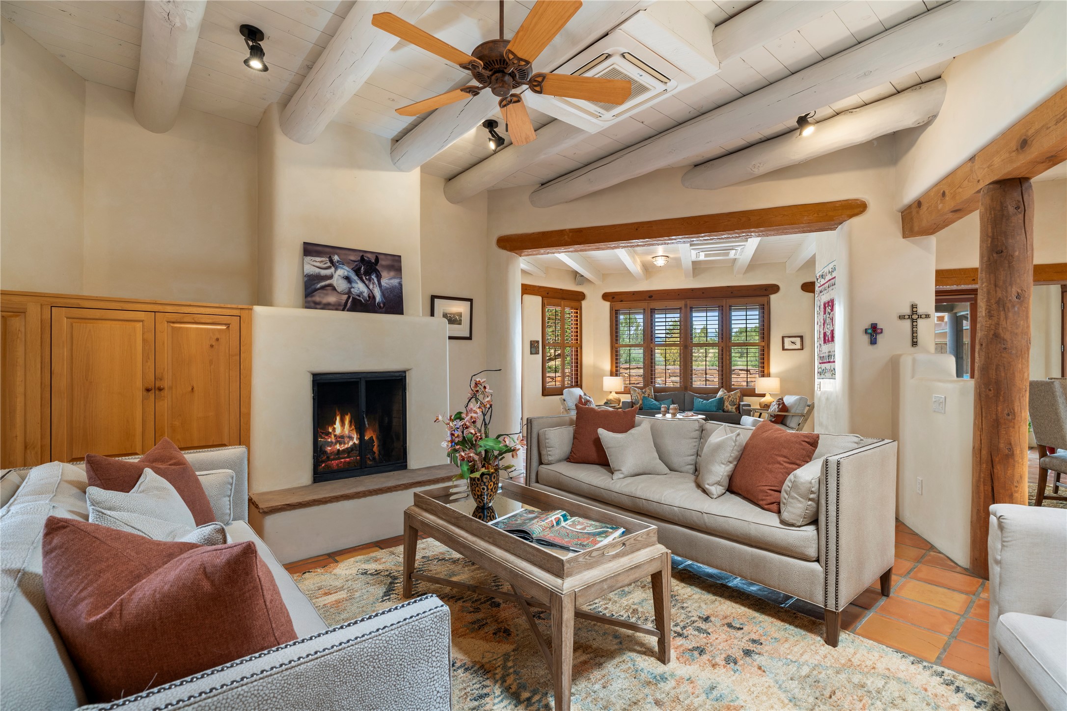 Welcome home to timeless elegance and a space that is as beautiful and functional on the inside as it is on the outside. Ideal living is captured with an open, recently updated kitchen which includes Wolf and Sub Zero appliances along with a charming beverage bar that overlooks the serene front courtyard, all enhanced with stylish Taj Majal quartzsite counters. Classic Saltillo tile, tall ceilings and rich wood accents tastefully adorn this peaceful space. True Santa Fe living is captured in the expansive rear portal with a full outdoor kitchen, Infratech heaters, fireplace and expert lighting. Between the large versatile space inside and the fabulous kitchen outside; this is the place to entertain! Entertainers come and see! Retire inside to an accommodating primary suite complete with an office, large bathroom and closet and charming outdoor space. Optimal separation of bedrooms, updated bathrooms, mini splits throughout, heated stone driveway, tasteful landscape with ample flagstone and meticulous maintenance combine to create a space which satisfies all the creature comforts. This gem is located a half mile from The Club in Las Campanas' popular Park Estates. Come and see!