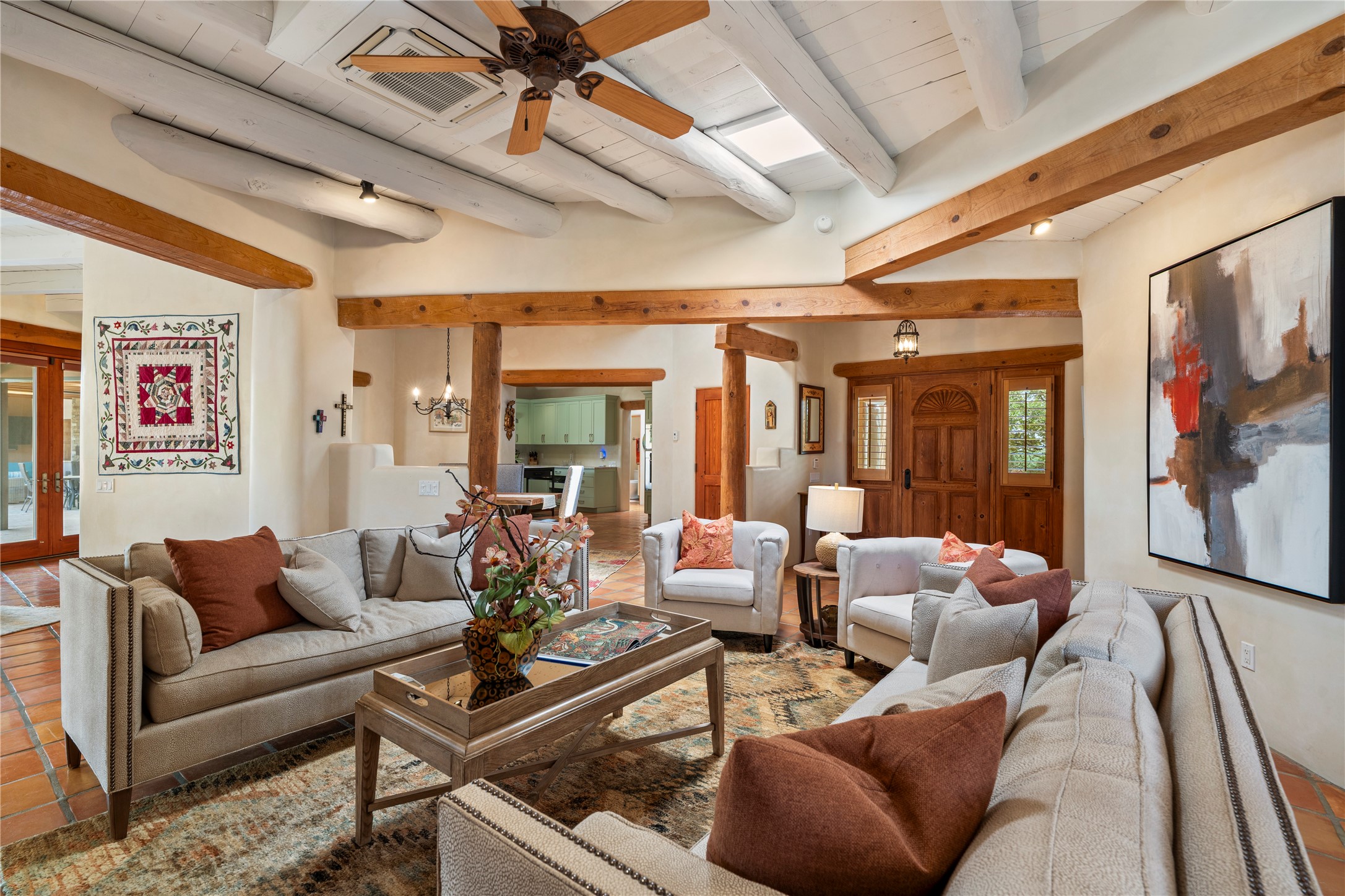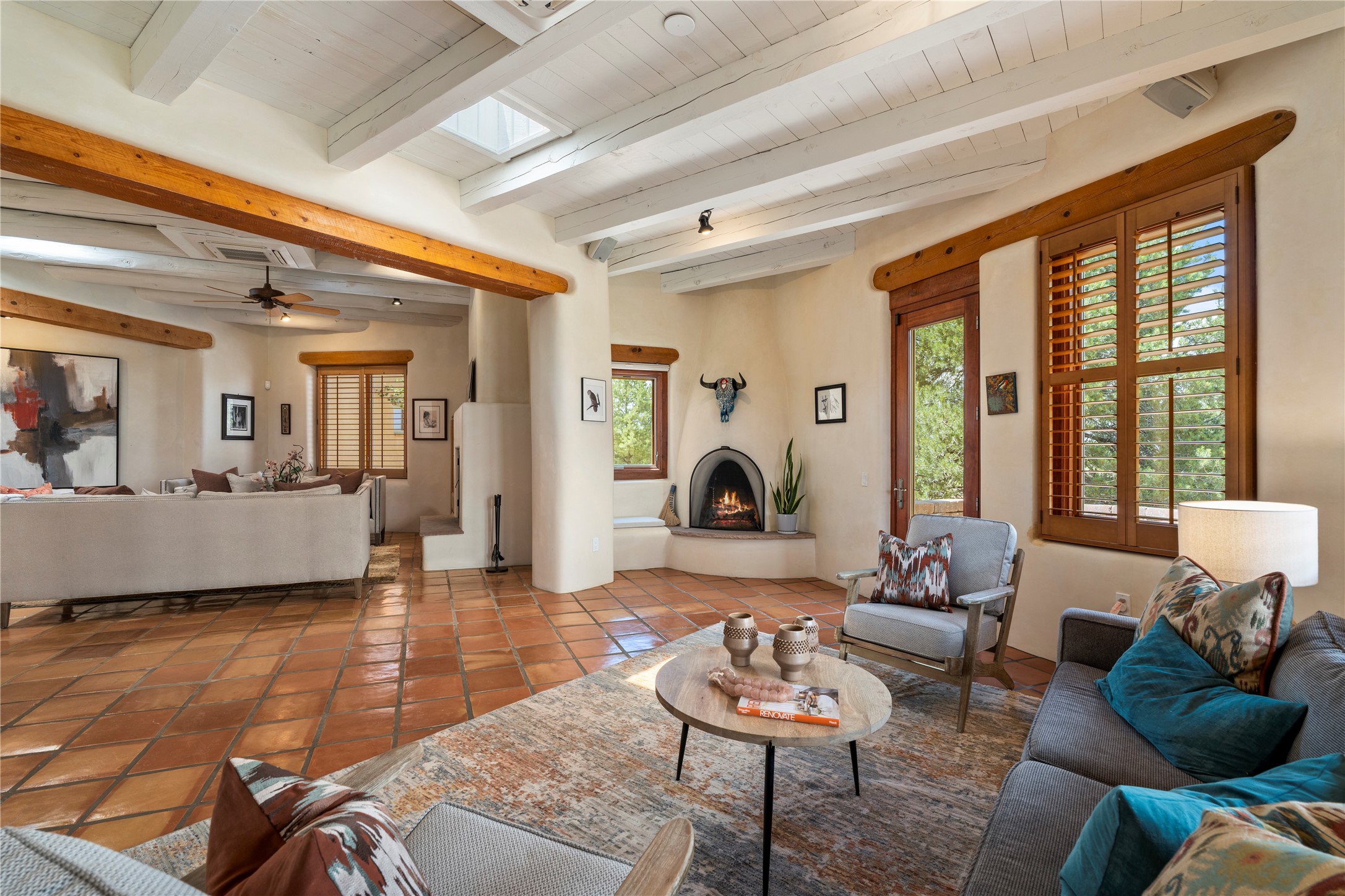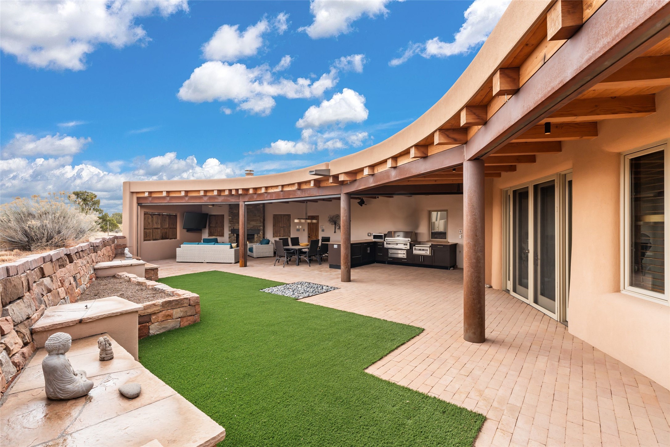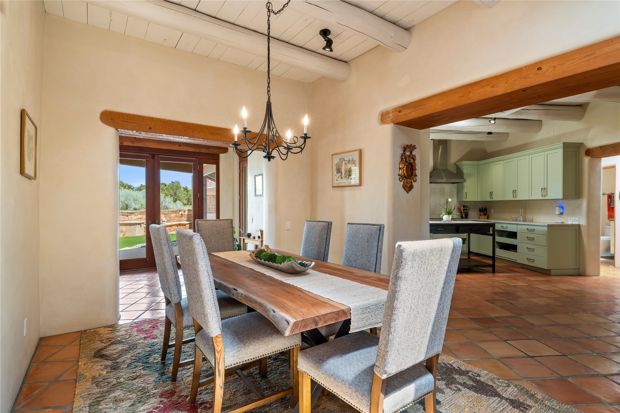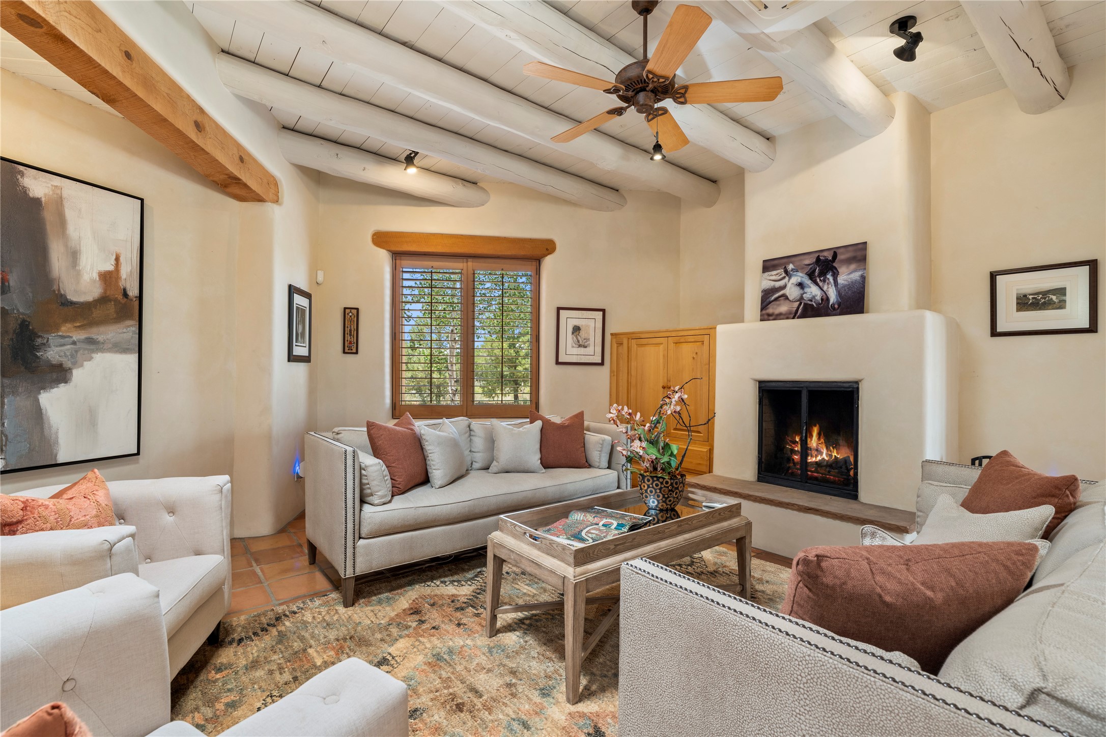Welcome home to timeless elegance and a space that is as beautiful and functional on the inside as it is on the outside. Ideal living is captured with an open, recently updated kitchen which includes Wolf and Sub Zero appliances along with a charming beverage bar that overlooks the serene front courtyard, all enhanced with stylish Taj Majal quartzsite counters. Classic Saltillo tile, tall ceilings and rich wood accents tastefully adorn this peaceful space. True Santa Fe living is captured in the expansive rear portal with a full outdoor kitchen, Infratech heaters, fireplace and expert lighting. Between the large versatile space inside and the fabulous kitchen outside; this is the place to entertain! Entertainers come and see! Retire inside to an accommodating primary suite complete with an office, large bathroom and closet and charming outdoor space. Optimal separation of bedrooms, updated bathrooms, mini splits throughout, heated stone driveway, tasteful landscape with ample flagstone and meticulous maintenance combine to create a space which satisfies all the creature comforts. This gem is located a half mile from The Club in Las Campanas' popular Park Estates. Come and see!
