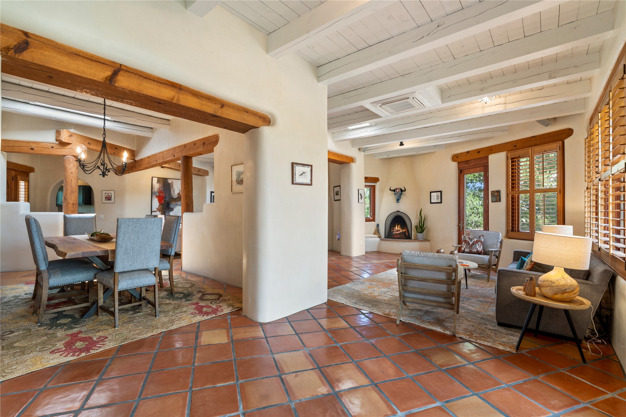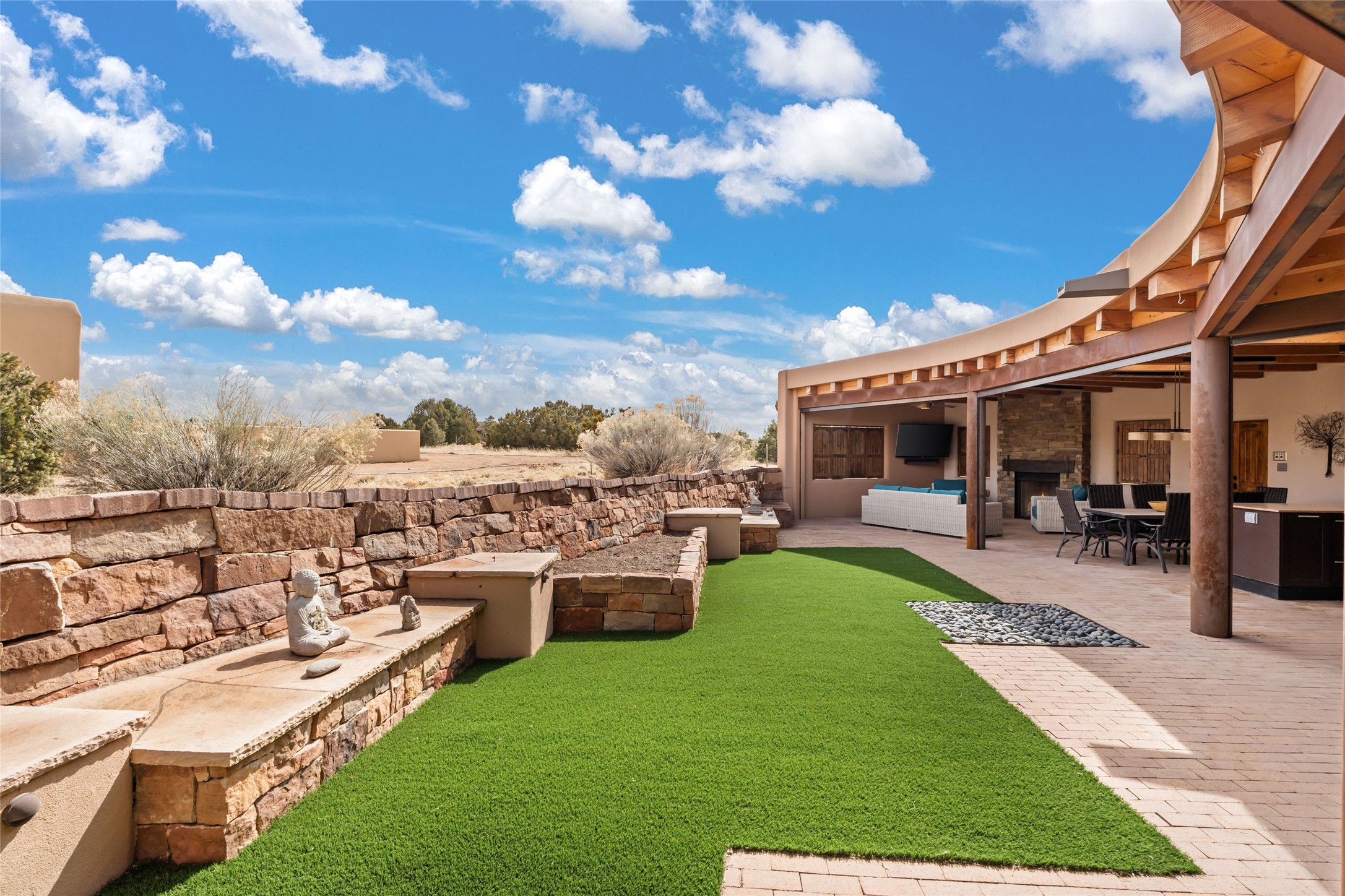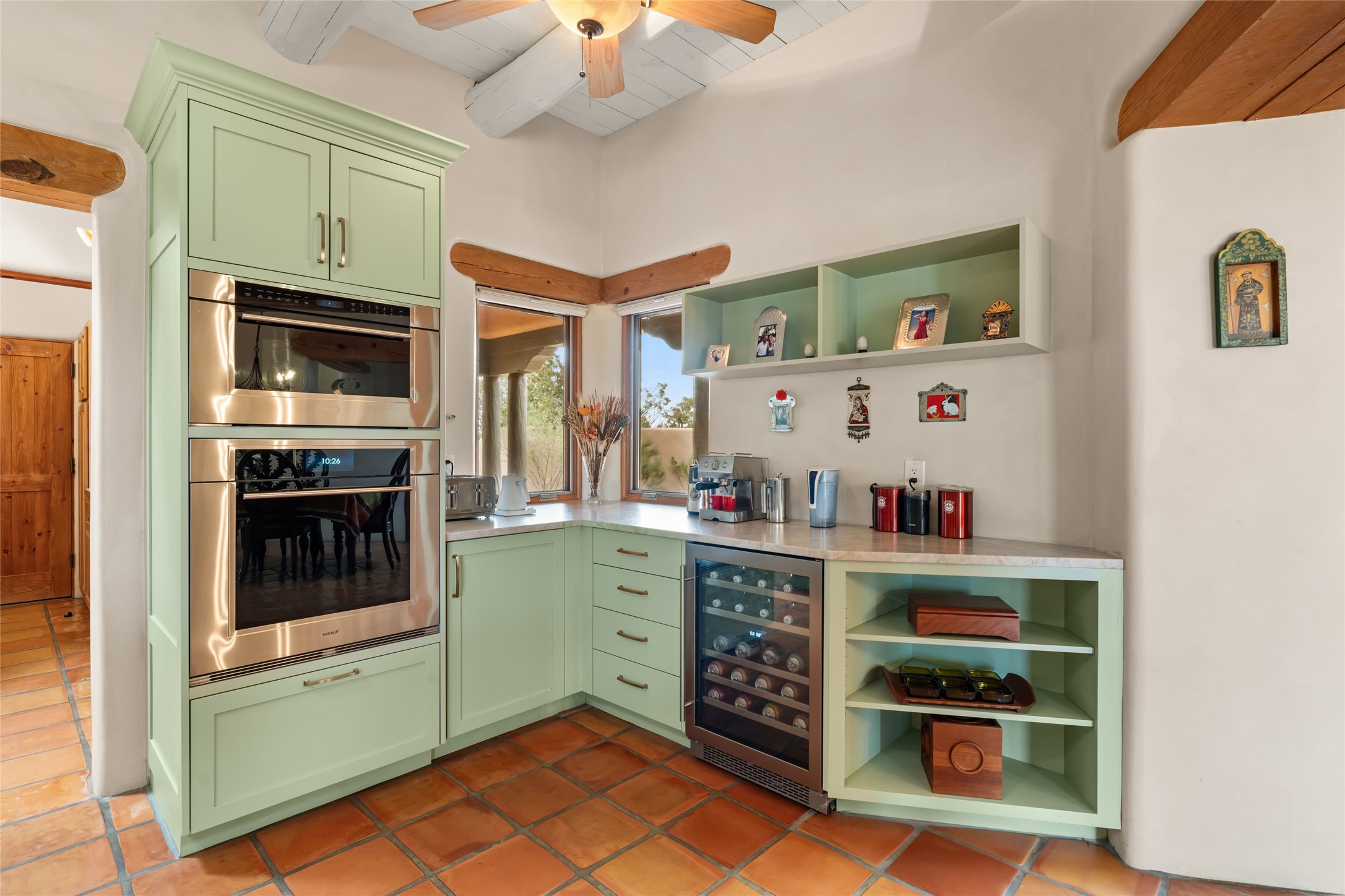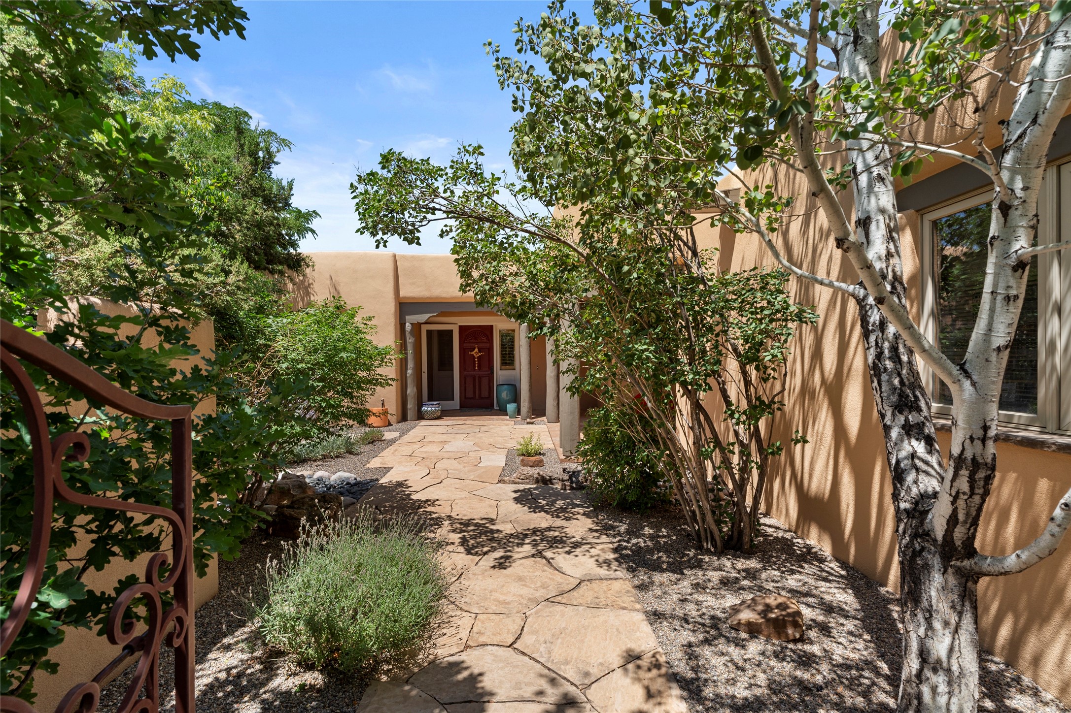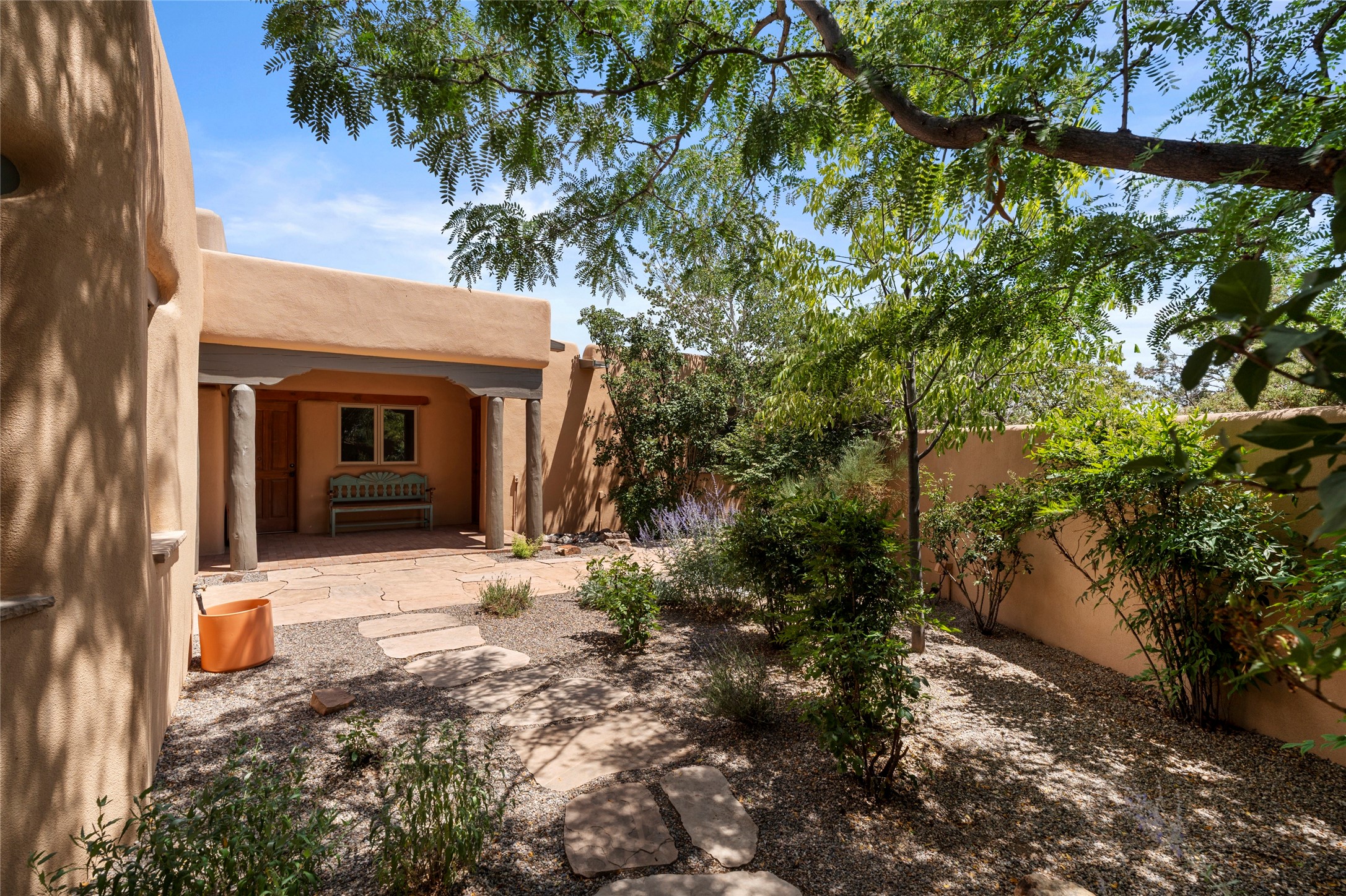 Welcome home to timeless elegance and a space that is as beautiful and functional on the inside as it is on the outside. Ideal living is captured with an open, recently updated kitchen which includes Wolf and Sub Zero appliances along with a charming beverage bar that overlooks the serene front courtyard, all enhanced with stylish Taj Majal quartzsite counters. Classic Saltillo tile, tall ceilings and rich wood accents tastefully adorn this peaceful space. True Santa Fe living is captured in the expansive rear portal with a full outdoor kitchen, Infratech heaters, fireplace and expert lighting. Between the large versatile space inside and the fabulous kitchen outside; this is the place to entertain! Entertainers come and see! Retire inside to an accommodating primary suite complete with an office, large bathroom and closet and charming outdoor space. Optimal separation of bedrooms, updated bathrooms, mini splits throughout, heated stone driveway, tasteful landscape with ample flagstone and meticulous maintenance combine to create a space which satisfies all the creature comforts. This gem is located a half mile from The Club in Las Campanas' popular Park Estates. Come and see!