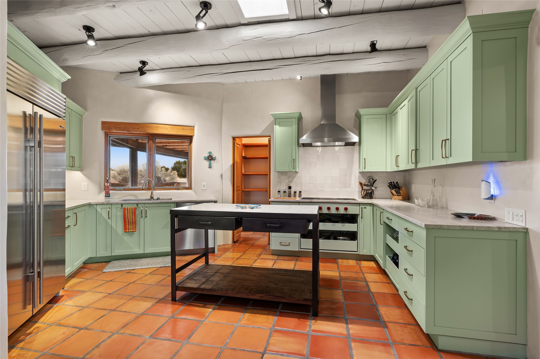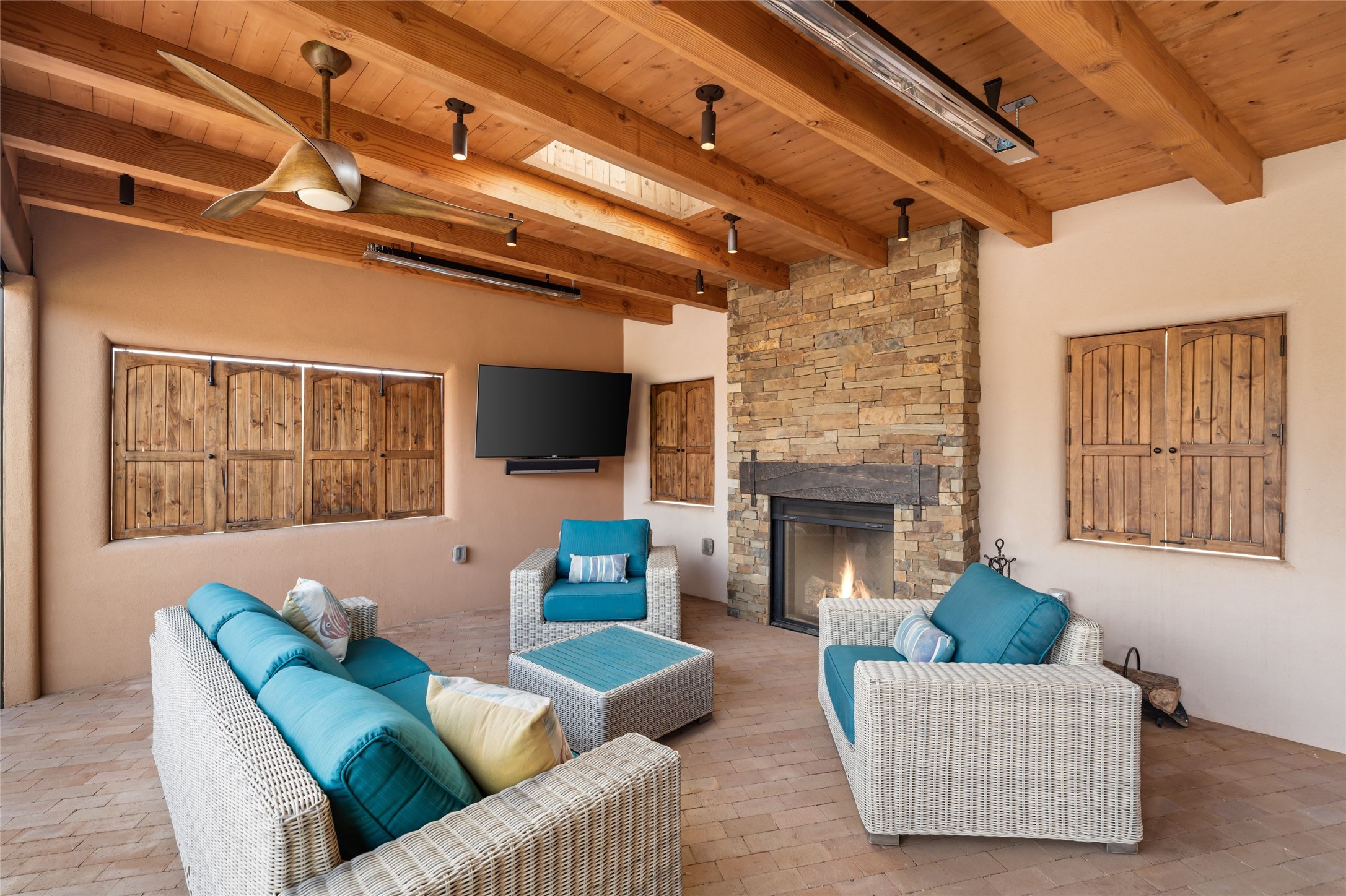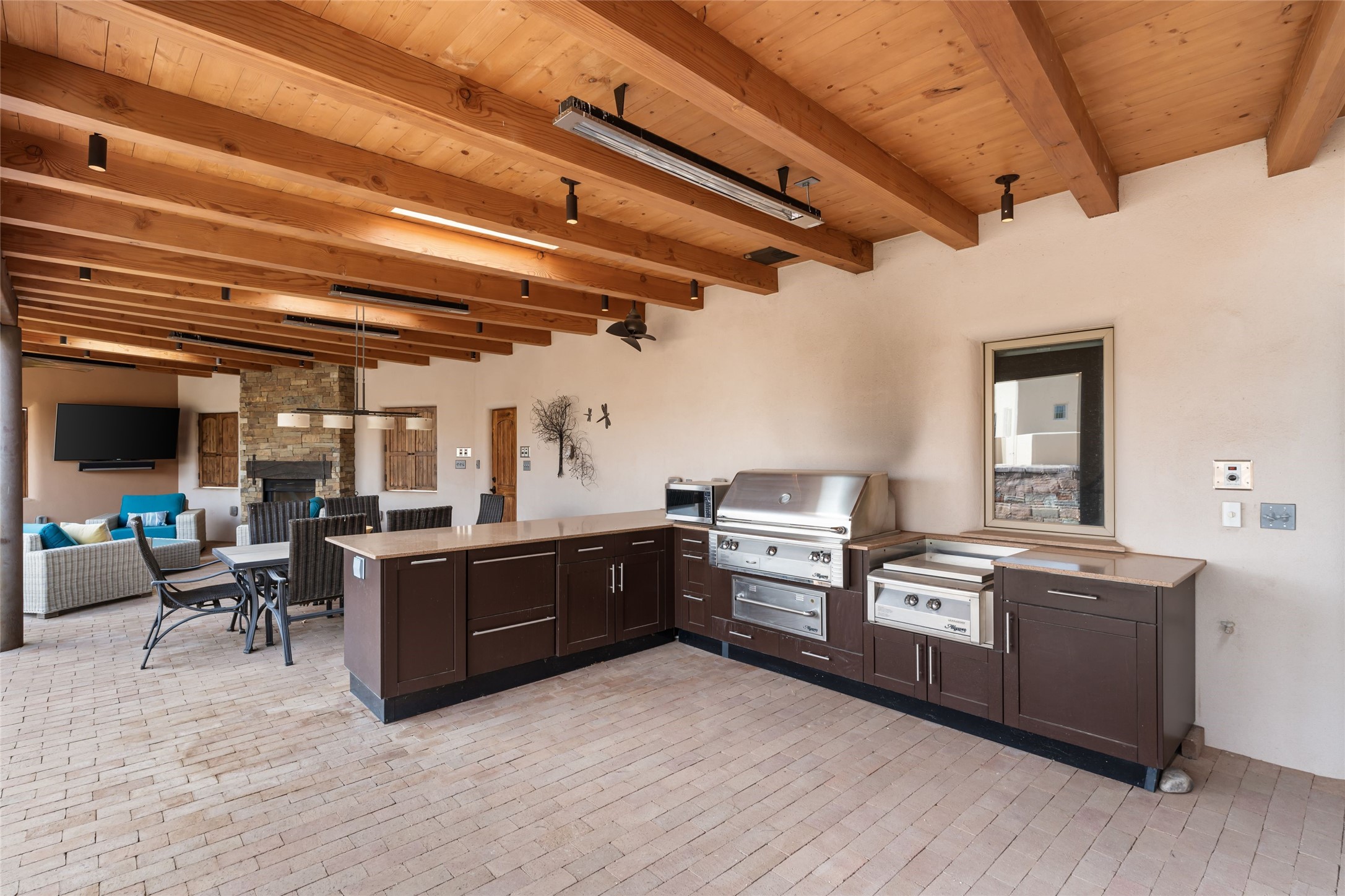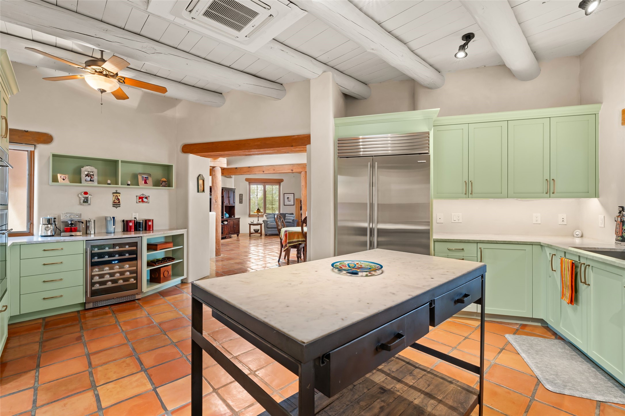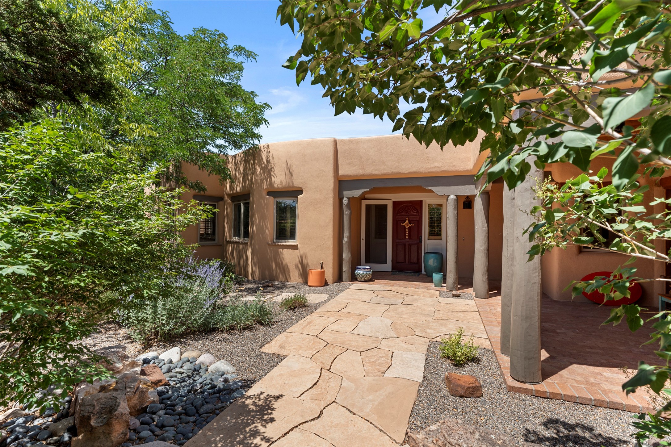 Welcome home to timeless elegance and a space that is as beautiful and functional on the inside as it is on the outside. Ideal living is captured with an open, recently updated kitchen which includes Wolf and Sub Zero appliances along with a charming beverage bar that overlooks the serene front courtyard, all enhanced with stylish Taj Majal quartzsite counters. Classic Saltillo tile, tall ceilings and rich wood accents tastefully adorn this peaceful space. True Santa Fe living is captured in the expansive rear portal with a full outdoor kitchen, Infratech heaters, fireplace and expert lighting. Between the large versatile space inside and the fabulous kitchen outside; this is the place to entertain! Entertainers come and see! Retire inside to an accommodating primary suite complete with an office, large bathroom and closet and charming outdoor space. Optimal separation of bedrooms, updated bathrooms, mini splits throughout, heated stone driveway, tasteful landscape with ample flagstone and meticulous maintenance combine to create a space which satisfies all the creature comforts. This gem is located a half mile from The Club in Las Campanas' popular Park Estates. Come and see!