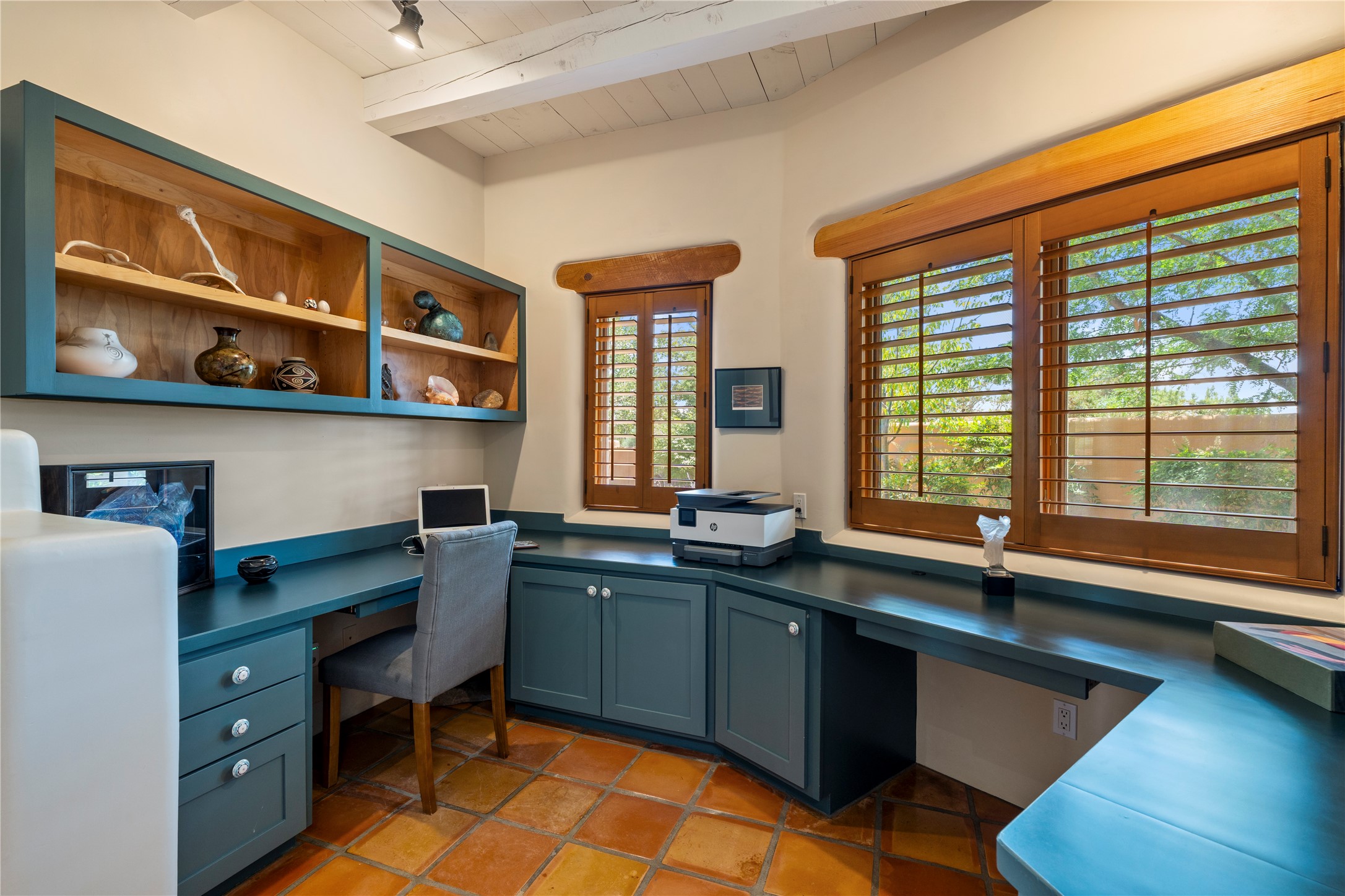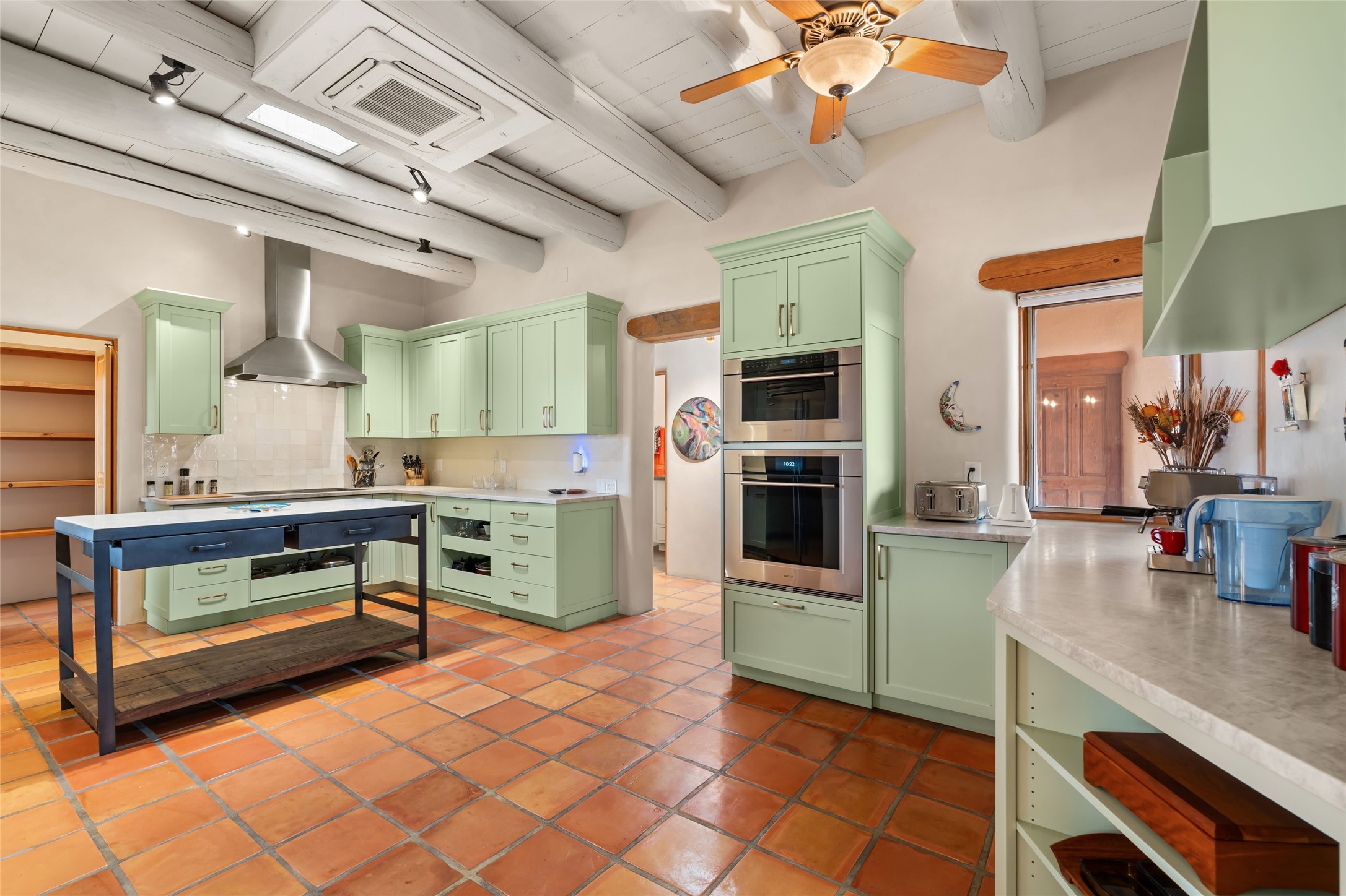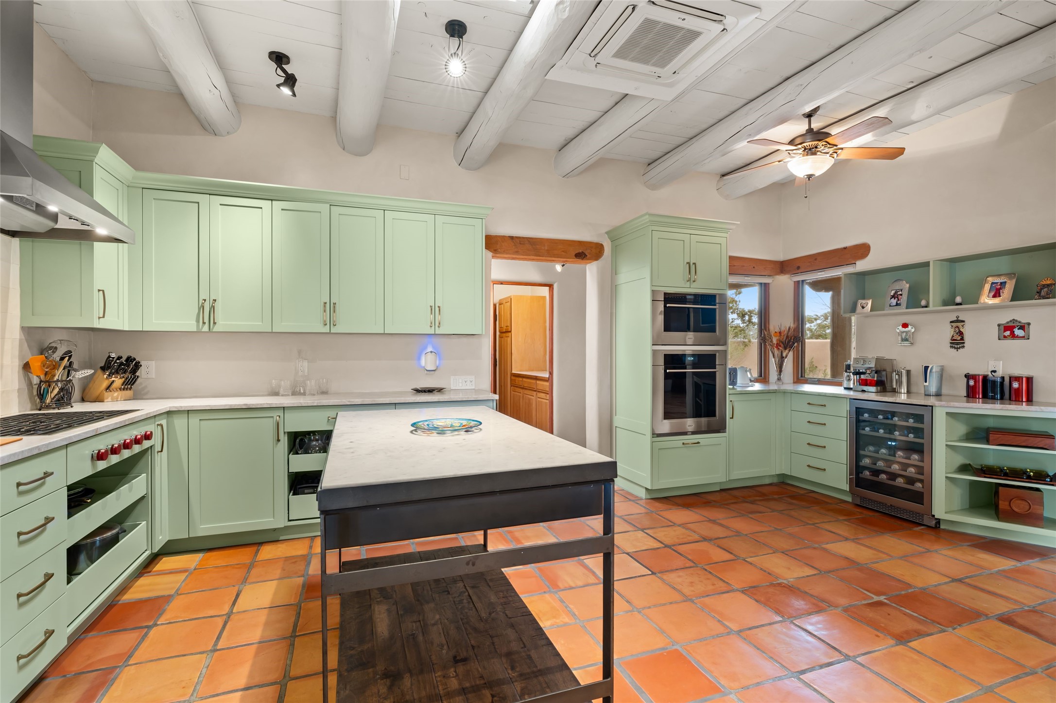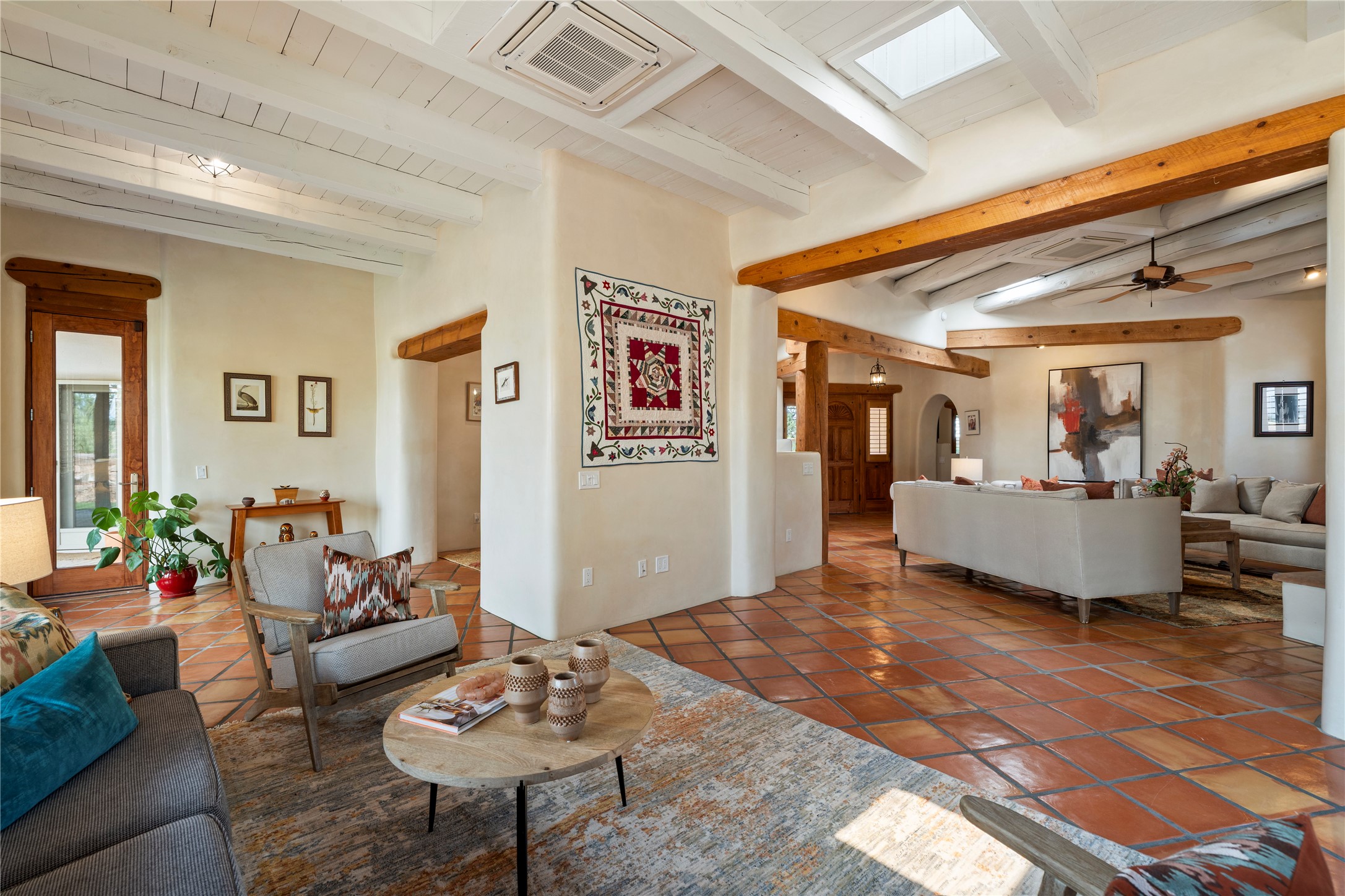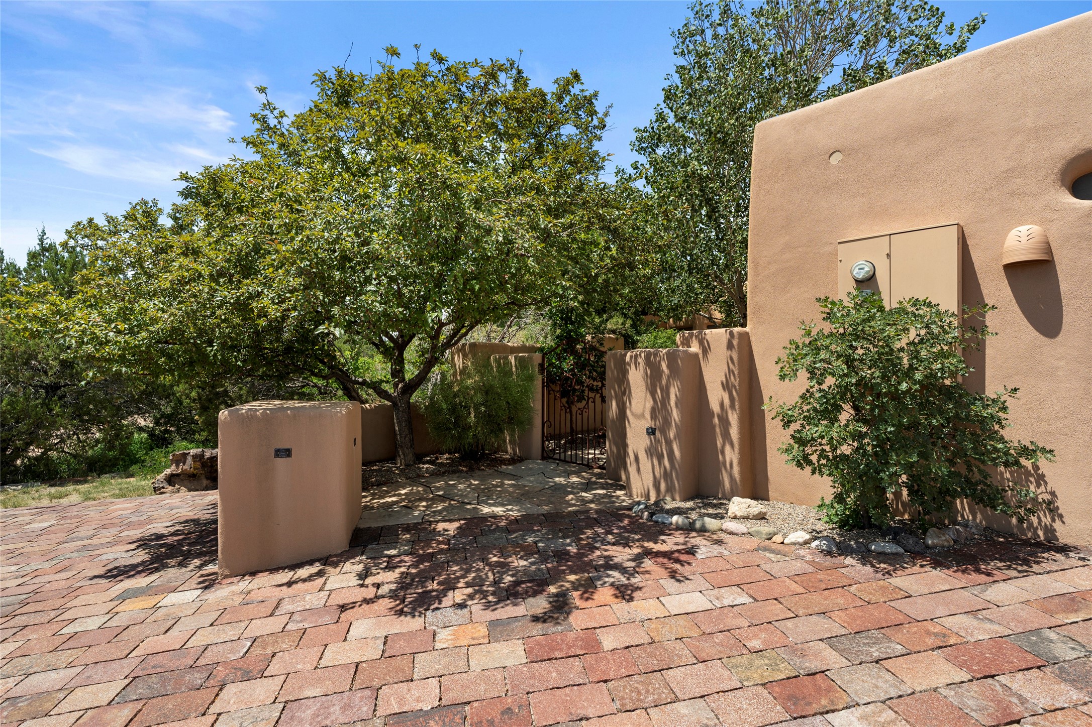 Welcome home to timeless elegance and a space that is as beautiful and functional on the inside as it is on the outside. Ideal living is captured with an open, recently updated kitchen which includes Wolf and Sub Zero appliances along with a charming beverage bar that overlooks the serene front courtyard, all enhanced with stylish Taj Majal quartzsite counters. Classic Saltillo tile, tall ceilings and rich wood accents tastefully adorn this peaceful space. True Santa Fe living is captured in the expansive rear portal with a full outdoor kitchen, Infratech heaters, fireplace and expert lighting. Between the large versatile space inside and the fabulous kitchen outside; this is the place to entertain! Entertainers come and see! Retire inside to an accommodating primary suite complete with an office, large bathroom and closet and charming outdoor space. Optimal separation of bedrooms, updated bathrooms, mini splits throughout, heated stone driveway, tasteful landscape with ample flagstone and meticulous maintenance combine to create a space which satisfies all the creature comforts. This gem is located a half mile from The Club in Las Campanas' popular Park Estates. Come and see!