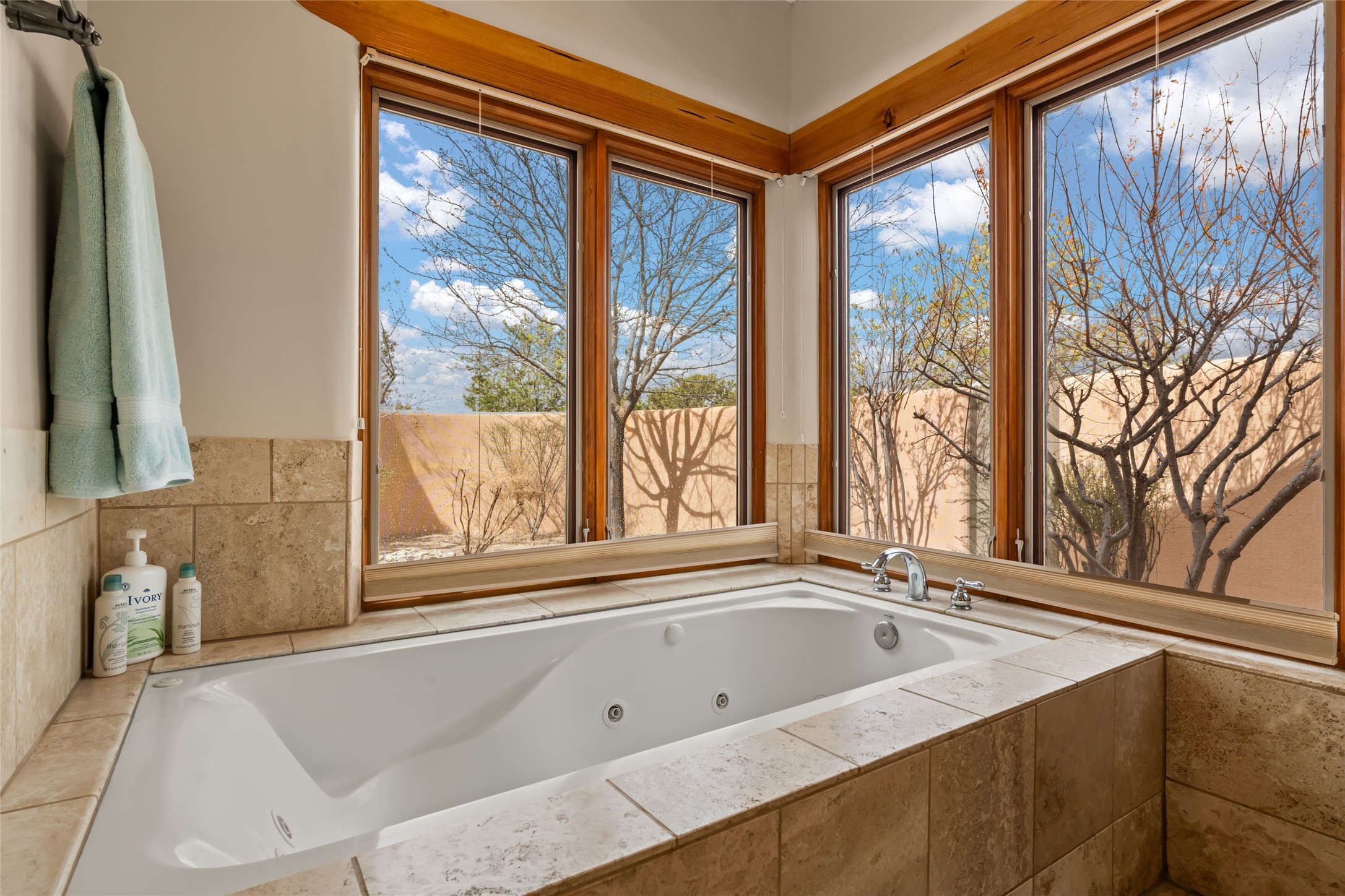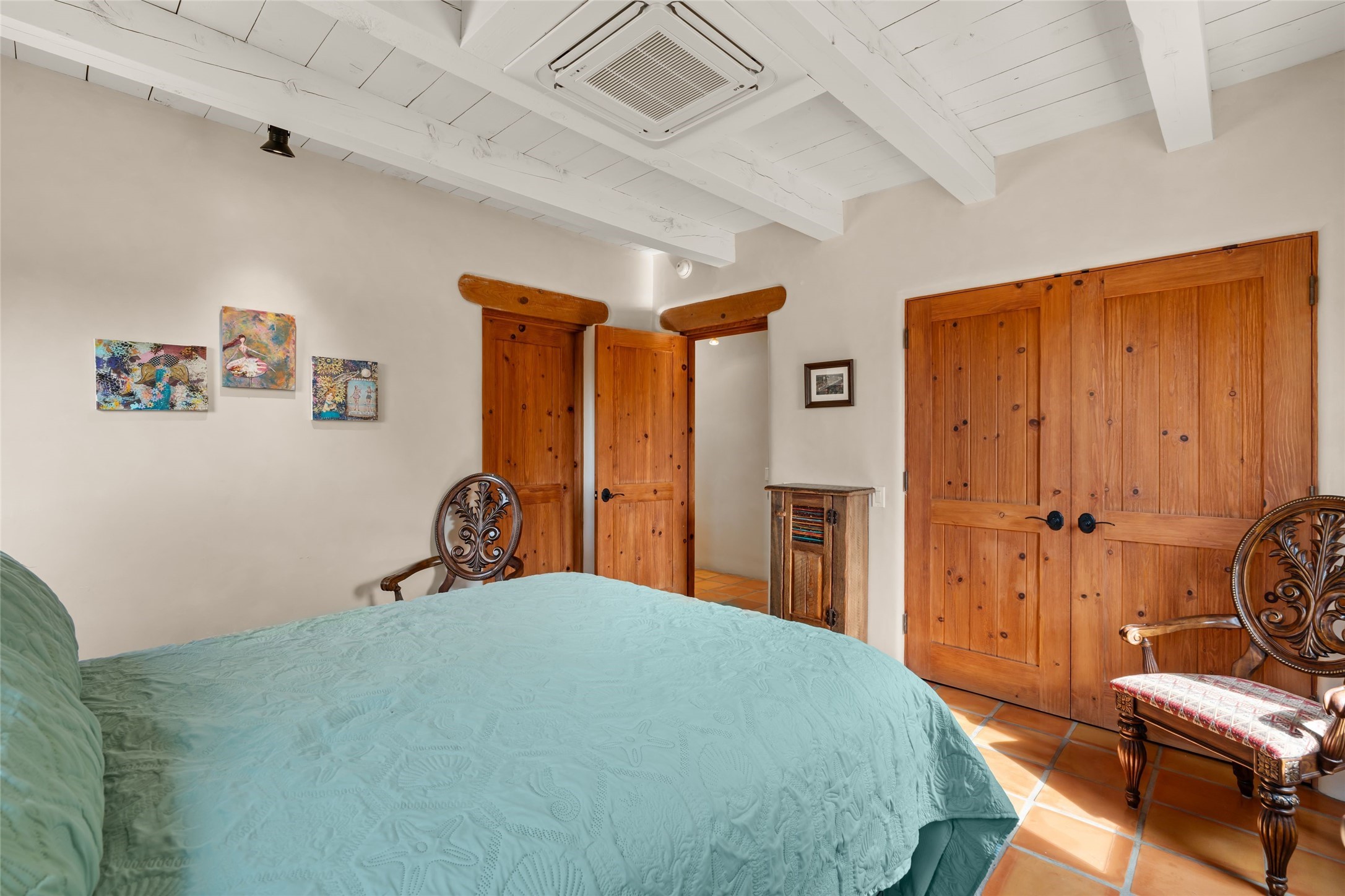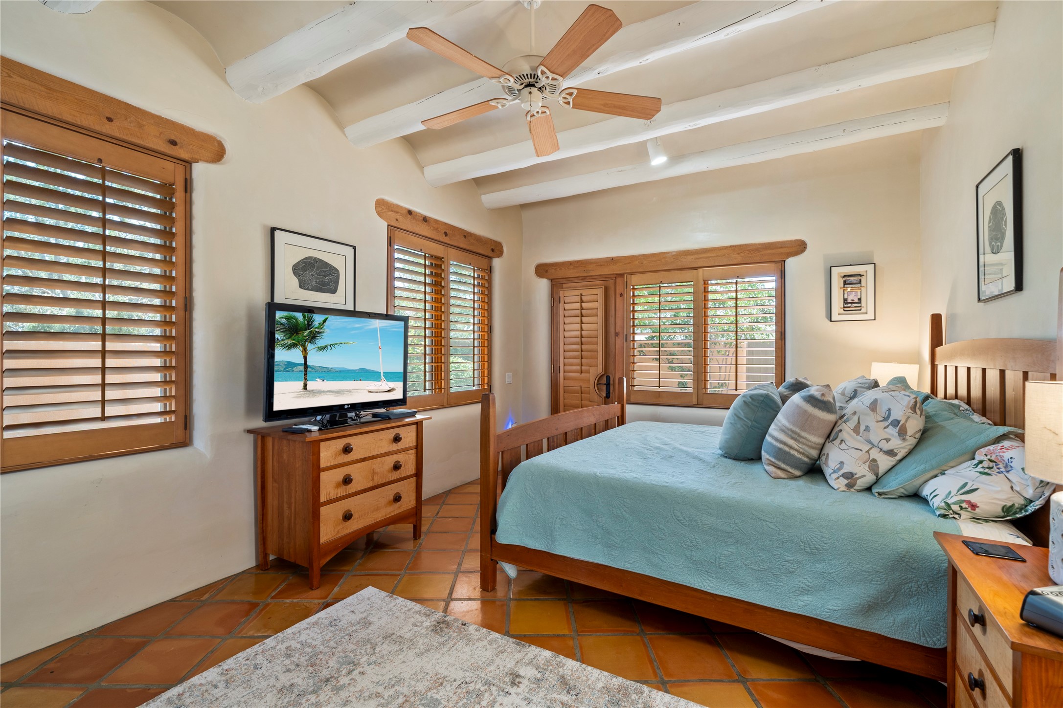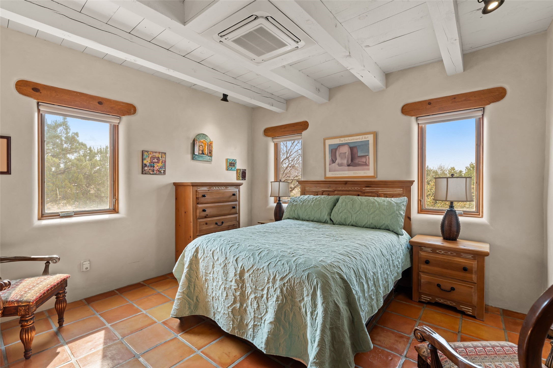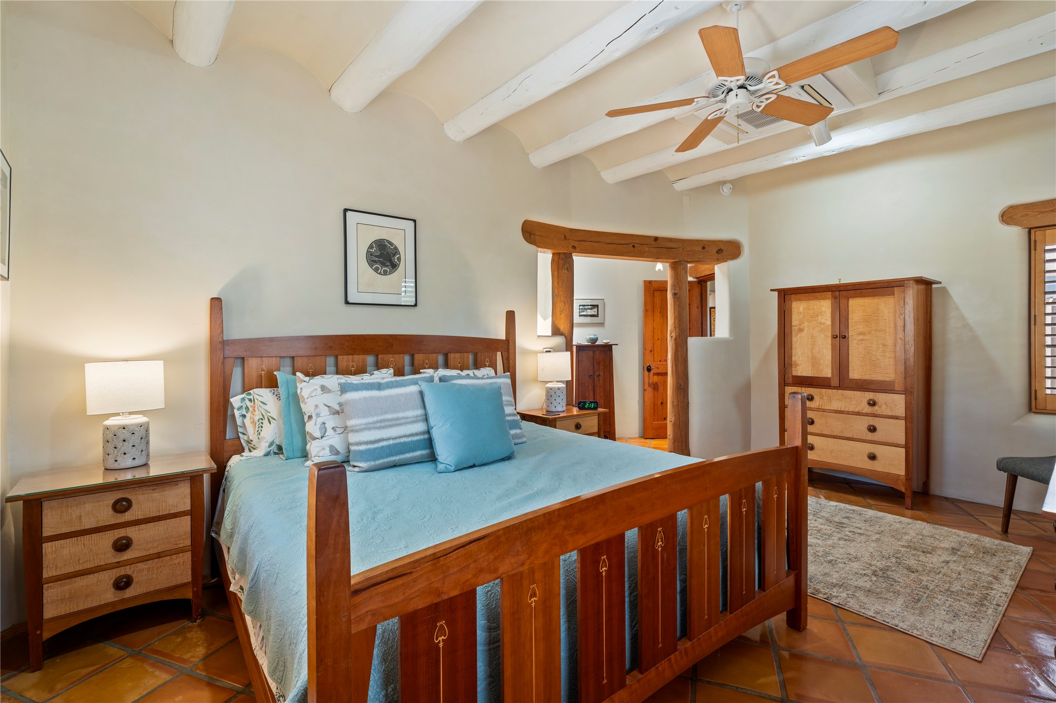 Welcome home to timeless elegance and a space that is as beautiful and functional on the inside as it is on the outside. Ideal living is captured with an open, recently updated kitchen which includes Wolf and Sub Zero appliances along with a charming beverage bar that overlooks the serene front courtyard, all enhanced with stylish Taj Majal quartzsite counters. Classic Saltillo tile, tall ceilings and rich wood accents tastefully adorn this peaceful space. True Santa Fe living is captured in the expansive rear portal with a full outdoor kitchen, Infratech heaters, fireplace and expert lighting. Between the large versatile space inside and the fabulous kitchen outside; this is the place to entertain! Entertainers come and see! Retire inside to an accommodating primary suite complete with an office, large bathroom and closet and charming outdoor space. Optimal separation of bedrooms, updated bathrooms, mini splits throughout, heated stone driveway, tasteful landscape with ample flagstone and meticulous maintenance combine to create a space which satisfies all the creature comforts. This gem is located a half mile from The Club in Las Campanas' popular Park Estates. Come and see!