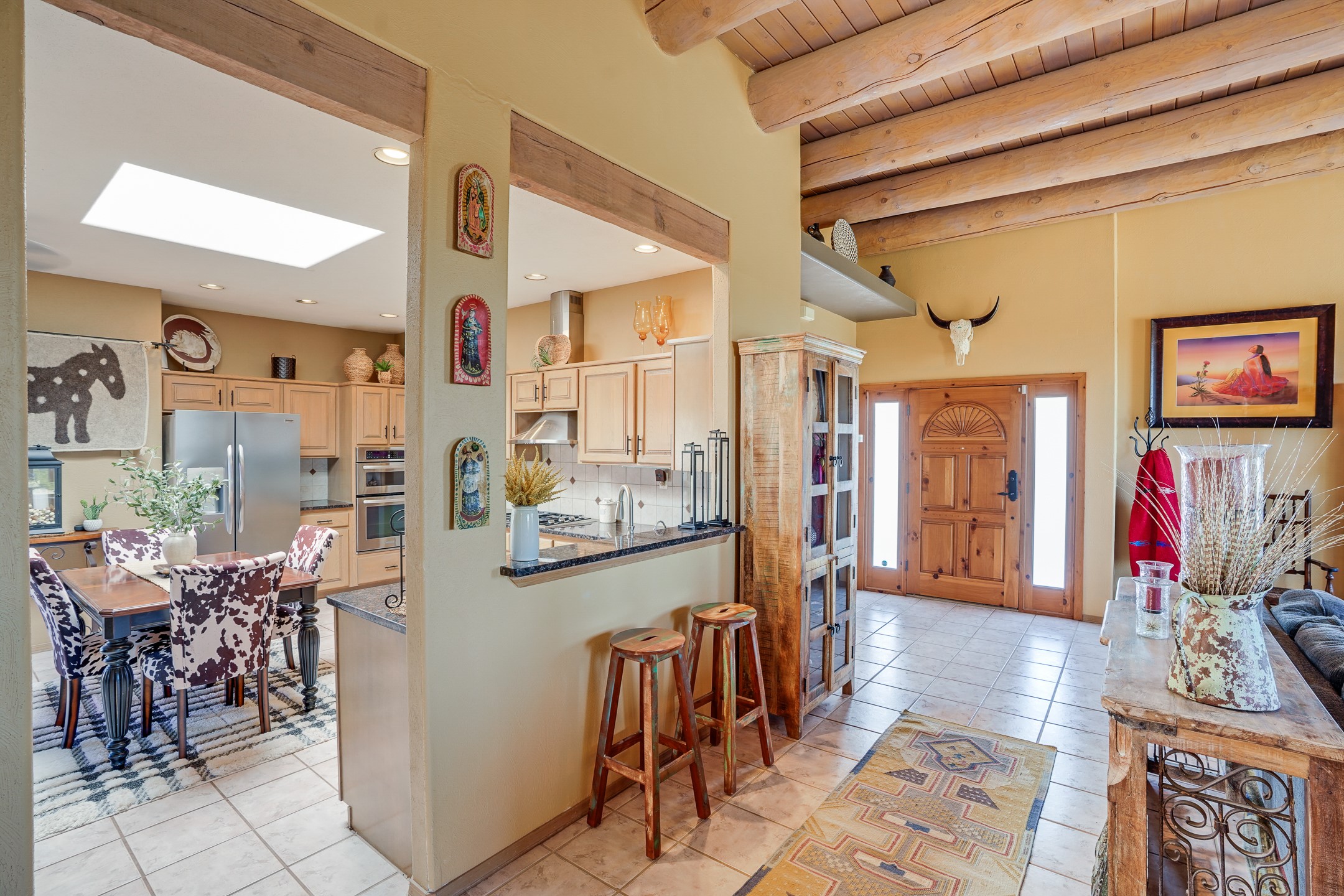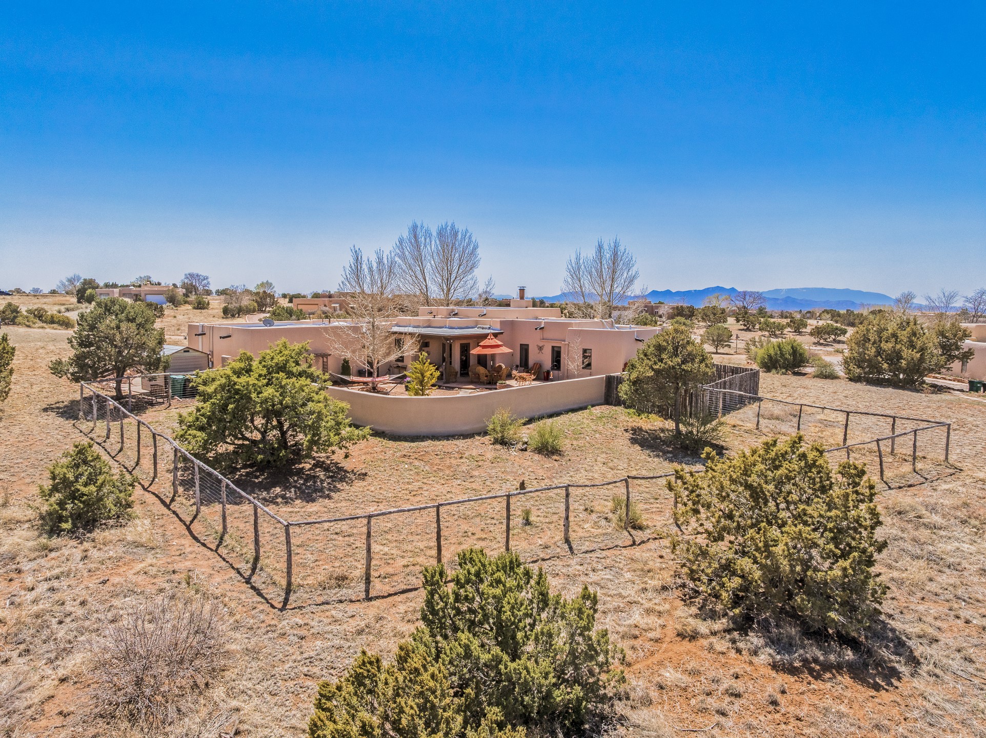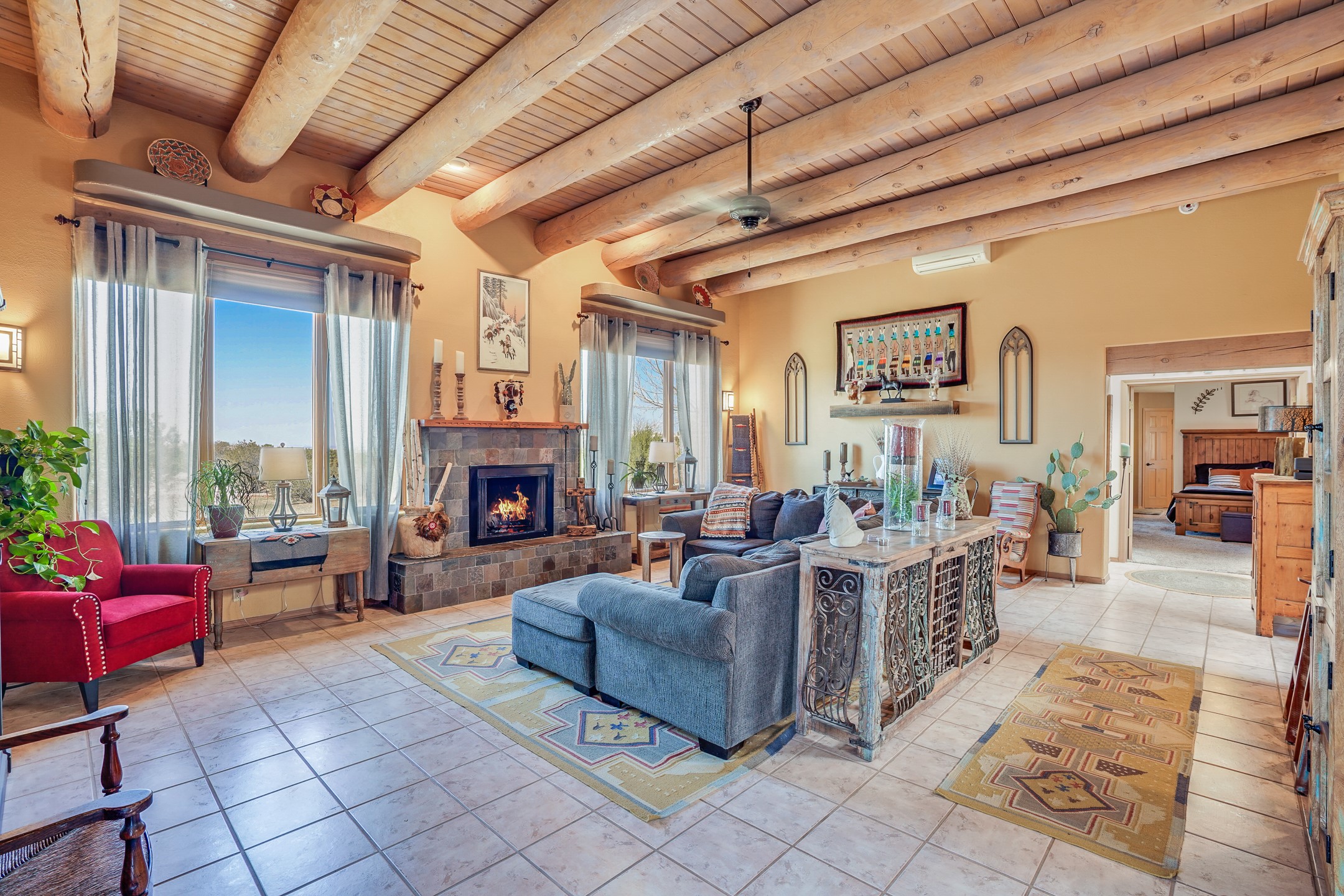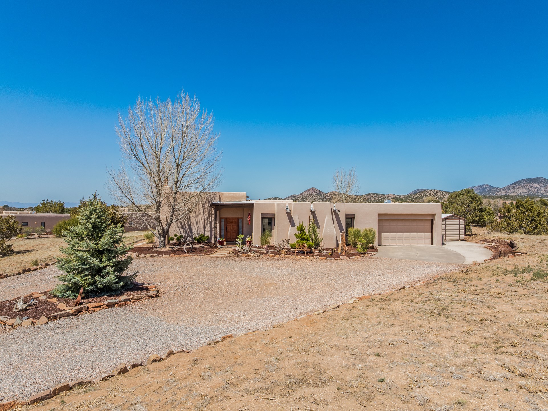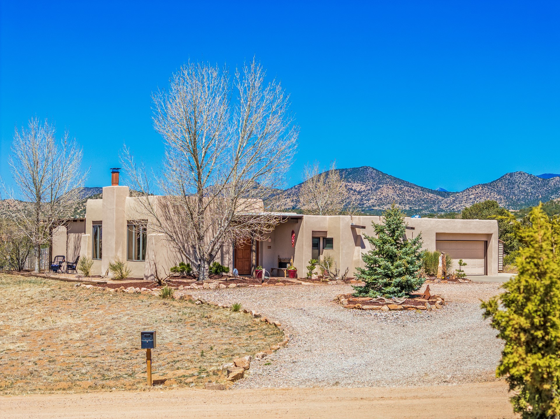 Stunning Southwestern Eldorado Gem with Views, Views, Views!Welcome to this beautifully updated and maintained 3-bedroom, 2.5-bath home with zero steps plus office on 1.38 acres of landscaped serenity. Offering incredible sunset and eastern views, this single level 2,281 sq ft property blends traditional charm with modern comfort.Enjoy outdoor living at its finest with covered portals, a walled backyard with gorgeous landscaping with views and a fenced dog run, perfect for relaxing, dining or entertaining.Step inside to a spacious living/dining area featuring tall ceilings with striking vigas, a cozy wood-burning fireplace, and view windows that bathe the home in natural light. The eat-in kitchen boasts refaced cabinets with new hardware, granite counters, gas stove, stainless steel appliances, a large pantry, and plenty of space to cook and gather!The primary suite offers a luxurious escape with Corian counters, copper sinks, extra closet storage, and a spa-like feel with access to its own outdoor sitting area to watch the brilliant Santa Fe sunsets. Comfort is ensured year-round with five mini-splits and in-floor radiant heating along with skylights throughout the home. Located just minutes from the Eldorado Community Center, local restaurants, bank, grocery store and shopping, this peaceful lot with circular driveway combines privacy, style, and comfort in a breathtaking setting--truly a must-see!
