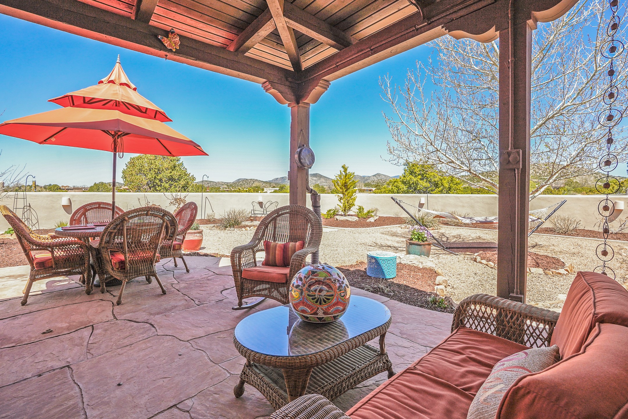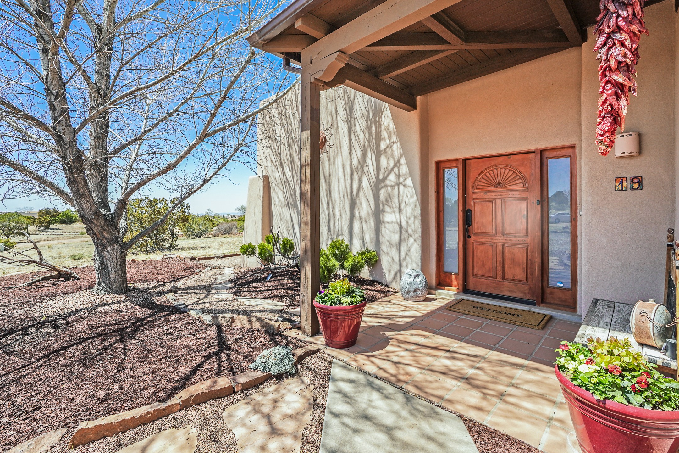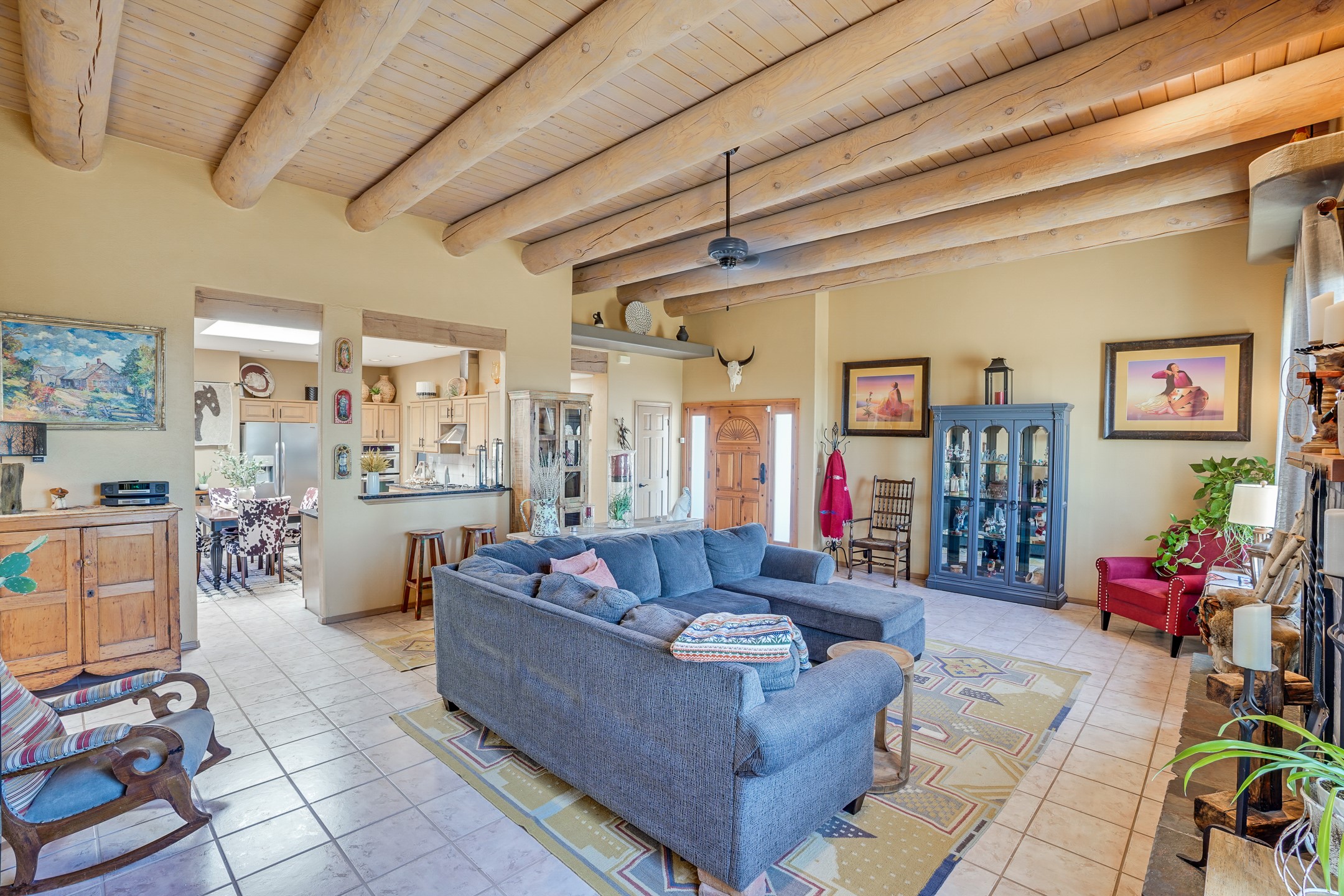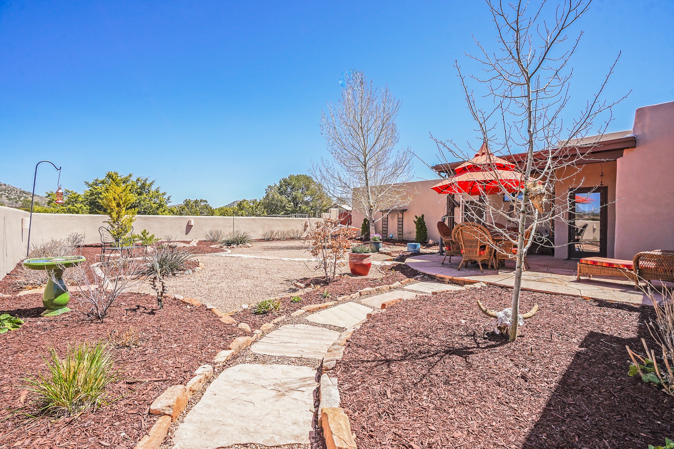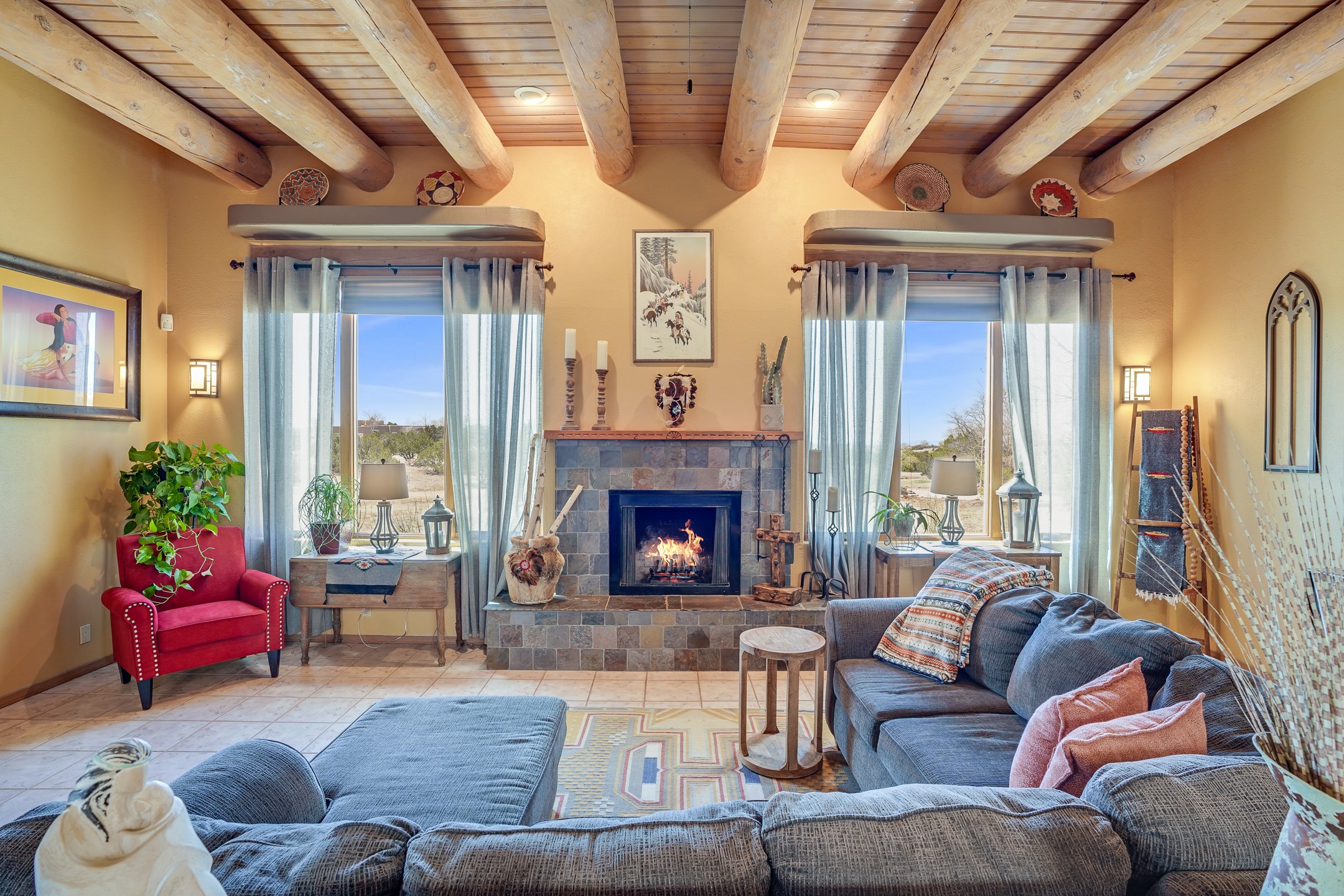 Stunning Southwestern Eldorado Gem with Views, Views, Views!Welcome to this beautifully updated and maintained 3-bedroom, 2.5-bath home with zero steps plus office on 1.38 acres of landscaped serenity. Offering incredible sunset and eastern views, this single level 2,281 sq ft property blends traditional charm with modern comfort.Enjoy outdoor living at its finest with covered portals, a walled backyard with gorgeous landscaping with views and a fenced dog run, perfect for relaxing, dining or entertaining.Step inside to a spacious living/dining area featuring tall ceilings with striking vigas, a cozy wood-burning fireplace, and view windows that bathe the home in natural light. The eat-in kitchen boasts refaced cabinets with new hardware, granite counters, gas stove, stainless steel appliances, a large pantry, and plenty of space to cook and gather!The primary suite offers a luxurious escape with Corian counters, copper sinks, extra closet storage, and a spa-like feel with access to its own outdoor sitting area to watch the brilliant Santa Fe sunsets. Comfort is ensured year-round with five mini-splits and in-floor radiant heating along with skylights throughout the home. Located just minutes from the Eldorado Community Center, local restaurants, bank, grocery store and shopping, this peaceful lot with circular driveway combines privacy, style, and comfort in a breathtaking setting--truly a must-see!