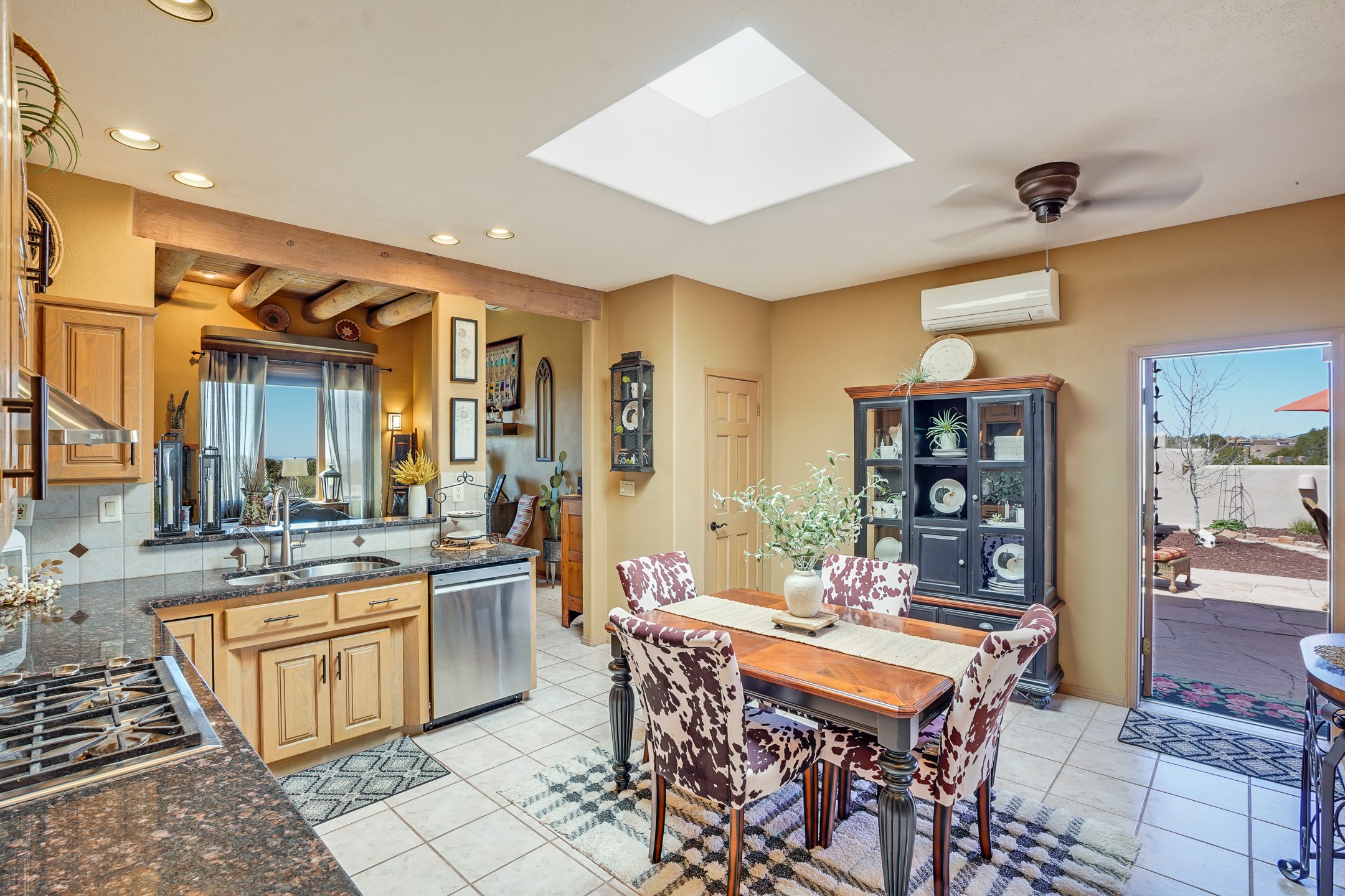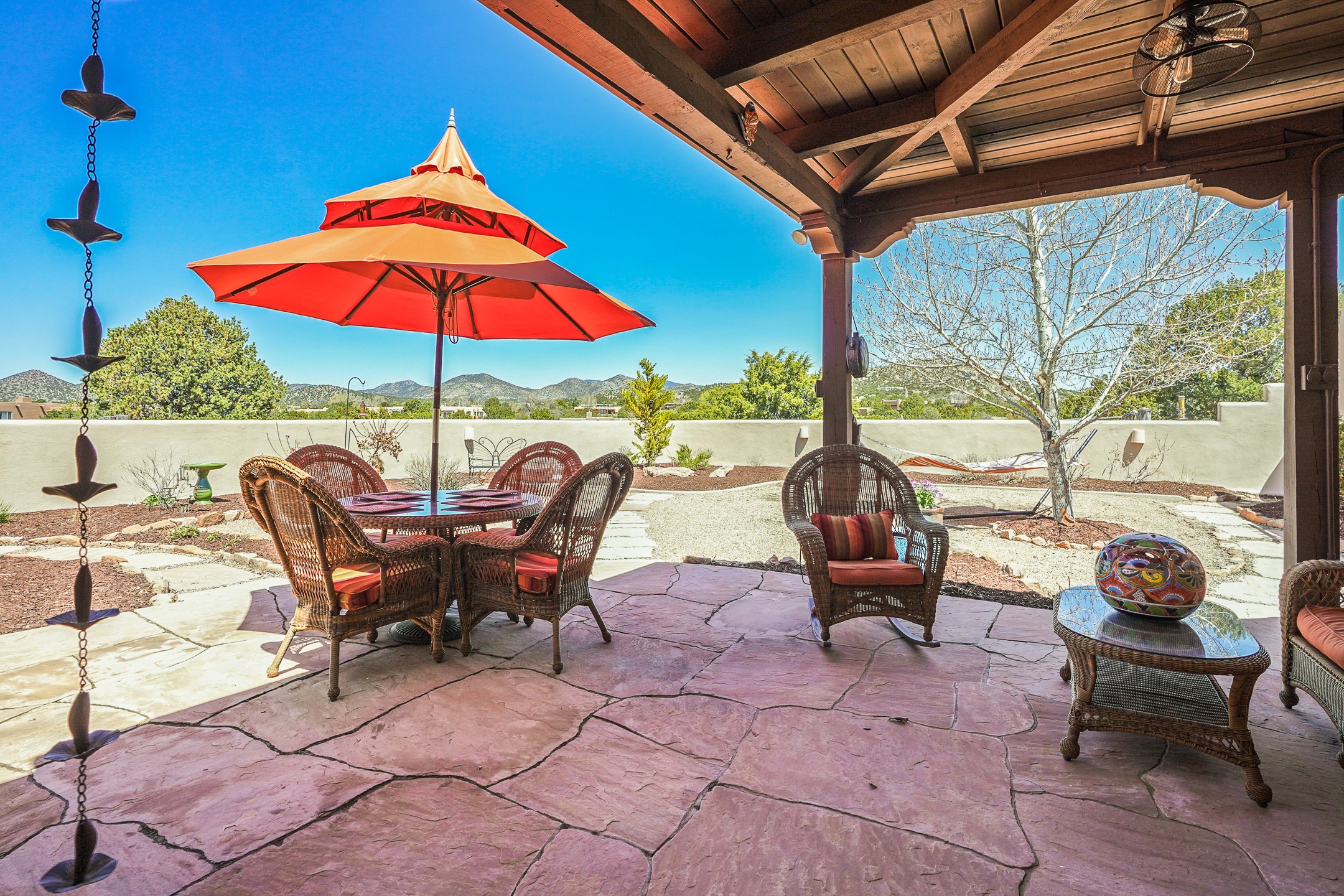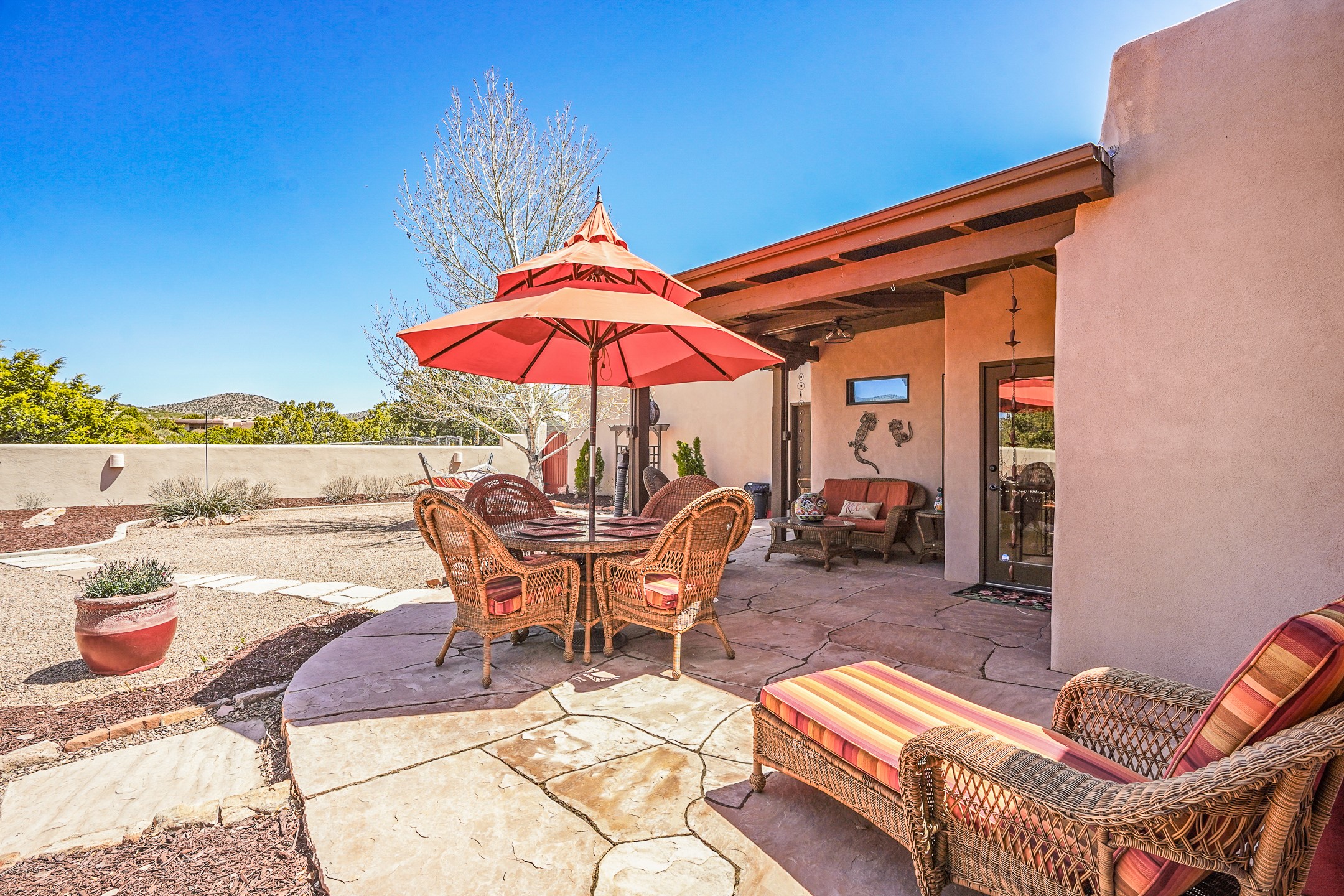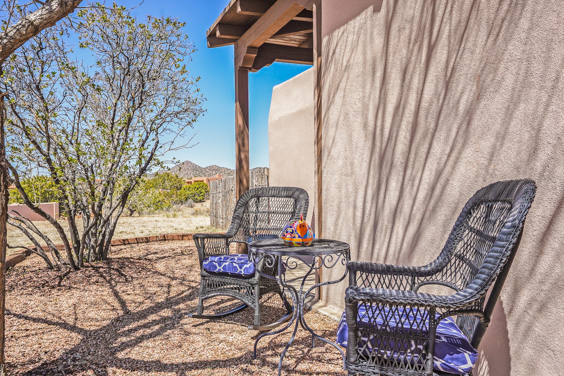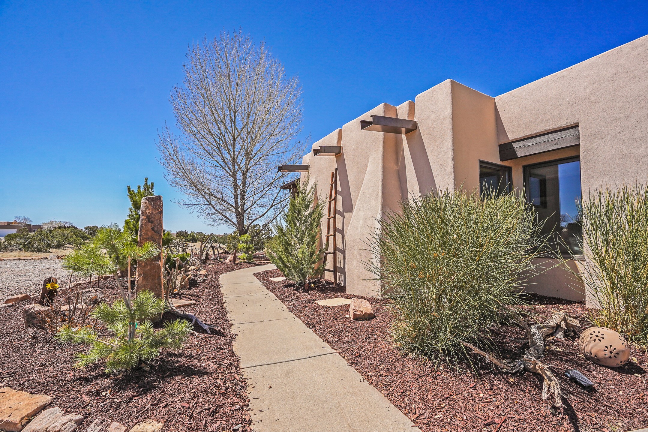Stunning Southwestern Eldorado Gem with Views, Views, Views!Welcome to this beautifully updated and maintained 3-bedroom, 2.5-bath home with zero steps plus office on 1.38 acres of landscaped serenity. Offering incredible sunset and eastern views, this single level 2,281 sq ft property blends traditional charm with modern comfort.Enjoy outdoor living at its finest with covered portals, a walled backyard with gorgeous landscaping with views and a fenced dog run, perfect for relaxing, dining or entertaining.Step inside to a spacious living/dining area featuring tall ceilings with striking vigas, a cozy wood-burning fireplace, and view windows that bathe the home in natural light. The eat-in kitchen boasts refaced cabinets with new hardware, granite counters, gas stove, stainless steel appliances, a large pantry, and plenty of space to cook and gather!The primary suite offers a luxurious escape with Corian counters, copper sinks, extra closet storage, and a spa-like feel with access to its own outdoor sitting area to watch the brilliant Santa Fe sunsets. Comfort is ensured year-round with five mini-splits and in-floor radiant heating along with skylights throughout the home. Located just minutes from the Eldorado Community Center, local restaurants, bank, grocery store and shopping, this peaceful lot with circular driveway combines privacy, style, and comfort in a breathtaking setting--truly a must-see!