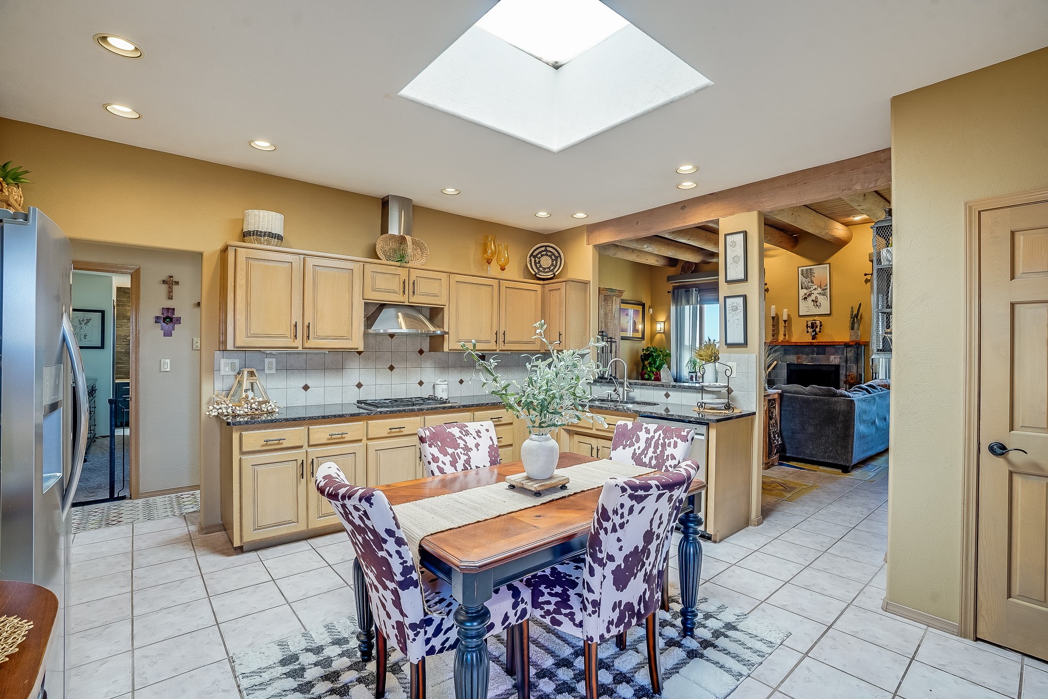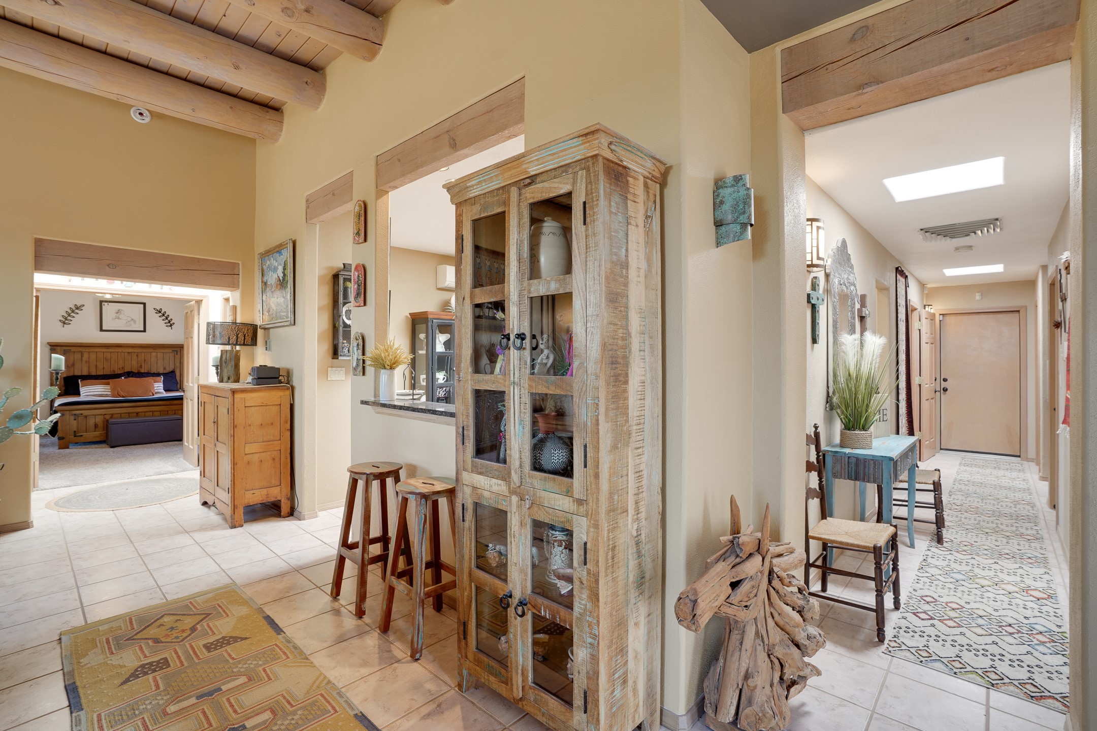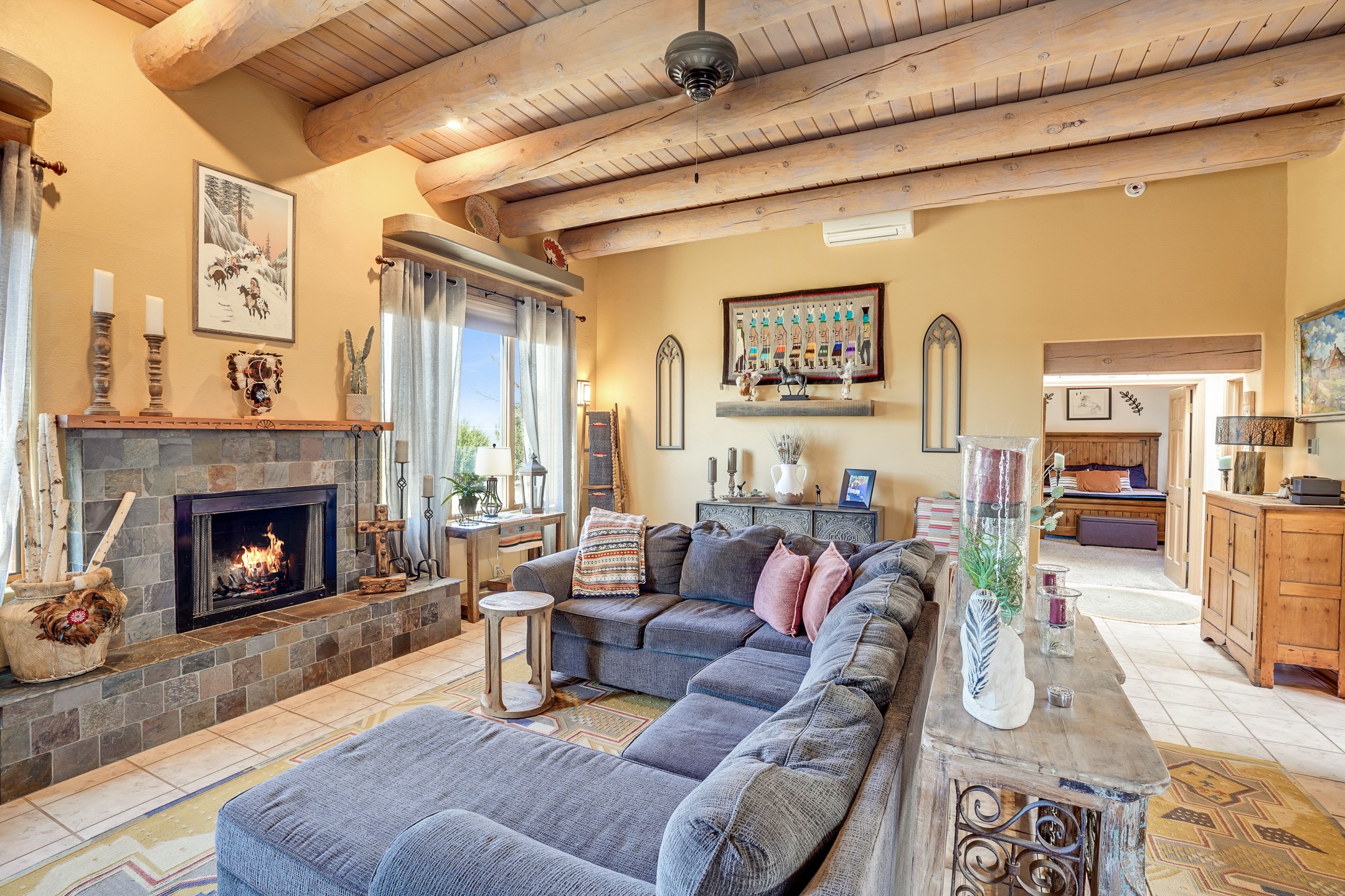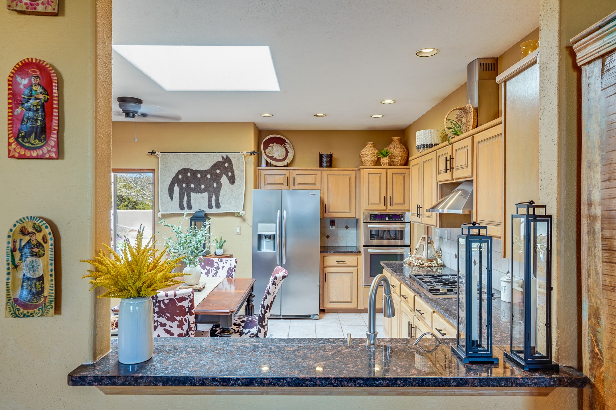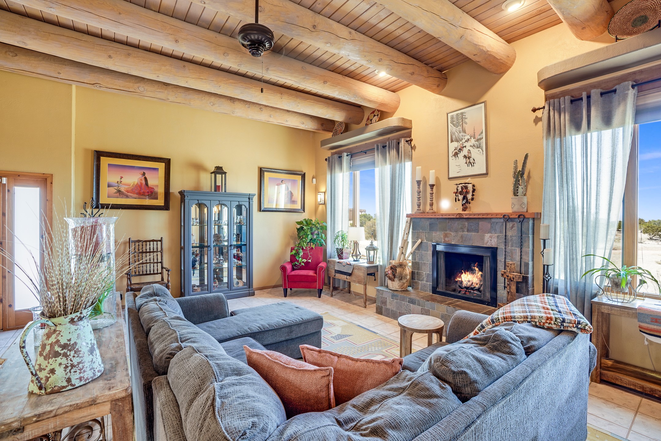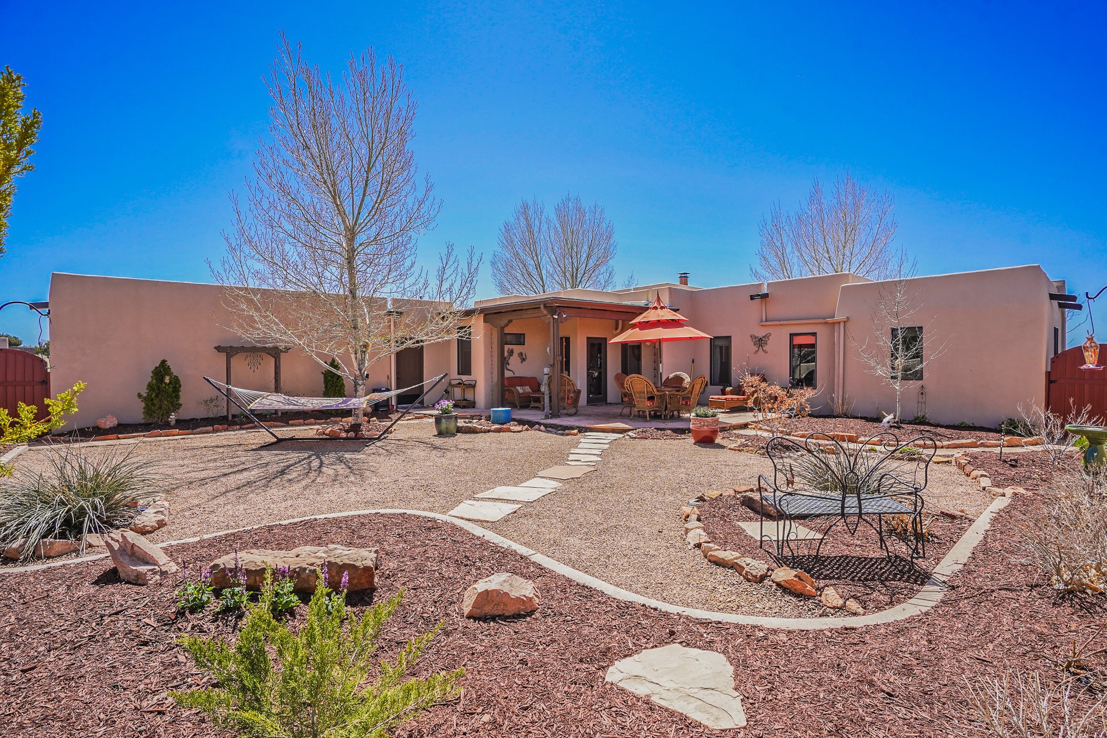 Stunning Southwestern Eldorado Gem with Views, Views, Views!Welcome to this beautifully updated and maintained 3-bedroom, 2.5-bath home with zero steps plus office on 1.38 acres of landscaped serenity. Offering incredible sunset and eastern views, this single level 2,281 sq ft property blends traditional charm with modern comfort.Enjoy outdoor living at its finest with covered portals, a walled backyard with gorgeous landscaping with views and a fenced dog run, perfect for relaxing, dining or entertaining.Step inside to a spacious living/dining area featuring tall ceilings with striking vigas, a cozy wood-burning fireplace, and view windows that bathe the home in natural light. The eat-in kitchen boasts refaced cabinets with new hardware, granite counters, gas stove, stainless steel appliances, a large pantry, and plenty of space to cook and gather!The primary suite offers a luxurious escape with Corian counters, copper sinks, extra closet storage, and a spa-like feel with access to its own outdoor sitting area to watch the brilliant Santa Fe sunsets. Comfort is ensured year-round with five mini-splits and in-floor radiant heating along with skylights throughout the home. Located just minutes from the Eldorado Community Center, local restaurants, bank, grocery store and shopping, this peaceful lot with circular driveway combines privacy, style, and comfort in a breathtaking setting--truly a must-see!