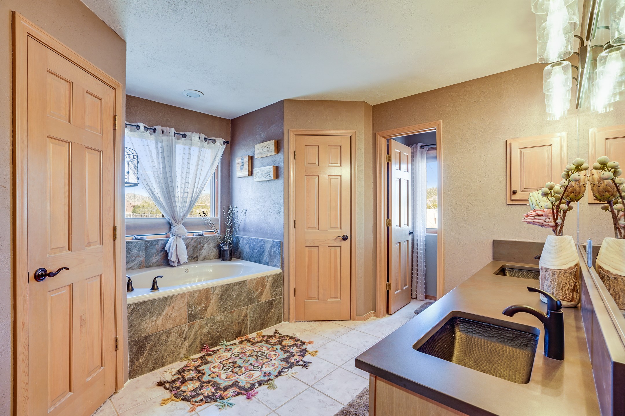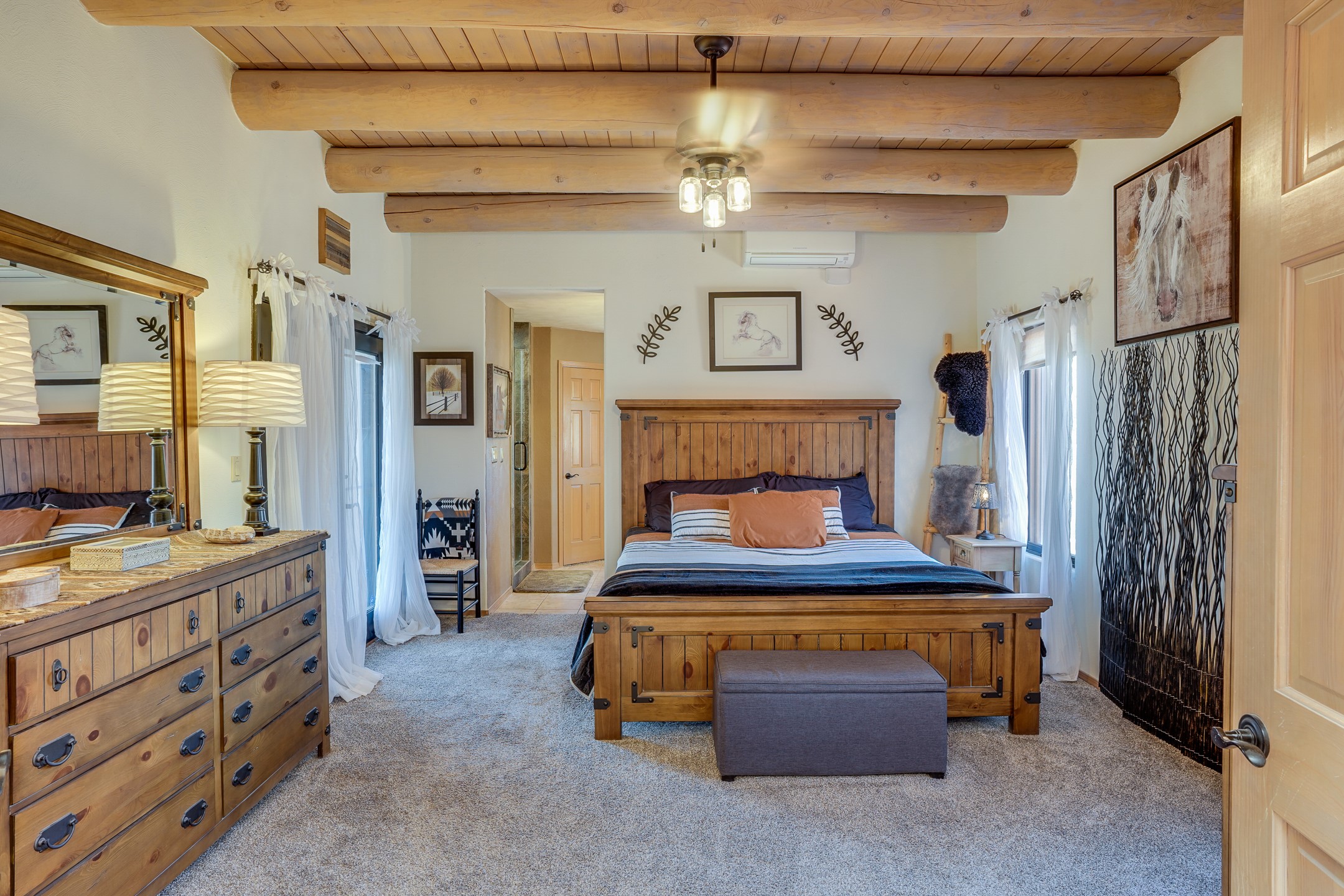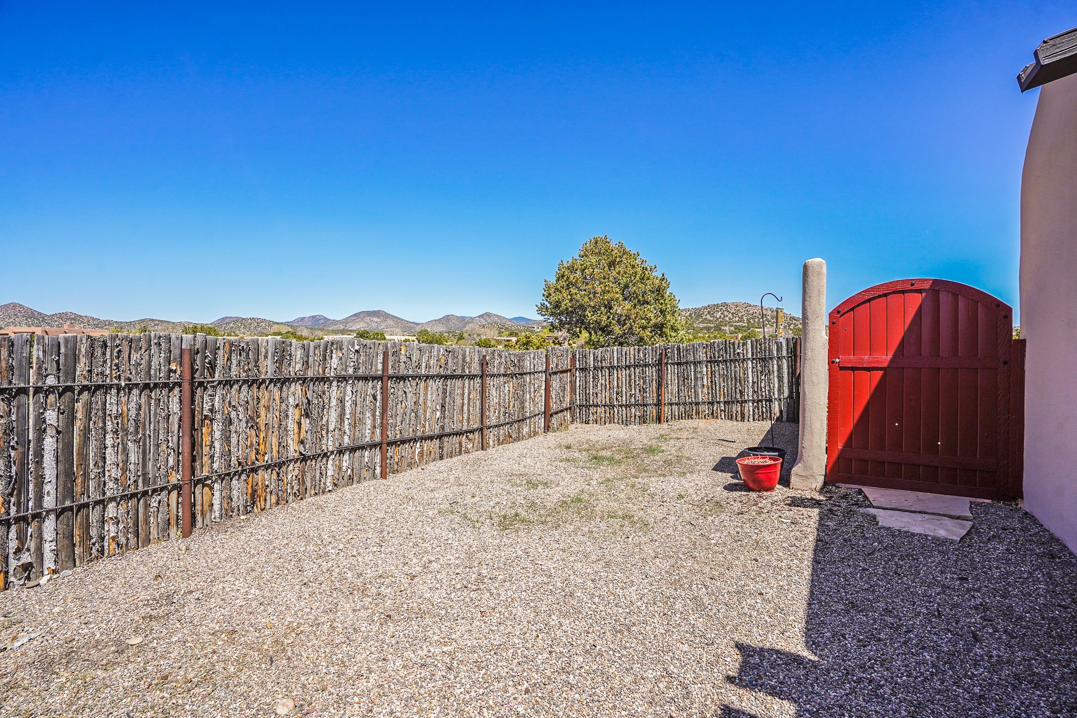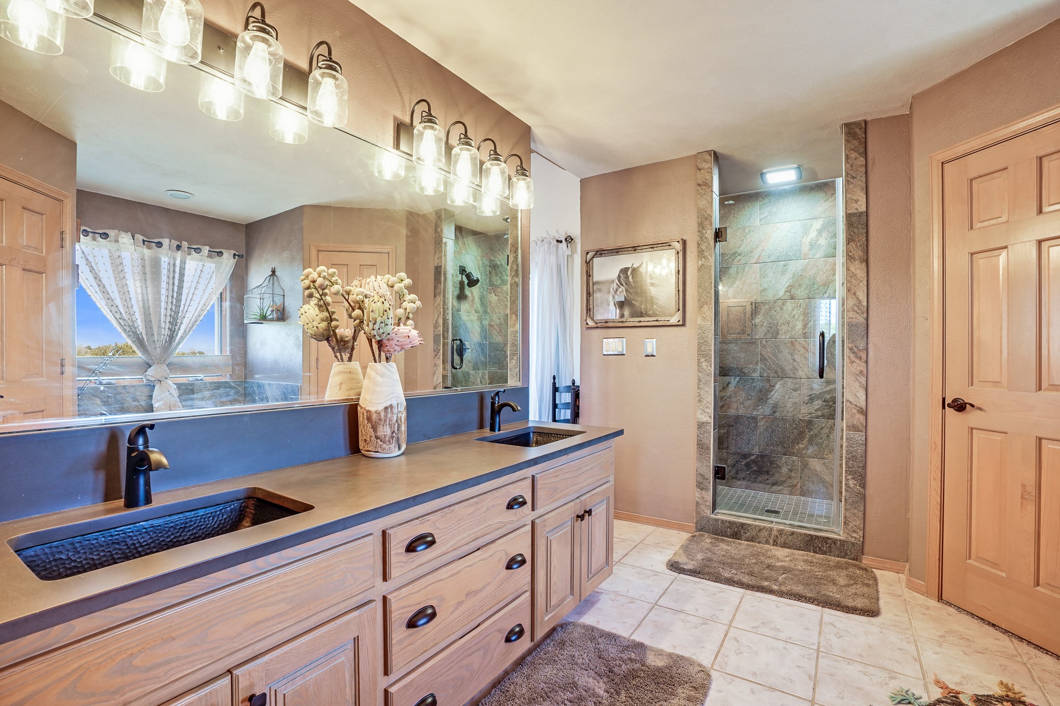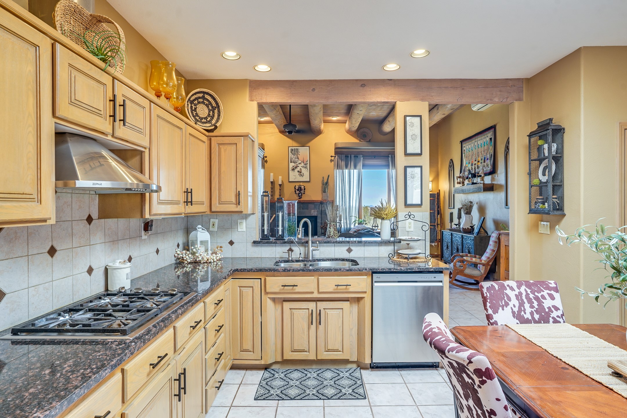 Stunning Southwestern Eldorado Gem with Views, Views, Views!Welcome to this beautifully updated and maintained 3-bedroom, 2.5-bath home with zero steps plus office on 1.38 acres of landscaped serenity. Offering incredible sunset and eastern views, this single level 2,281 sq ft property blends traditional charm with modern comfort.Enjoy outdoor living at its finest with covered portals, a walled backyard with gorgeous landscaping with views and a fenced dog run, perfect for relaxing, dining or entertaining.Step inside to a spacious living/dining area featuring tall ceilings with striking vigas, a cozy wood-burning fireplace, and view windows that bathe the home in natural light. The eat-in kitchen boasts refaced cabinets with new hardware, granite counters, gas stove, stainless steel appliances, a large pantry, and plenty of space to cook and gather!The primary suite offers a luxurious escape with Corian counters, copper sinks, extra closet storage, and a spa-like feel with access to its own outdoor sitting area to watch the brilliant Santa Fe sunsets. Comfort is ensured year-round with five mini-splits and in-floor radiant heating along with skylights throughout the home. Located just minutes from the Eldorado Community Center, local restaurants, bank, grocery store and shopping, this peaceful lot with circular driveway combines privacy, style, and comfort in a breathtaking setting--truly a must-see!