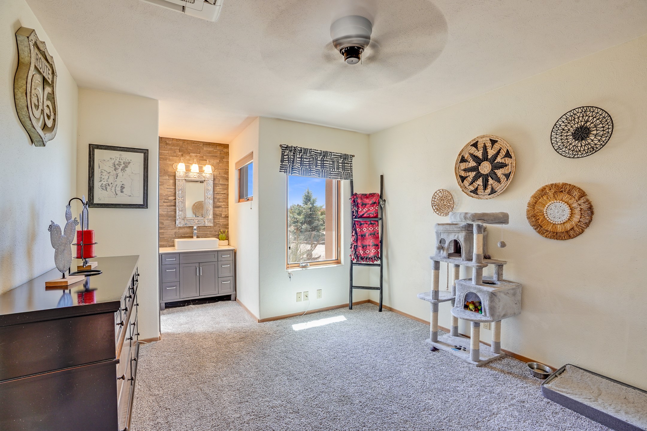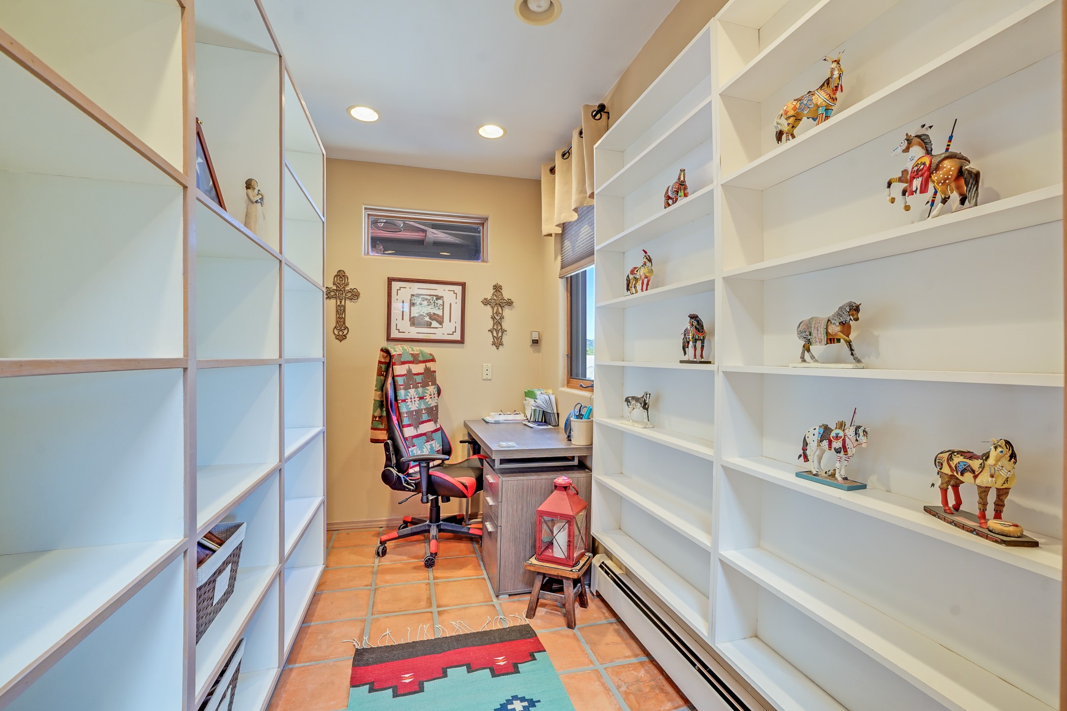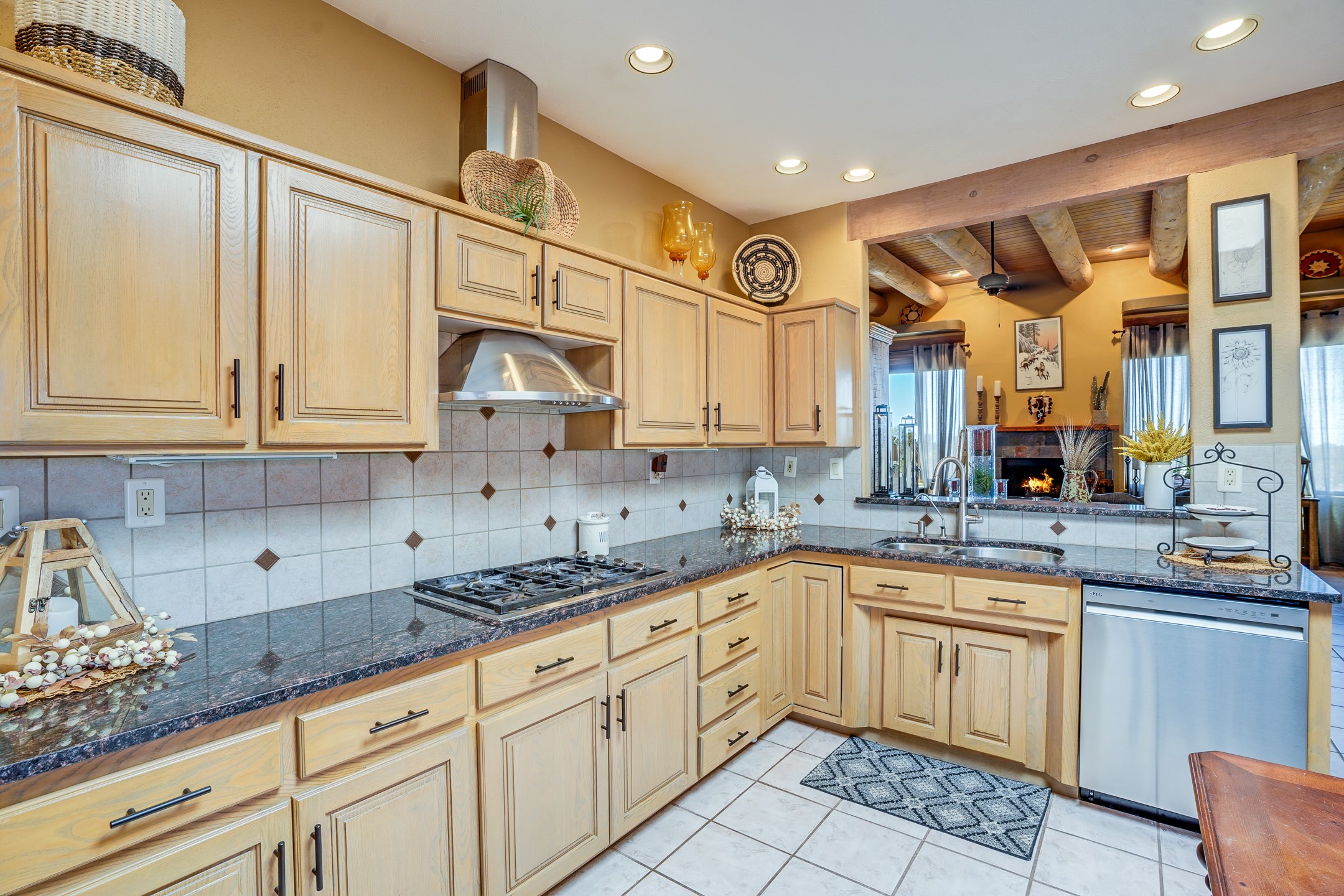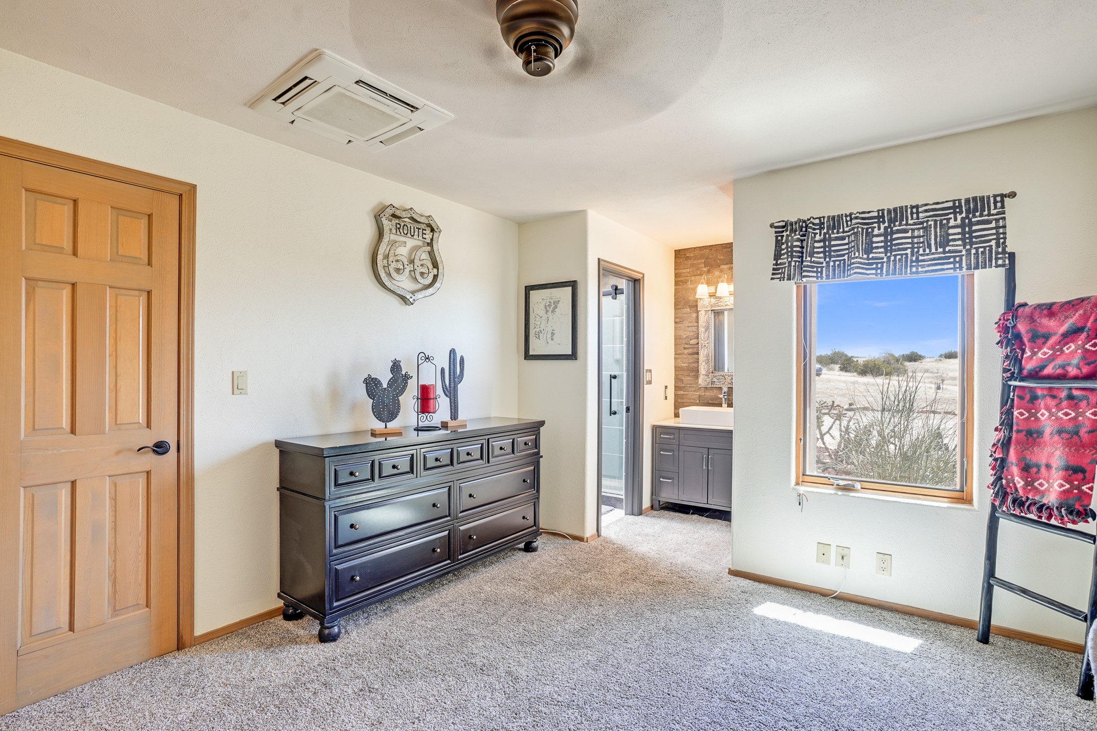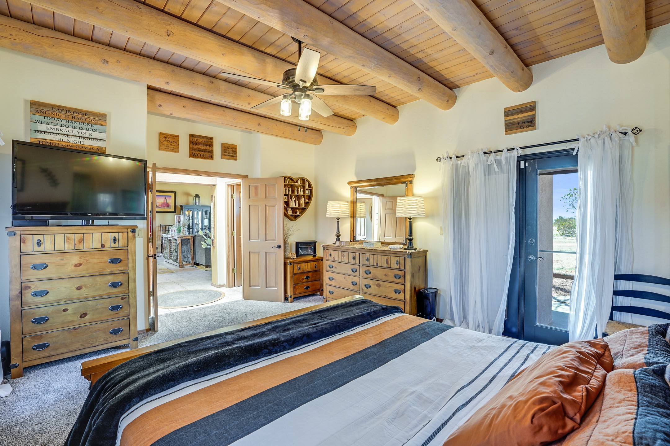 Stunning Southwestern Eldorado Gem with Views, Views, Views!Welcome to this beautifully updated and maintained 3-bedroom, 2.5-bath home with zero steps plus office on 1.38 acres of landscaped serenity. Offering incredible sunset and eastern views, this single level 2,281 sq ft property blends traditional charm with modern comfort.Enjoy outdoor living at its finest with covered portals, a walled backyard with gorgeous landscaping with views and a fenced dog run, perfect for relaxing, dining or entertaining.Step inside to a spacious living/dining area featuring tall ceilings with striking vigas, a cozy wood-burning fireplace, and view windows that bathe the home in natural light. The eat-in kitchen boasts refaced cabinets with new hardware, granite counters, gas stove, stainless steel appliances, a large pantry, and plenty of space to cook and gather!The primary suite offers a luxurious escape with Corian counters, copper sinks, extra closet storage, and a spa-like feel with access to its own outdoor sitting area to watch the brilliant Santa Fe sunsets. Comfort is ensured year-round with five mini-splits and in-floor radiant heating along with skylights throughout the home. Located just minutes from the Eldorado Community Center, local restaurants, bank, grocery store and shopping, this peaceful lot with circular driveway combines privacy, style, and comfort in a breathtaking setting--truly a must-see!