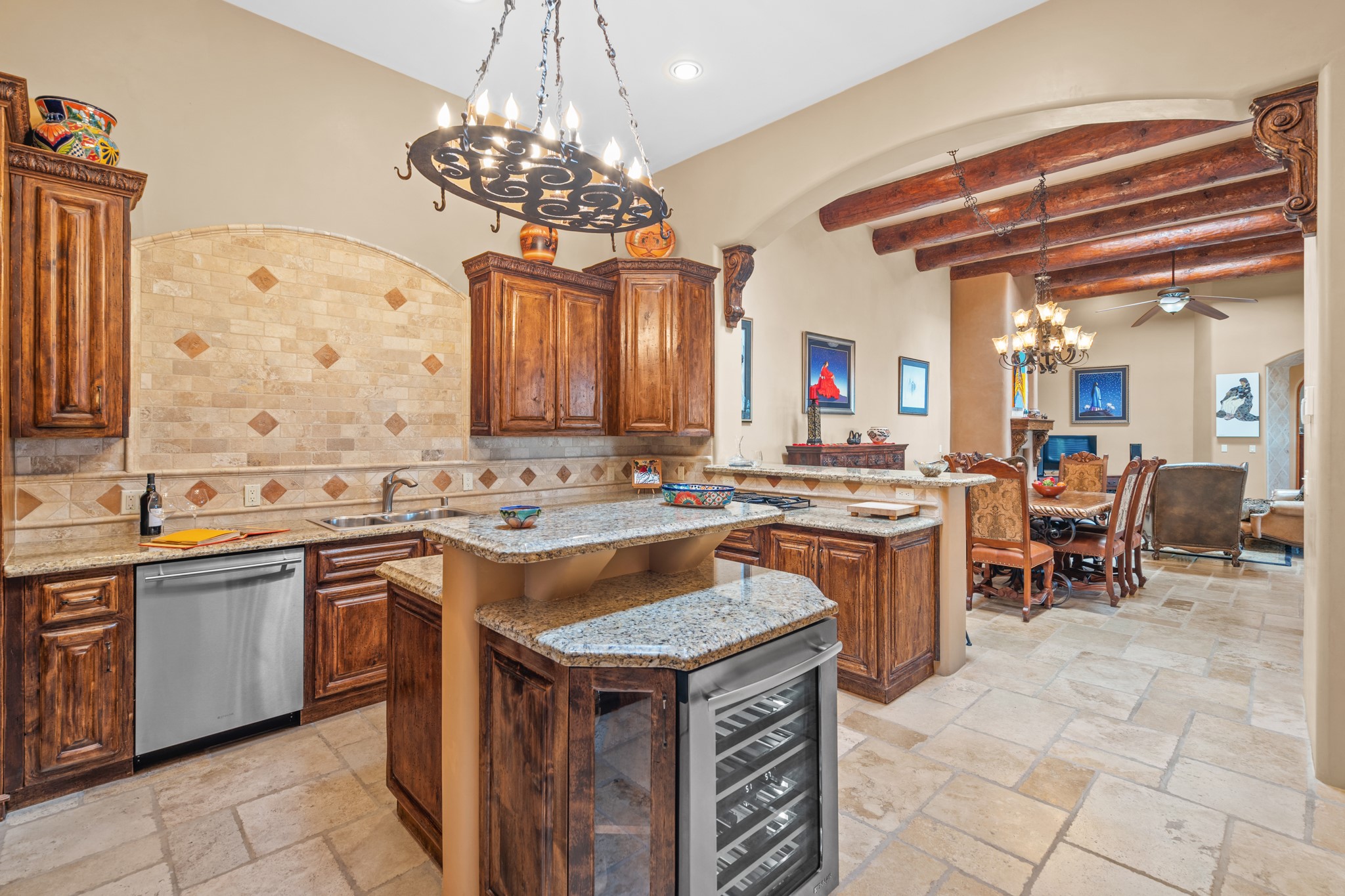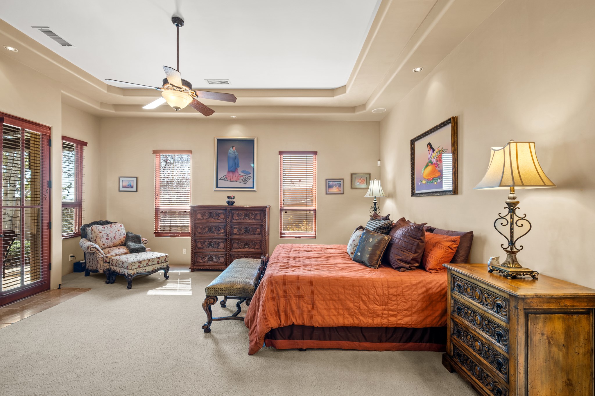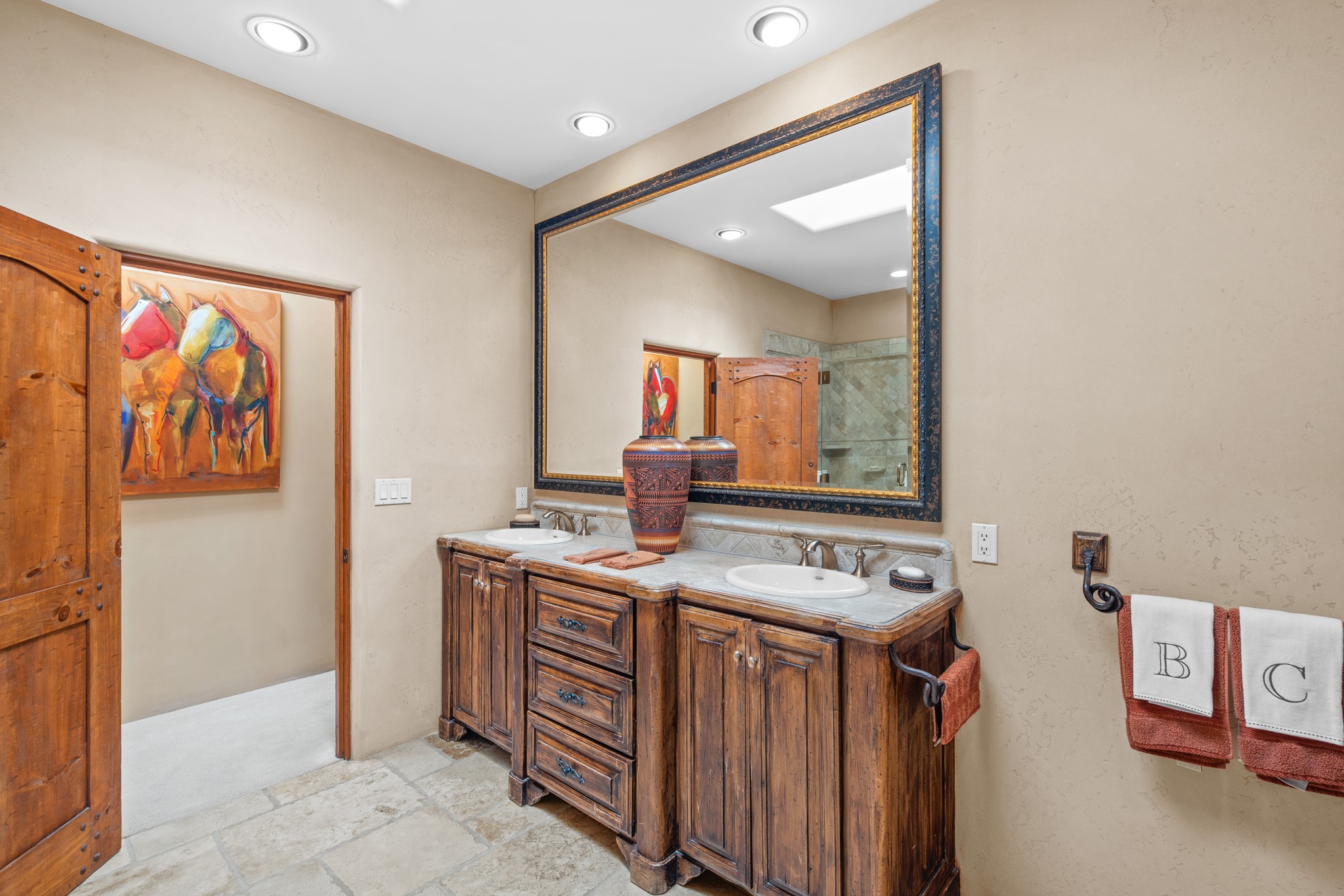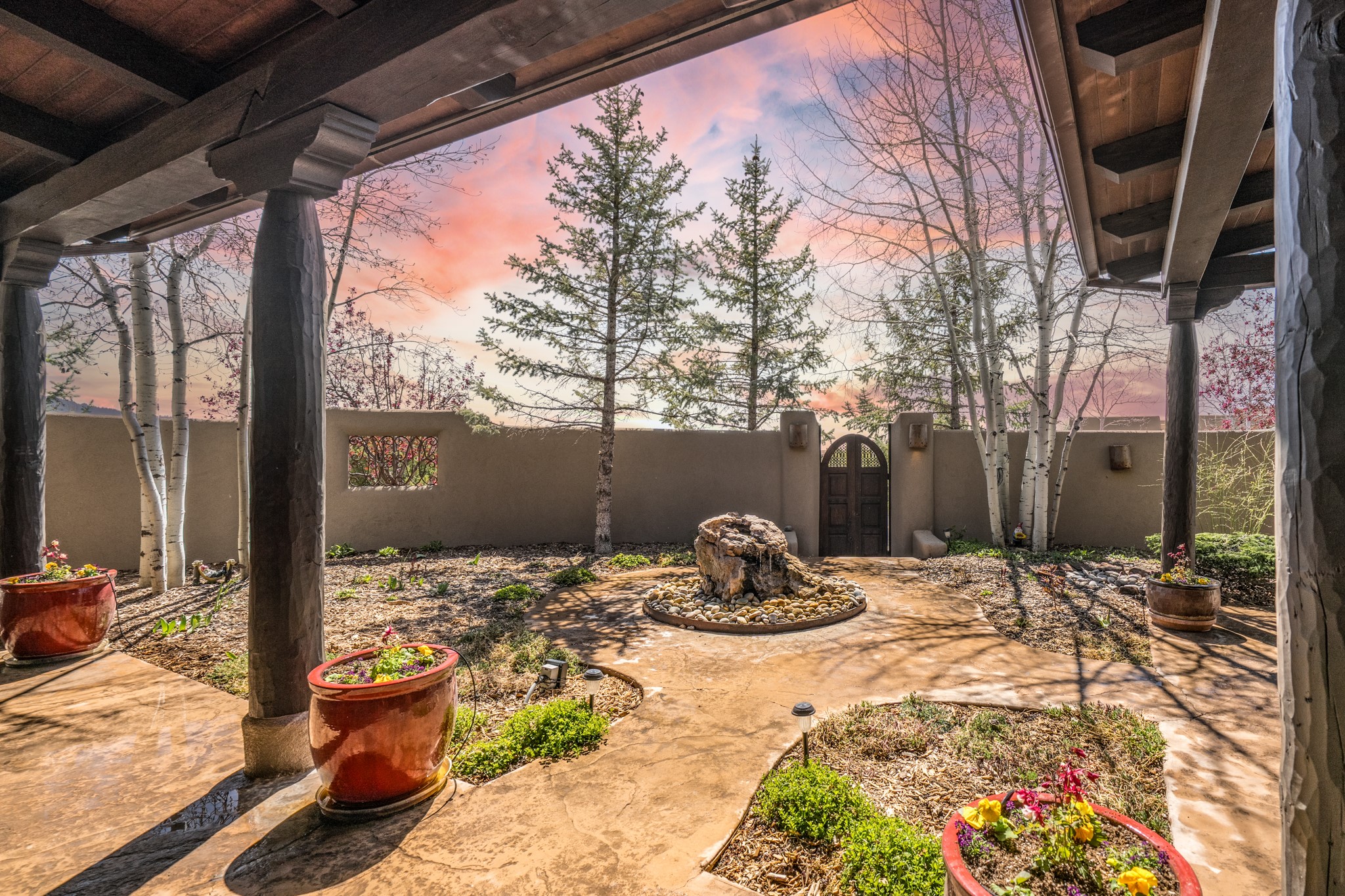 Discover this amazing single-level home with a detached guest house nestled in the serene community of Aldea. Located on a quiet cul-de-sac, this property welcomes you home with a charming enclosed courtyard and fountain, leading into a light-filled, open-concept floor plan that's perfect for both relaxing and entertaining. Enjoy breathtaking sunset views from the covered portals, or cozy up by one of the two gas fireplaces. The home features vaulted ceilings, beautiful travertine tile, and handcrafted wood doors and cabinetry imported from Mexico. The chef's kitchen is a dream, complete with a pantry, wine cooler, and plenty of space for culinary creativity. Each bedroom is ensuite with its own bathroom and walk-in closet, offering great separation and privacy. Just minutes from downtown, the neighborhood offers quiet charm, walking and hiking paths, a tennis court, a basketball court, and regular HOA-hosted events. With peaceful open spaces, wildlife, and a strong sense of community, this home truly has it all.