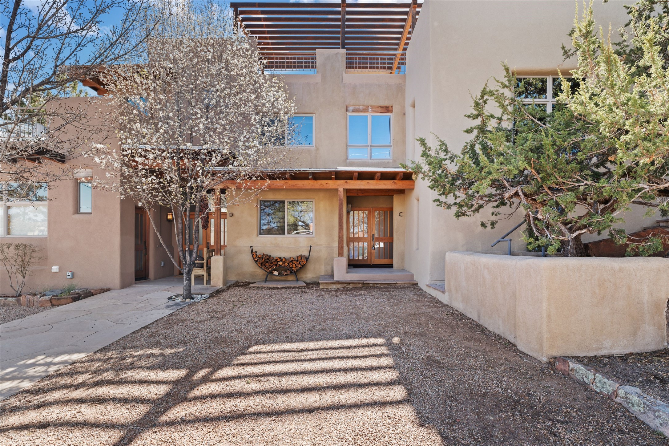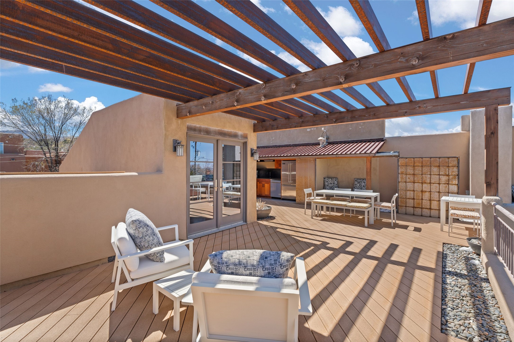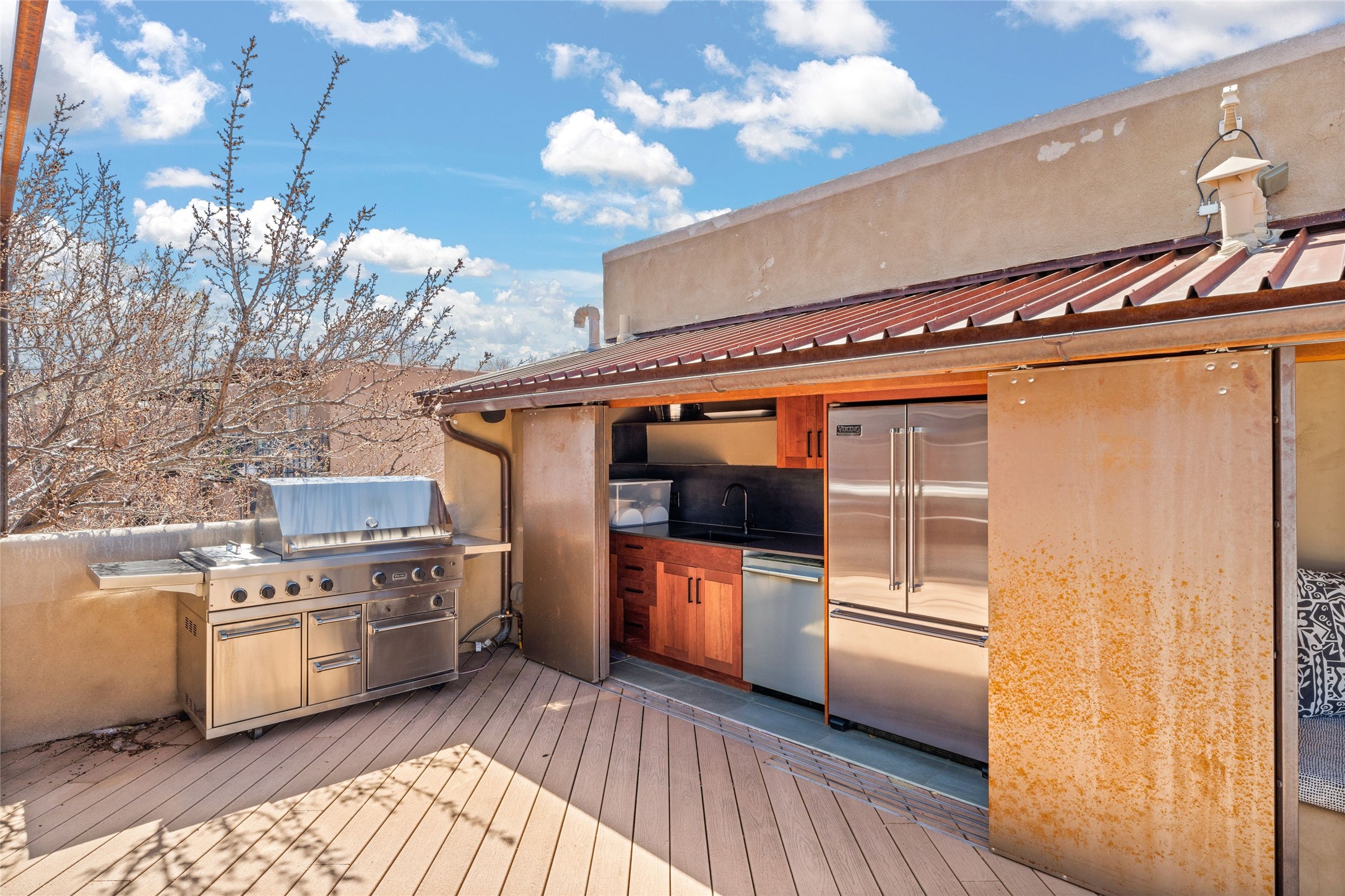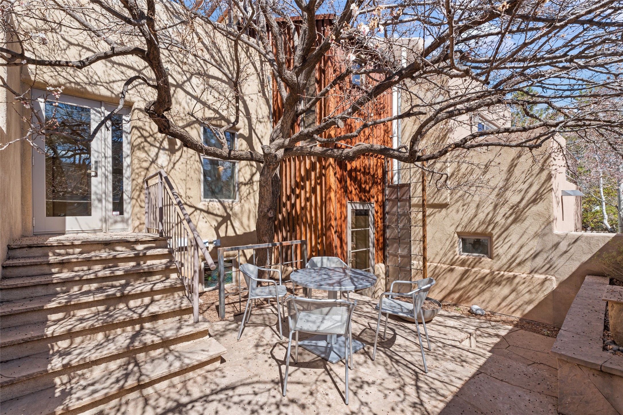 Have you been dreaming of a roof top garden deck where you can live alfresco with full kitchen (including dishwasher!), cozy gas fire pit and a sleeping spot under the stars? With views of sunrise over the Sangres, and sunsets behind the Jemez, and just three blocks from the Plaza, this is the icing on the cake of this cool soft contemporary 2 bedroom, 2,023 square foot condo. With two bedroom suites (one with a steam shower), bamboo floors and Ikea closet systems, this multi-level condo has nice bedroom separation and a very private walled patio off one, shaded by an ancient apricot tree. The living room enjoys a soaring 20 foot ceiling with beams, a fireplace, polished concrete floors, and has a wonderful open feel with the kitchen and dining areas. The kitchen has Cambria quartz counters, stainless appliances and great storage. All this, while being a handy run up to the ski basin and hiking trails, or a short walk to Ft. Marcy or downtown.