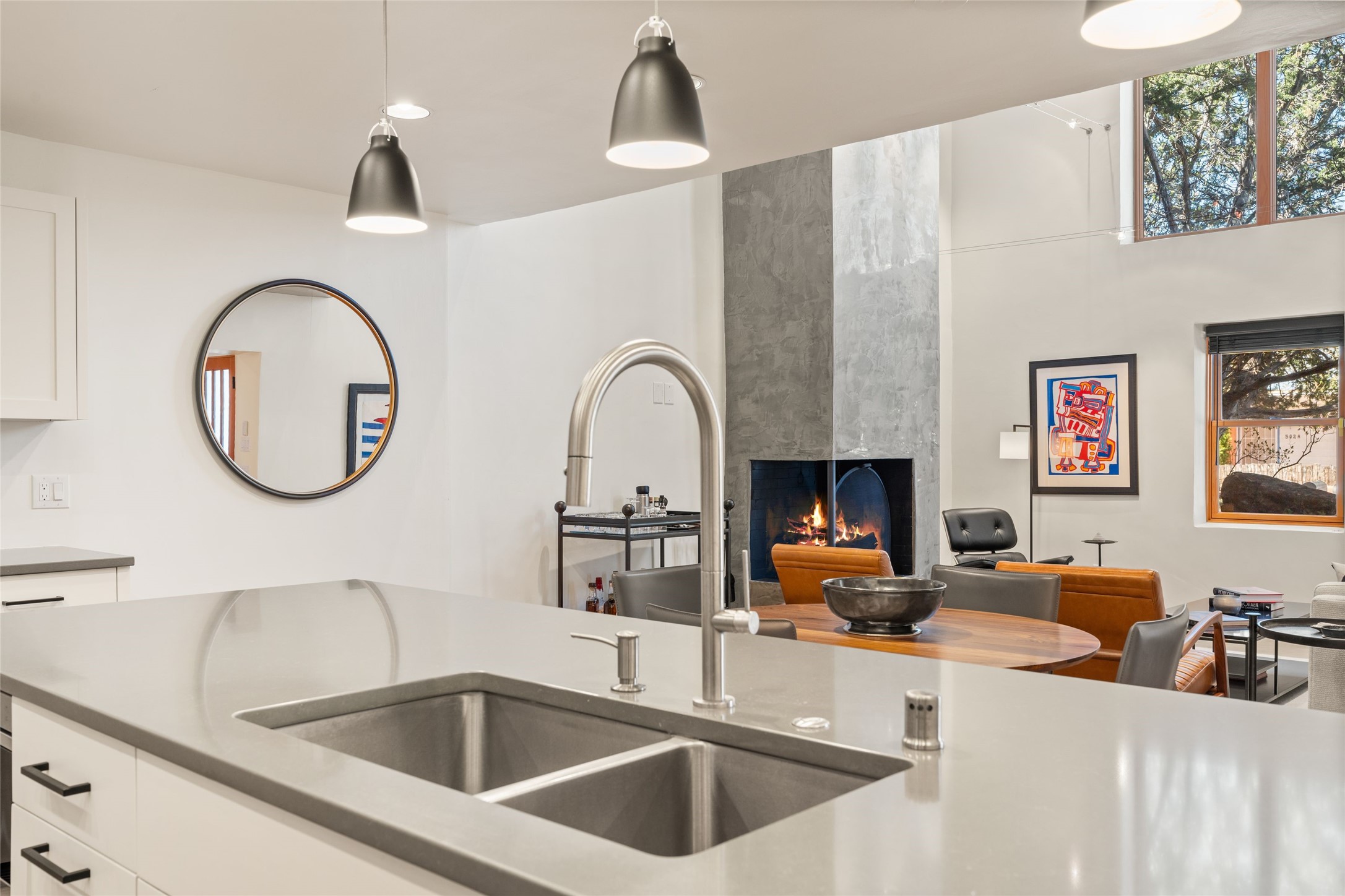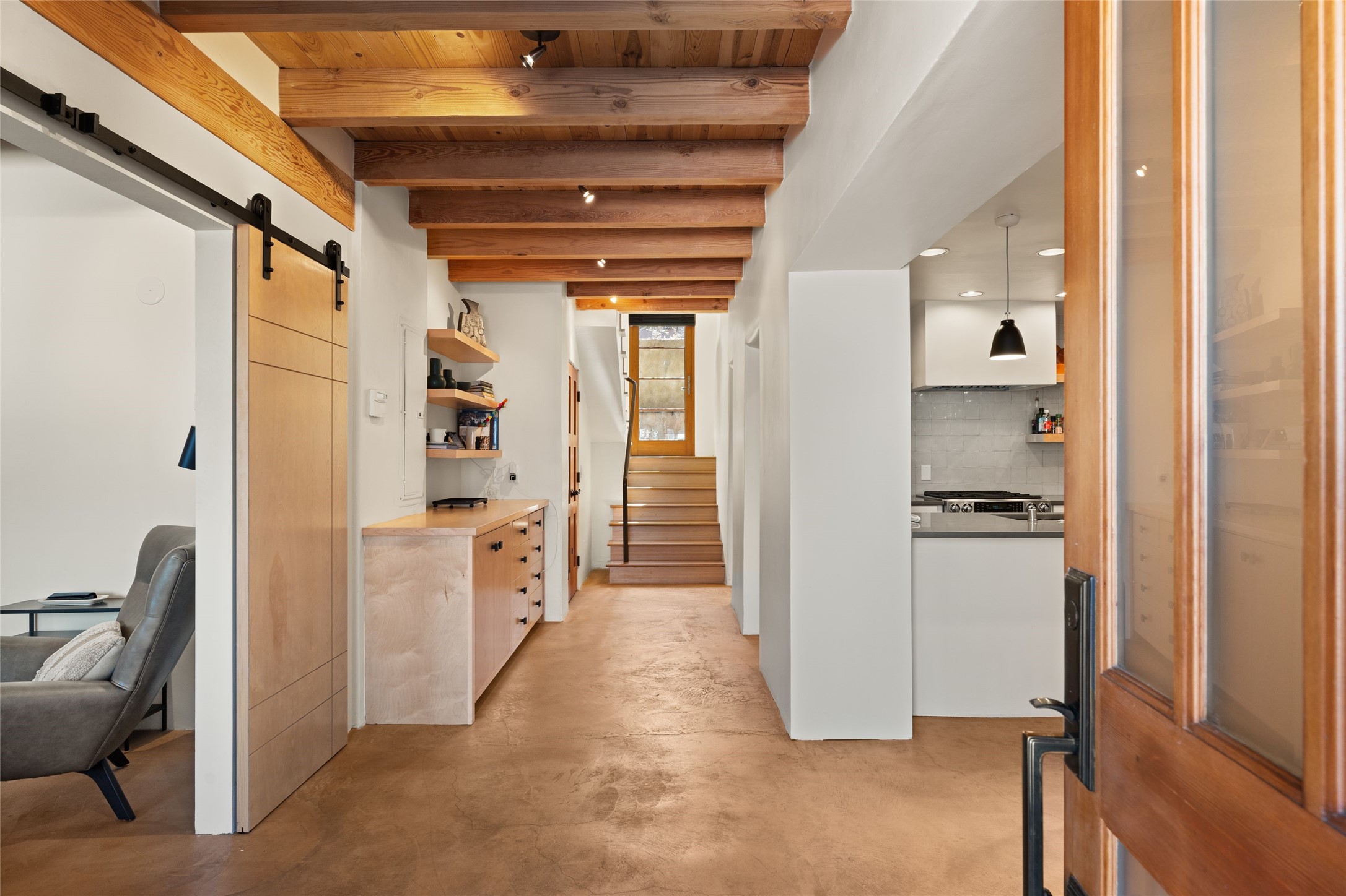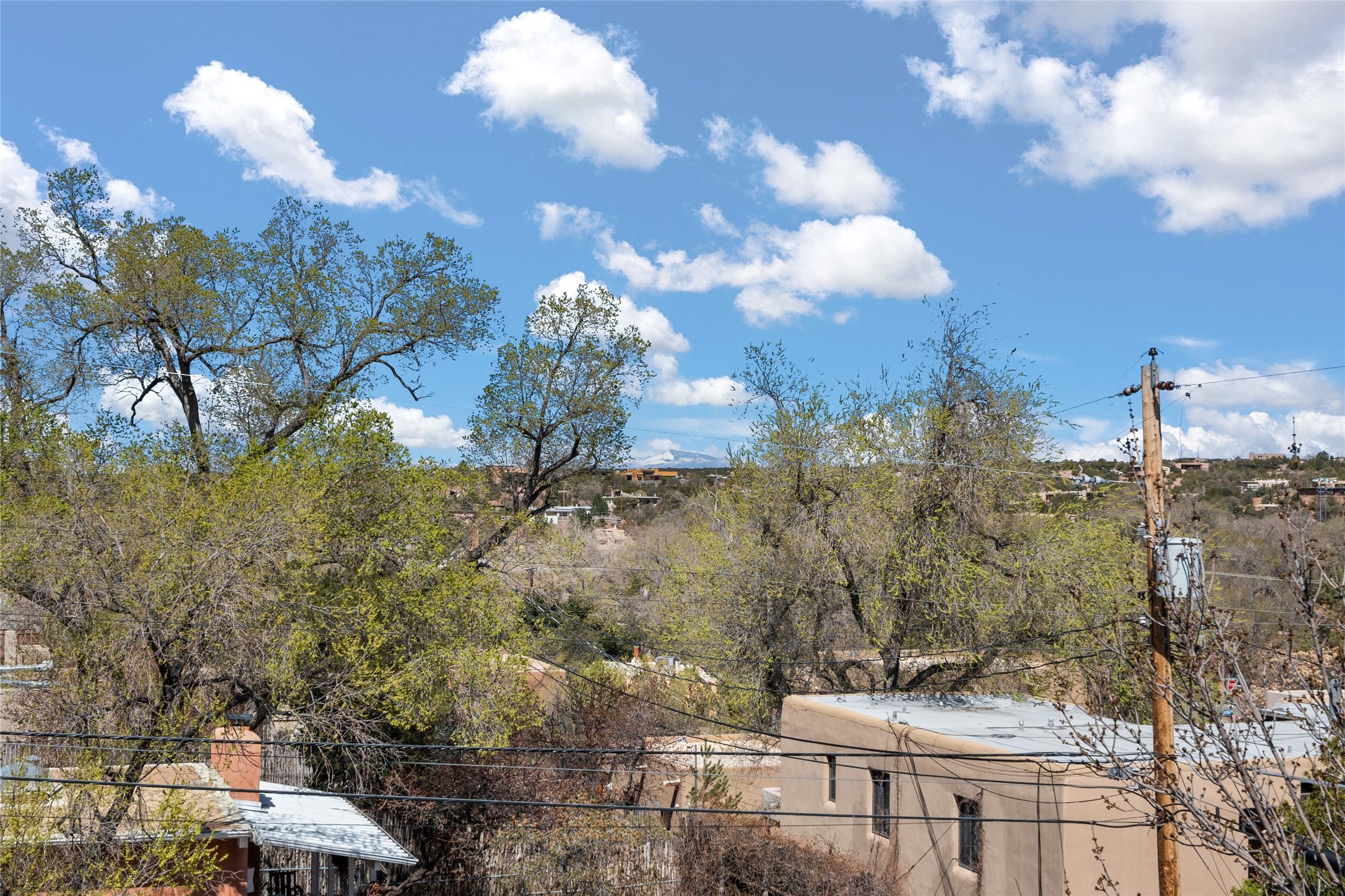Have you been dreaming of a roof top garden deck where you can live alfresco with full kitchen (including dishwasher!), cozy gas fire pit and a sleeping spot under the stars? With views of sunrise over the Sangres, and sunsets behind the Jemez, and just three blocks from the Plaza, this is the icing on the cake of this cool soft contemporary 2 bedroom, 2,023 square foot condo. With two bedroom suites (one with a steam shower), bamboo floors and Ikea closet systems, this multi-level condo has nice bedroom separation and a very private walled patio off one, shaded by an ancient apricot tree. The living room enjoys a soaring 20 foot ceiling with beams, a fireplace, polished concrete floors, and has a wonderful open feel with the kitchen and dining areas. The kitchen has Cambria quartz counters, stainless appliances and great storage. All this, while being a handy run up to the ski basin and hiking trails, or a short walk to Ft. Marcy or downtown.