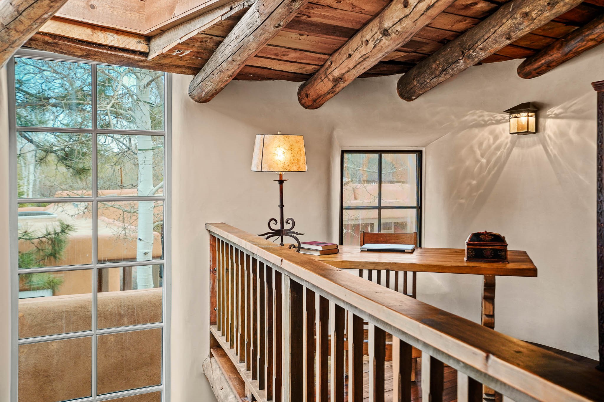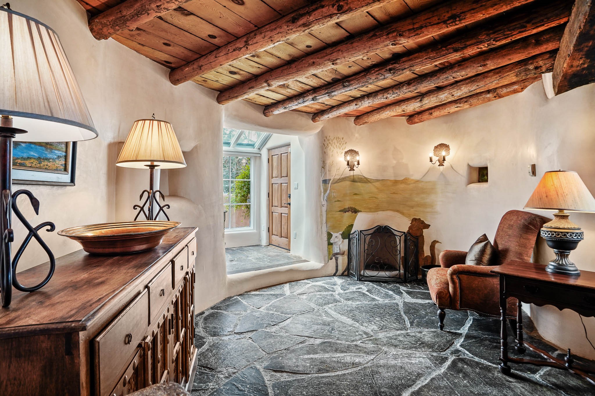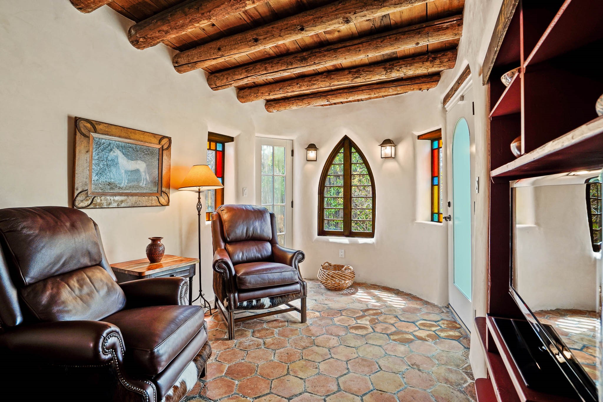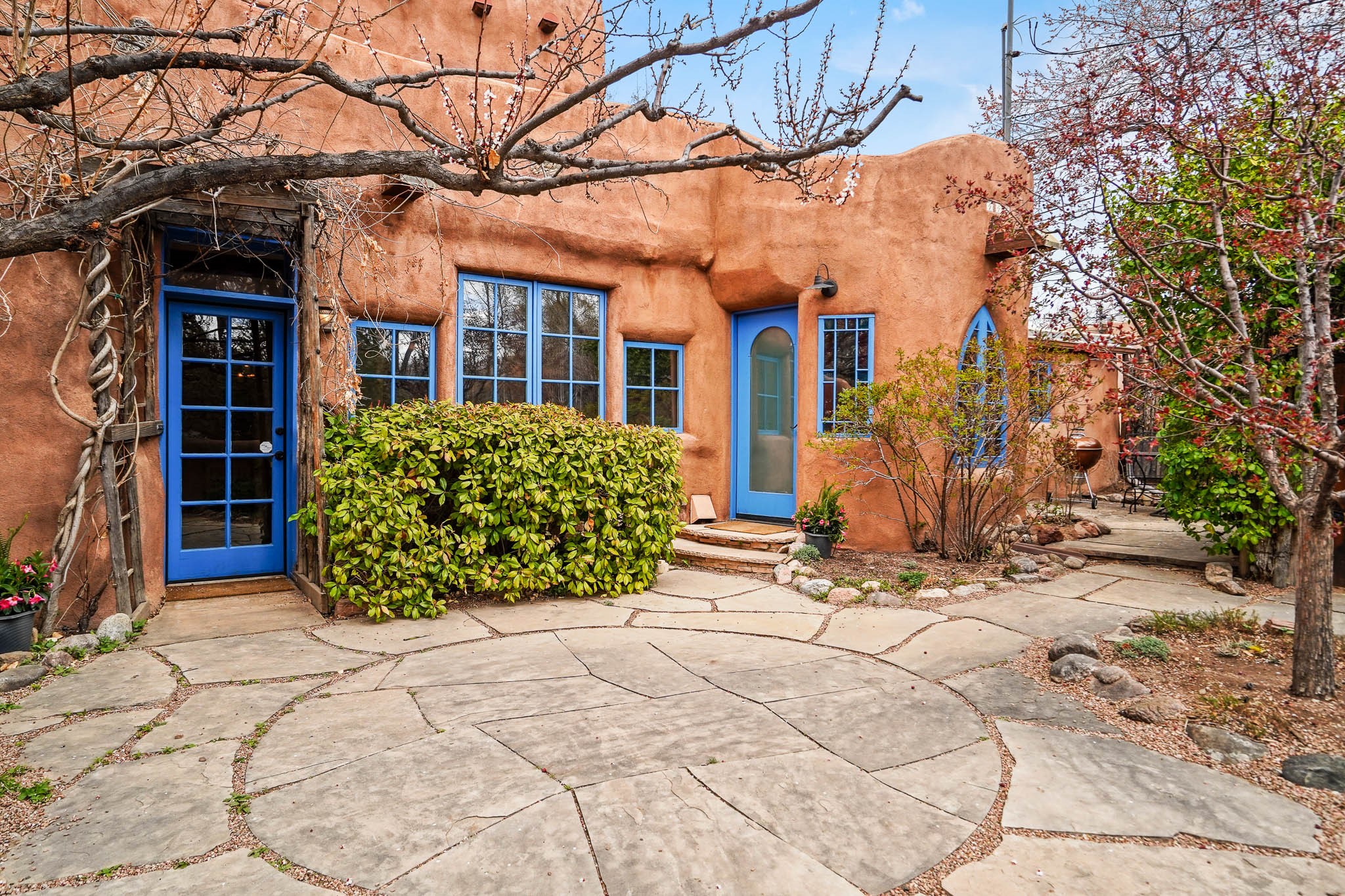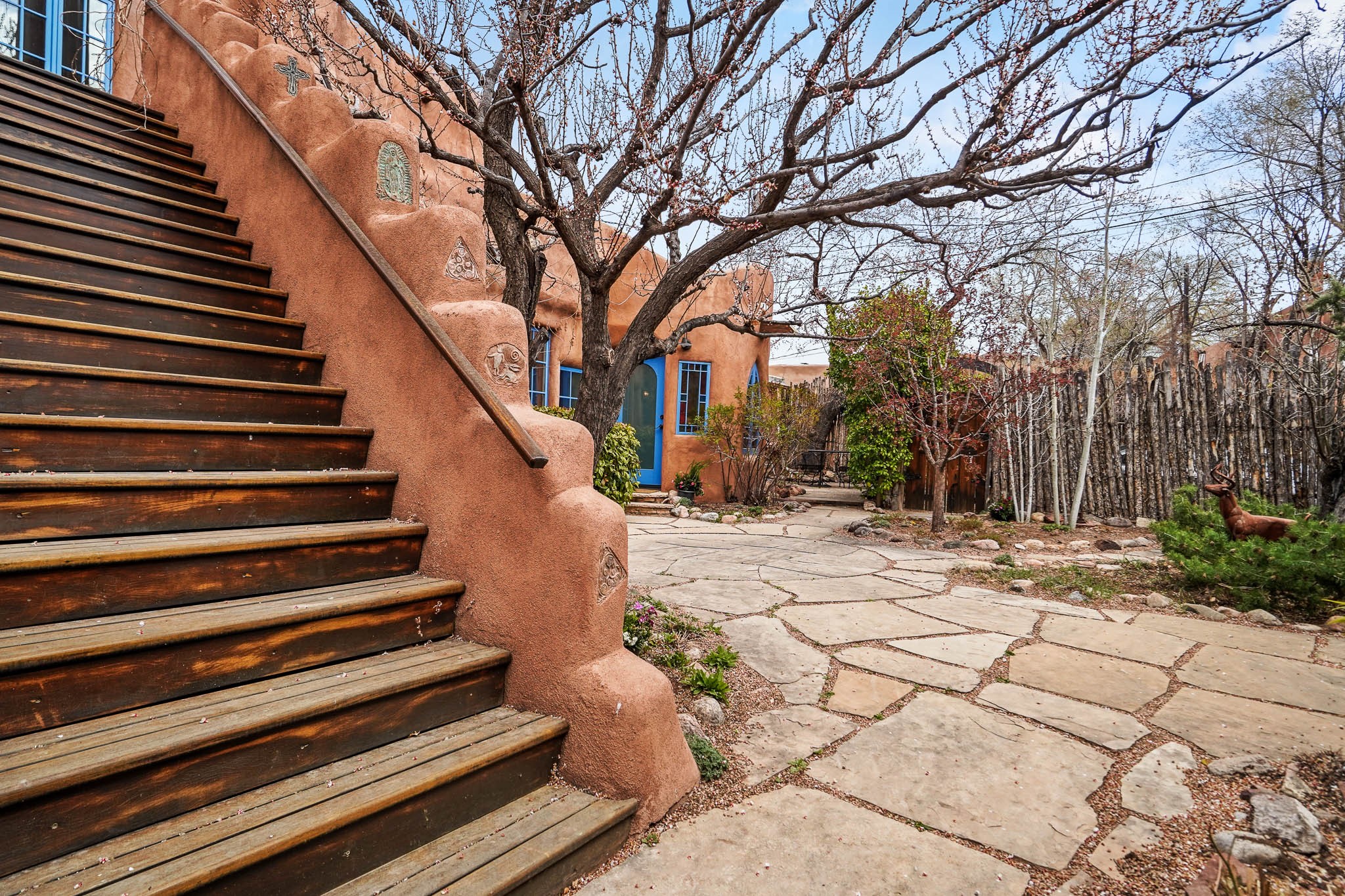 This Santa Fe gem captures the spirit of the city with its classic Pueblo-style charm. The home features original viga beams, high ceilings, and big windows that flood the main living area with light. A beautiful circular staircase leads to a cozy loft office area, and the primary room with balconies that captures the quaint views of Camino Don Miguel. Once home to art galleries, the house still carries that creative vibe, complete with stained glass and a stunning cathedral-style window, with art tiles embedded throughout and unique carved gates on the patio.Step outside to your own private walled patio, just off the kitchen, and relax on the balconies while taking in the breathtaking starry nights that Santa Fe is known for. A truly special home in the heart of Santa Fe's historic charm!