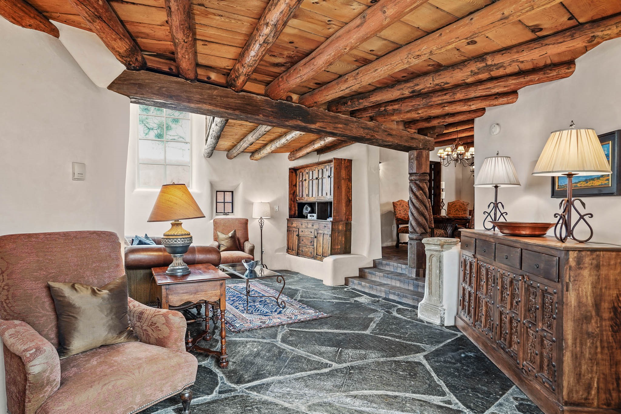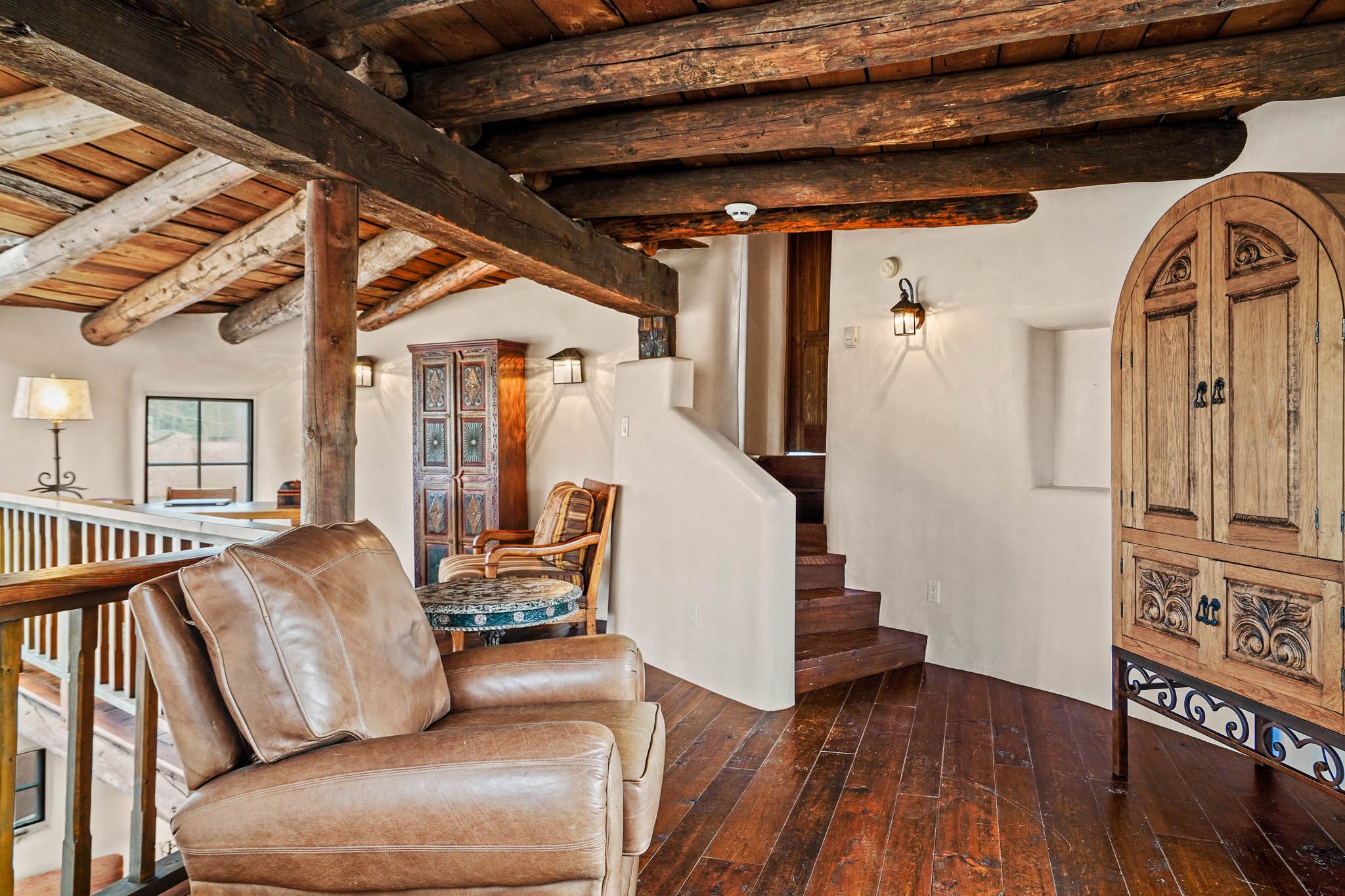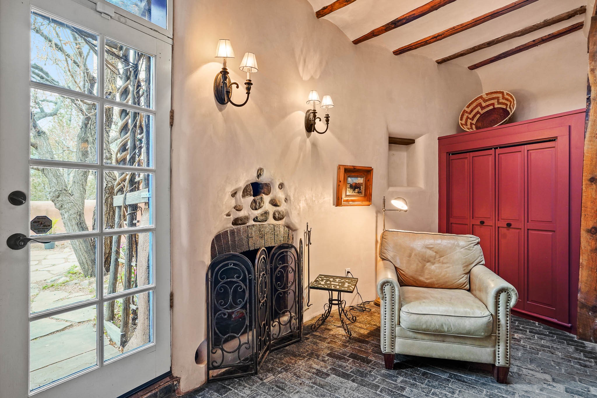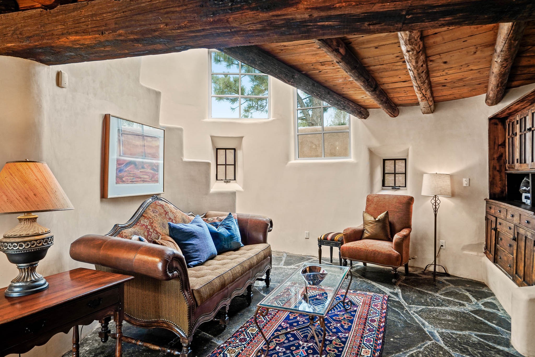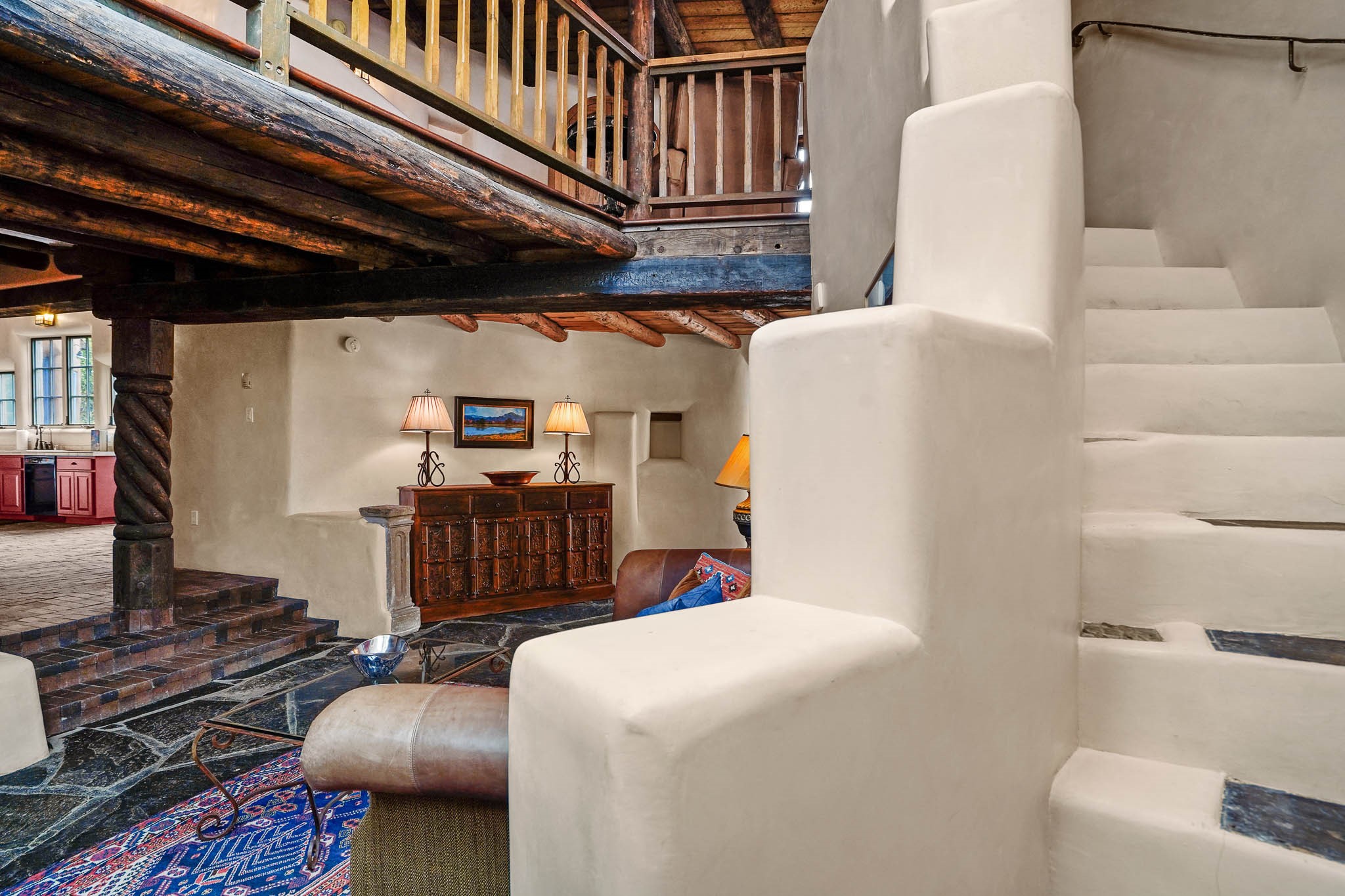 This Santa Fe gem captures the spirit of the city with its classic Pueblo-style charm. The home features original viga beams, high ceilings, and big windows that flood the main living area with light. A beautiful circular staircase leads to a cozy loft office area, and the primary room with balconies that captures the quaint views of Camino Don Miguel. Once home to art galleries, the house still carries that creative vibe, complete with stained glass and a stunning cathedral-style window, with art tiles embedded throughout and unique carved gates on the patio.Step outside to your own private walled patio, just off the kitchen, and relax on the balconies while taking in the breathtaking starry nights that Santa Fe is known for. A truly special home in the heart of Santa Fe's historic charm!