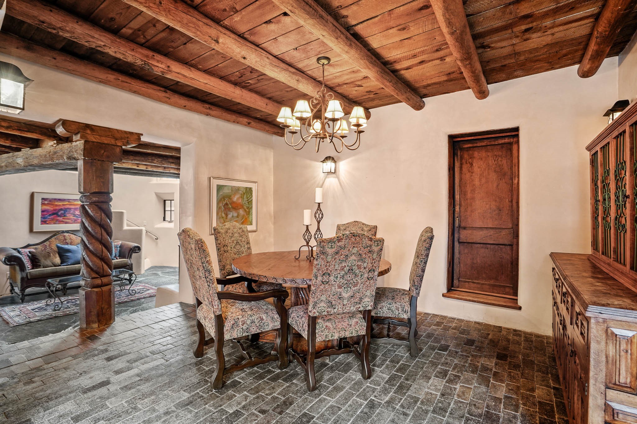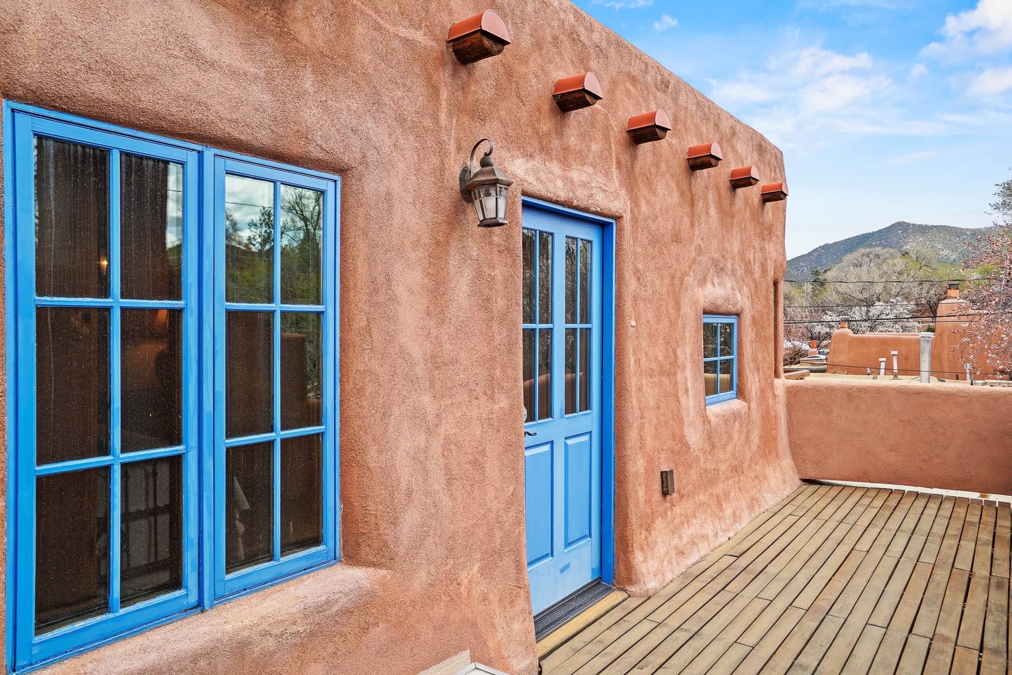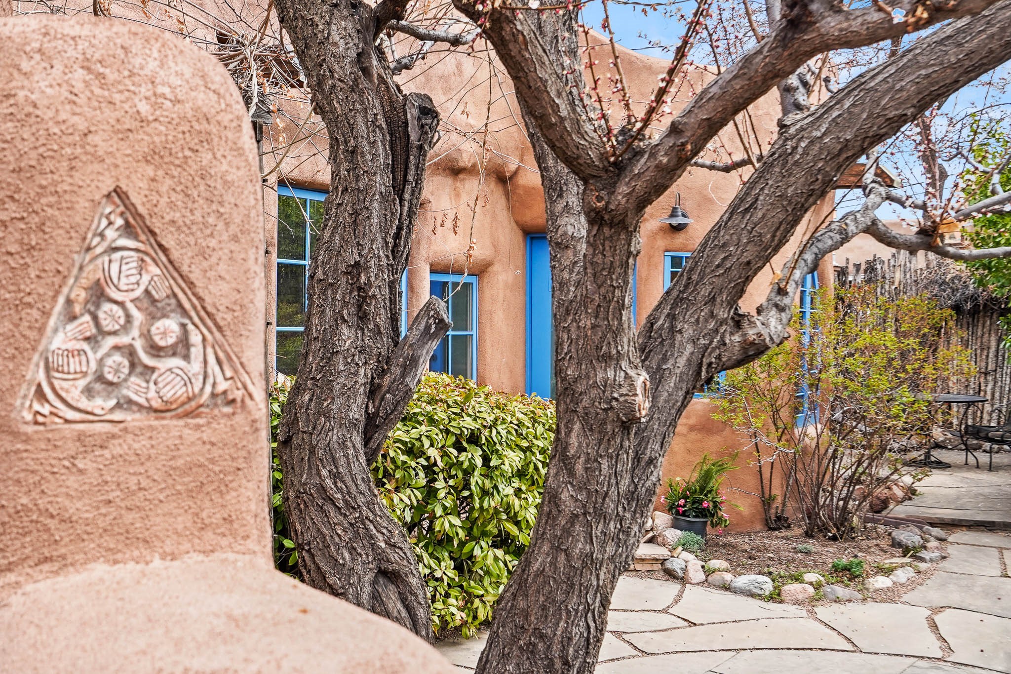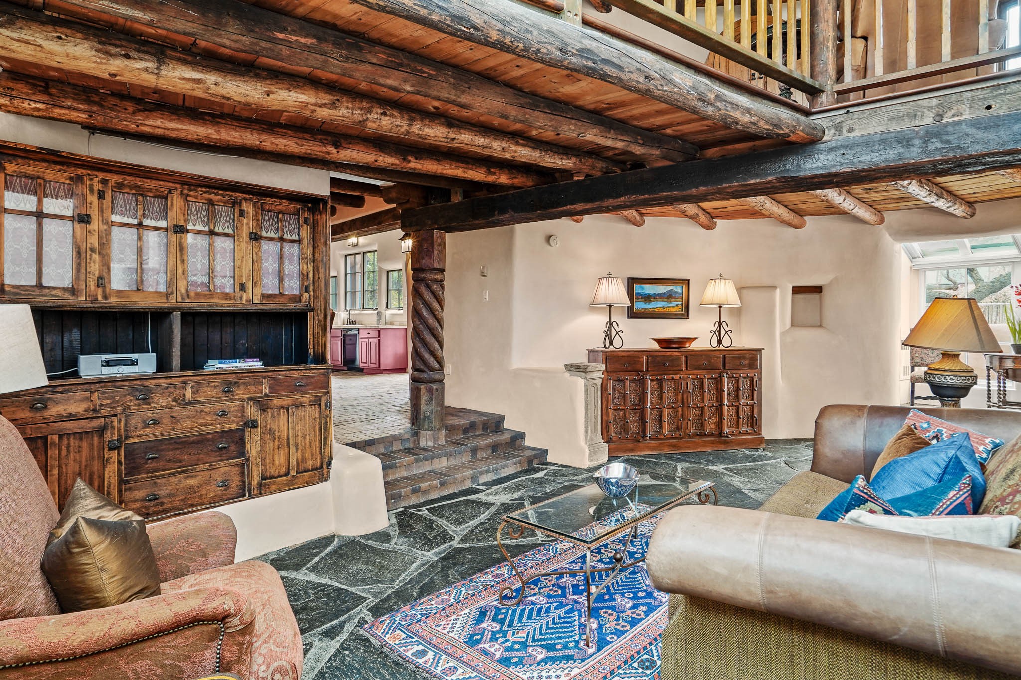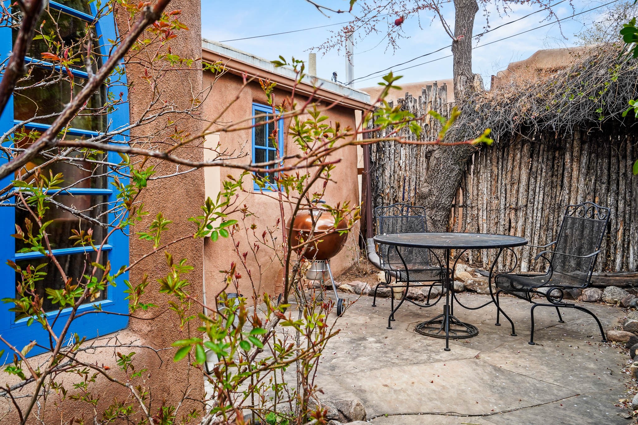 This Santa Fe gem captures the spirit of the city with its classic Pueblo-style charm. The home features original viga beams, high ceilings, and big windows that flood the main living area with light. A beautiful circular staircase leads to a cozy loft office area, and the primary room with balconies that captures the quaint views of Camino Don Miguel. Once home to art galleries, the house still carries that creative vibe, complete with stained glass and a stunning cathedral-style window, with art tiles embedded throughout and unique carved gates on the patio.Step outside to your own private walled patio, just off the kitchen, and relax on the balconies while taking in the breathtaking starry nights that Santa Fe is known for. A truly special home in the heart of Santa Fe's historic charm!