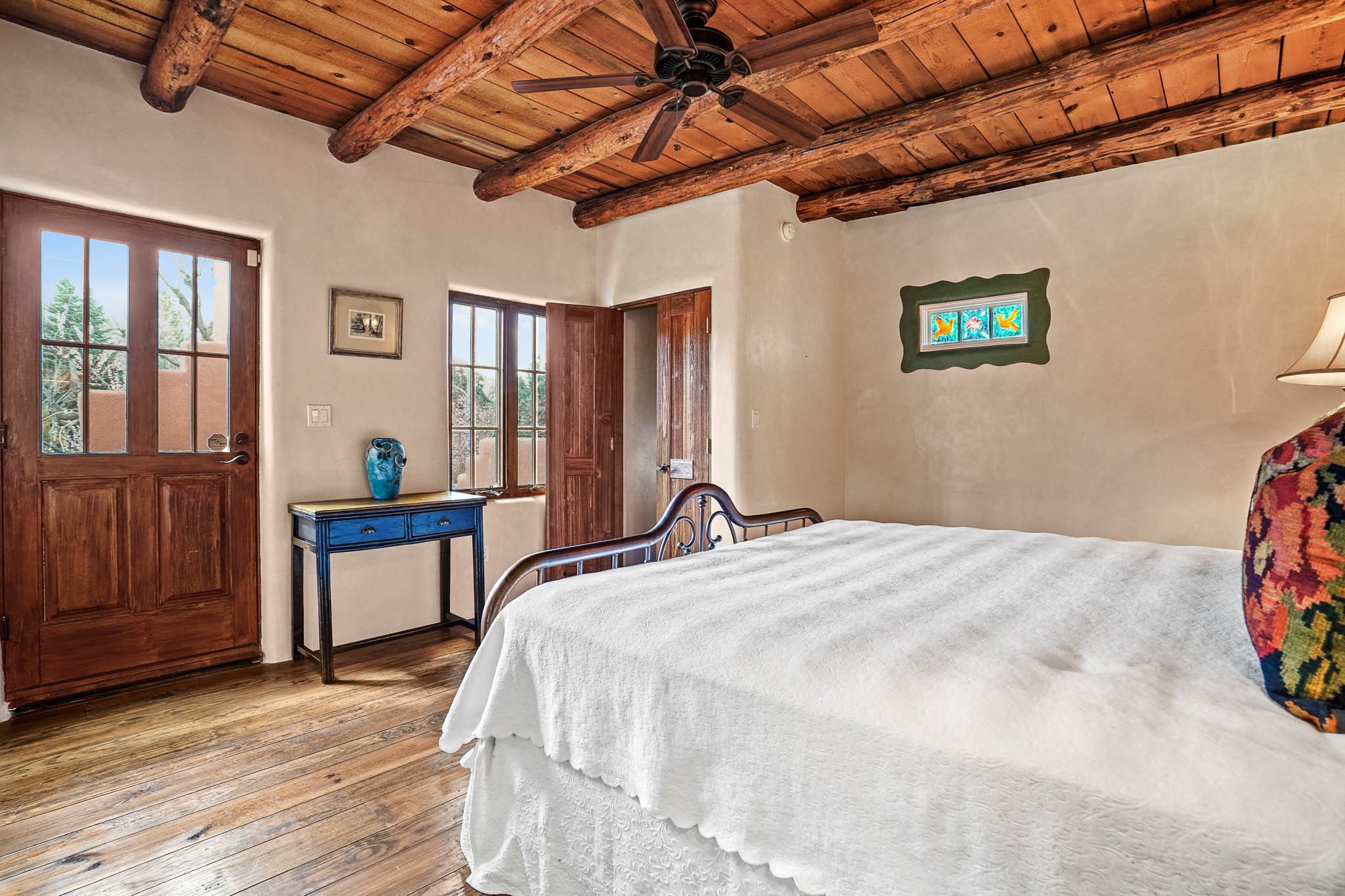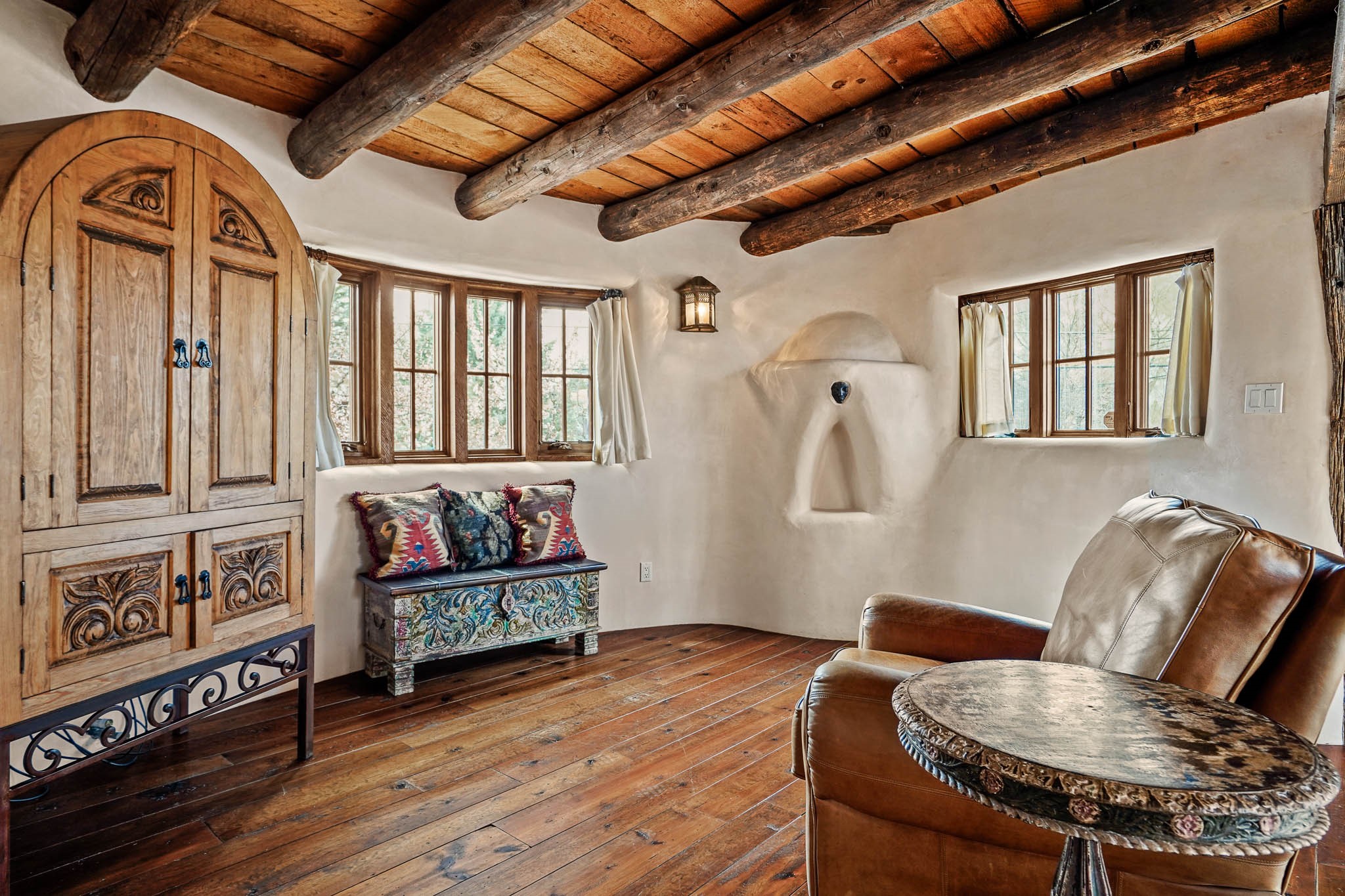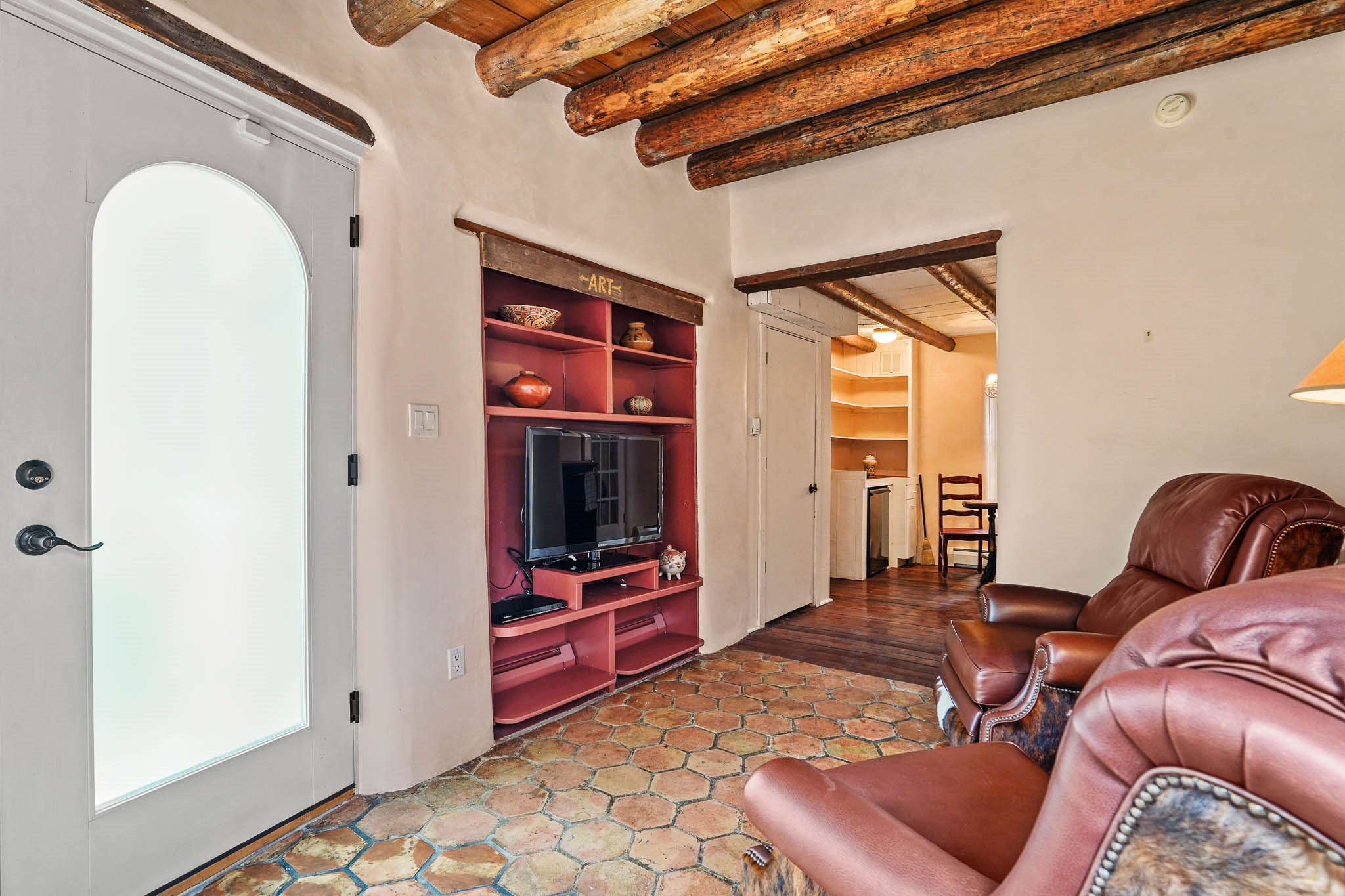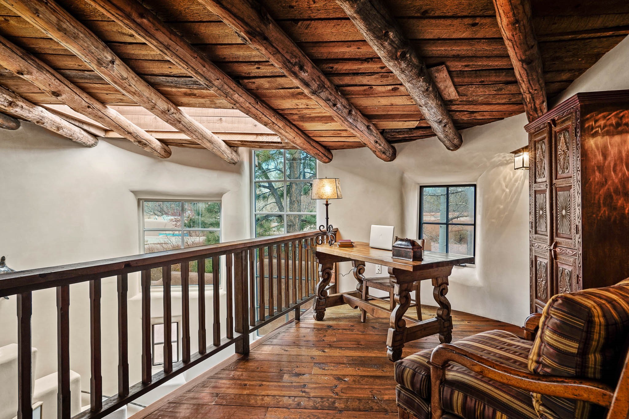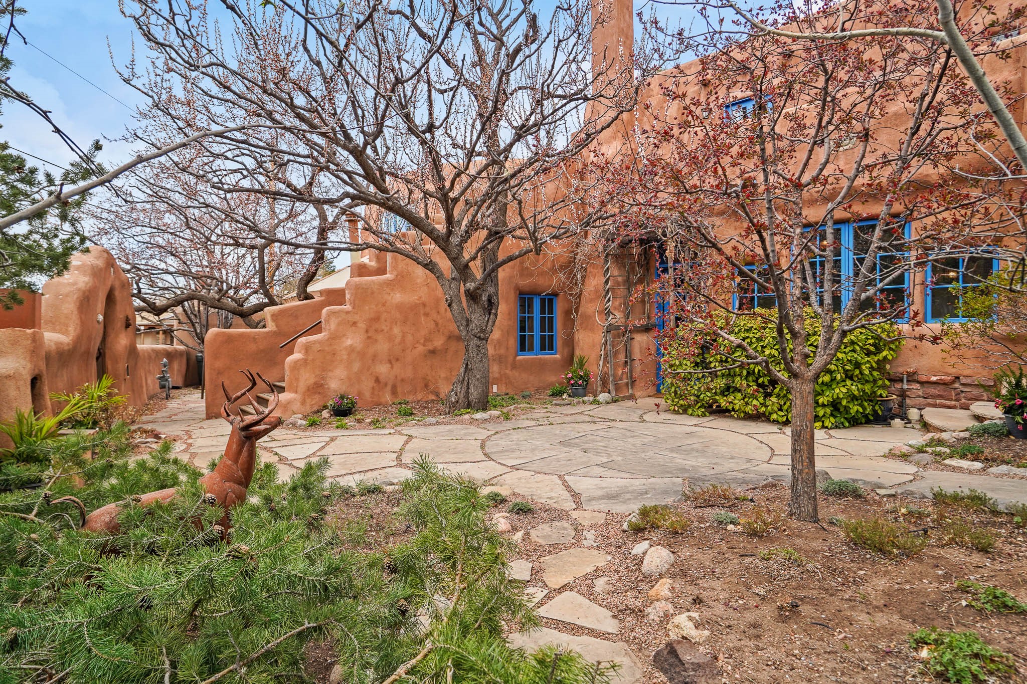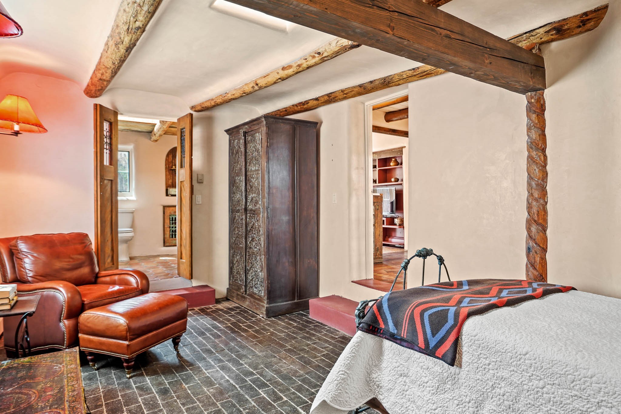 This Santa Fe gem captures the spirit of the city with its classic Pueblo-style charm. The home features original viga beams, high ceilings, and big windows that flood the main living area with light. A beautiful circular staircase leads to a cozy loft office area, and the primary room with balconies that captures the quaint views of Camino Don Miguel. Once home to art galleries, the house still carries that creative vibe, complete with stained glass and a stunning cathedral-style window, with art tiles embedded throughout and unique carved gates on the patio.Step outside to your own private walled patio, just off the kitchen, and relax on the balconies while taking in the breathtaking starry nights that Santa Fe is known for. A truly special home in the heart of Santa Fe's historic charm!