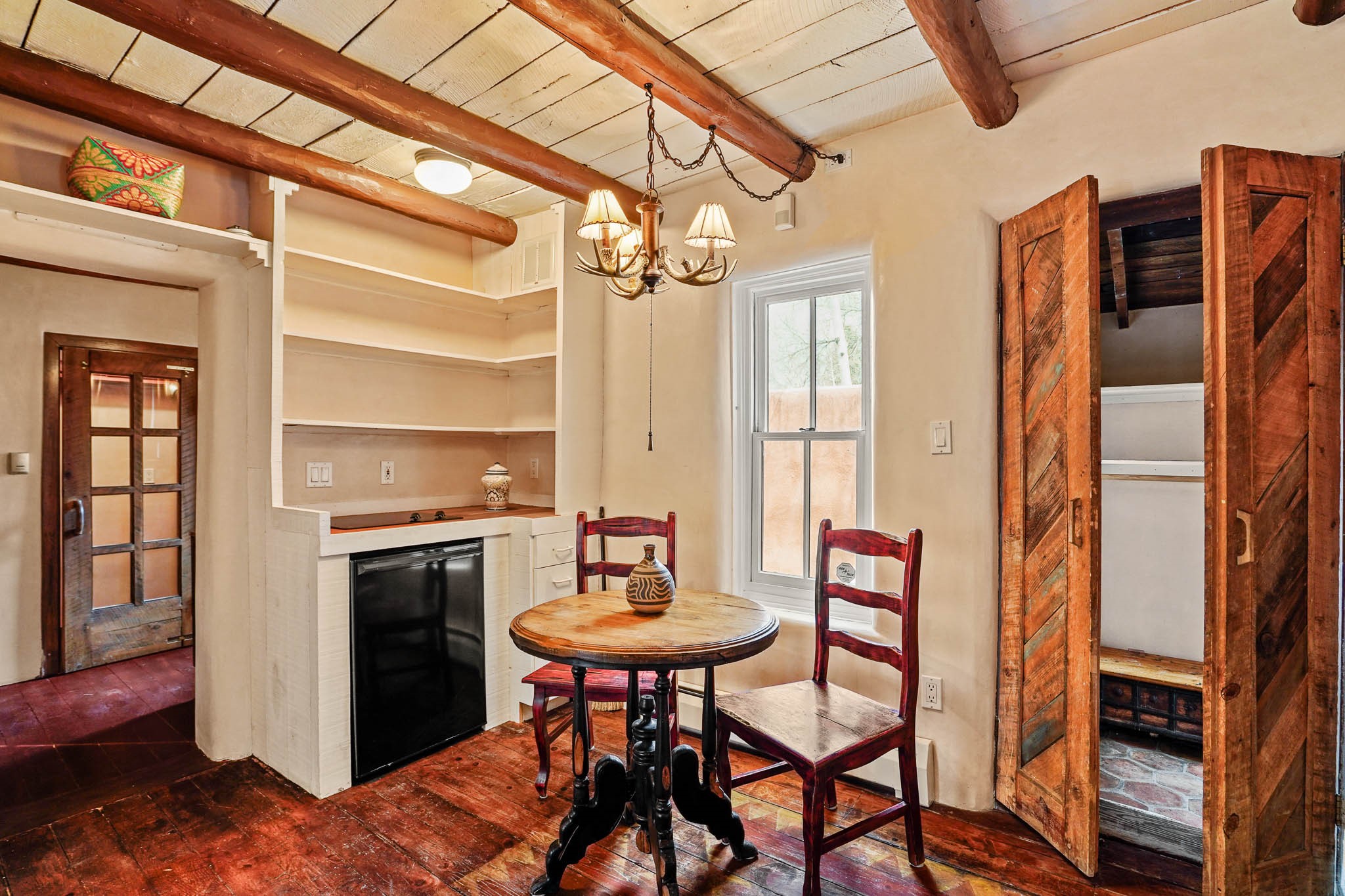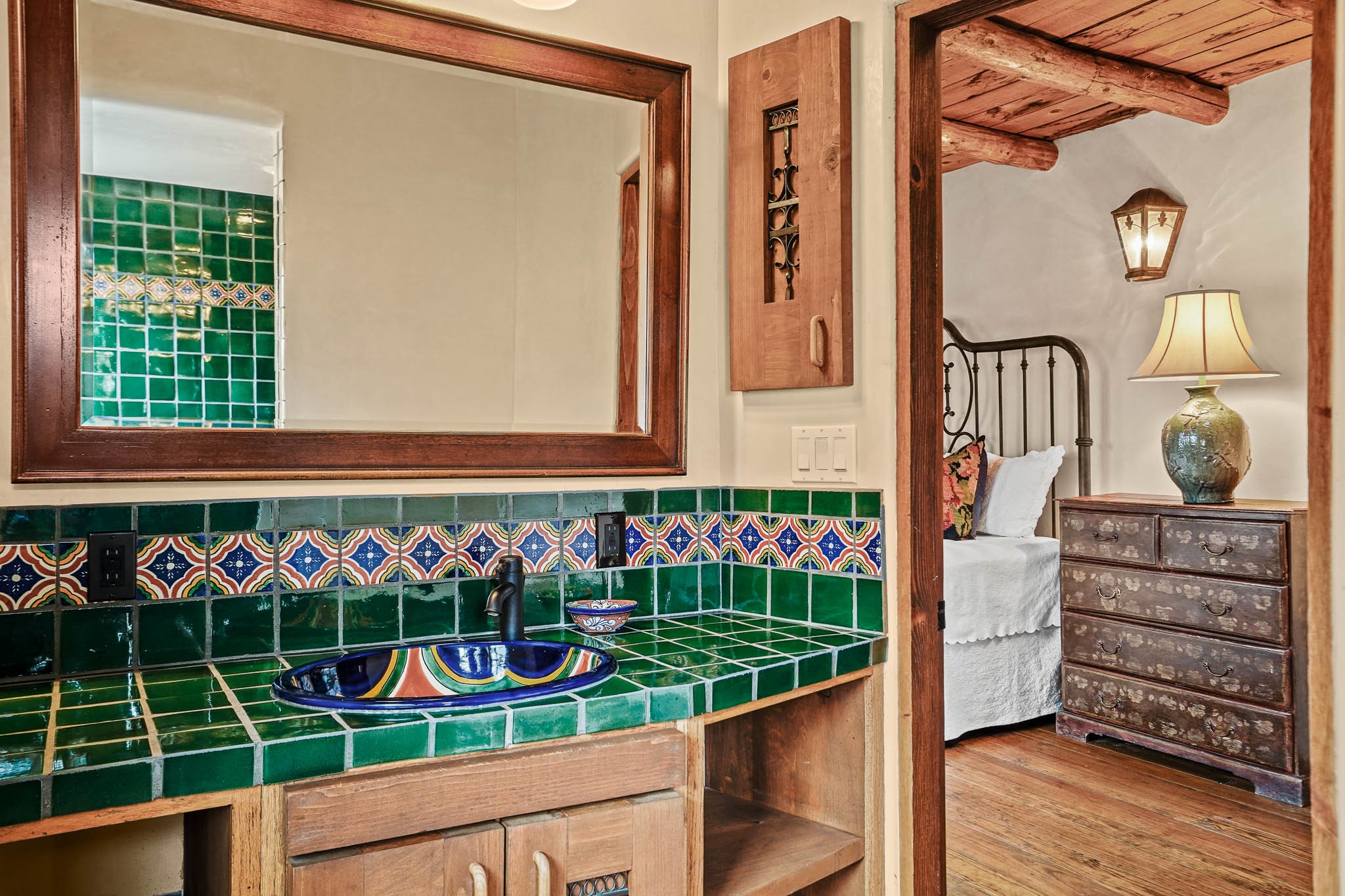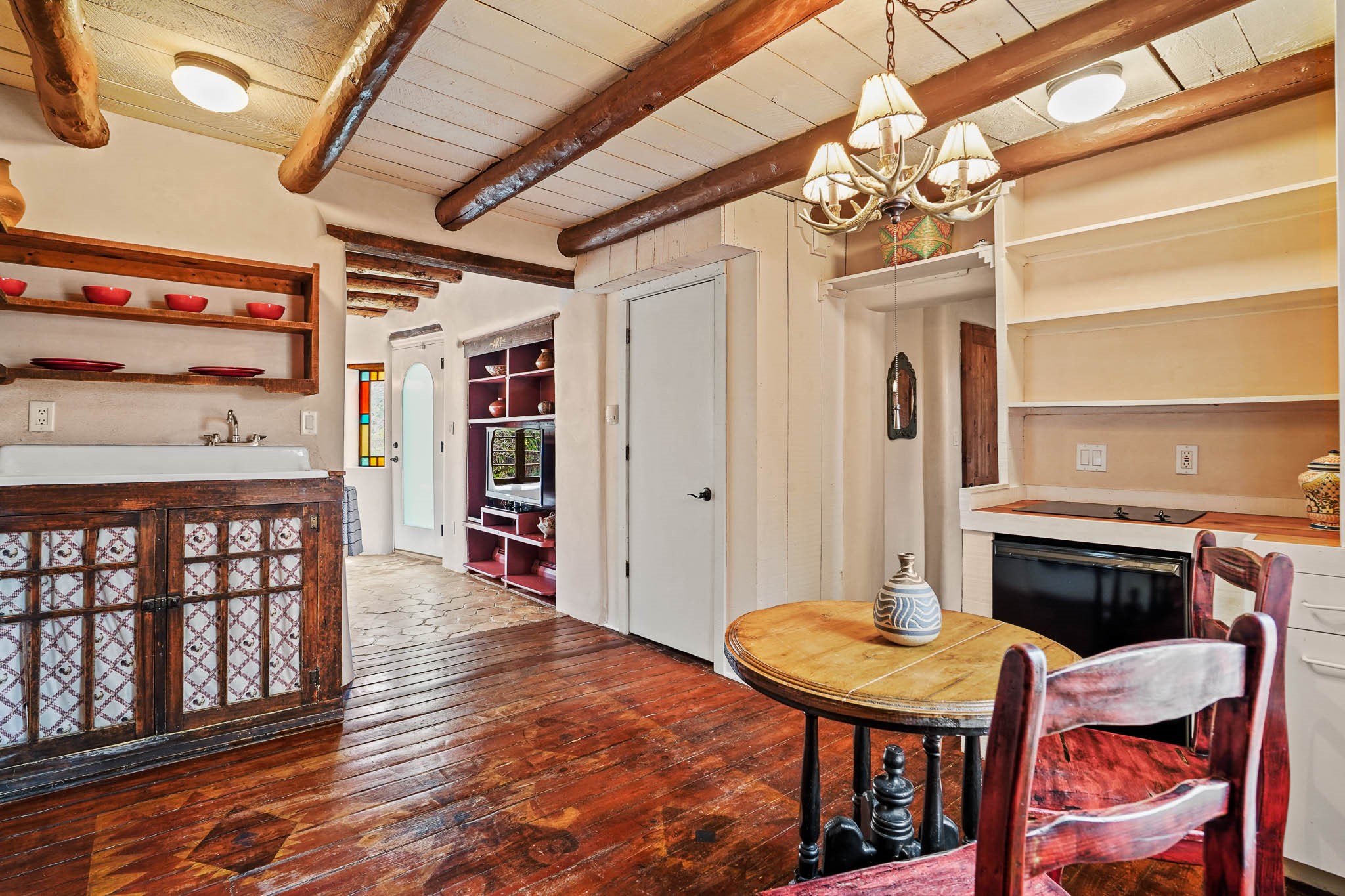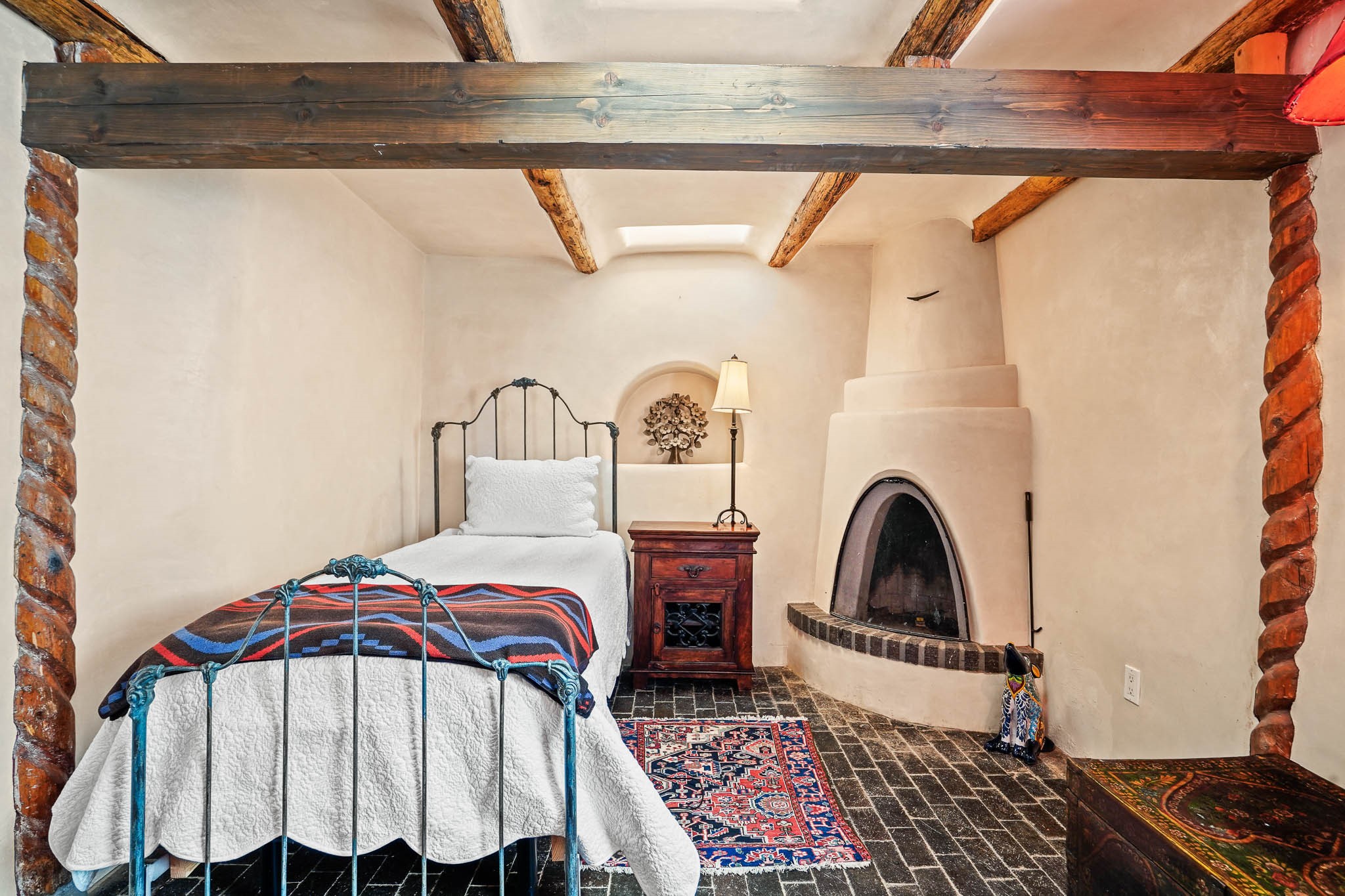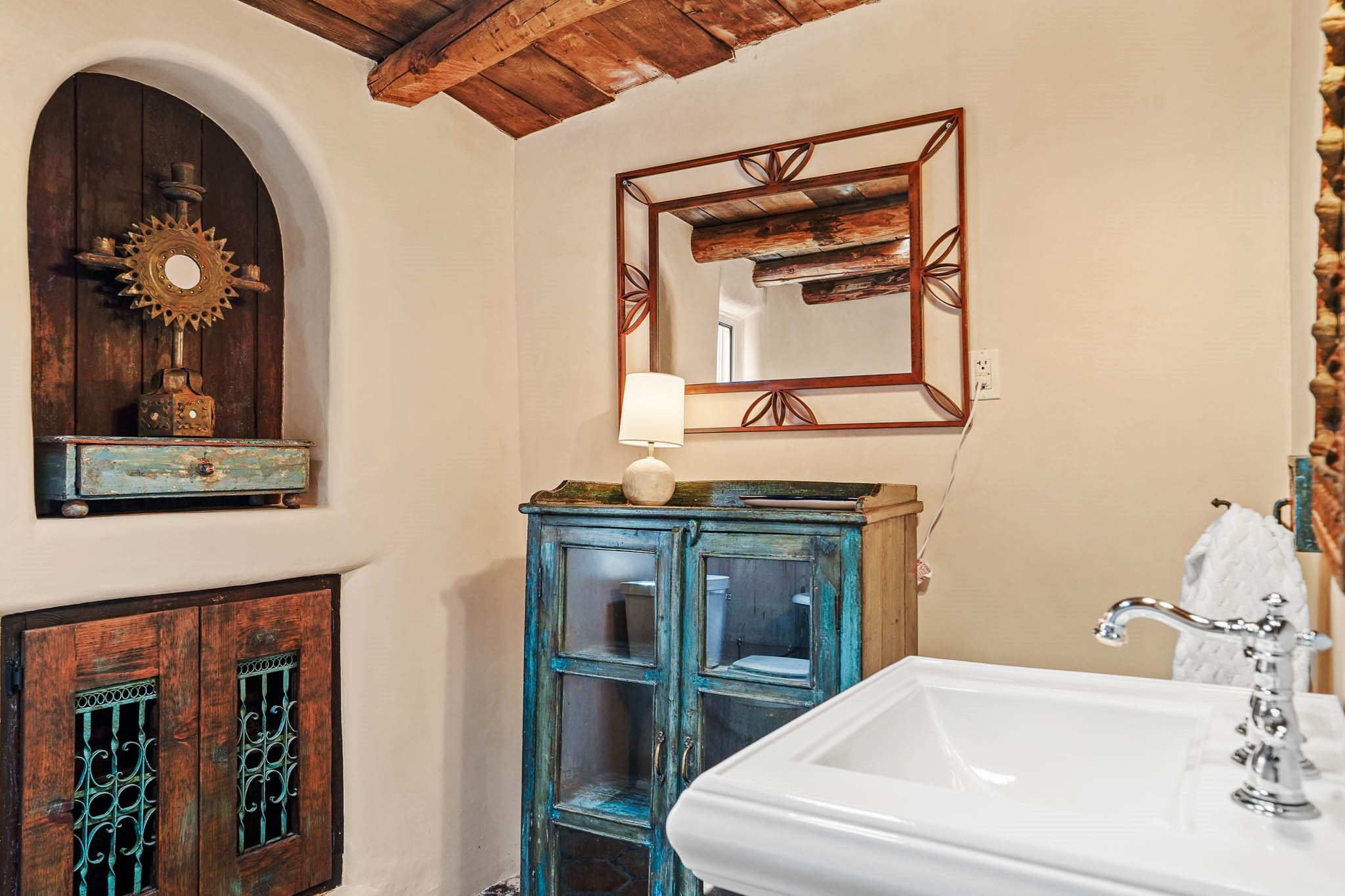 This Santa Fe gem captures the spirit of the city with its classic Pueblo-style charm. The home features original viga beams, high ceilings, and big windows that flood the main living area with light. A beautiful circular staircase leads to a cozy loft office area, and the primary room with balconies that captures the quaint views of Camino Don Miguel. Once home to art galleries, the house still carries that creative vibe, complete with stained glass and a stunning cathedral-style window, with art tiles embedded throughout and unique carved gates on the patio.Step outside to your own private walled patio, just off the kitchen, and relax on the balconies while taking in the breathtaking starry nights that Santa Fe is known for. A truly special home in the heart of Santa Fe's historic charm!