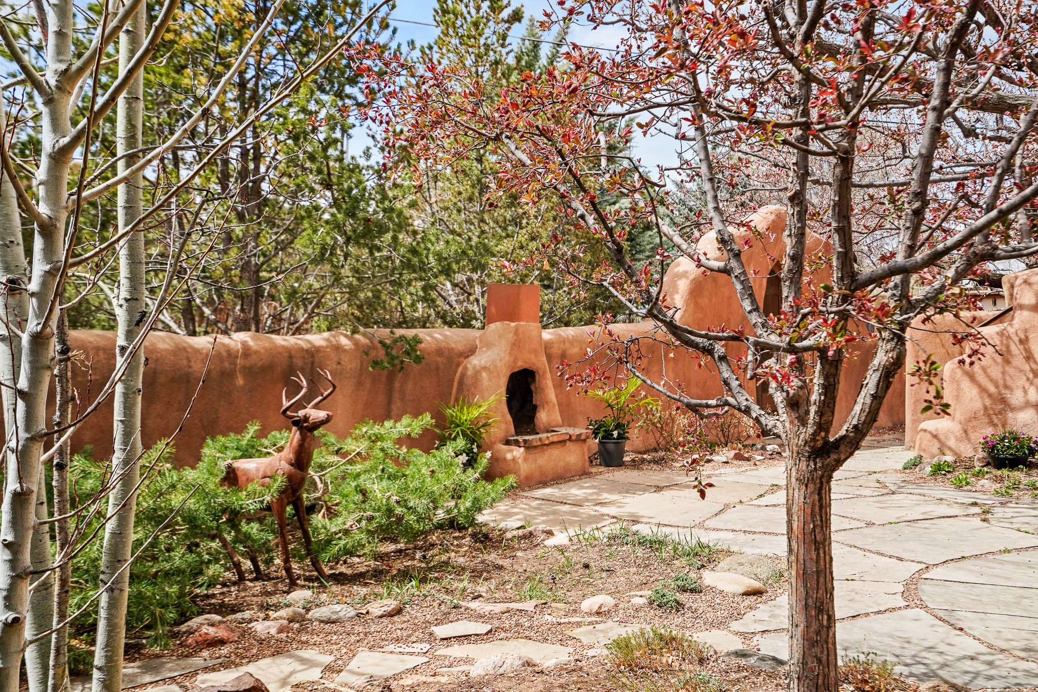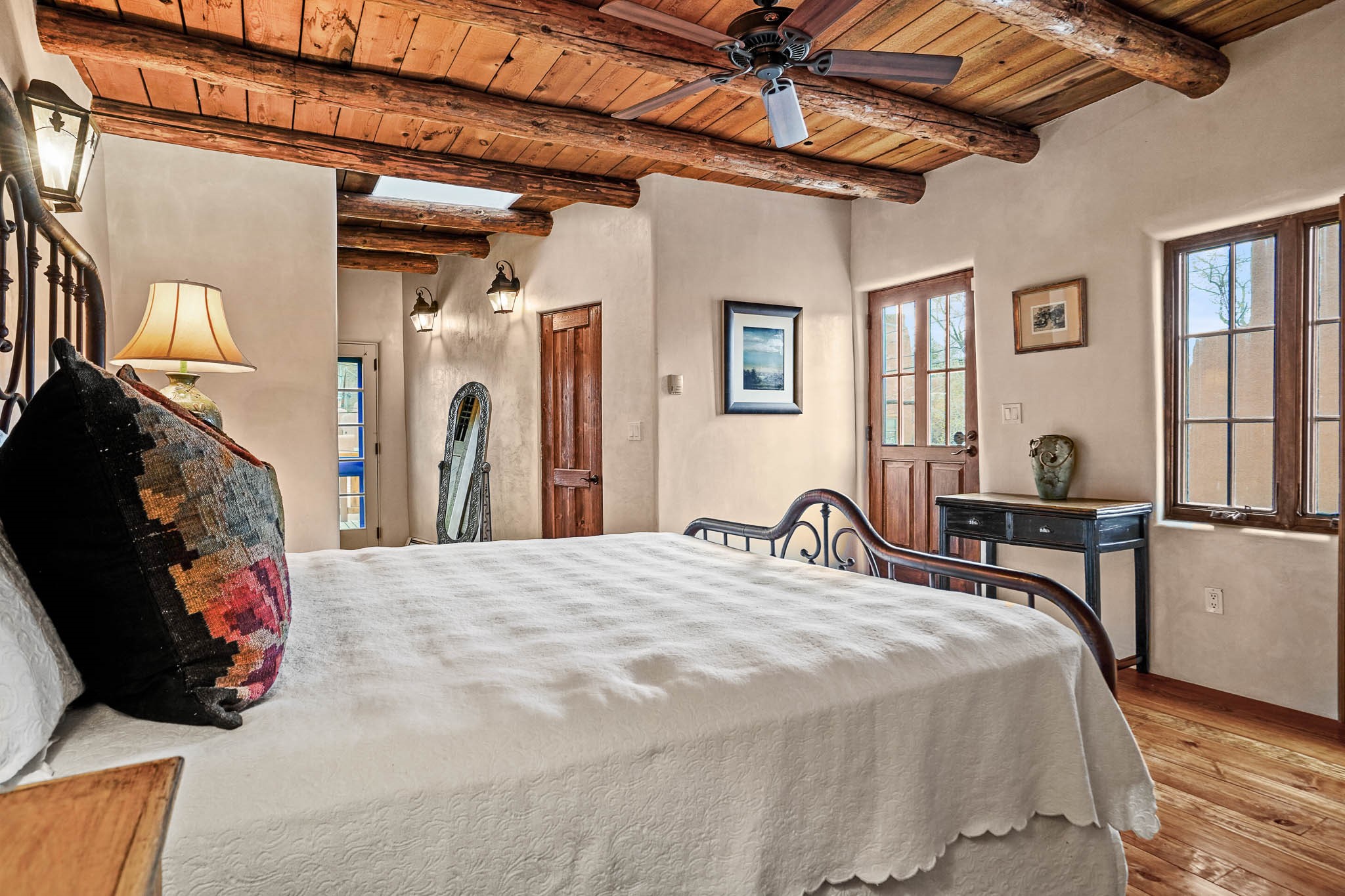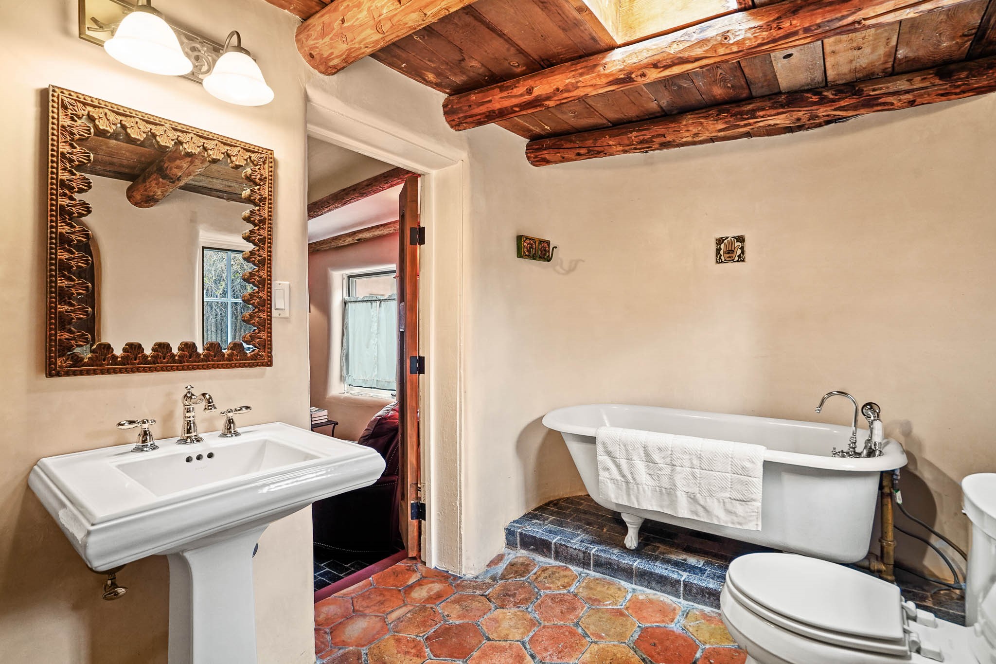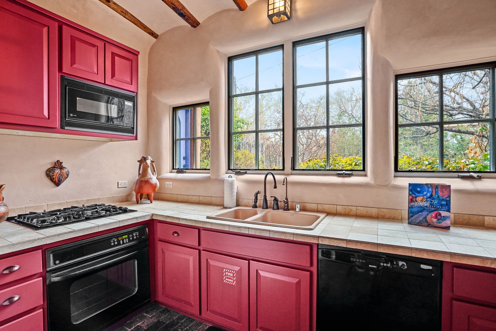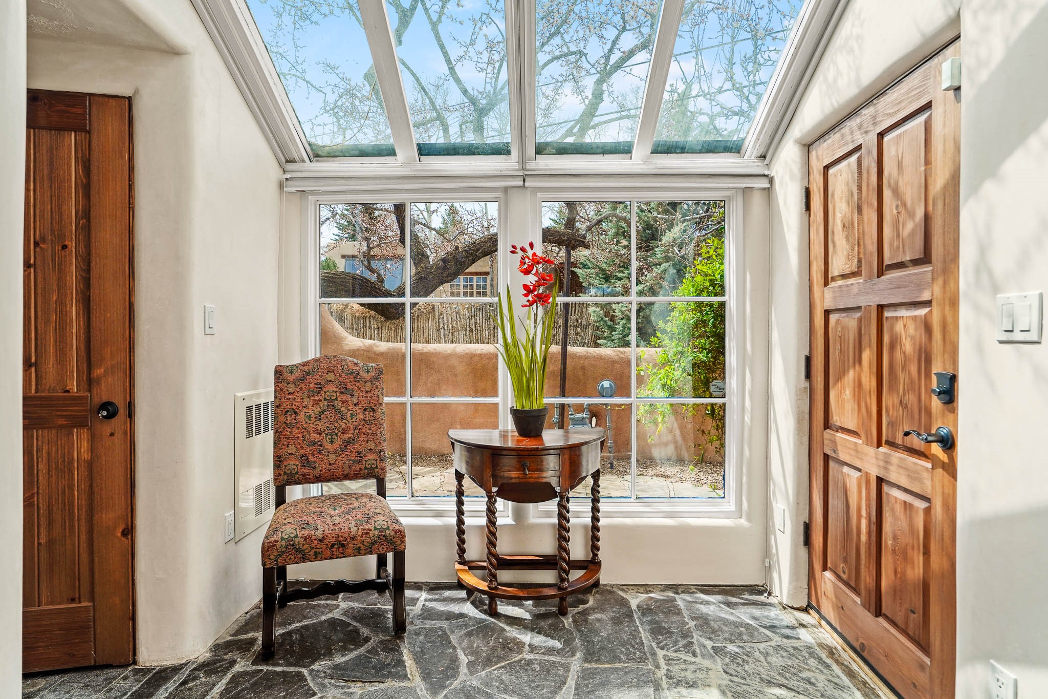 This Santa Fe gem captures the spirit of the city with its classic Pueblo-style charm. The home features original viga beams, high ceilings, and big windows that flood the main living area with light. A beautiful circular staircase leads to a cozy loft office area, and the primary room with balconies that captures the quaint views of Camino Don Miguel. Once home to art galleries, the house still carries that creative vibe, complete with stained glass and a stunning cathedral-style window, with art tiles embedded throughout and unique carved gates on the patio.Step outside to your own private walled patio, just off the kitchen, and relax on the balconies while taking in the breathtaking starry nights that Santa Fe is known for. A truly special home in the heart of Santa Fe's historic charm!