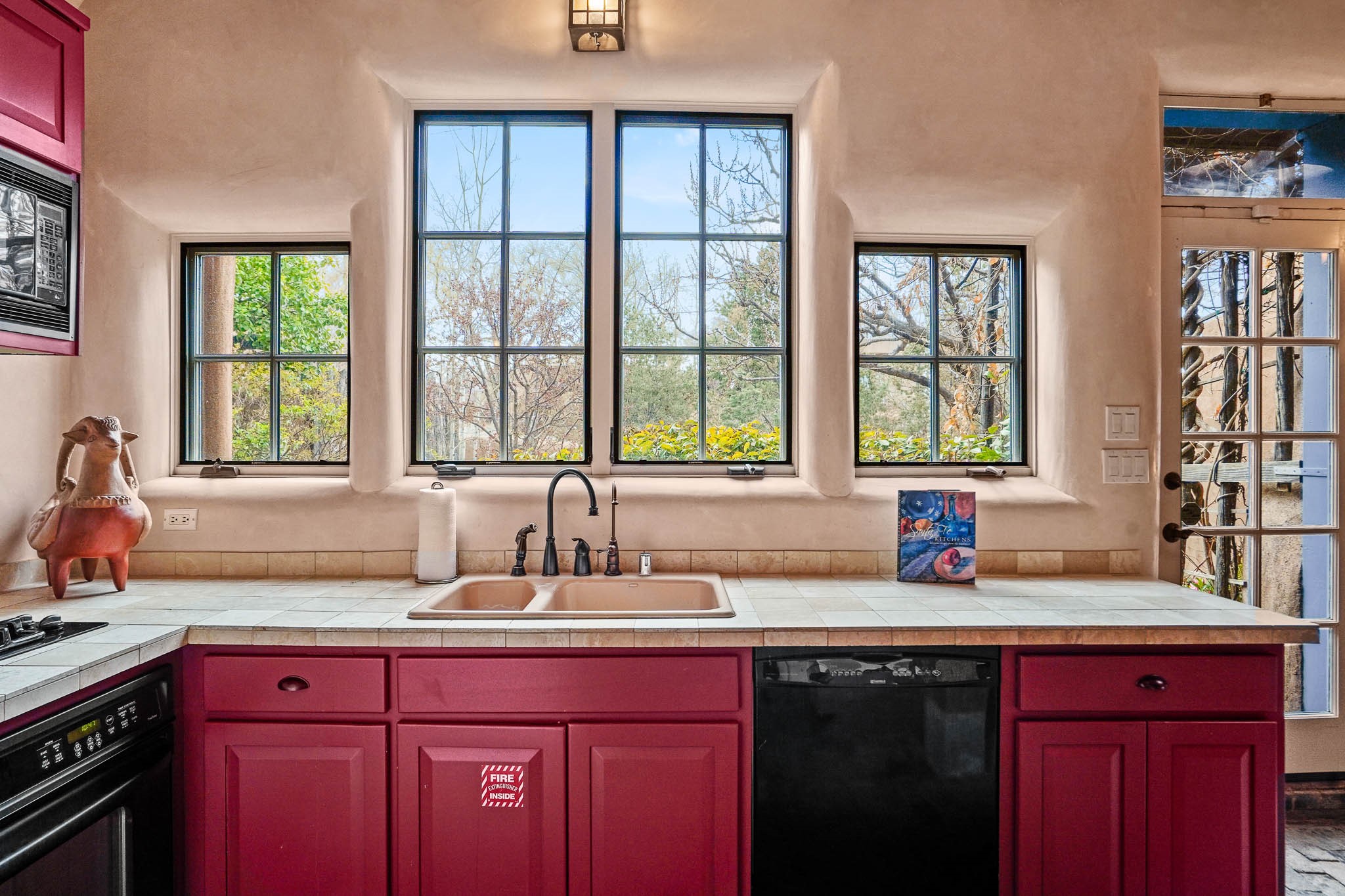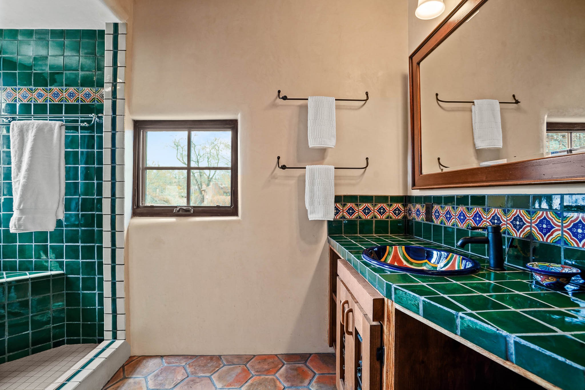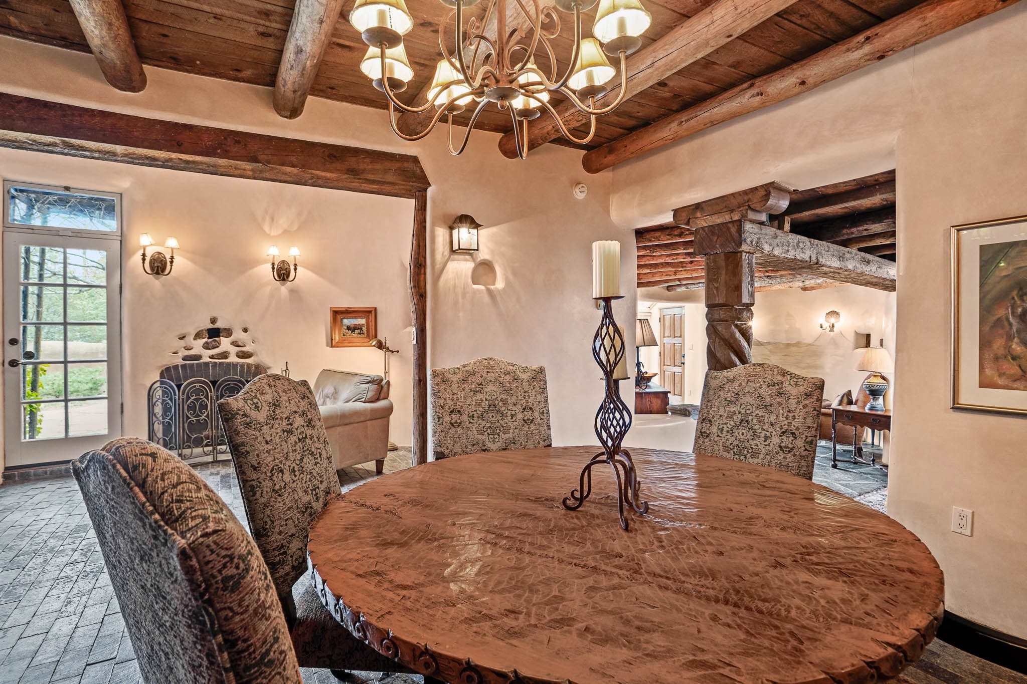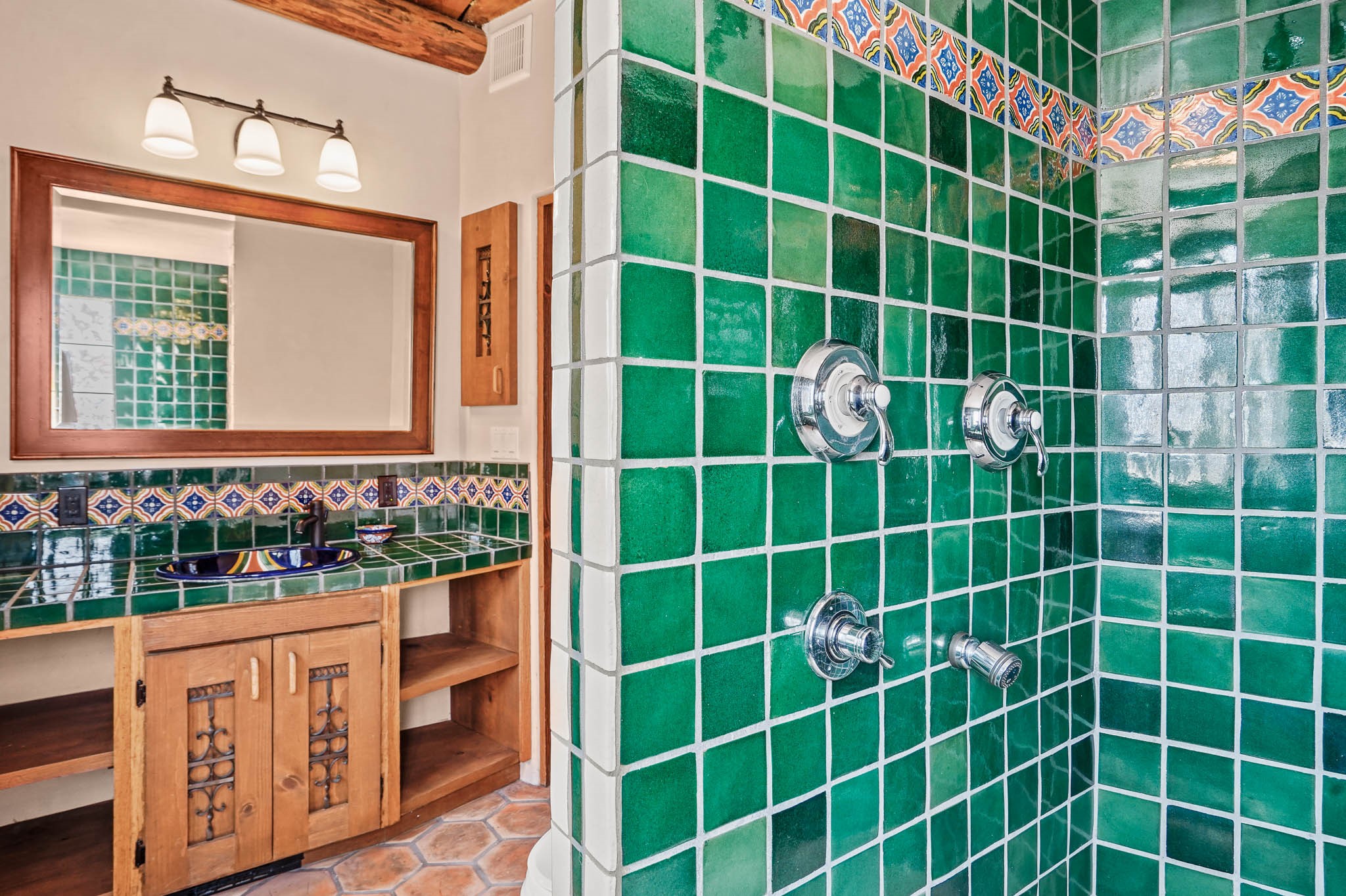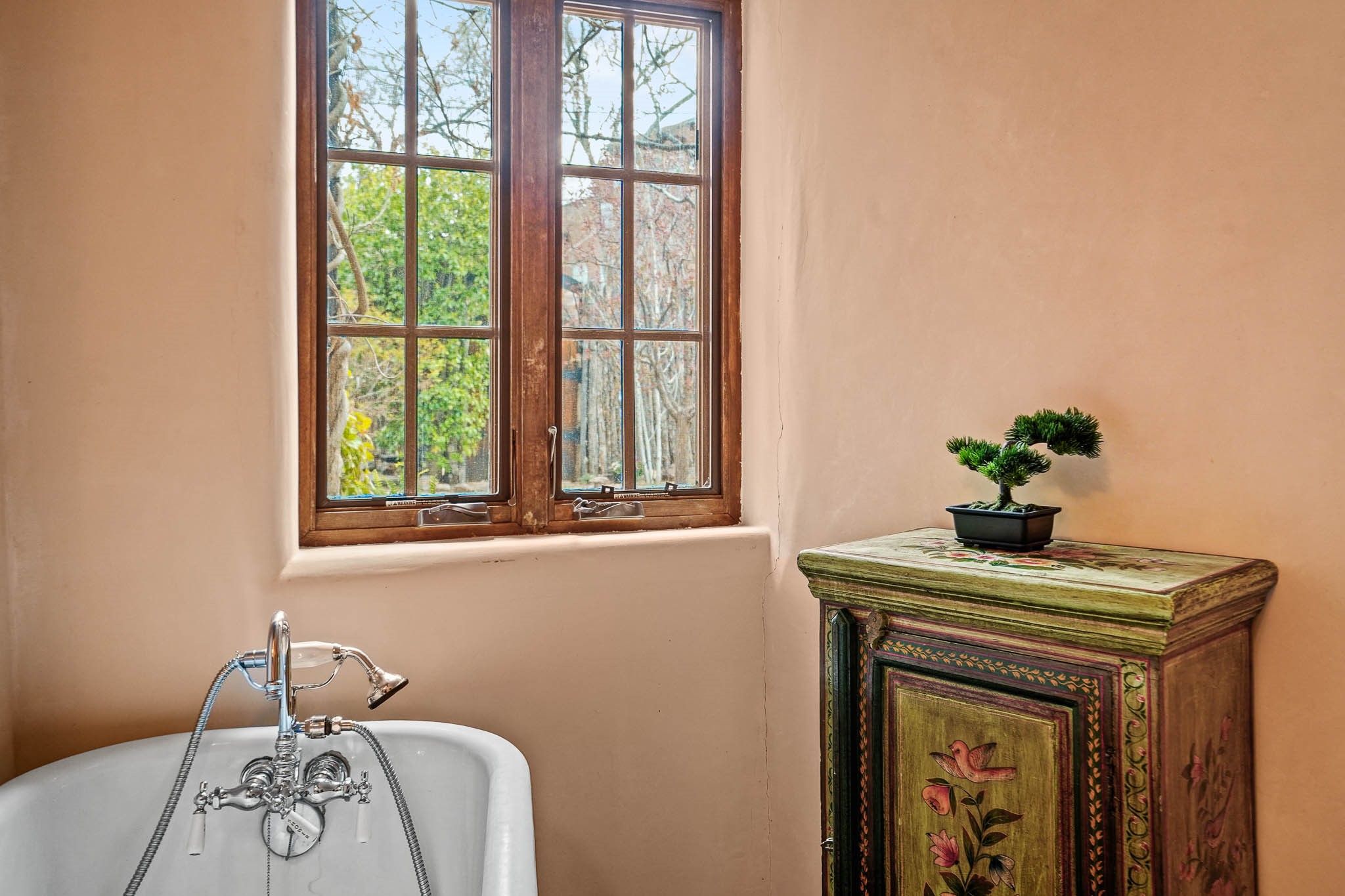 This Santa Fe gem captures the spirit of the city with its classic Pueblo-style charm. The home features original viga beams, high ceilings, and big windows that flood the main living area with light. A beautiful circular staircase leads to a cozy loft office area, and the primary room with balconies that captures the quaint views of Camino Don Miguel. Once home to art galleries, the house still carries that creative vibe, complete with stained glass and a stunning cathedral-style window, with art tiles embedded throughout and unique carved gates on the patio.Step outside to your own private walled patio, just off the kitchen, and relax on the balconies while taking in the breathtaking starry nights that Santa Fe is known for. A truly special home in the heart of Santa Fe's historic charm!
