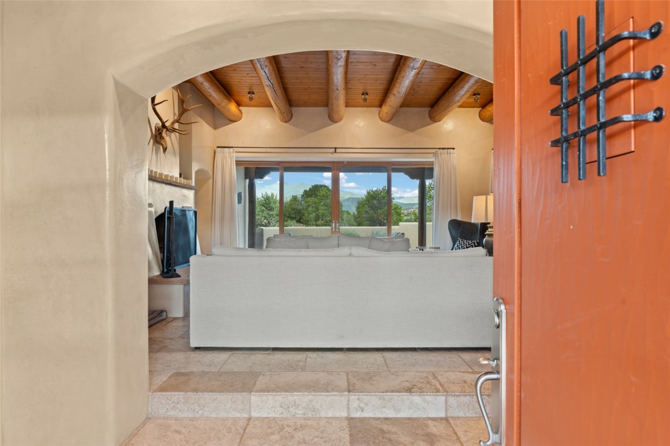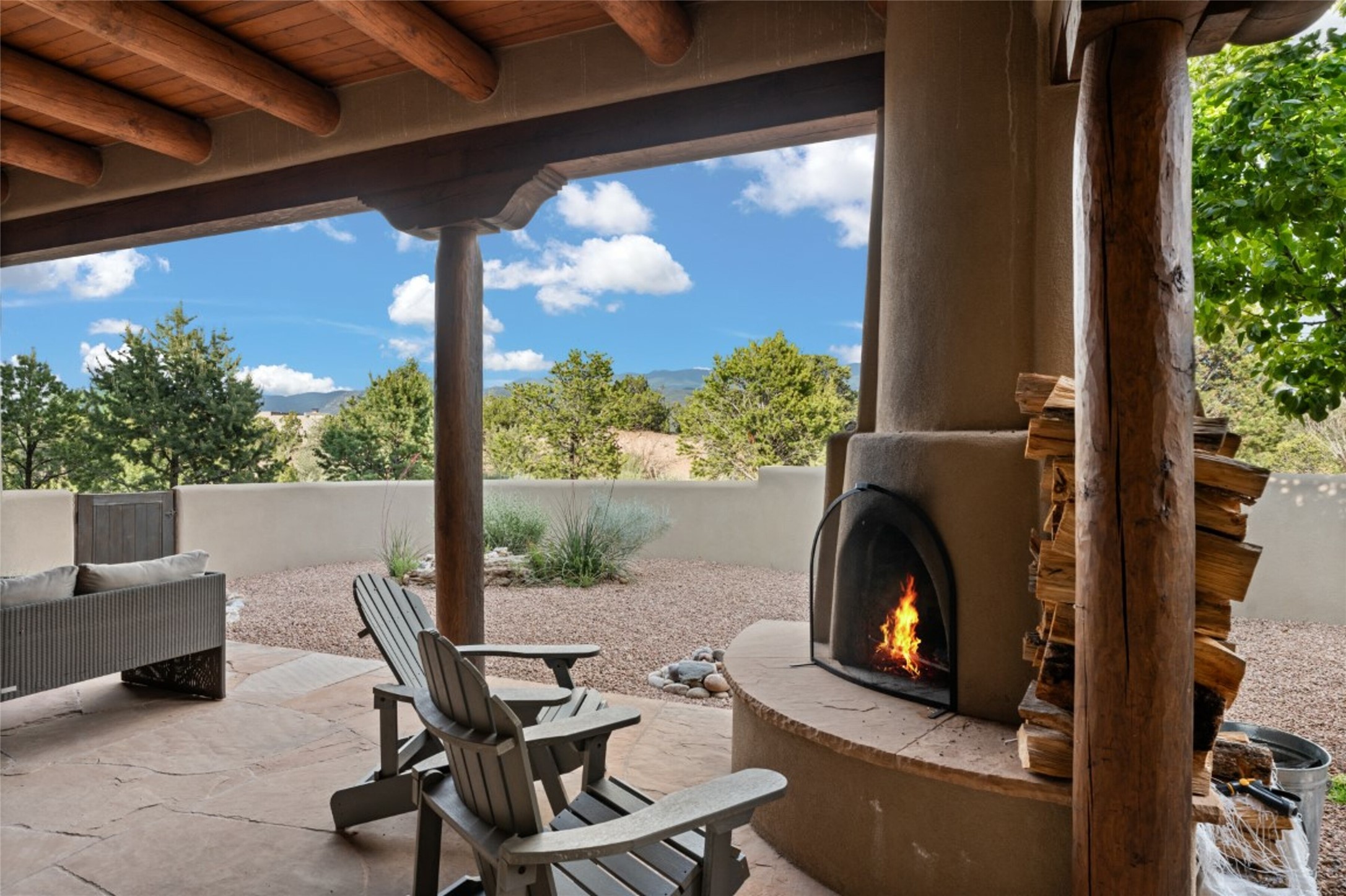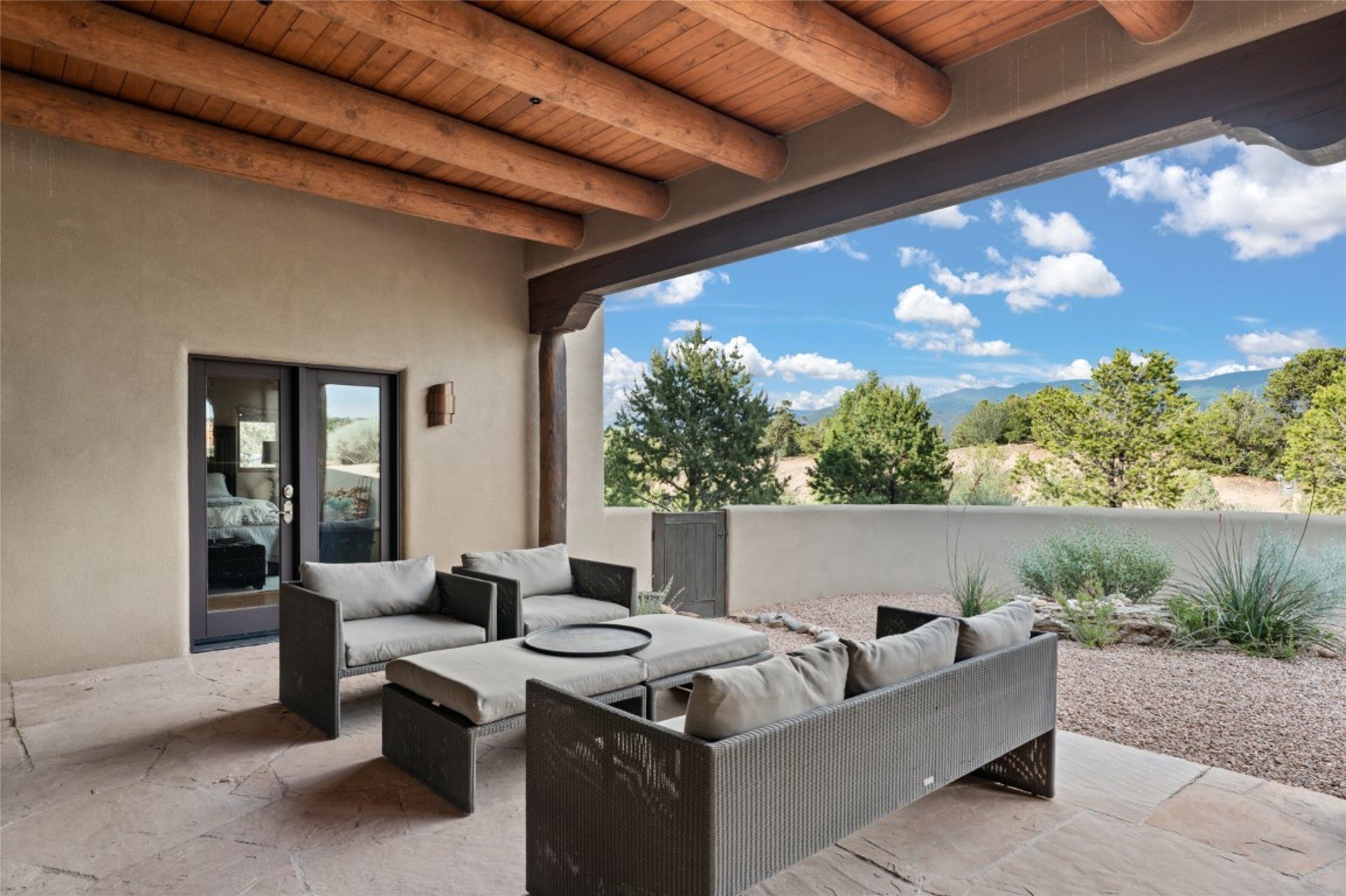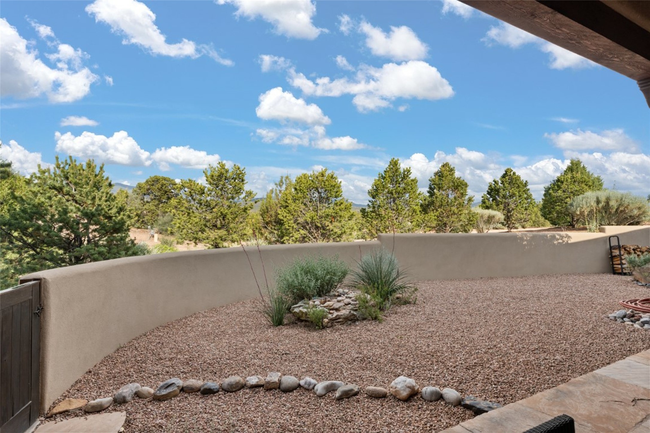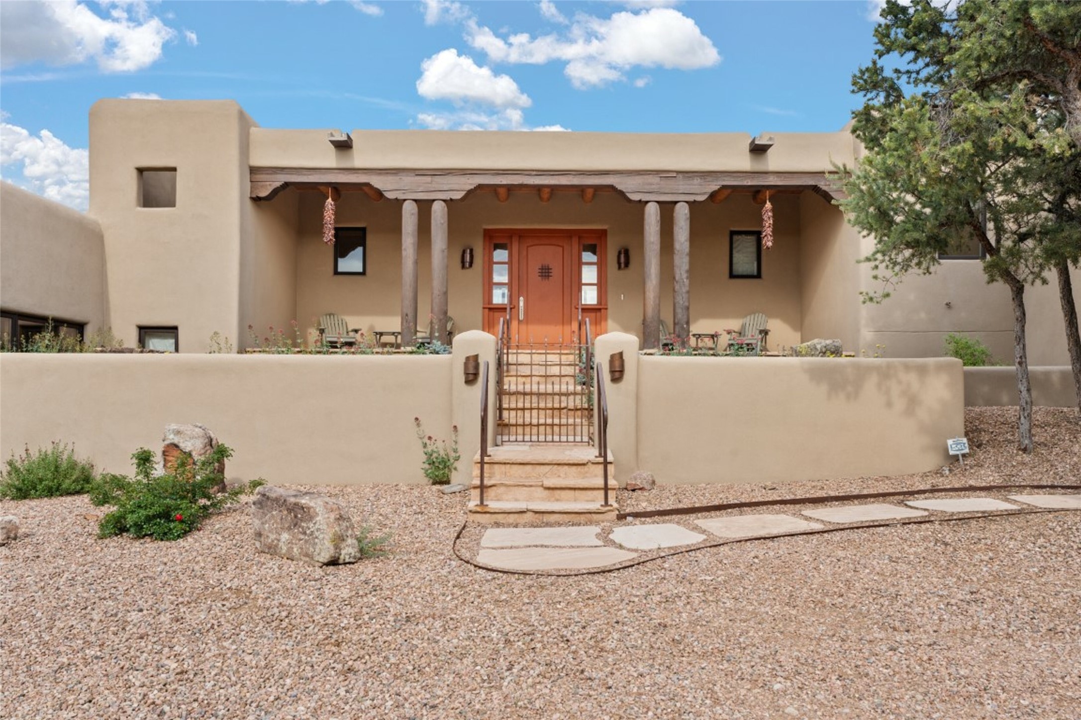 Poised on a curve in the prestigious Monte Sereno subdivision, this 3 BR/3.5BA soft contemporary home offers one-level living for owners, and a separate level for guests (or home office), thereby offering a true separation of space. Built in 2008, this home has been lovingly cared for, and offers a scale of rooms seldom seen in this price range. The comfortable kitchen/family room layout is great for day-to-day living, while the spacious living room/dining room makes a big statement as one enters the home for entertaining or enjoying the views of the Sangre de Cristo Mountains to the east. The owners suite is a true sanctuary, with access to the front portal, warm oak floors, an over-sized walk in closet with built in cabinetry, and a wonderful bath with separate new soaking tub and walk-in shower, accompanied by two vanity areas and a make-up counter. The 2nd and 3rd bedrooms are a couple of steps down, and both had en-suite baths and are very private. These bedrooms (as well as the rest of the home) feature chiseled travertine floors. The entertaining portal is one of the largest in Monte Sereno, and features an outdoor BBQ, a large seating area, a corner kiva wood burning fireplace, and a privacy wall encircling the rear landscaping. With easy access to Santa Fe in this front of Monte Sereno setting, miles of private walking trails, and of course great views - this reasonably priced home is one of the best values in all of Monte Sereno. Features: Deluxe Wolf 6 Burner Stove w/ double oven, Sub-Zero refrigerator Granite counter tops in the kitchen Custom cabinetry with loads of storage area Separate pantry with new shelving 3 Wood burning fireplaces - living room, family room, and outdoor portal New large owner's suite soaking tub Built in sound system in the Kitchen/Family Room, Living Room, Owner's Suite & Rear Portal High ceilings with vigas throughout the home Hand trawled plaster finishes throughout Travertine tile and wood floors Clad windows and sliding doors for low maintenance exterior Landscaped with drip irrigation In floor radiant heat 2 Evaporative Coolers with whole house ducting. Beautiful new window treatments throughout create a sense of warmth and elegance throughout the entire home.