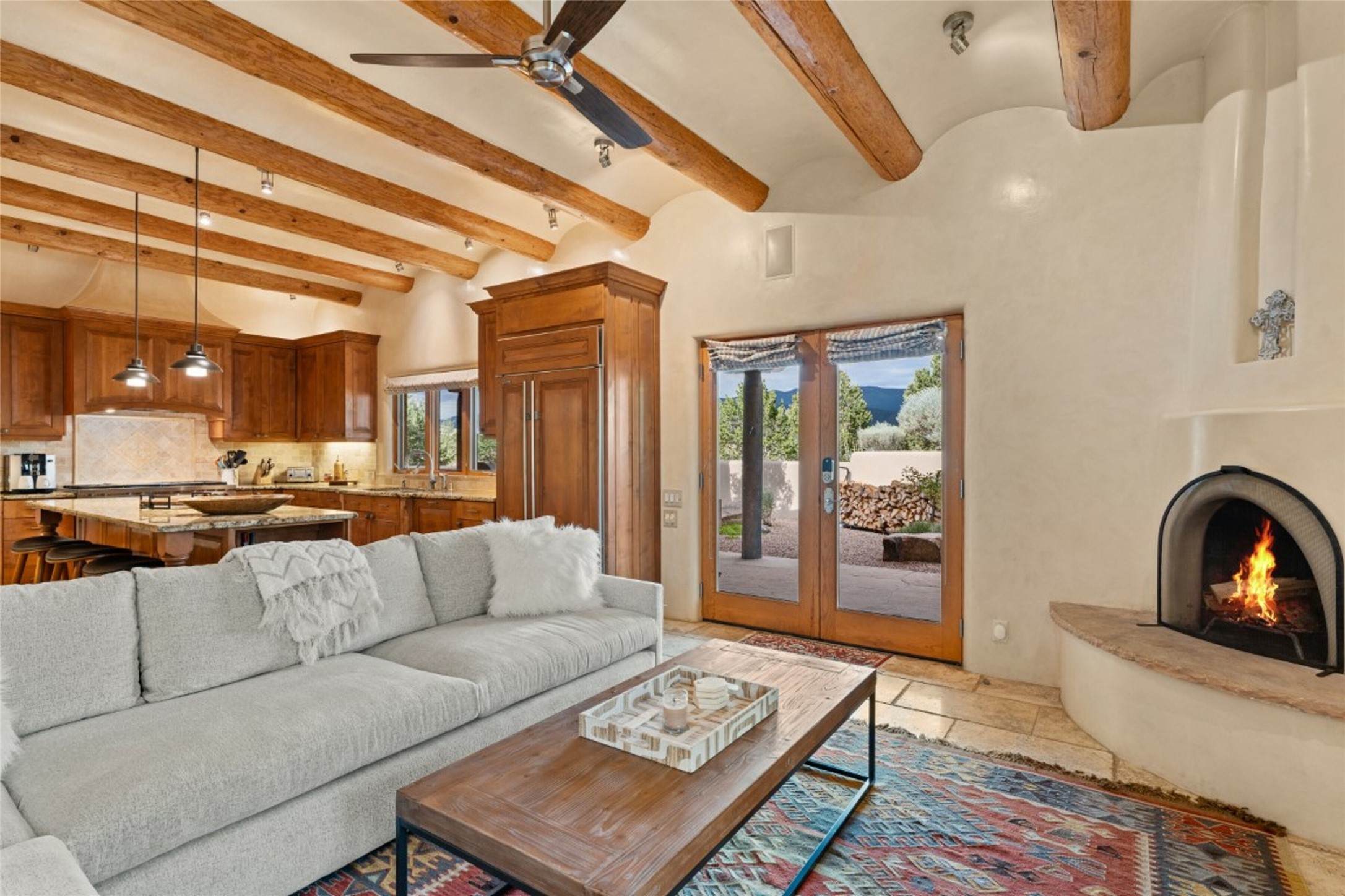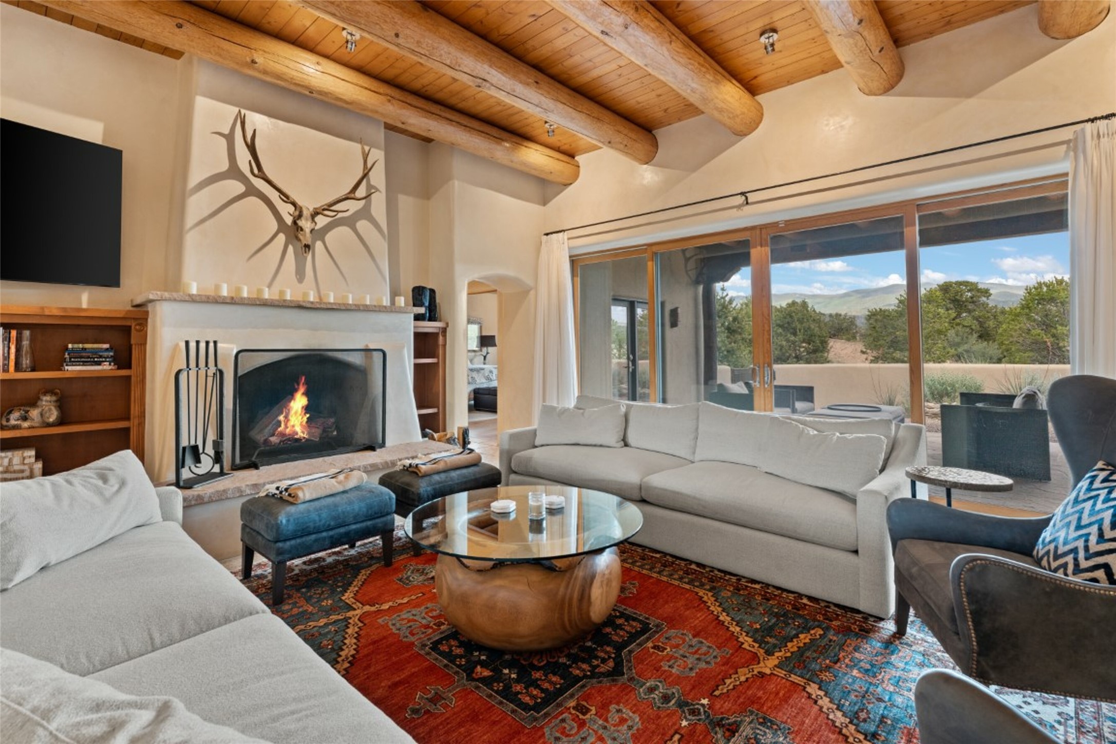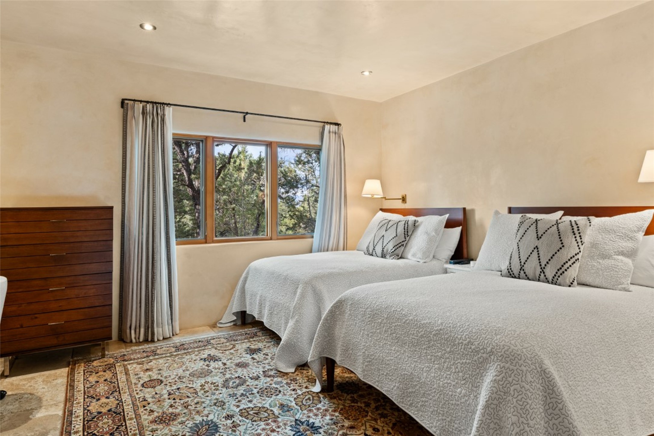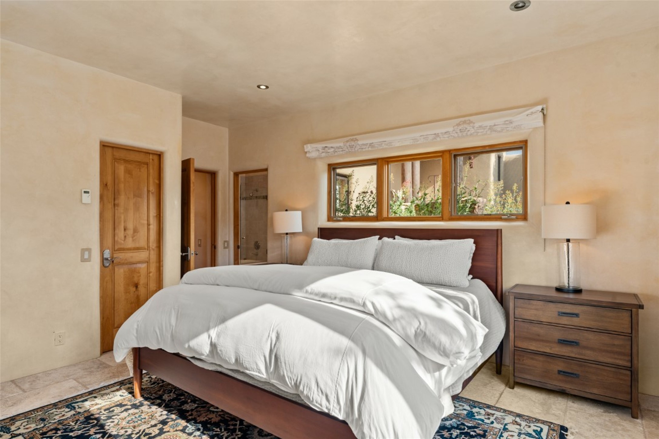 Poised on a curve in the prestigious Monte Sereno subdivision, this 3 BR/3.5BA soft contemporary home offers one-level living for owners, and a separate level for guests (or home office), thereby offering a true separation of space. Built in 2008, this home has been lovingly cared for, and offers a scale of rooms seldom seen in this price range. The comfortable kitchen/family room layout is great for day-to-day living, while the spacious living room/dining room makes a big statement as one enters the home for entertaining or enjoying the views of the Sangre de Cristo Mountains to the east. The owners suite is a true sanctuary, with access to the front portal, warm oak floors, an over-sized walk in closet with built in cabinetry, and a wonderful bath with separate new soaking tub and walk-in shower, accompanied by two vanity areas and a make-up counter. The 2nd and 3rd bedrooms are a couple of steps down, and both had en-suite baths and are very private. These bedrooms (as well as the rest of the home) feature chiseled travertine floors. The entertaining portal is one of the largest in Monte Sereno, and features an outdoor BBQ, a large seating area, a corner kiva wood burning fireplace, and a privacy wall encircling the rear landscaping. With easy access to Santa Fe in this front of Monte Sereno setting, miles of private walking trails, and of course great views - this reasonably priced home is one of the best values in all of Monte Sereno. Features: Deluxe Wolf 6 Burner Stove w/ double oven, Sub-Zero refrigerator Granite counter tops in the kitchen Custom cabinetry with loads of storage area Separate pantry with new shelving 3 Wood burning fireplaces - living room, family room, and outdoor portal New large owner's suite soaking tub Built in sound system in the Kitchen/Family Room, Living Room, Owner's Suite & Rear Portal High ceilings with vigas throughout the home Hand trawled plaster finishes throughout Travertine tile and wood floors Clad windows and sliding doors for low maintenance exterior Landscaped with drip irrigation In floor radiant heat 2 Evaporative Coolers with whole house ducting. Beautiful new window treatments throughout create a sense of warmth and elegance throughout the entire home.