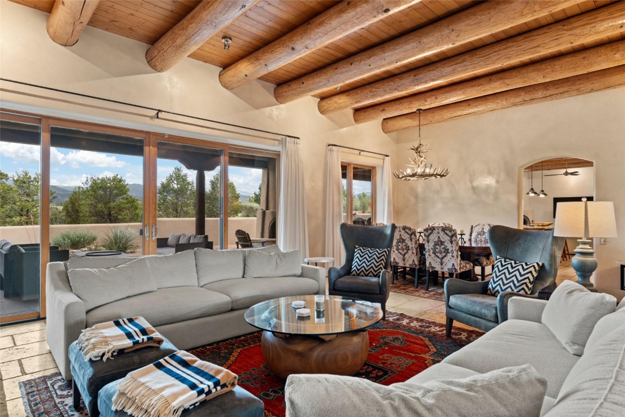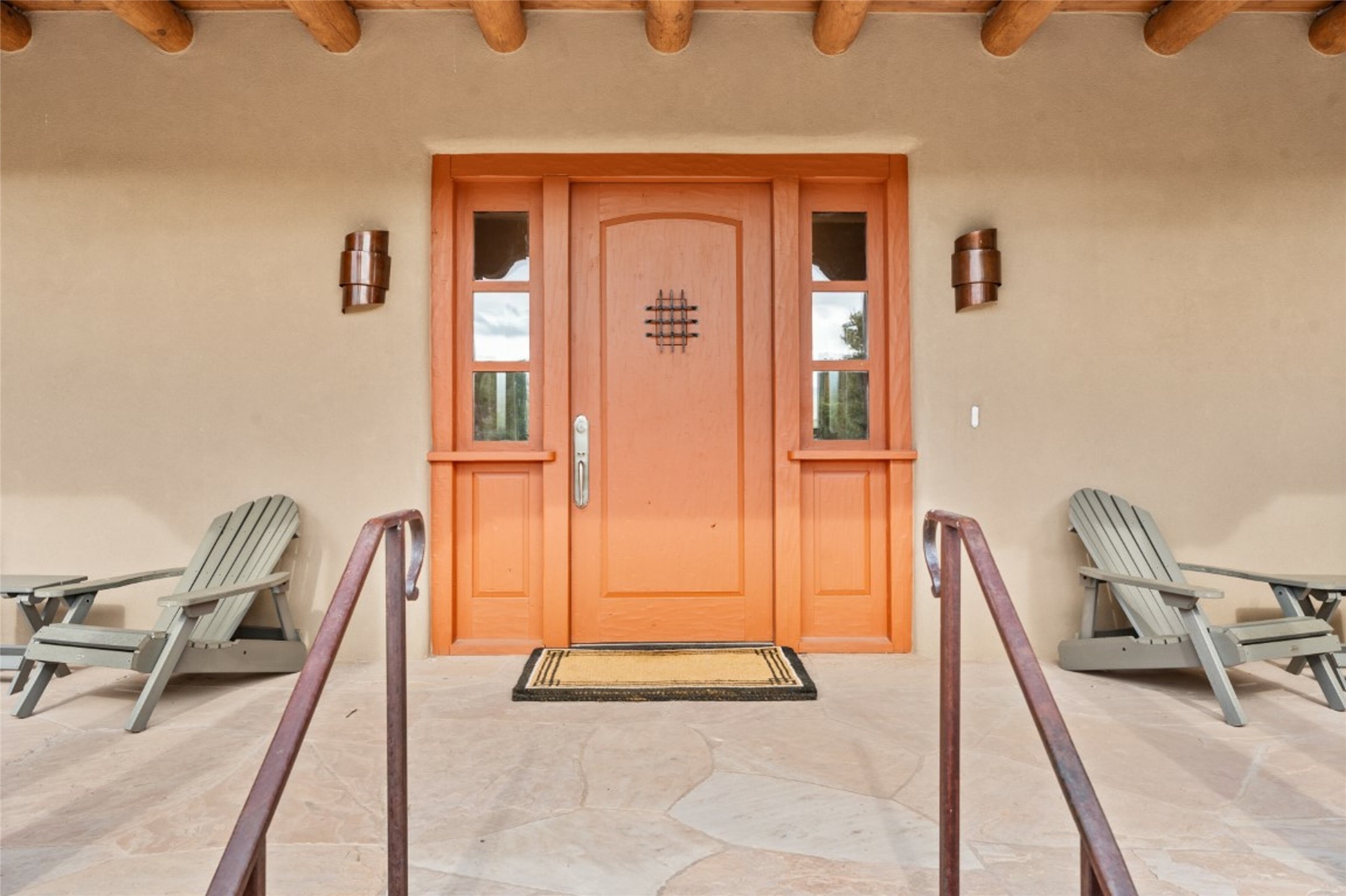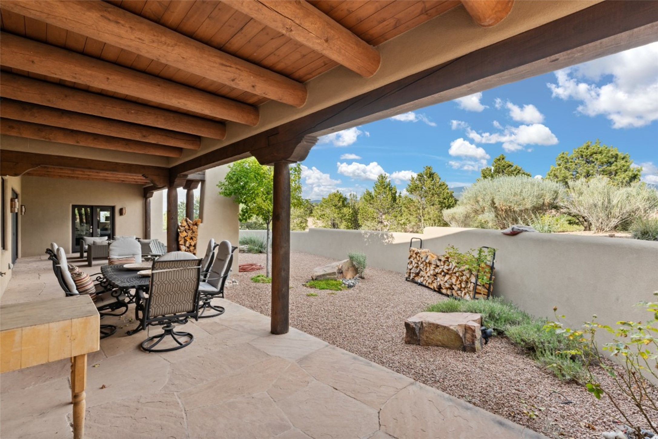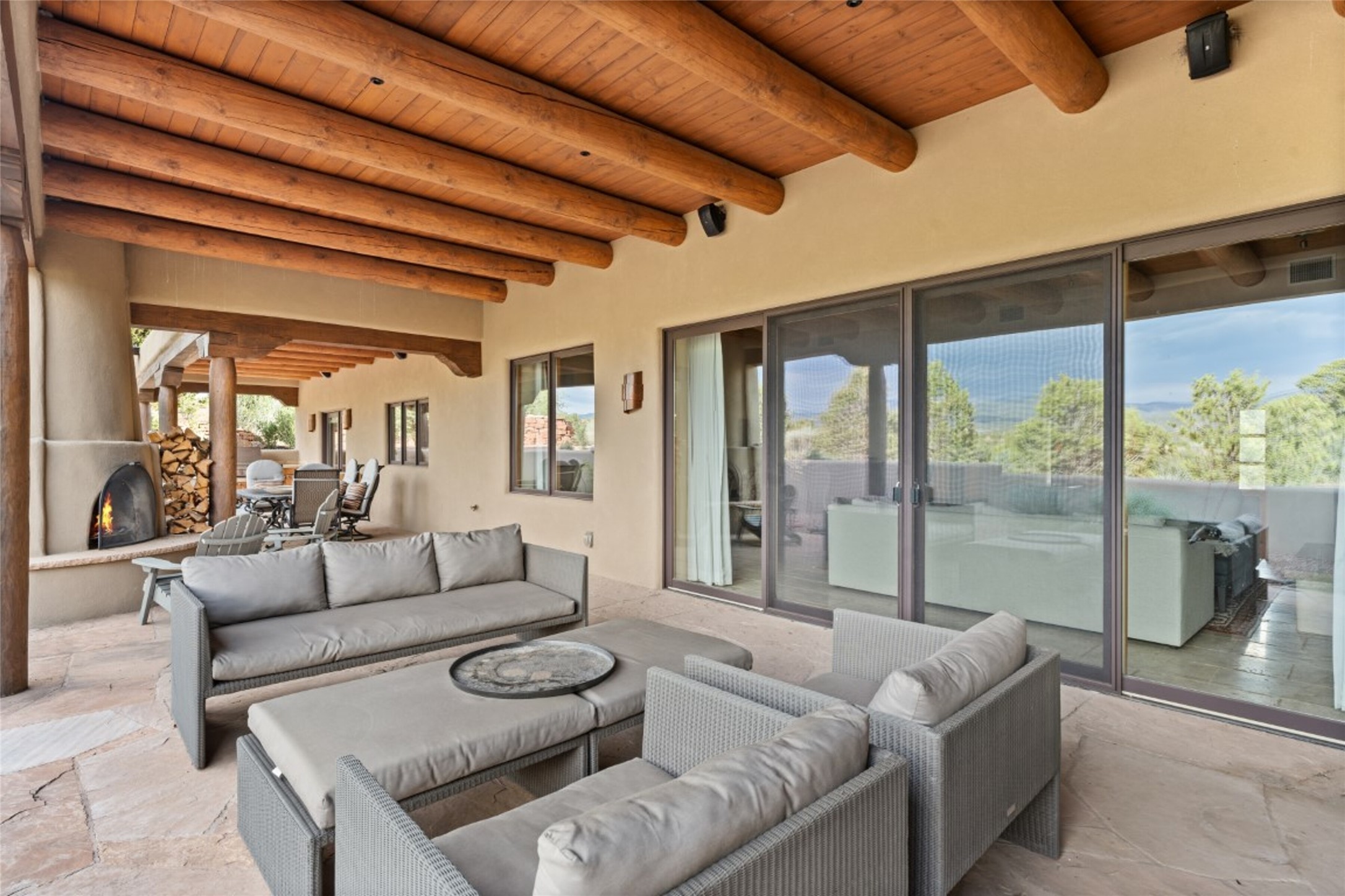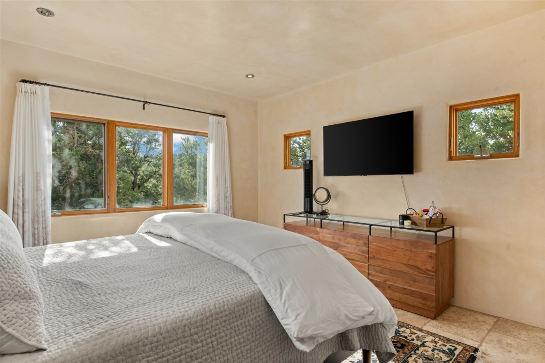 Poised on a curve in the prestigious Monte Sereno subdivision, this 3 BR/3.5BA soft contemporary home offers one-level living for owners, and a separate level for guests (or home office), thereby offering a true separation of space. Built in 2008, this home has been lovingly cared for, and offers a scale of rooms seldom seen in this price range. The comfortable kitchen/family room layout is great for day-to-day living, while the spacious living room/dining room makes a big statement as one enters the home for entertaining or enjoying the views of the Sangre de Cristo Mountains to the east. The owners suite is a true sanctuary, with access to the front portal, warm oak floors, an over-sized walk in closet with built in cabinetry, and a wonderful bath with separate new soaking tub and walk-in shower, accompanied by two vanity areas and a make-up counter. The 2nd and 3rd bedrooms are a couple of steps down, and both had en-suite baths and are very private. These bedrooms (as well as the rest of the home) feature chiseled travertine floors. The entertaining portal is one of the largest in Monte Sereno, and features an outdoor BBQ, a large seating area, a corner kiva wood burning fireplace, and a privacy wall encircling the rear landscaping. With easy access to Santa Fe in this front of Monte Sereno setting, miles of private walking trails, and of course great views - this reasonably priced home is one of the best values in all of Monte Sereno. Features: Deluxe Wolf 6 Burner Stove w/ double oven, Sub-Zero refrigerator Granite counter tops in the kitchen Custom cabinetry with loads of storage area Separate pantry with new shelving 3 Wood burning fireplaces - living room, family room, and outdoor portal New large owner's suite soaking tub Built in sound system in the Kitchen/Family Room, Living Room, Owner's Suite & Rear Portal High ceilings with vigas throughout the home Hand trawled plaster finishes throughout Travertine tile and wood floors Clad windows and sliding doors for low maintenance exterior Landscaped with drip irrigation In floor radiant heat 2 Evaporative Coolers with whole house ducting. Beautiful new window treatments throughout create a sense of warmth and elegance throughout the entire home.