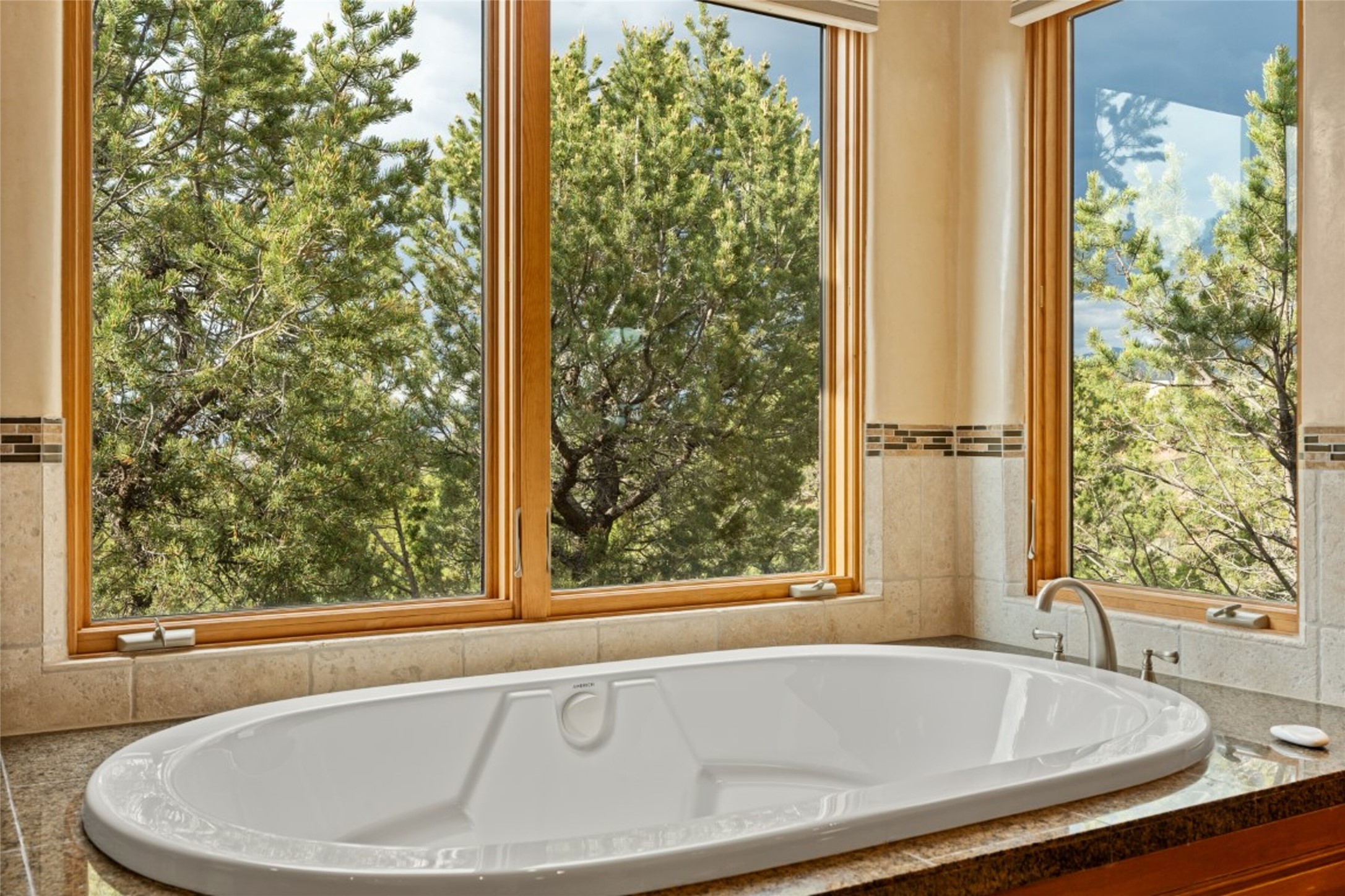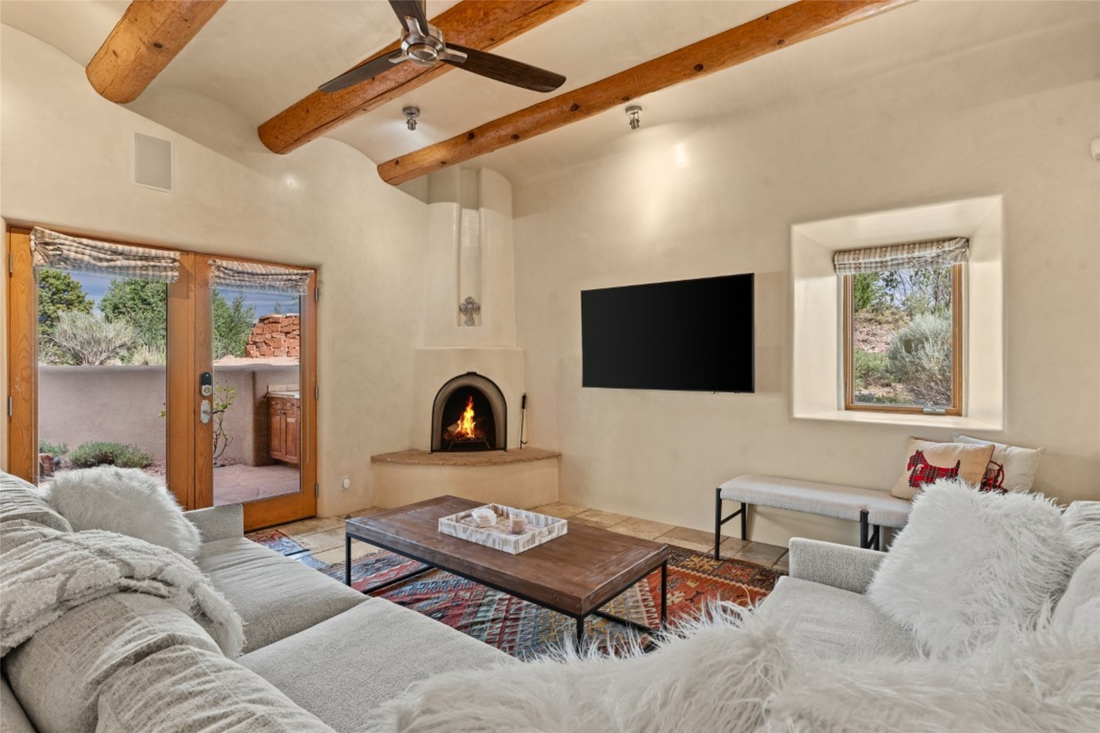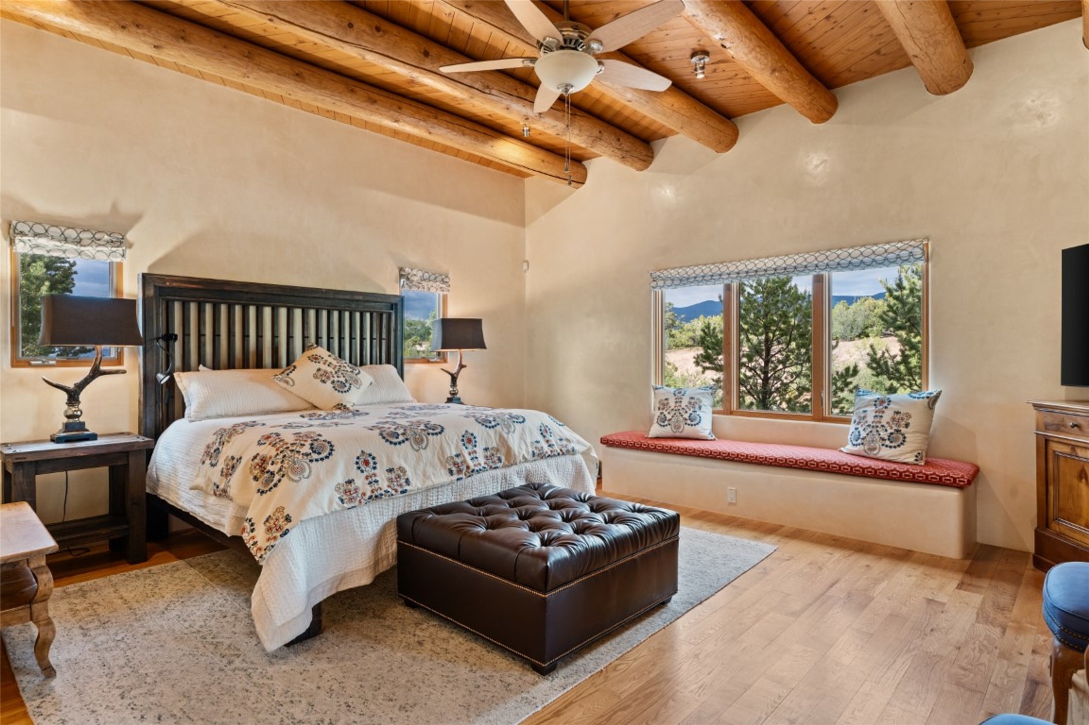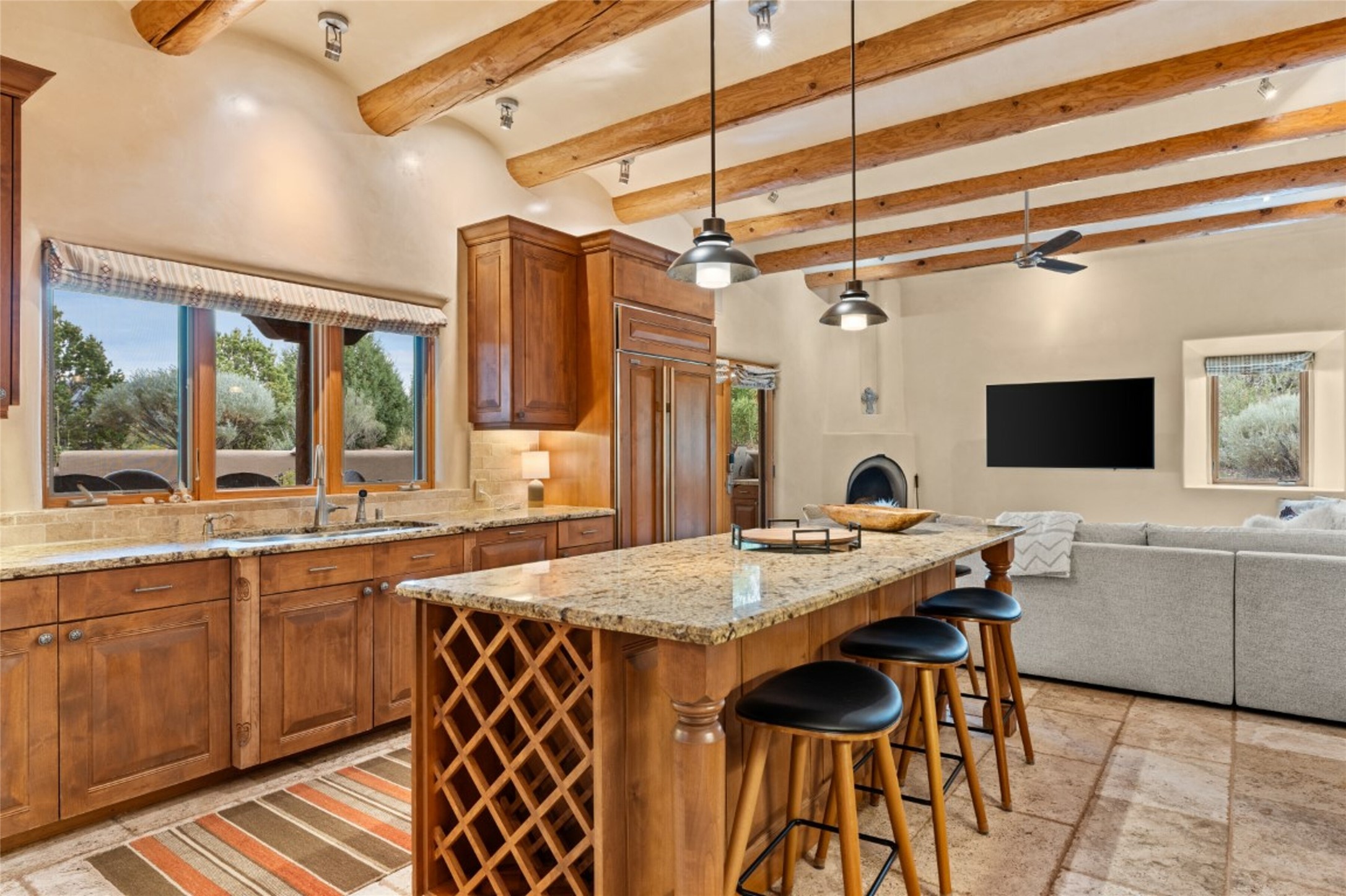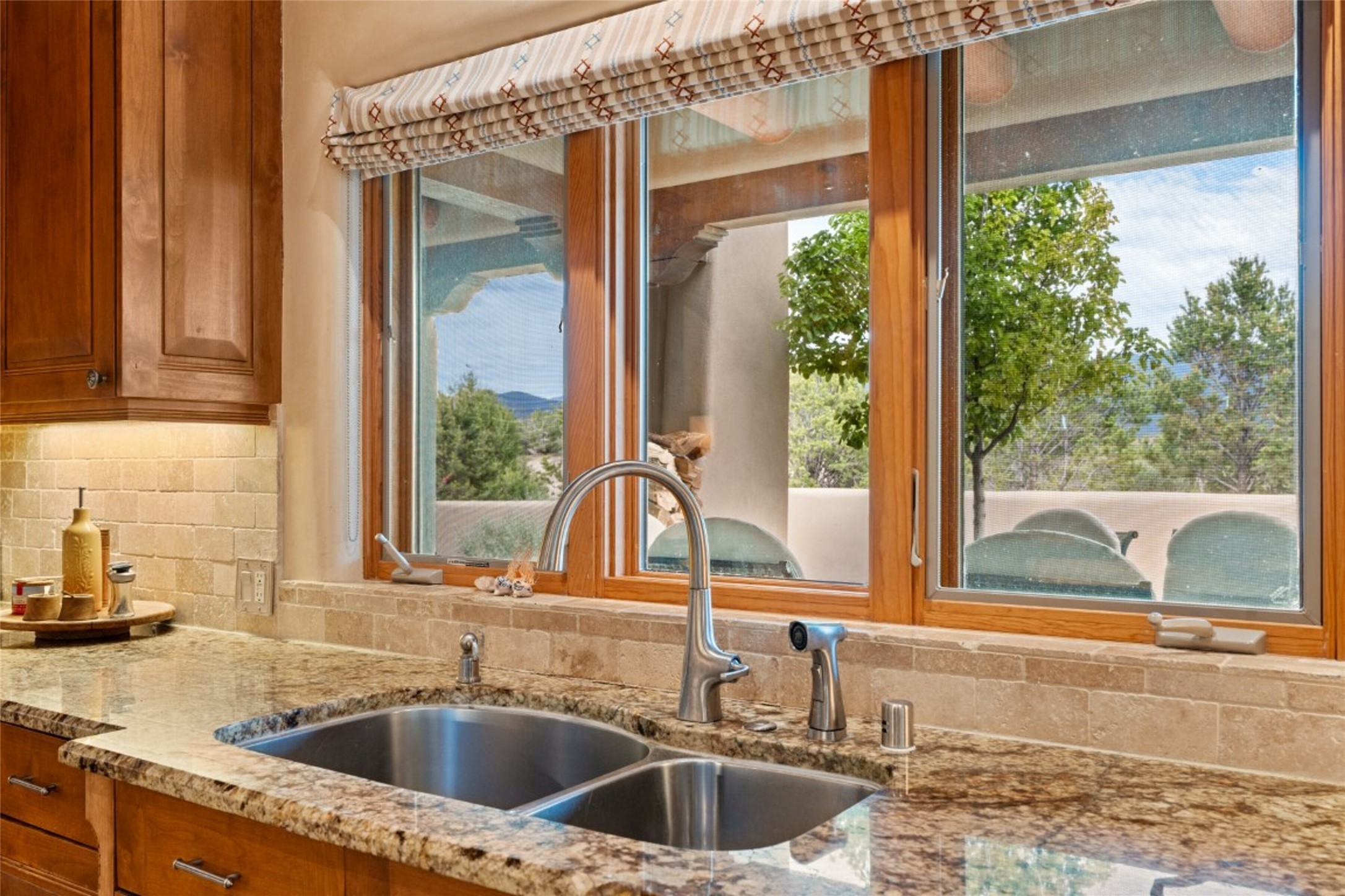 Poised on a curve in the prestigious Monte Sereno subdivision, this 3 BR/3.5BA soft contemporary home offers one-level living for owners, and a separate level for guests (or home office), thereby offering a true separation of space. Built in 2008, this home has been lovingly cared for, and offers a scale of rooms seldom seen in this price range. The comfortable kitchen/family room layout is great for day-to-day living, while the spacious living room/dining room makes a big statement as one enters the home for entertaining or enjoying the views of the Sangre de Cristo Mountains to the east. The owners suite is a true sanctuary, with access to the front portal, warm oak floors, an over-sized walk in closet with built in cabinetry, and a wonderful bath with separate new soaking tub and walk-in shower, accompanied by two vanity areas and a make-up counter. The 2nd and 3rd bedrooms are a couple of steps down, and both had en-suite baths and are very private. These bedrooms (as well as the rest of the home) feature chiseled travertine floors. The entertaining portal is one of the largest in Monte Sereno, and features an outdoor BBQ, a large seating area, a corner kiva wood burning fireplace, and a privacy wall encircling the rear landscaping. With easy access to Santa Fe in this front of Monte Sereno setting, miles of private walking trails, and of course great views - this reasonably priced home is one of the best values in all of Monte Sereno. Features: Deluxe Wolf 6 Burner Stove w/ double oven, Sub-Zero refrigerator Granite counter tops in the kitchen Custom cabinetry with loads of storage area Separate pantry with new shelving 3 Wood burning fireplaces - living room, family room, and outdoor portal New large owner's suite soaking tub Built in sound system in the Kitchen/Family Room, Living Room, Owner's Suite & Rear Portal High ceilings with vigas throughout the home Hand trawled plaster finishes throughout Travertine tile and wood floors Clad windows and sliding doors for low maintenance exterior Landscaped with drip irrigation In floor radiant heat 2 Evaporative Coolers with whole house ducting. Beautiful new window treatments throughout create a sense of warmth and elegance throughout the entire home.