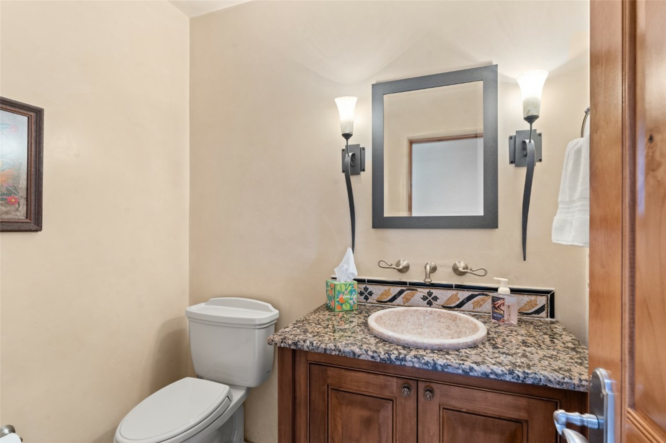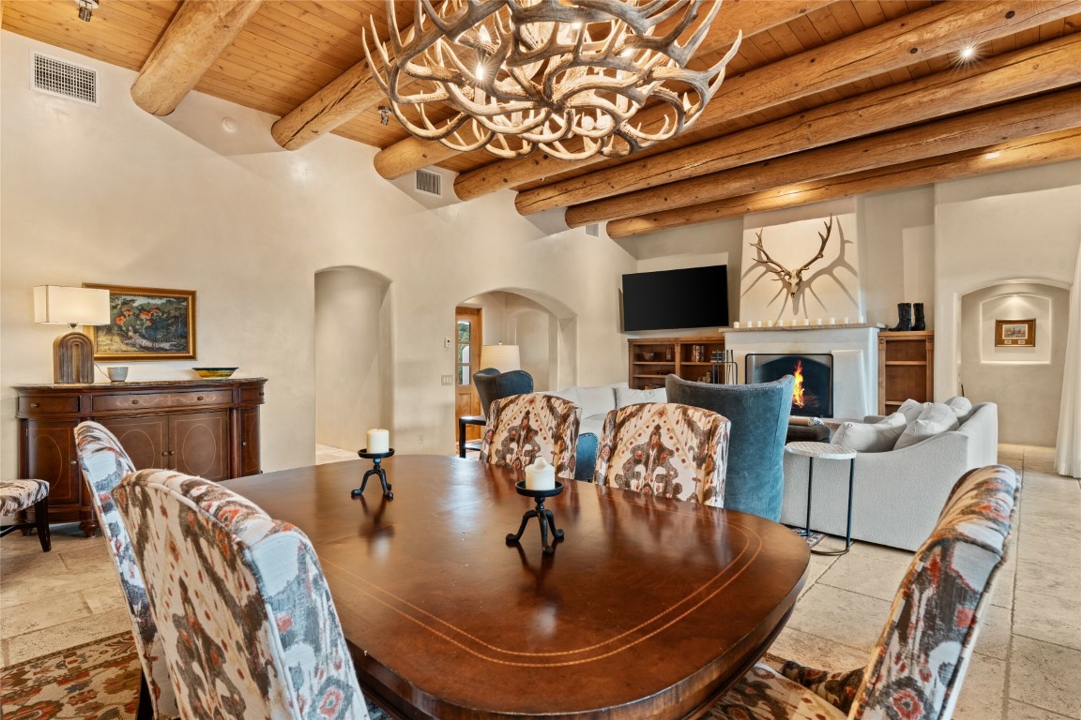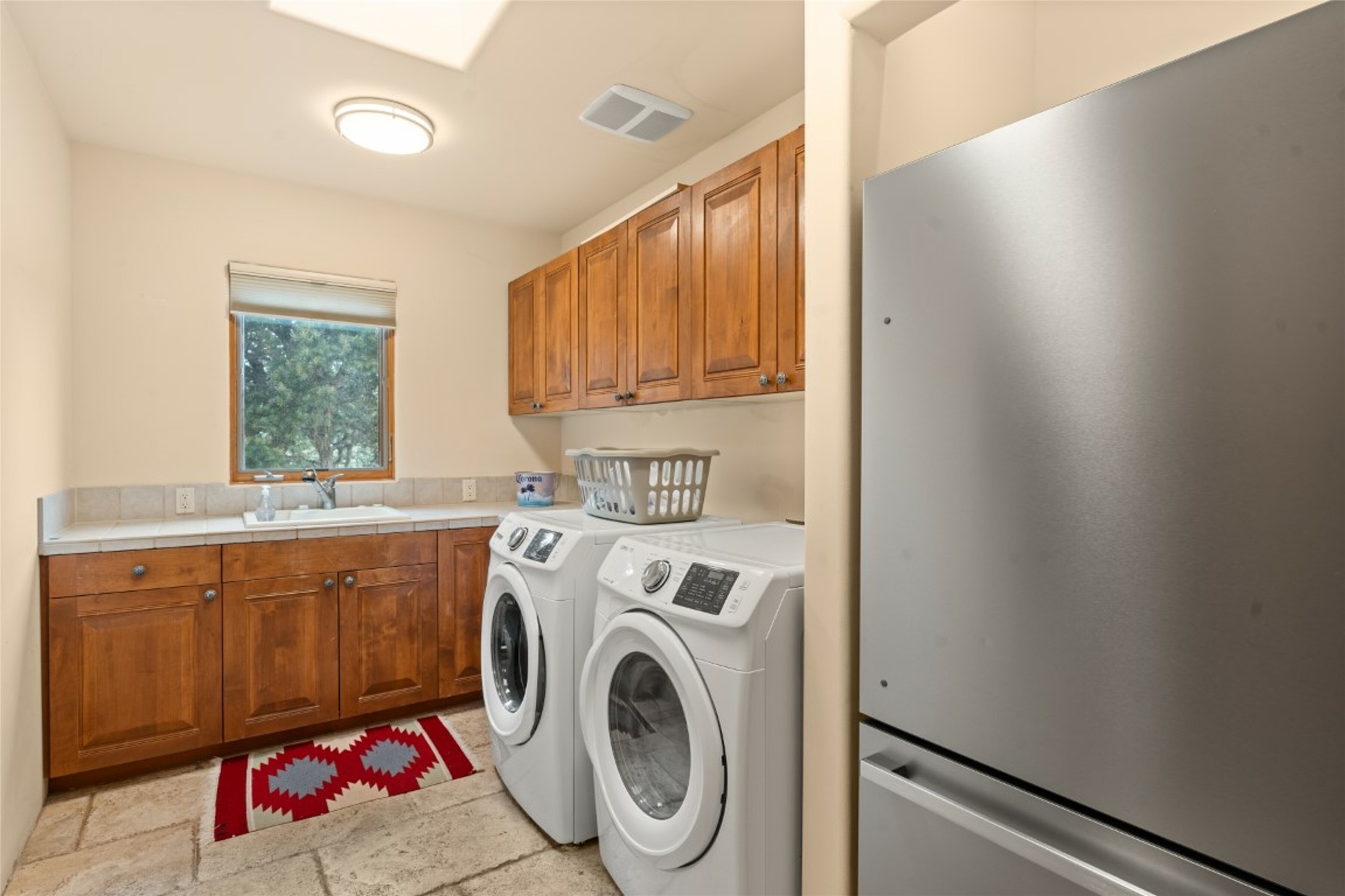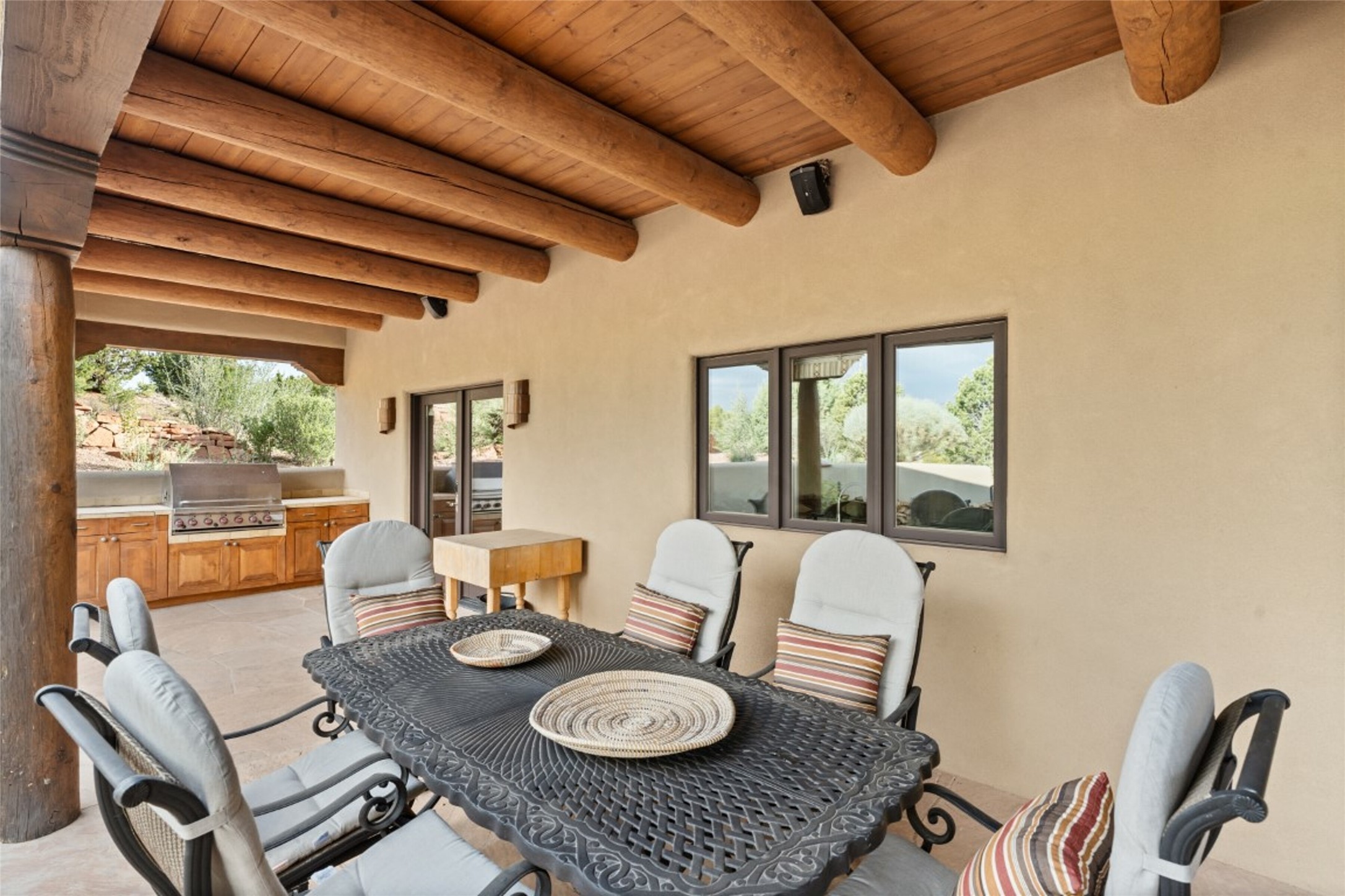 Poised on a curve in the prestigious Monte Sereno subdivision, this 3 BR/3.5BA soft contemporary home offers one-level living for owners, and a separate level for guests (or home office), thereby offering a true separation of space. Built in 2008, this home has been lovingly cared for, and offers a scale of rooms seldom seen in this price range. The comfortable kitchen/family room layout is great for day-to-day living, while the spacious living room/dining room makes a big statement as one enters the home for entertaining or enjoying the views of the Sangre de Cristo Mountains to the east. The owners suite is a true sanctuary, with access to the front portal, warm oak floors, an over-sized walk in closet with built in cabinetry, and a wonderful bath with separate new soaking tub and walk-in shower, accompanied by two vanity areas and a make-up counter. The 2nd and 3rd bedrooms are a couple of steps down, and both had en-suite baths and are very private. These bedrooms (as well as the rest of the home) feature chiseled travertine floors. The entertaining portal is one of the largest in Monte Sereno, and features an outdoor BBQ, a large seating area, a corner kiva wood burning fireplace, and a privacy wall encircling the rear landscaping. With easy access to Santa Fe in this front of Monte Sereno setting, miles of private walking trails, and of course great views - this reasonably priced home is one of the best values in all of Monte Sereno. Features: Deluxe Wolf 6 Burner Stove w/ double oven, Sub-Zero refrigerator Granite counter tops in the kitchen Custom cabinetry with loads of storage area Separate pantry with new shelving 3 Wood burning fireplaces - living room, family room, and outdoor portal New large owner's suite soaking tub Built in sound system in the Kitchen/Family Room, Living Room, Owner's Suite & Rear Portal High ceilings with vigas throughout the home Hand trawled plaster finishes throughout Travertine tile and wood floors Clad windows and sliding doors for low maintenance exterior Landscaped with drip irrigation In floor radiant heat 2 Evaporative Coolers with whole house ducting. Beautiful new window treatments throughout create a sense of warmth and elegance throughout the entire home.