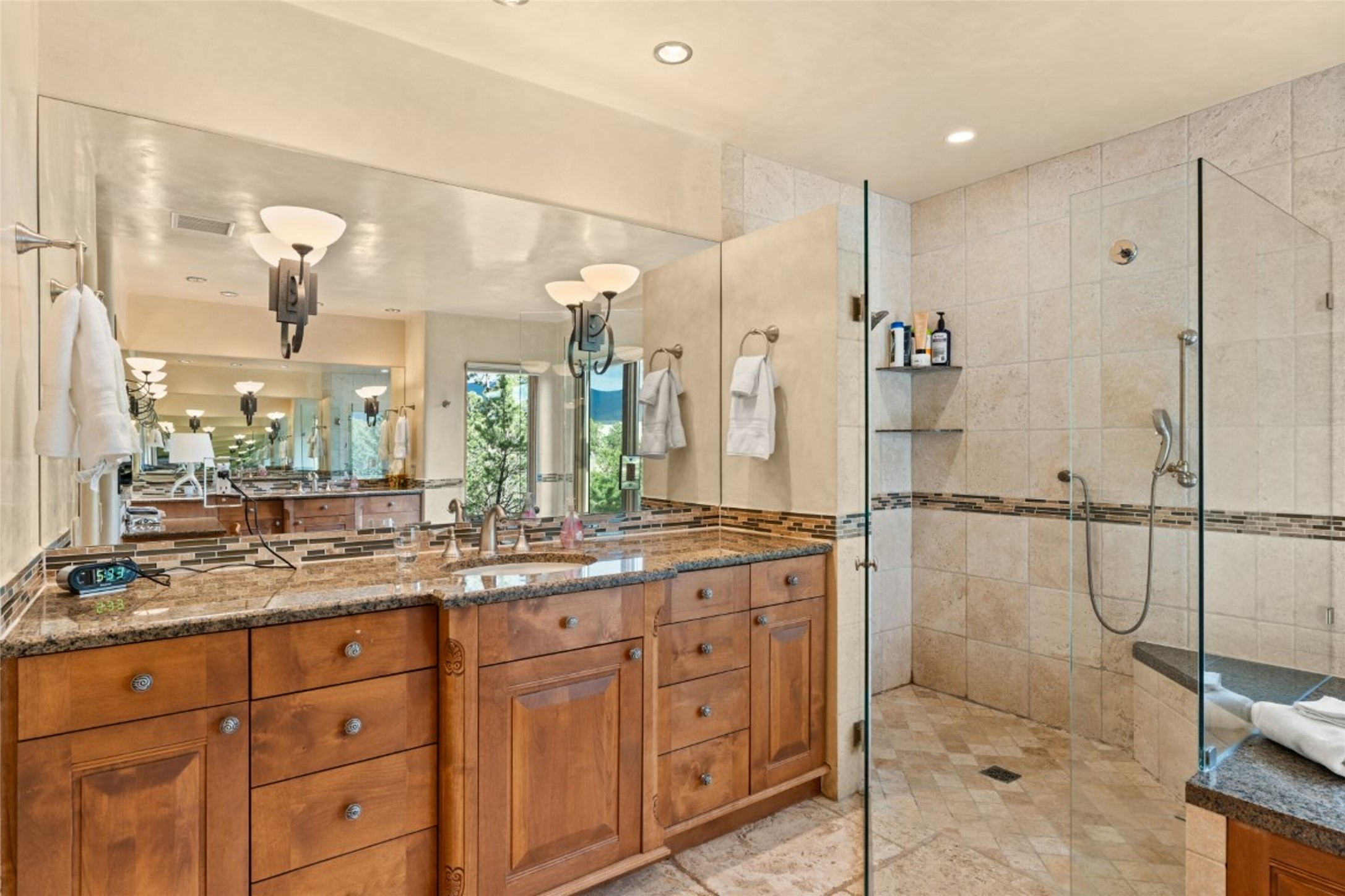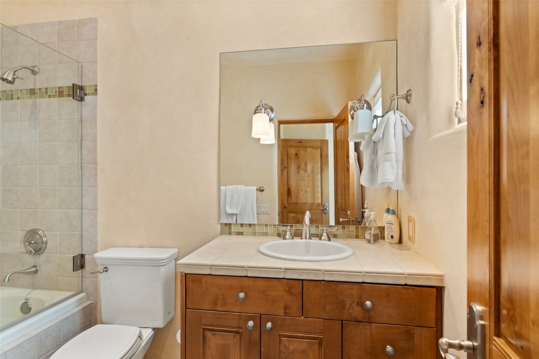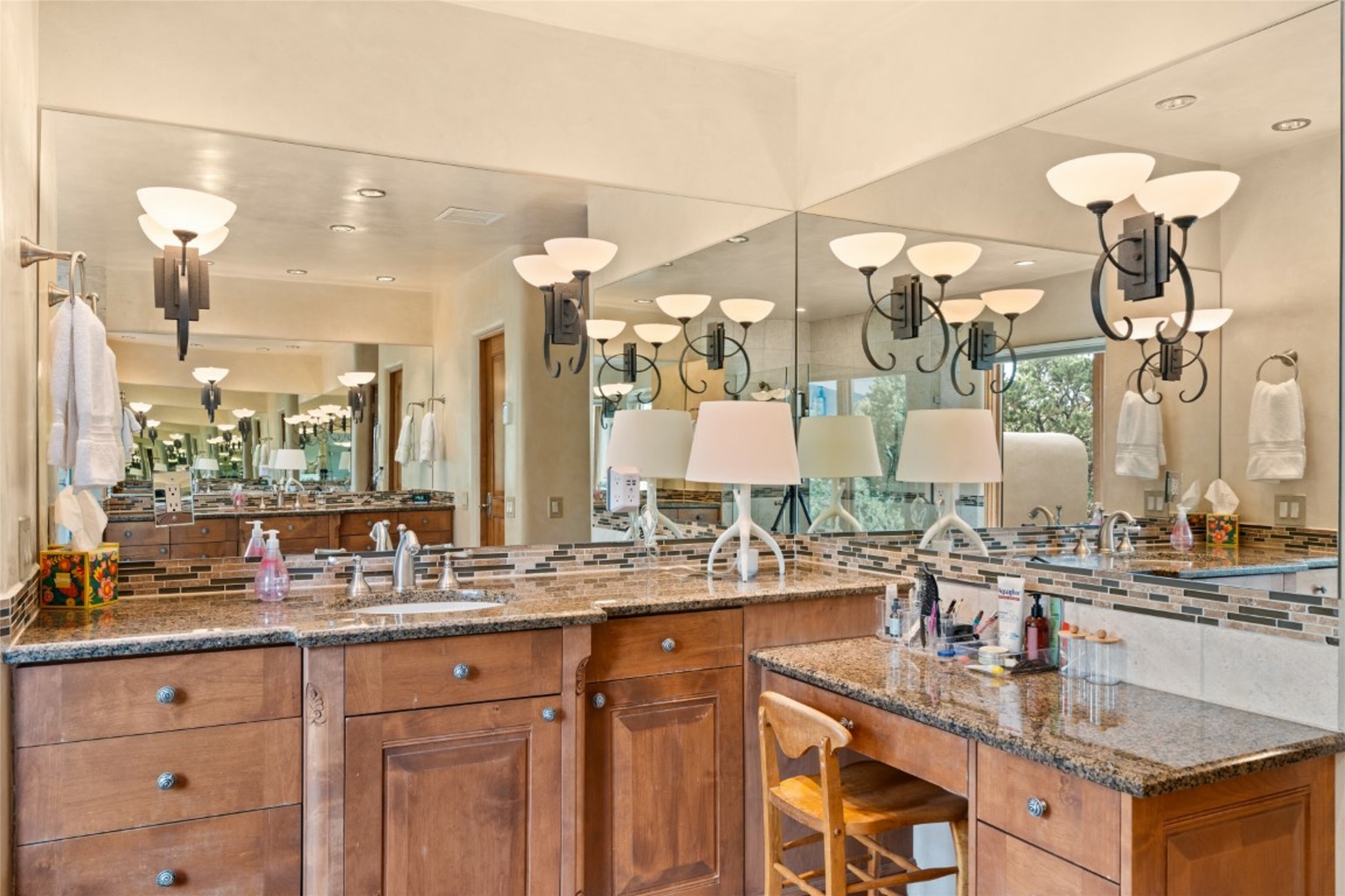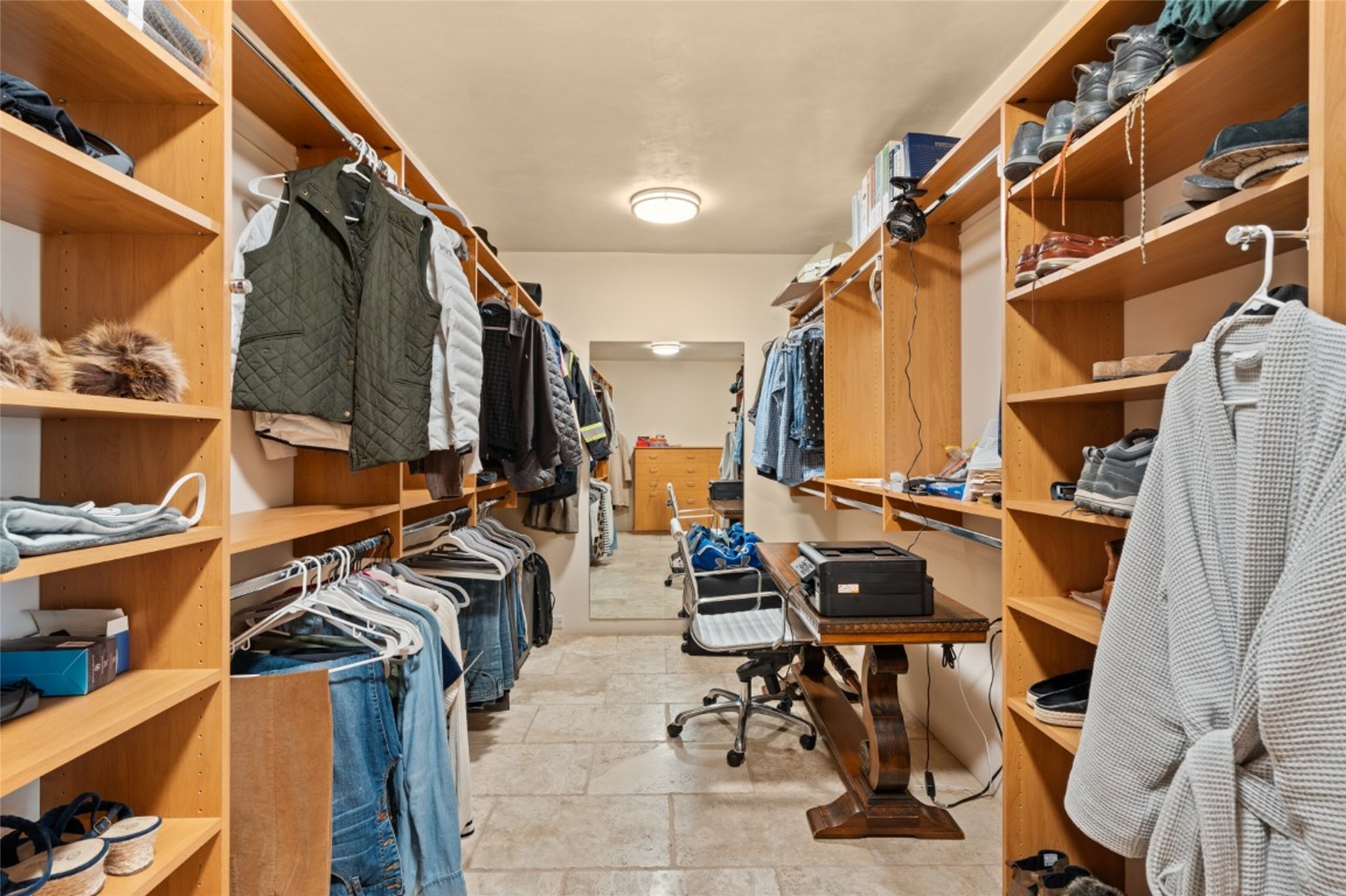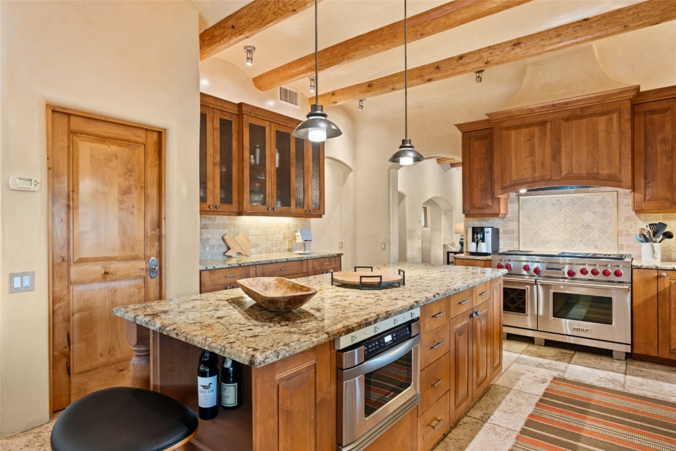 Poised on a curve in the prestigious Monte Sereno subdivision, this 3 BR/3.5BA soft contemporary home offers one-level living for owners, and a separate level for guests (or home office), thereby offering a true separation of space. Built in 2008, this home has been lovingly cared for, and offers a scale of rooms seldom seen in this price range. The comfortable kitchen/family room layout is great for day-to-day living, while the spacious living room/dining room makes a big statement as one enters the home for entertaining or enjoying the views of the Sangre de Cristo Mountains to the east. The owners suite is a true sanctuary, with access to the front portal, warm oak floors, an over-sized walk in closet with built in cabinetry, and a wonderful bath with separate new soaking tub and walk-in shower, accompanied by two vanity areas and a make-up counter. The 2nd and 3rd bedrooms are a couple of steps down, and both had en-suite baths and are very private. These bedrooms (as well as the rest of the home) feature chiseled travertine floors. The entertaining portal is one of the largest in Monte Sereno, and features an outdoor BBQ, a large seating area, a corner kiva wood burning fireplace, and a privacy wall encircling the rear landscaping. With easy access to Santa Fe in this front of Monte Sereno setting, miles of private walking trails, and of course great views - this reasonably priced home is one of the best values in all of Monte Sereno. Features: Deluxe Wolf 6 Burner Stove w/ double oven, Sub-Zero refrigerator Granite counter tops in the kitchen Custom cabinetry with loads of storage area Separate pantry with new shelving 3 Wood burning fireplaces - living room, family room, and outdoor portal New large owner's suite soaking tub Built in sound system in the Kitchen/Family Room, Living Room, Owner's Suite & Rear Portal High ceilings with vigas throughout the home Hand trawled plaster finishes throughout Travertine tile and wood floors Clad windows and sliding doors for low maintenance exterior Landscaped with drip irrigation In floor radiant heat 2 Evaporative Coolers with whole house ducting. Beautiful new window treatments throughout create a sense of warmth and elegance throughout the entire home.