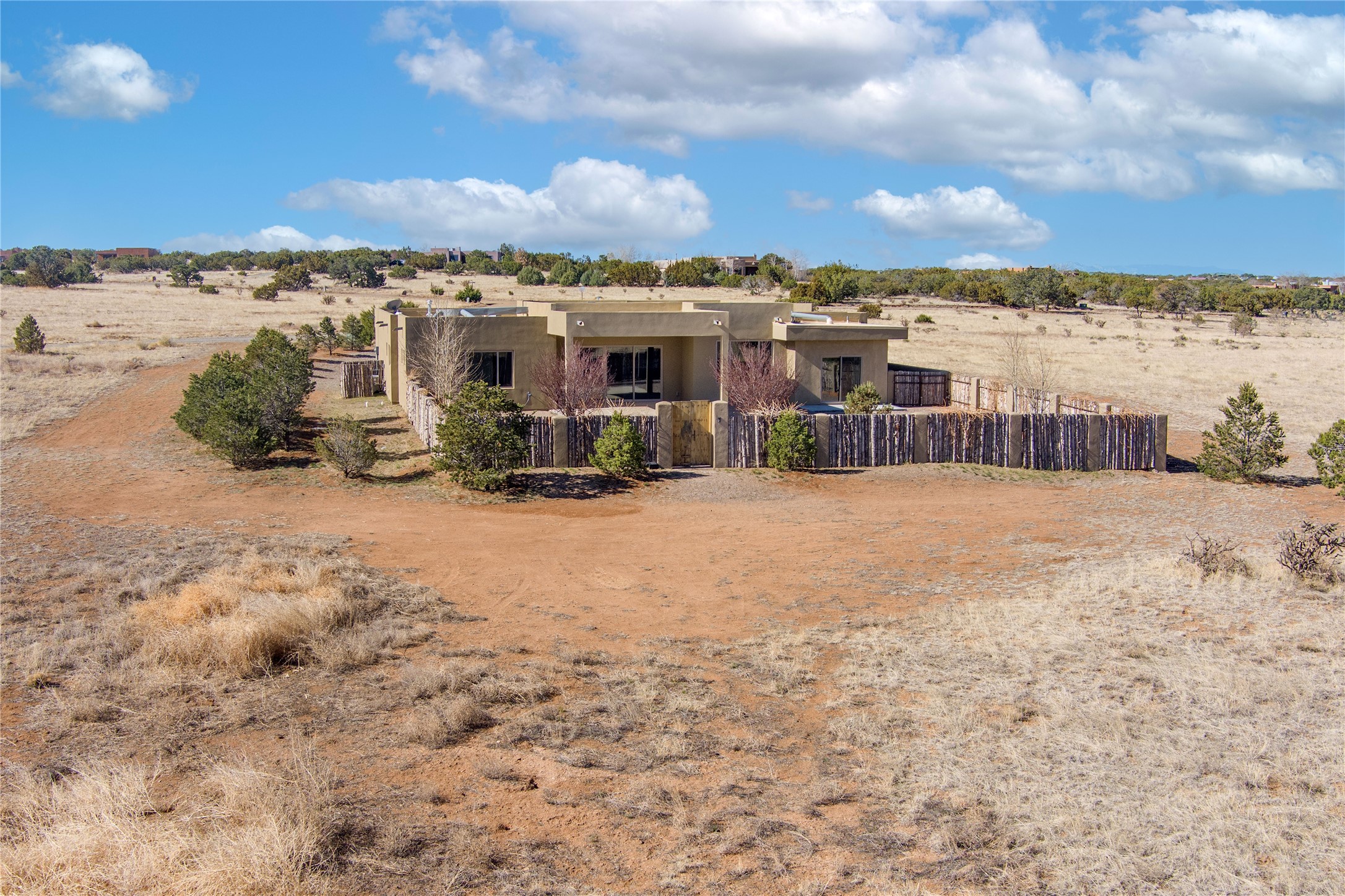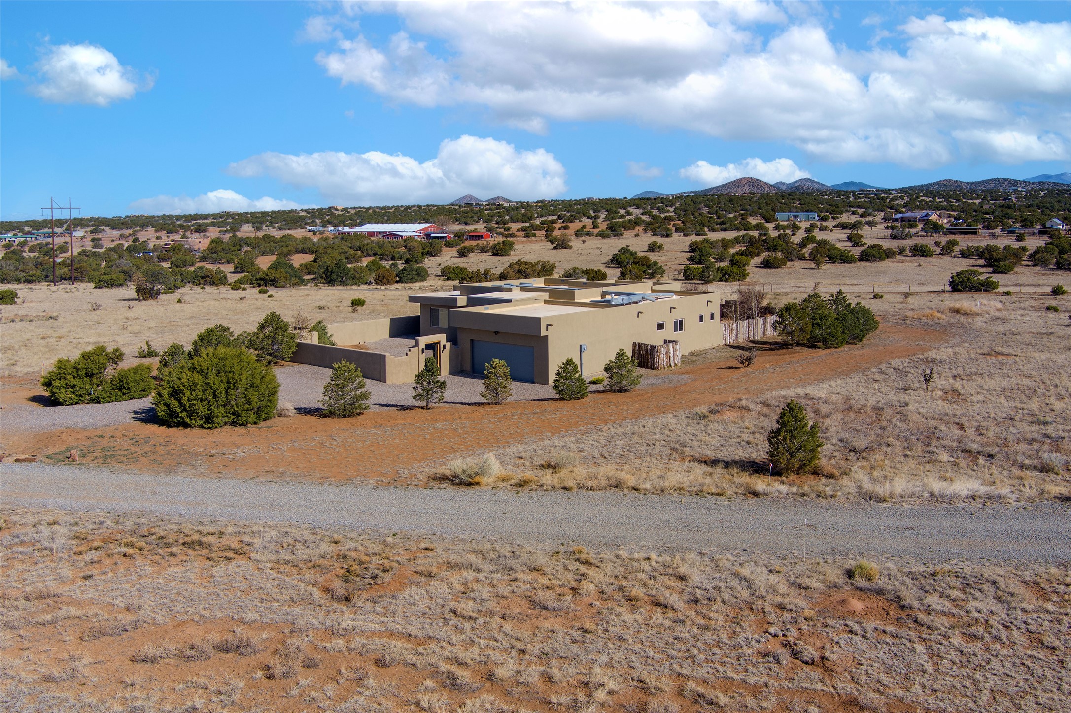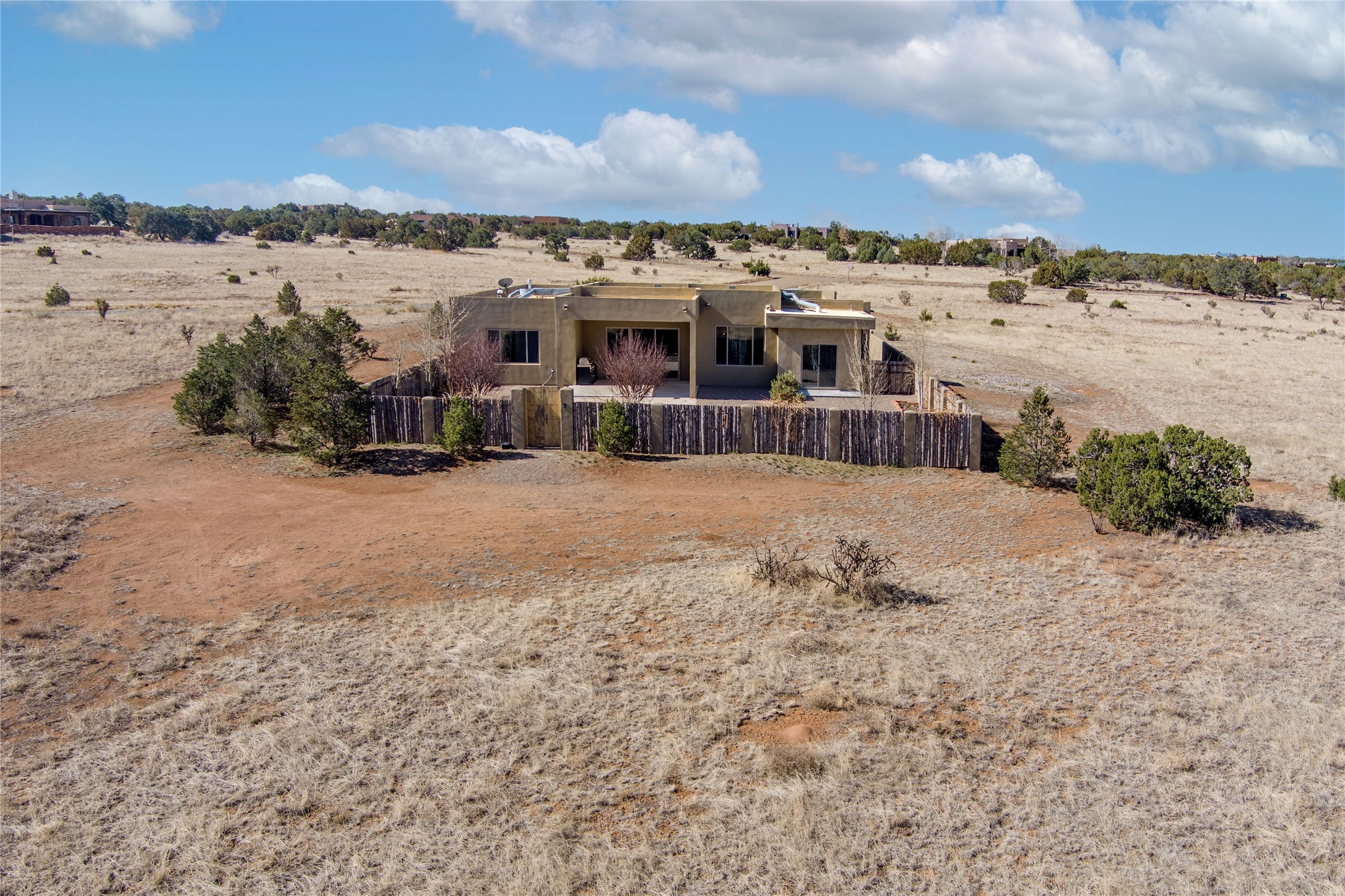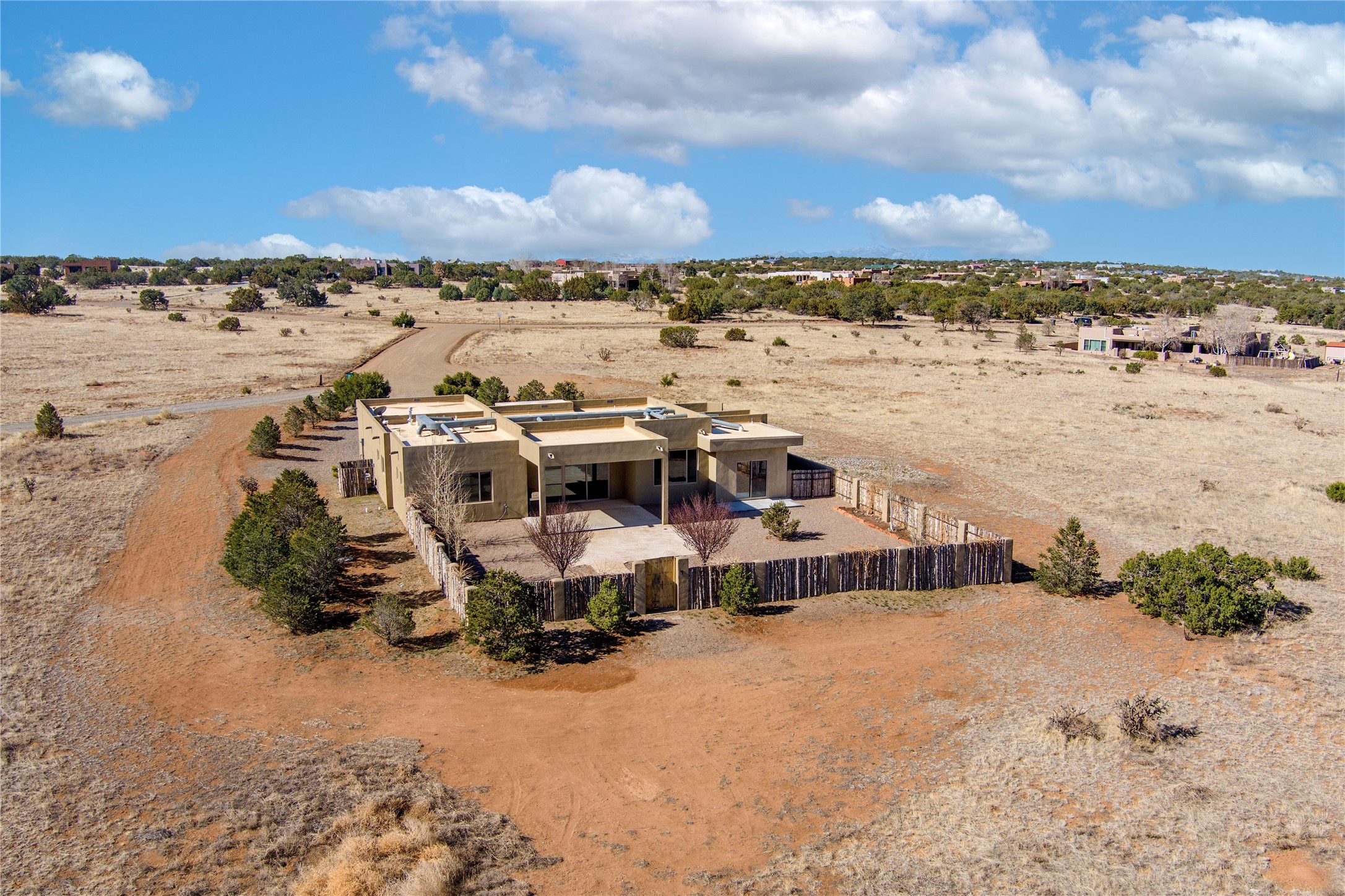 Experience modern living at its finest in this stunning 3-bedroom, 2-bath home, set on a peaceful 3.5-acre property surrounded by open space, wide-open skies, and the gentle sounds of nearby horses. Built just 4 years ago, this home blends sleek contemporary design with warm, livable comfort.Inside, you'll find a bright, open-concept layout with soaring ceilings and elegant architectural details, including a striking coffered ceiling in the main living area. The chef-inspired kitchen features high-end commercial-grade appliances--ideal for daily meals or entertaining with ease.The split floor plan offers privacy and functionality, with a spacious primary suite tucked away from the guest bedrooms. Guests enjoy their own private entrance--perfect for hosting, multigenerational living, or short-term rental potential.All just minutes from the Eldorado Shopping Center and a short drive to downtown Santa Fe--offering the perfect balance of serenity and convenience.