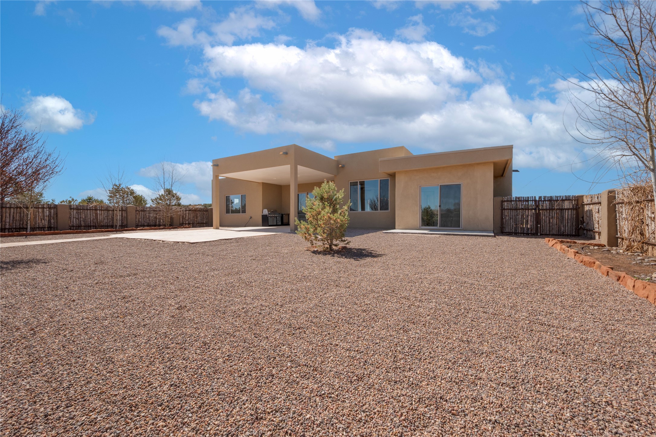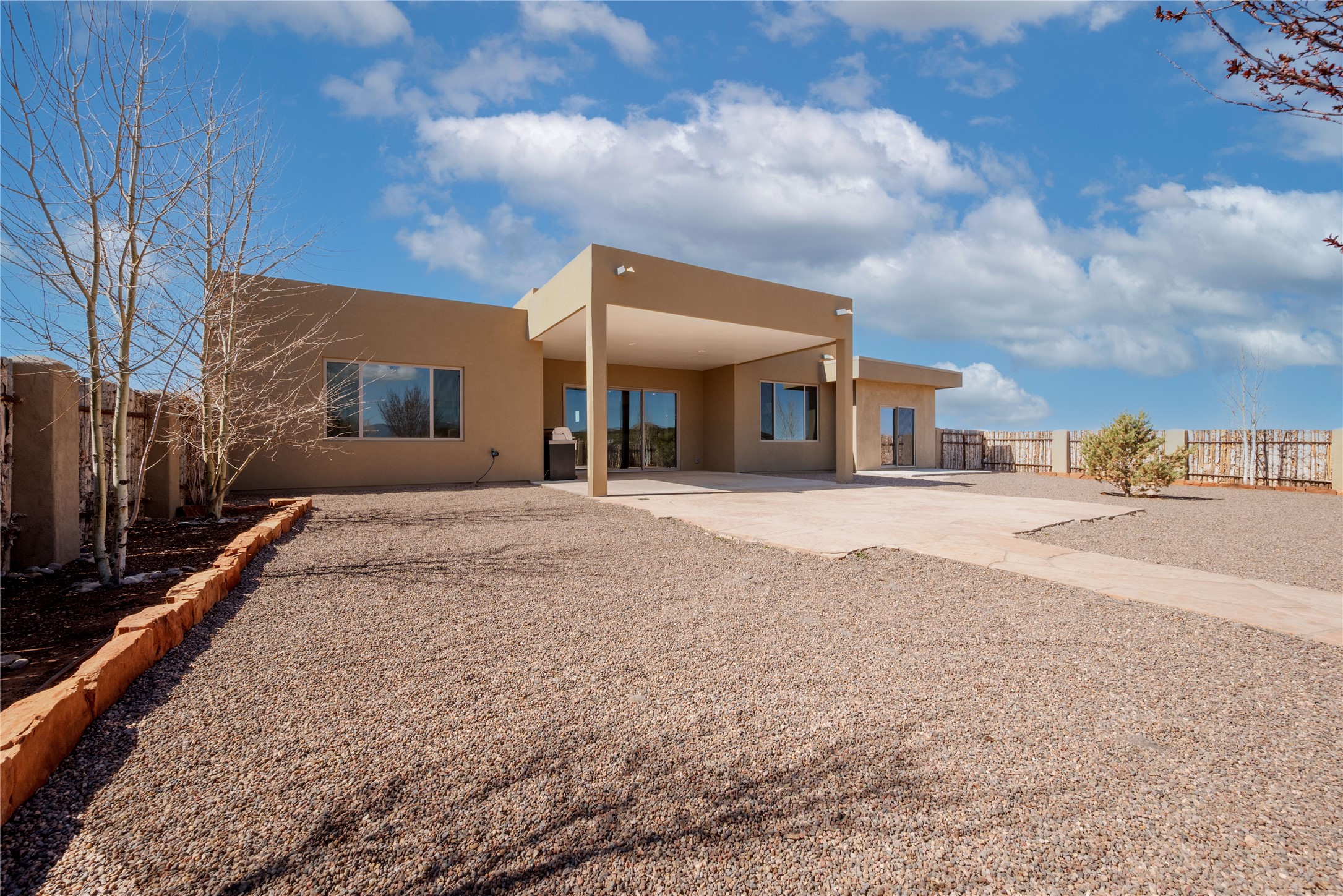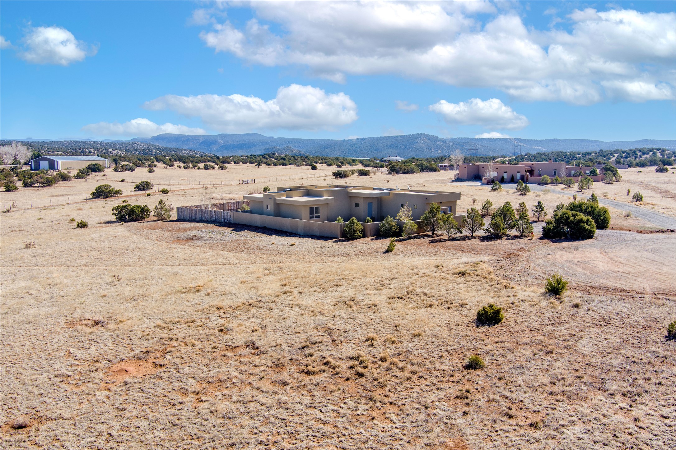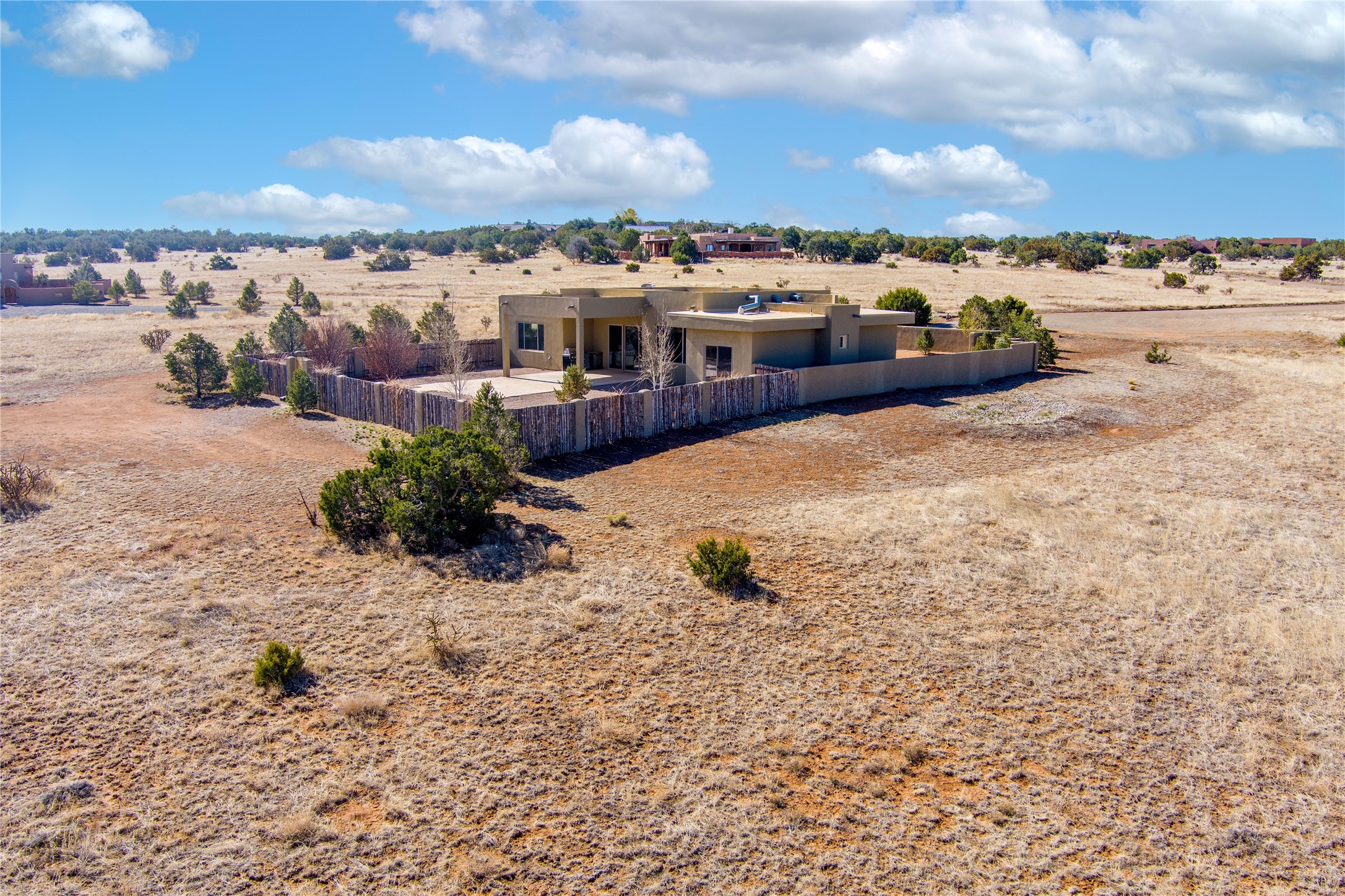 Experience modern living at its finest in this stunning 3-bedroom, 2-bath home, set on a peaceful 3.5-acre property surrounded by open space, wide-open skies, and the gentle sounds of nearby horses. Built just 4 years ago, this home blends sleek contemporary design with warm, livable comfort.Inside, you'll find a bright, open-concept layout with soaring ceilings and elegant architectural details, including a striking coffered ceiling in the main living area. The chef-inspired kitchen features high-end commercial-grade appliances--ideal for daily meals or entertaining with ease.The split floor plan offers privacy and functionality, with a spacious primary suite tucked away from the guest bedrooms. Guests enjoy their own private entrance--perfect for hosting, multigenerational living, or short-term rental potential.All just minutes from the Eldorado Shopping Center and a short drive to downtown Santa Fe--offering the perfect balance of serenity and convenience.