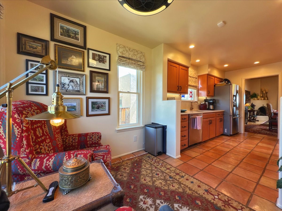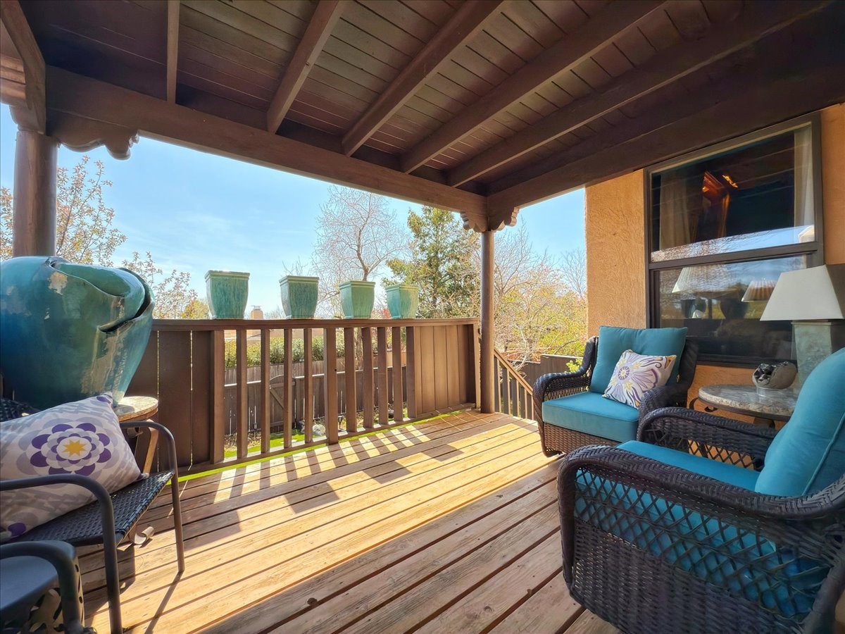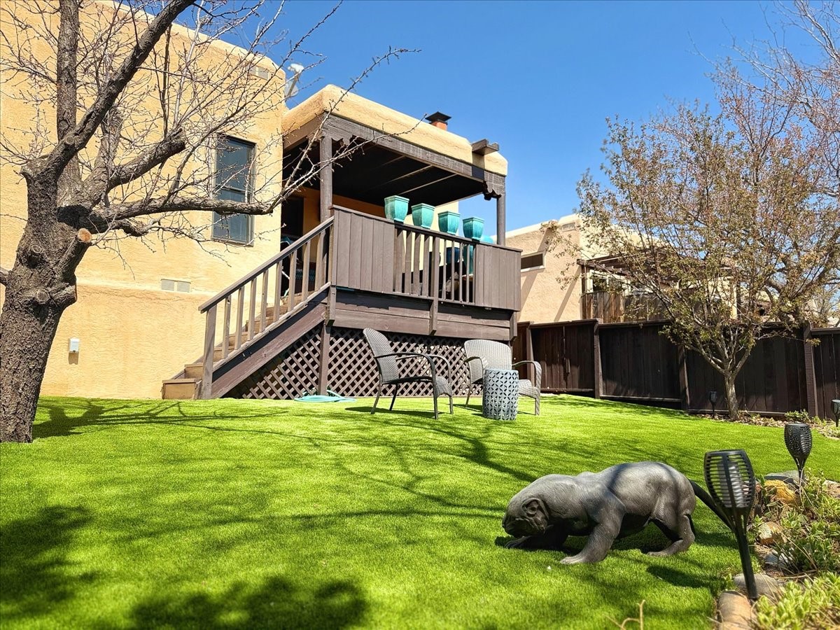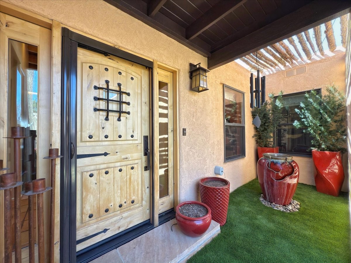 No attention to detail has been spared on this lovely, sophisticated home in the highly desirable Park Plaza community. With two bedrooms, a study and two full baths, this home features beautiful Saltillo tile and custom carpeting in the bedrooms, high ceilings with vigas, separate kitchen with breakfast area and an open dining and living room with a gas Kiva fireplace as a focal point. Other amenities include a dual-fuel range/oven with a warming drawer and a Jacuzzi-style tub in the primary bedroom. Enjoy the outdoors with a beautifully landscaped front courtyard with fountain and a generously sized back patio and fenced backyard. All pots/fountains will remain with the property. Both the front and back yard have top-of-the-line and easy-to-maintain artificial turf. In addition, this gracious home offers a good-sized two-car garage with built-in storage. The home has been well-maintained with updated forced heat and air, tankless water heater, well-cared for roof and stucco and updated appliances. Park Plazas is one of Santa Fe's most desirable communities with walking trails, outdoor fitness, tennis courts and more, plus 10 minutes to the historic Plaza and shopping.