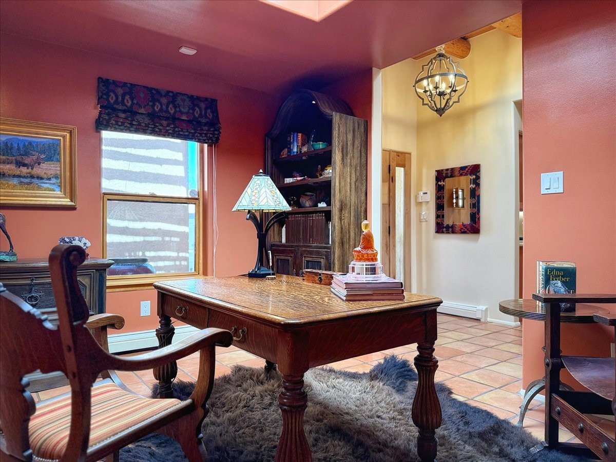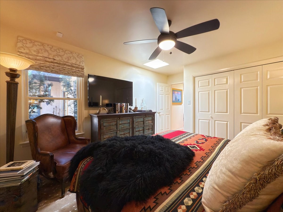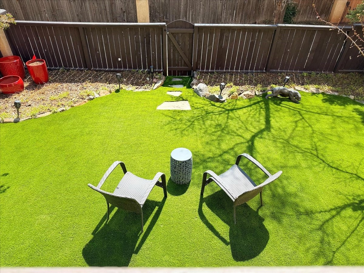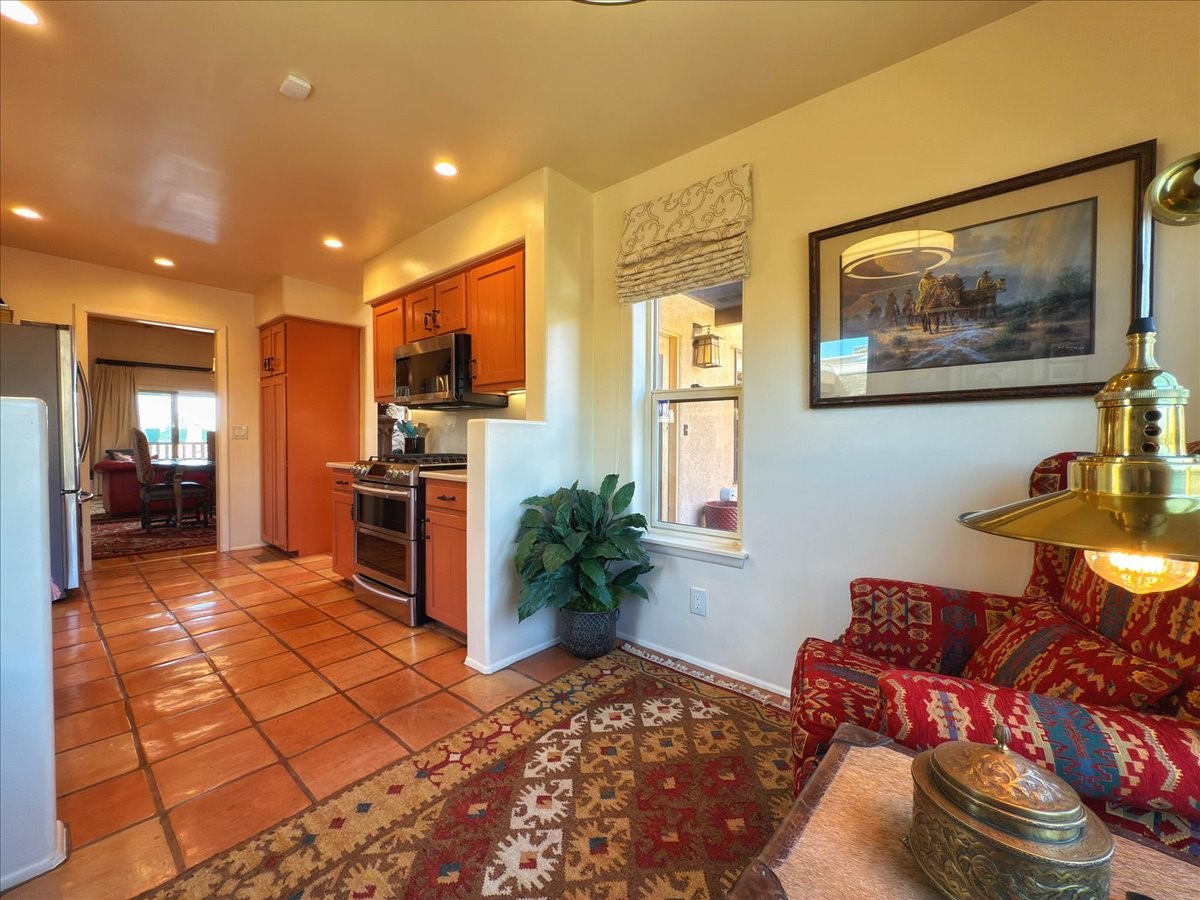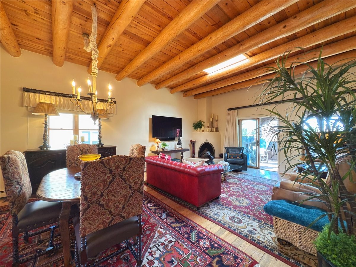 No attention to detail has been spared on this lovely, sophisticated home in the highly desirable Park Plaza community. With two bedrooms, a study and two full baths, this home features beautiful Saltillo tile and custom carpeting in the bedrooms, high ceilings with vigas, separate kitchen with breakfast area and an open dining and living room with a gas Kiva fireplace as a focal point. Other amenities include a dual-fuel range/oven with a warming drawer and a Jacuzzi-style tub in the primary bedroom. Enjoy the outdoors with a beautifully landscaped front courtyard with fountain and a generously sized back patio and fenced backyard. All pots/fountains will remain with the property. Both the front and back yard have top-of-the-line and easy-to-maintain artificial turf. In addition, this gracious home offers a good-sized two-car garage with built-in storage. The home has been well-maintained with updated forced heat and air, tankless water heater, well-cared for roof and stucco and updated appliances. Park Plazas is one of Santa Fe's most desirable communities with walking trails, outdoor fitness, tennis courts and more, plus 10 minutes to the historic Plaza and shopping.